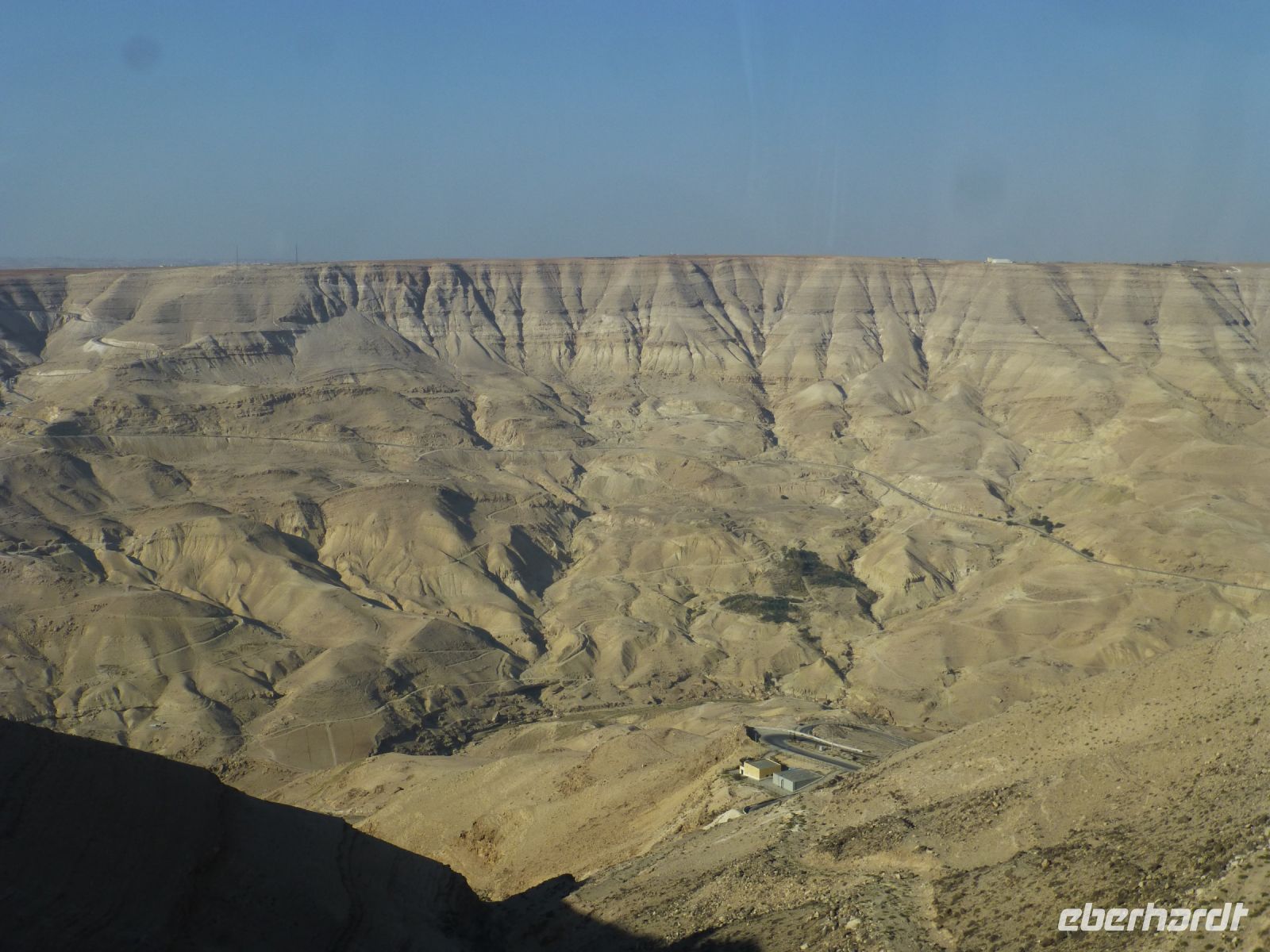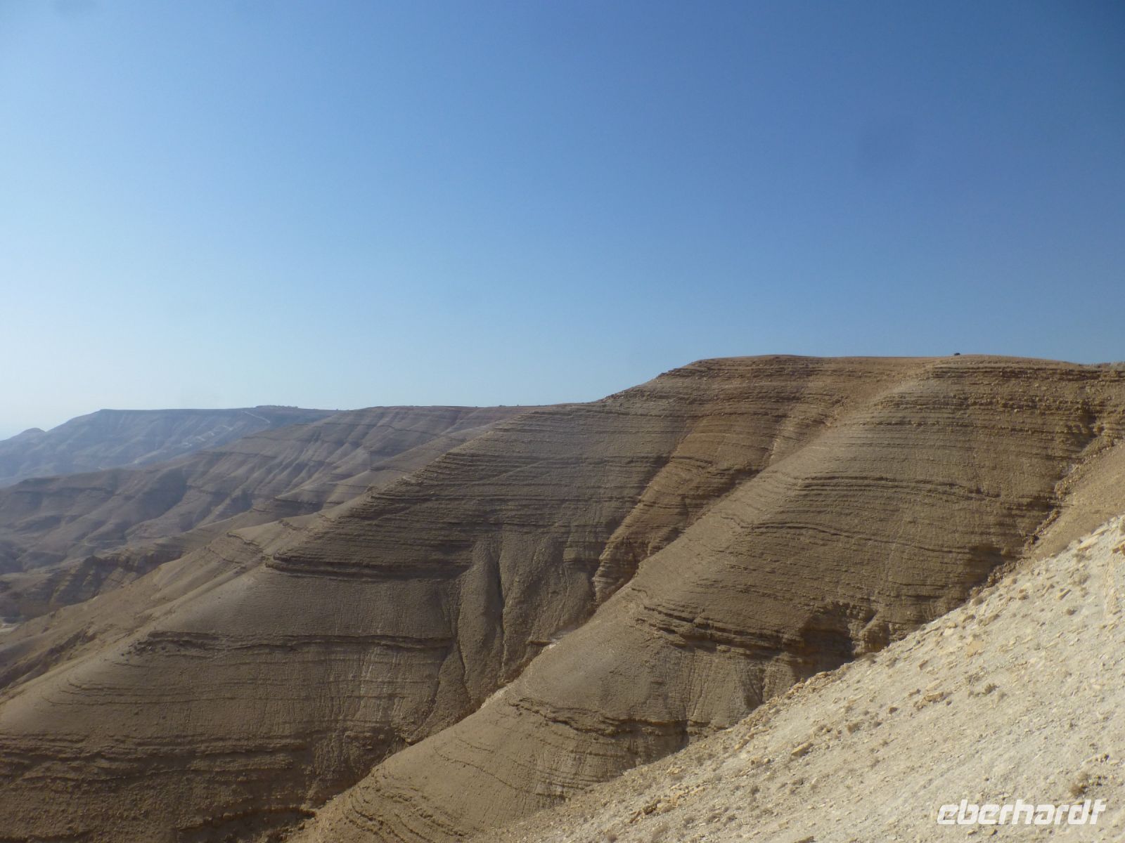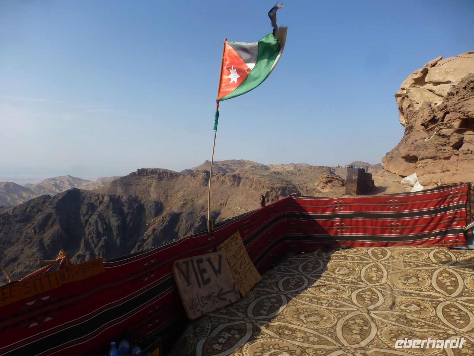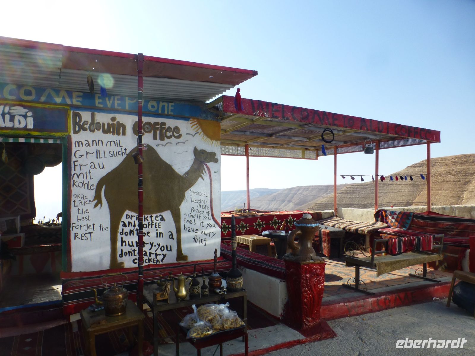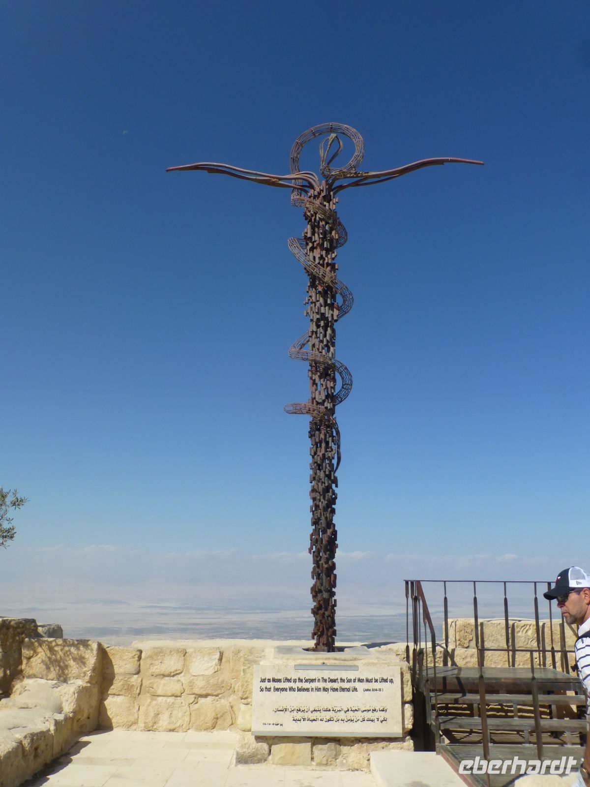 Eine Tafel gibt uns die Orientierung, in welchen Richtungen sich die christlichen Stätten wie Jericho und Jerusalem befinden. Das nördliche Ende des Toten Meeres erblicken wir. Dort werden wir unsere Reise in wenigen Tagen aufs Schönste beenden.