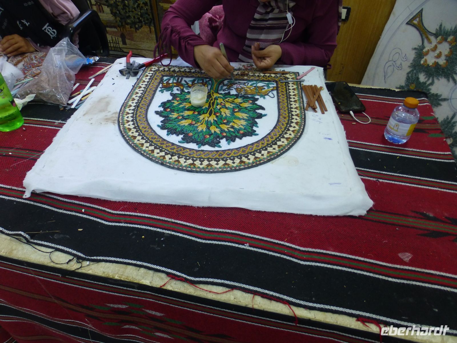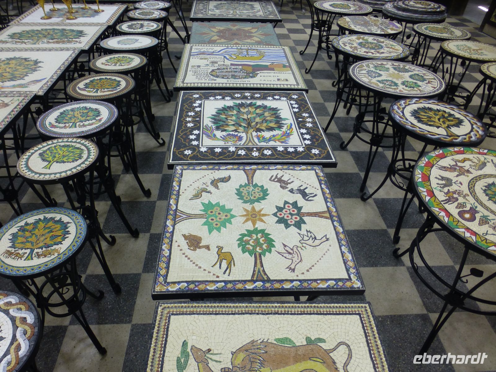 Was es mit der Kunst der Mosaikherstellung auf sich hat, lernen wir in einer Werkstatt, die wir besuchen. Hier werden die Umrisse der Formen vorgezeichnet und in mühsamer Handarbeit mit den kleinen farbigen Steinchen belegt. Wir dürfen auch mal die Zange in die Hand nehmen, um die Steinchen zu zerlegen und sind überrascht, wie viel Kraft dafür nötig ist.