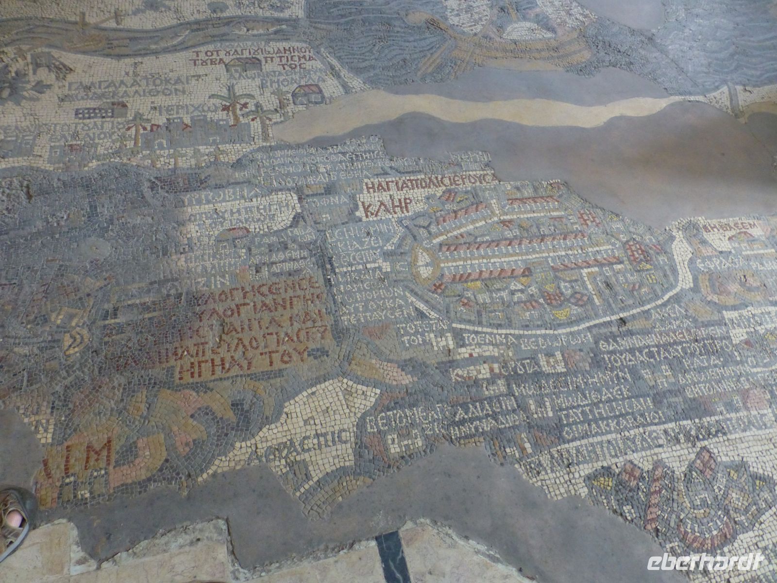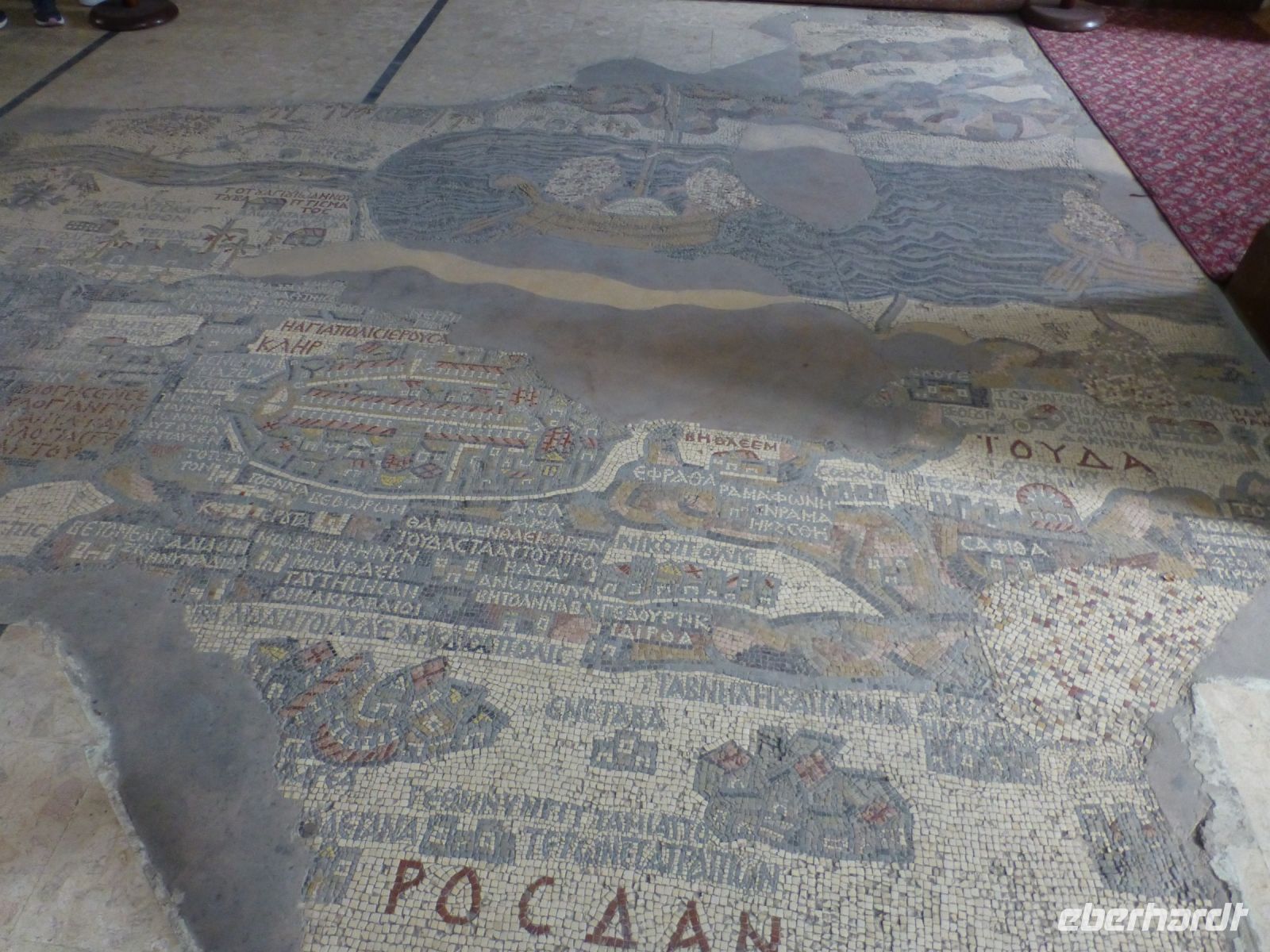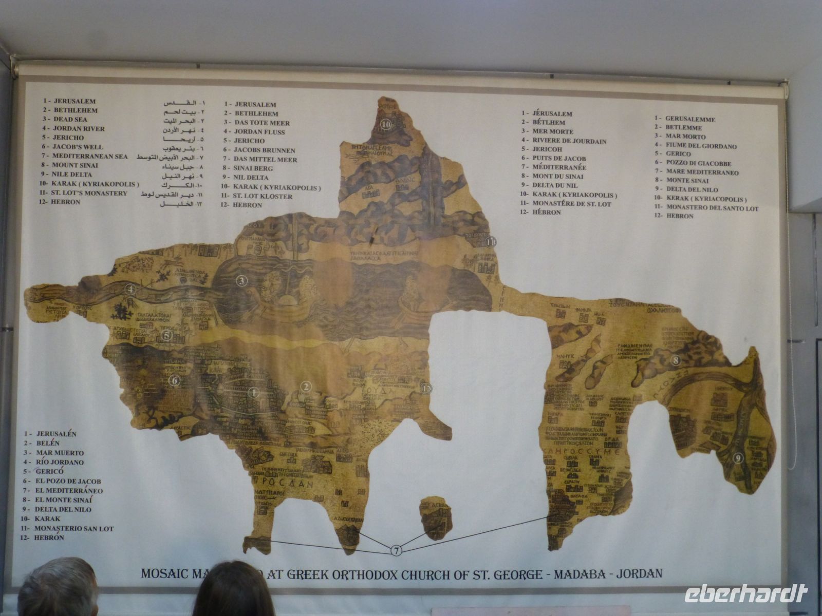 Weiterfahrt nach Madaba, ein alter Handelsstützpunkt an der früheren Königstraße und Zentrum der Mosaikkunst. Unter den Römern erlangte es einen Aufschwung und war gleichbedeutend mit Jerash und Amann. Doch von dieser Glanzzeit ist kaum mehr etwas übrig. Weit eindrucksvoller sind die Zeugnisse aus der byzantinischen Zeit, zu der auch die Sehenswürdigkeit gehört, die ihresgleichen sucht: eine Palästinakarte als Mosaik. Sie ziert den Boden der griechisch-orthodoxen St. Georgskirche. Zuerst erhalten wir eine Einführung, sitzen wie Schüler in den Bänken und Mahmoud erklärt uns anhand einer Wandkarte mit Zeigestock die Karte. Unten ist der Osten mit Jerusalem und Jericho, darüber das Tote Meer. Diese Erklärung ist sehr hilfreich, denn das Mosaik ist stark beschnitten, ein Kirchenpfeiler wurde einfach hinein gerammt. Die Topographie ist abgebildet und zwei Brücken überspannen den Jordan und verbinden beide Ufer miteinander. Es gab auch friedliche Zeiten.