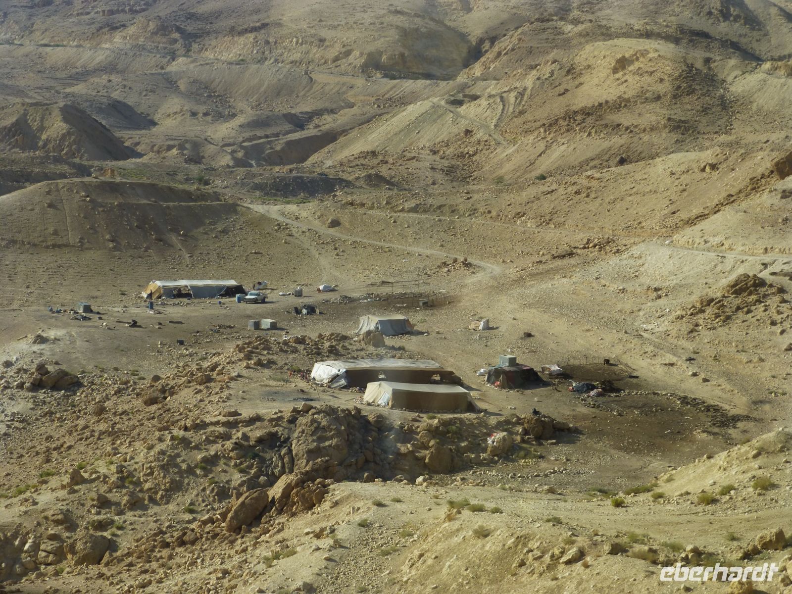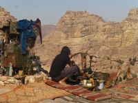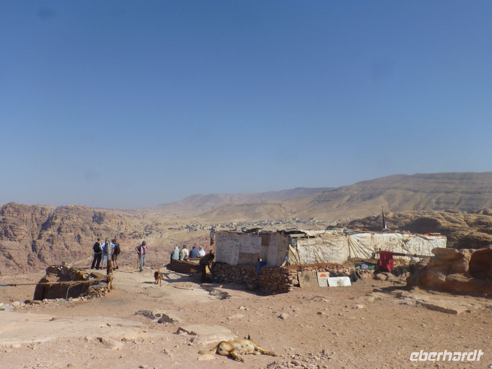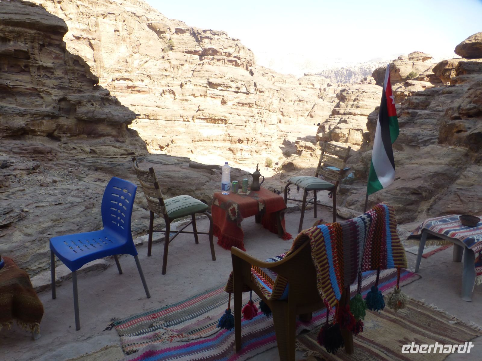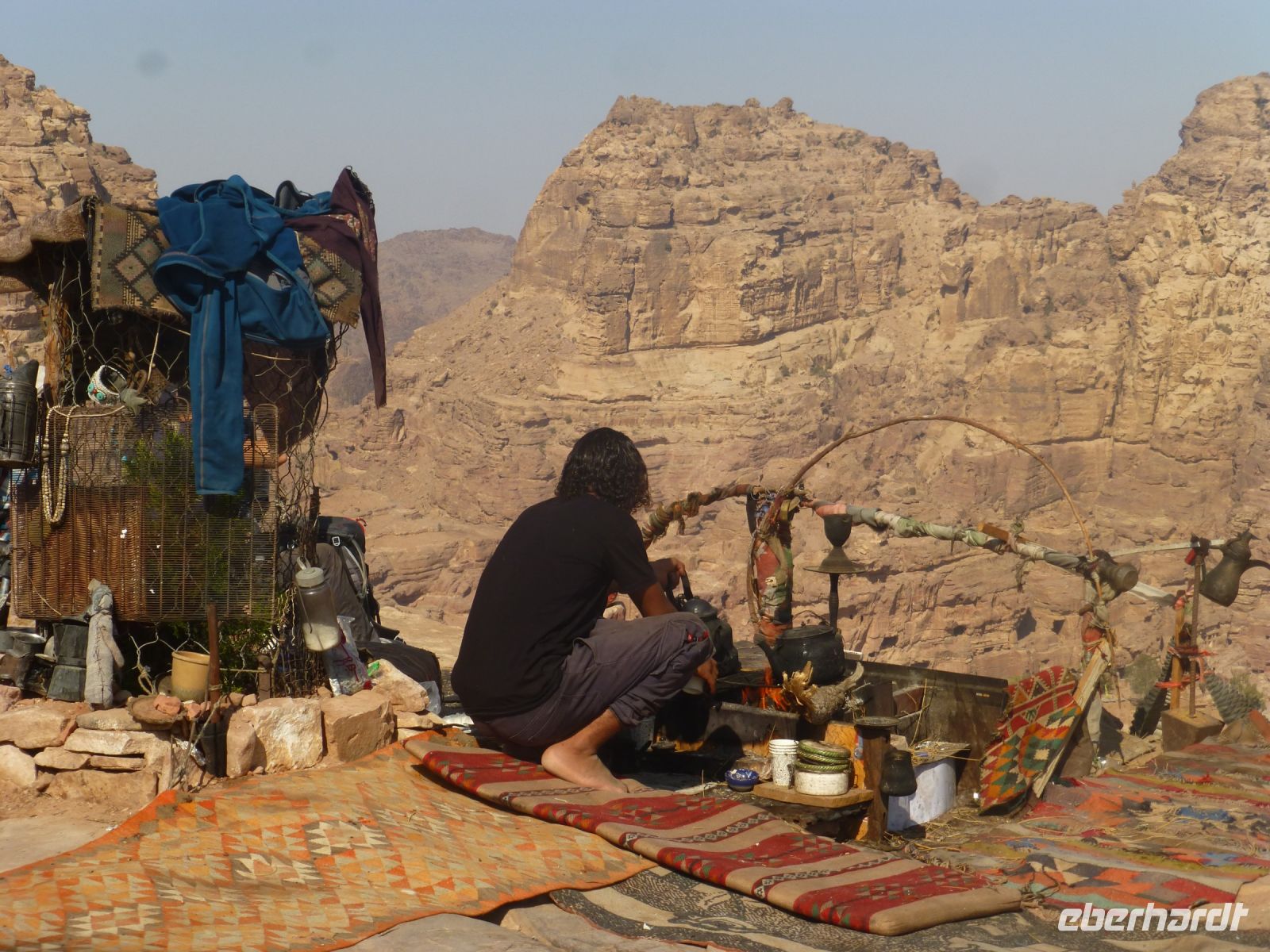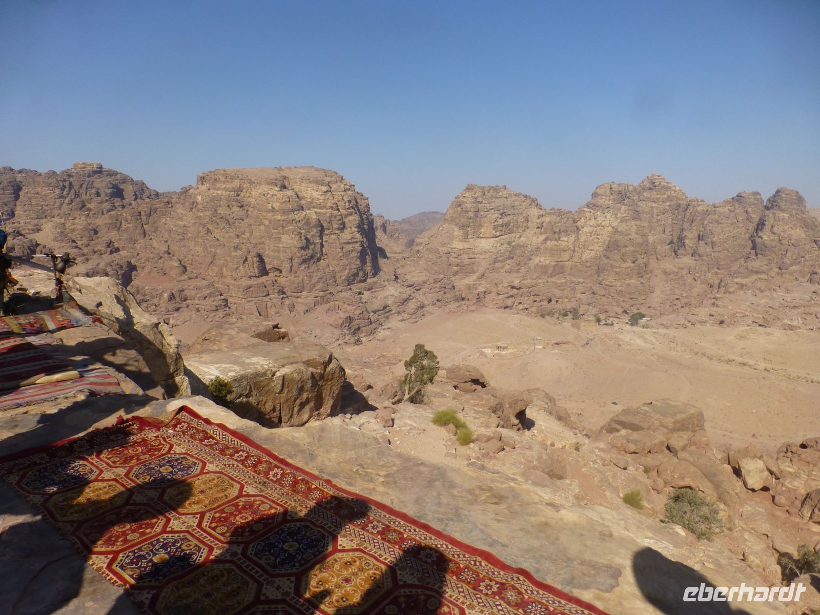 Und nicht weit von diesen Wundern lokaler Baukunst steht das nächste Beduinenzelt, davor Teppiche auf dem Fels ausgebreitet, der Teekessel auf offenem Feuer. Und wir haben den raumgreifenden Blick über die ganze Stadt mit ihren 620 Fassadengräbern.