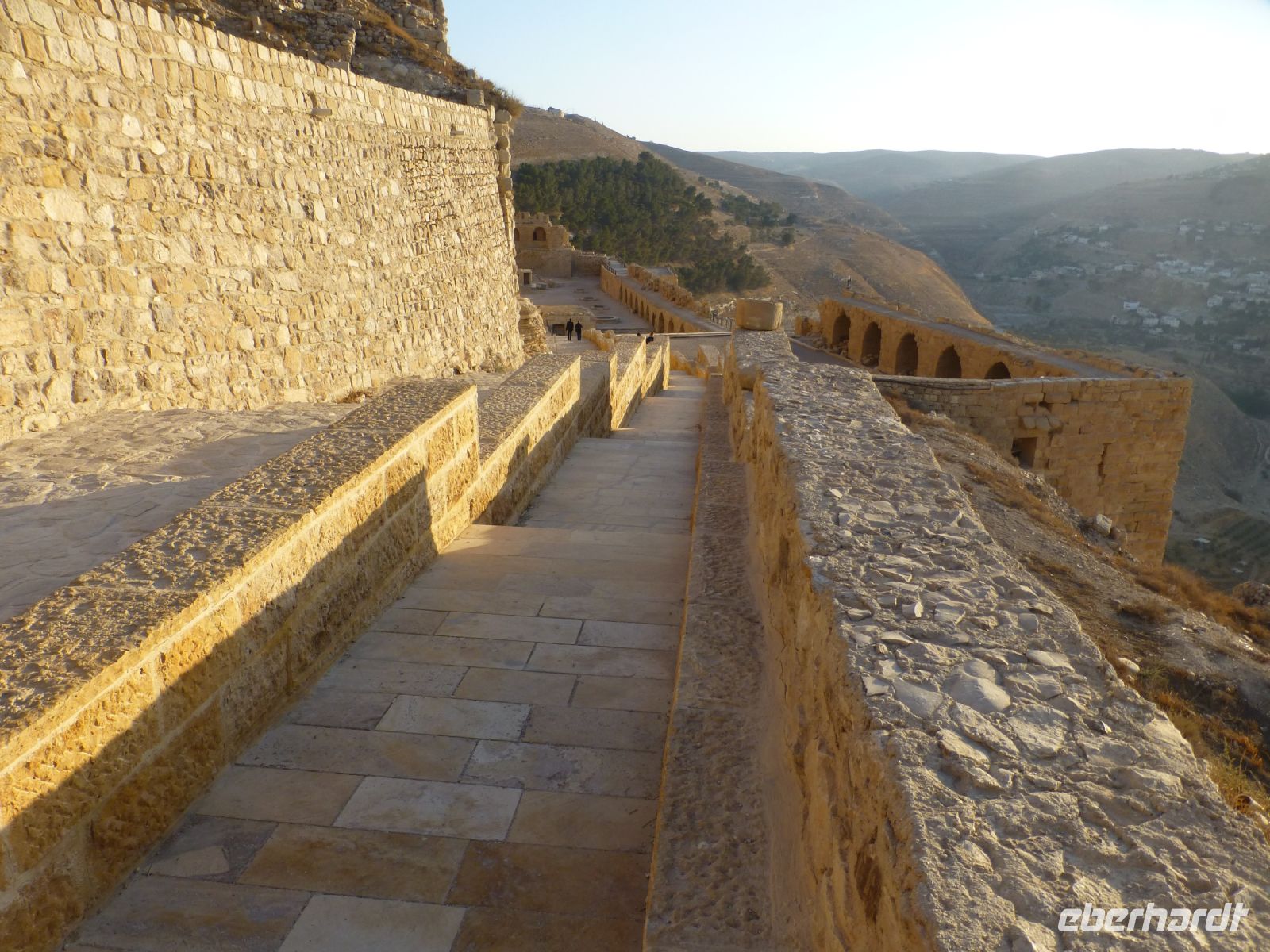 Danach geht es weiter auf der Königsstraße nach Kerak. Die Königsstraße ist eine mehr als 4000 Jahre alte Handelsroute und führt von Nordsyrien bis zum Roten Meer. Sie war eine Lebensader zunächst der Moabiter, dann der Nabatäer. Kaiser Trajan ließ von 111 bis 114 n. Chr. die 430 km lange Strecke zu einer römischen Straße ausbauen, zur Via Traiana Nova. Diese verband Damaskus und Bosra, die Städte der Dekapolis (Skythopolis, Pella, Gerasa/Jerash, Philadelphia/Amman), die Nabatäerstadt Petra und den Golf von Aqaba. Die neue Fernstraße erleichterte den Warenaustausch zwischen Syrien und Palästina und der neuen römischen Provinz Arabien.