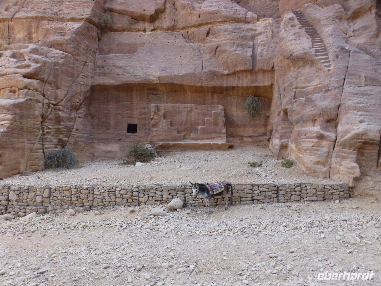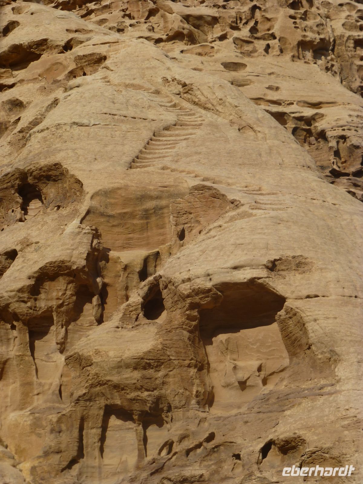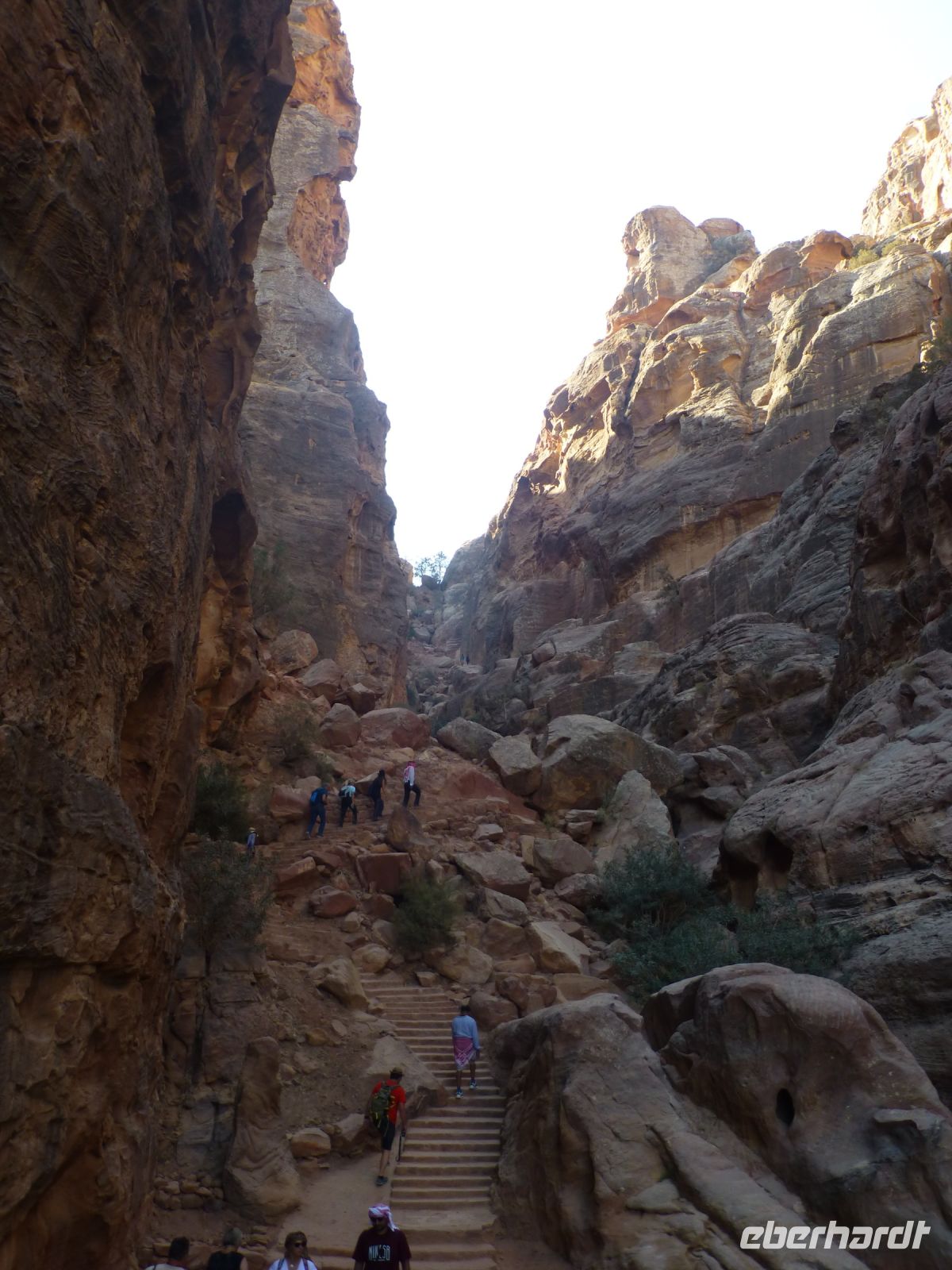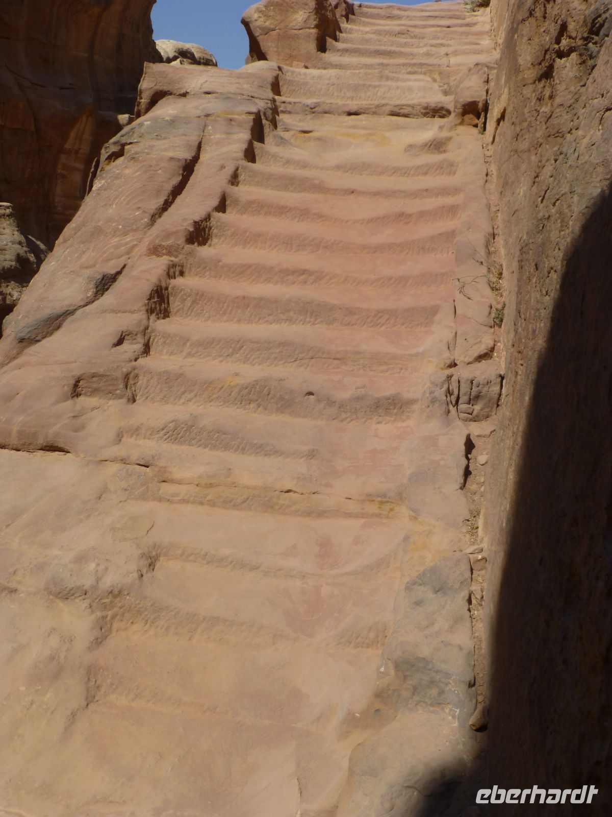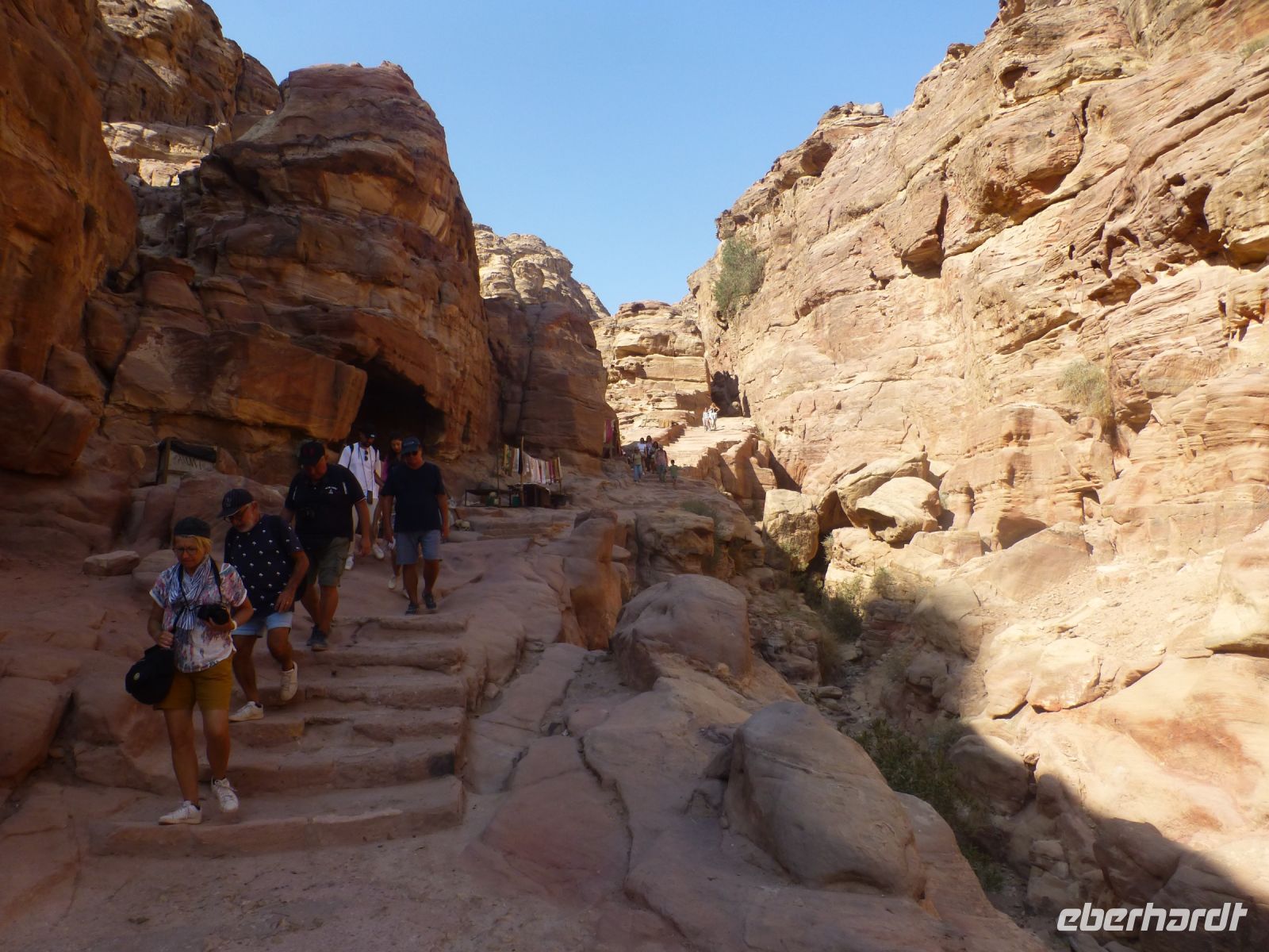 Nach dieser Pause gehören wir uns selbst und alle bleiben in der Ausgrabung und schauen sich noch einmal das an, was sie noch nicht gesehen haben oder noch einmal genauer in Augenschein nehmen wollen. Ich mache mich auf zum Felsentempel Ed-Deir, das über unzählige Treppenstufen zu erreichen ist. Auf der Strecke geht es zu wie auf der Autobahn.