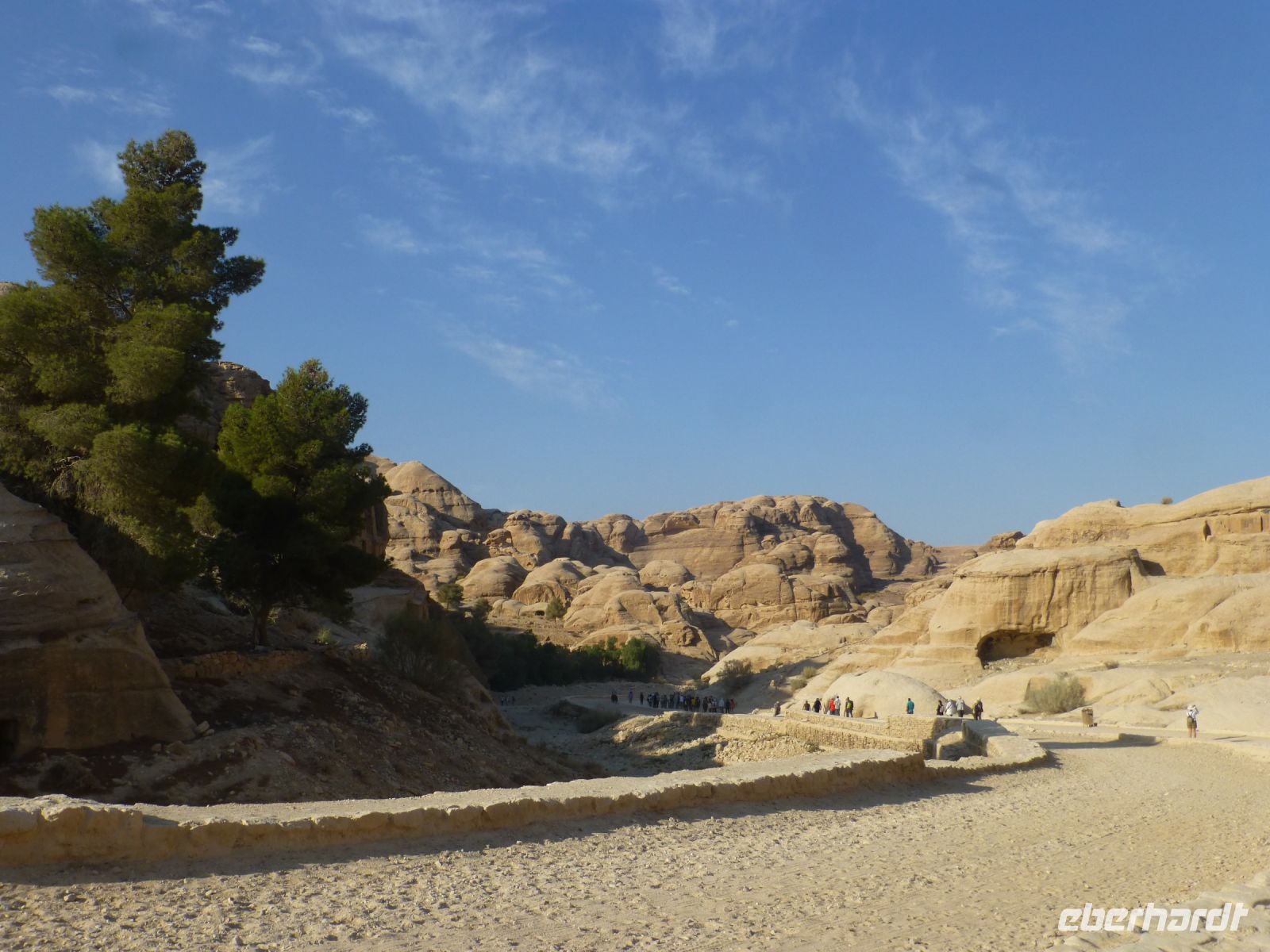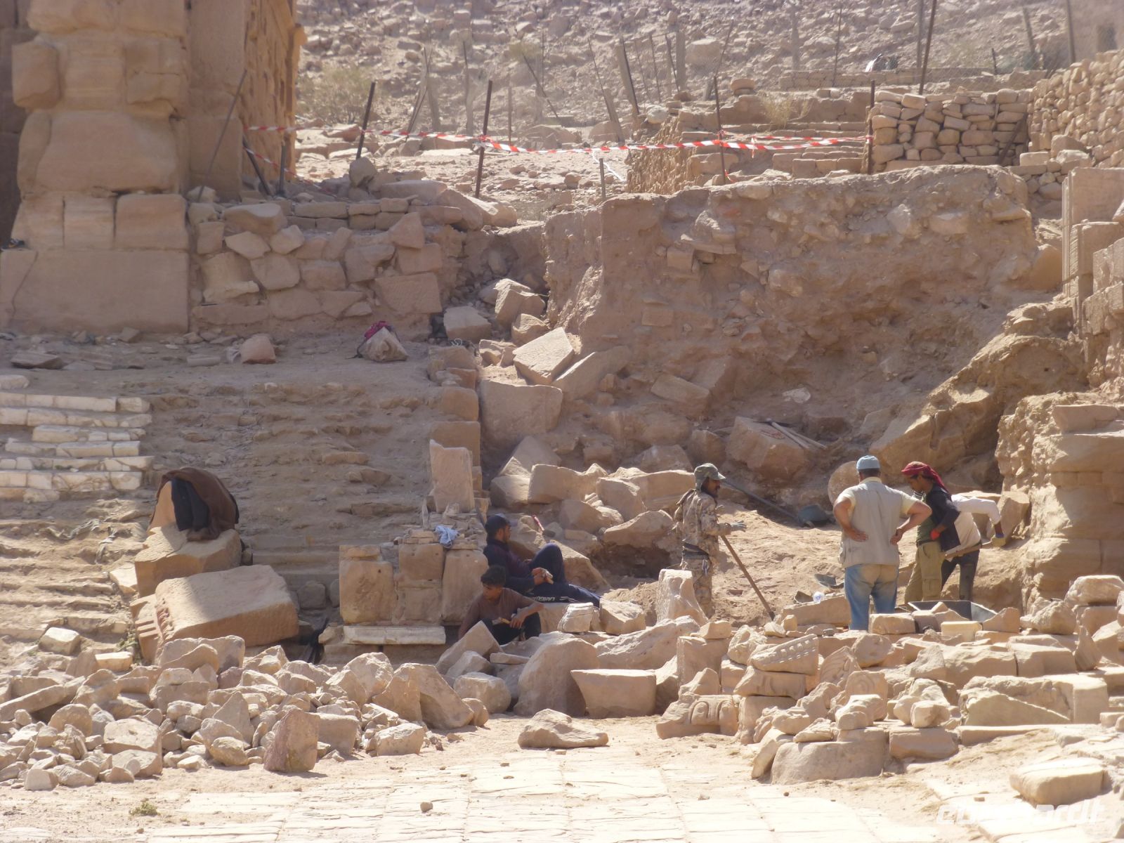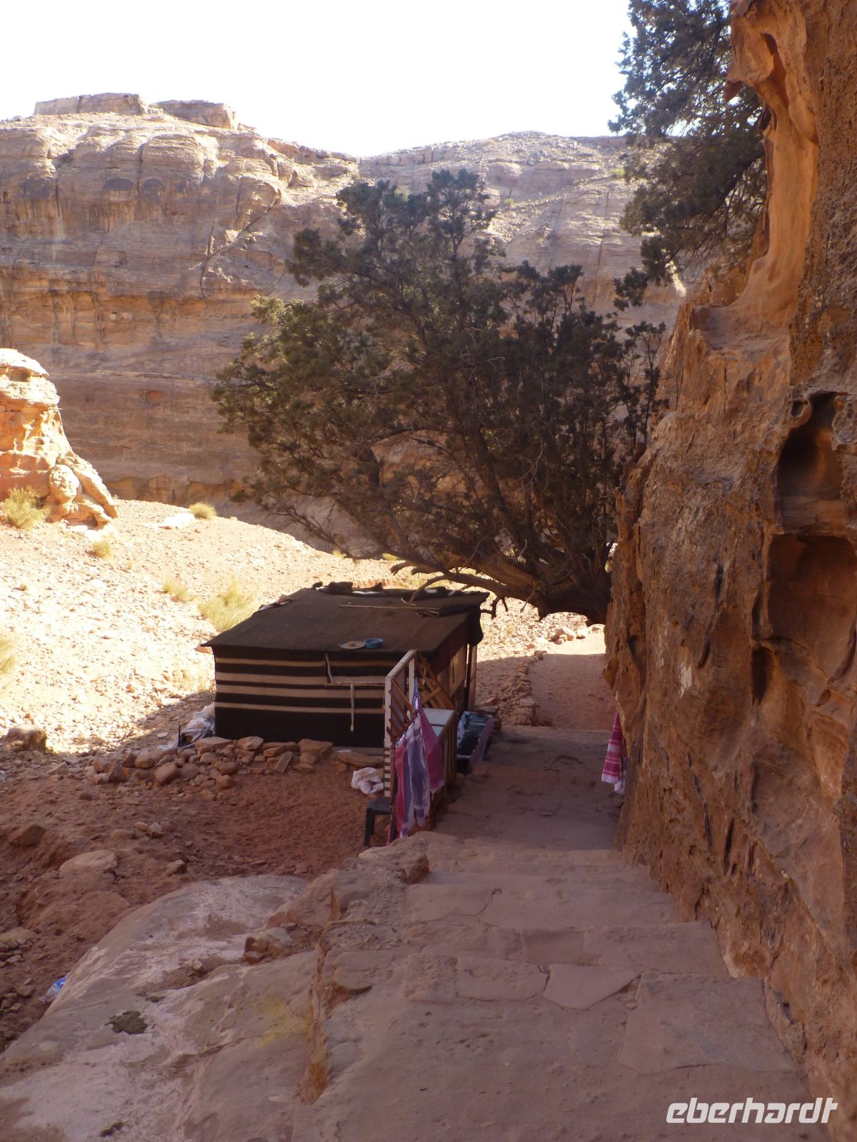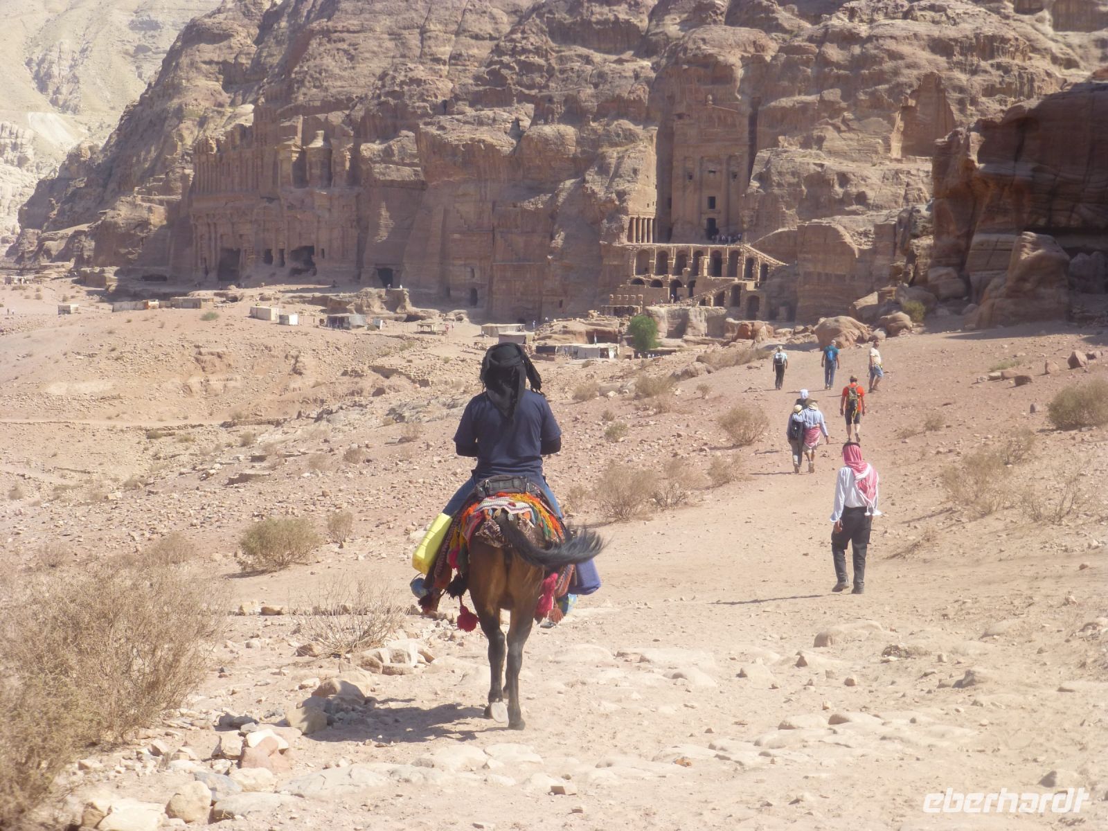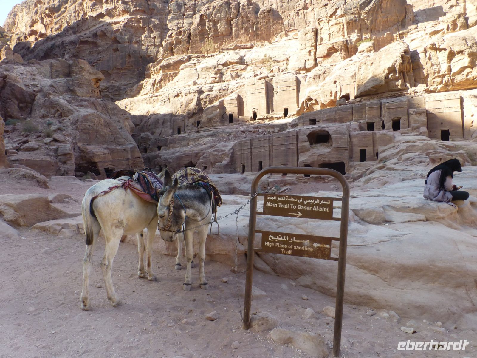 Nach dieser Pause gehören wir uns selbst und alle bleiben in der Ausgrabung und schauen sich noch einmal das an, was sie noch nicht gesehen haben oder noch einmal genauer in Augenschein nehmen wollen. Ich mache mich auf zum Felsentempel Ed-Deir, das über unzählige Treppenstufen zu erreichen ist. Auf der Strecke geht es zu wie auf der Autobahn.