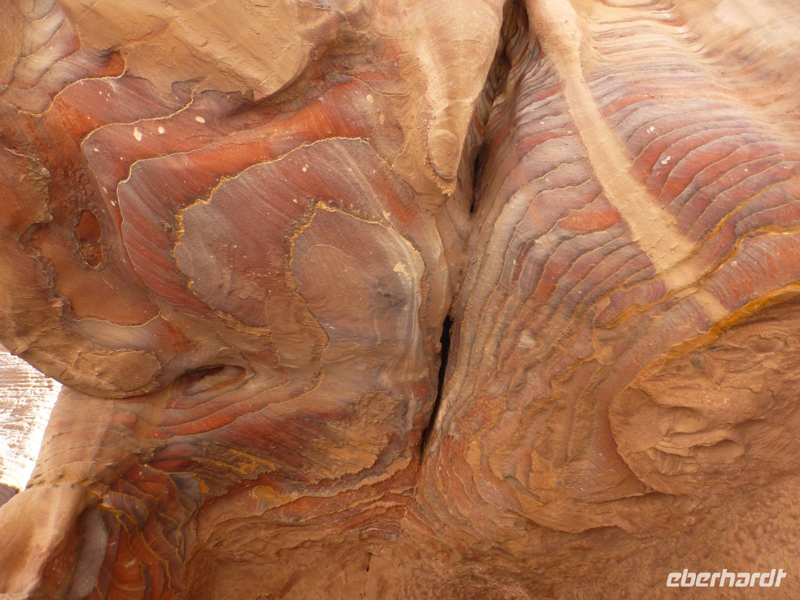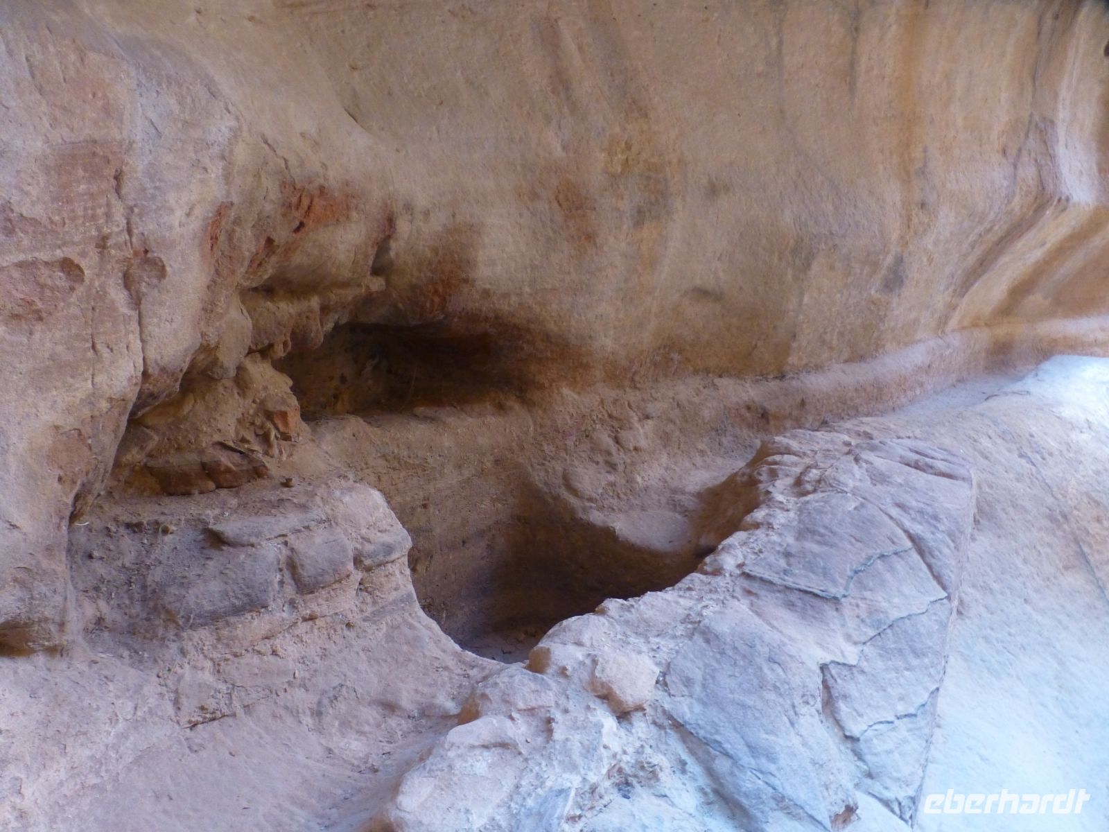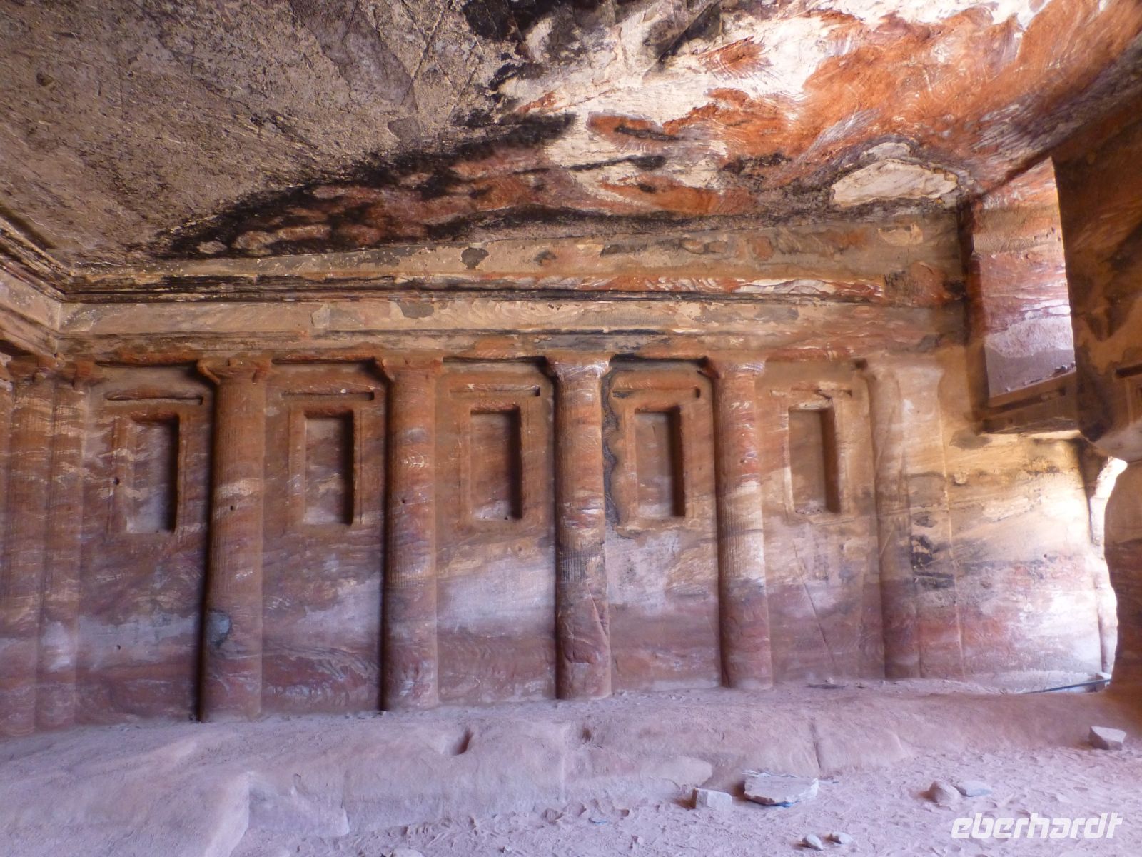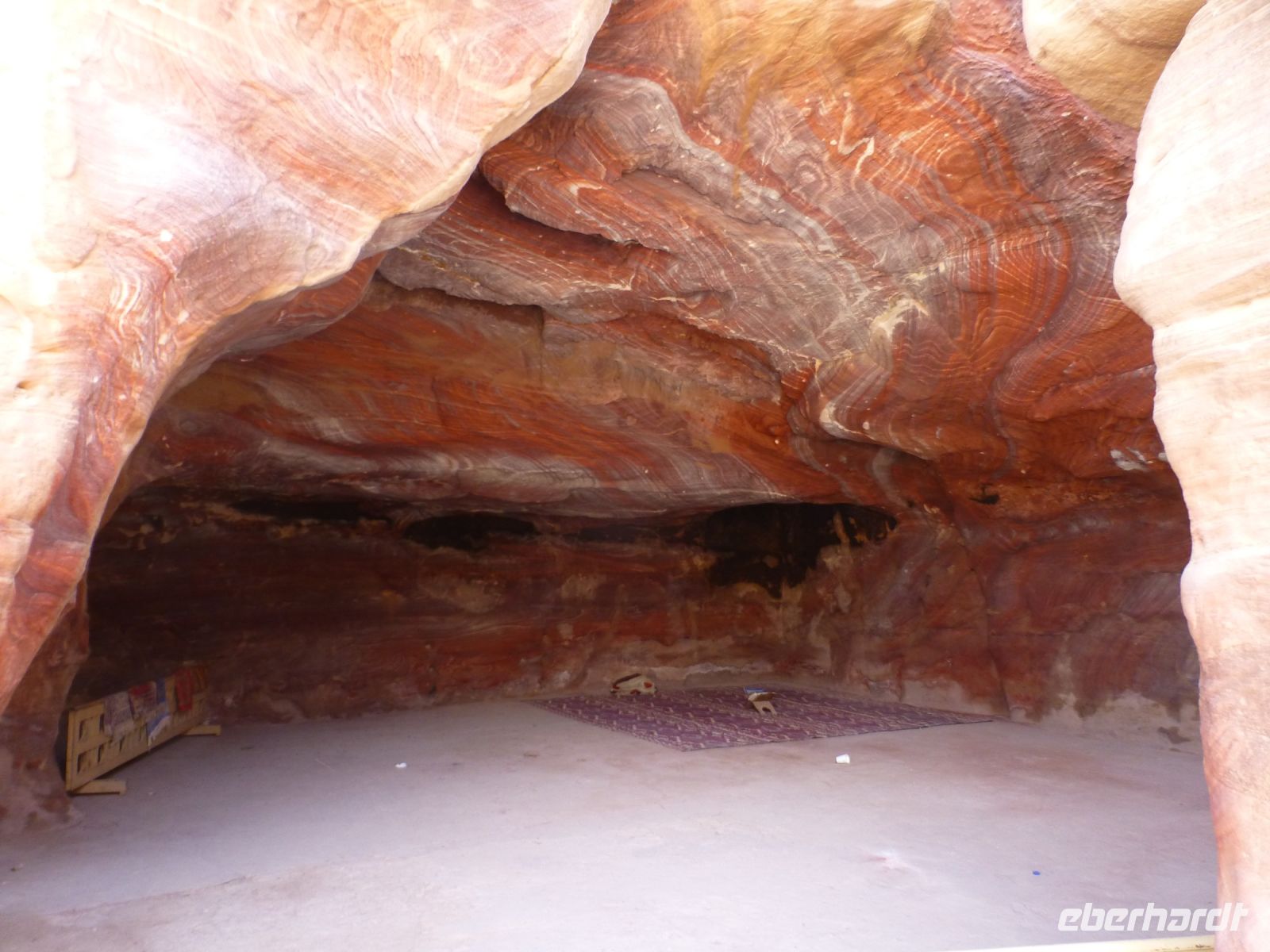 Und unser Blick ist nun auch mächtig geschärft – wie beim Pilzesuchen – wir erkennen vorgeglättete Felswände, die damit für den passenden Ort einer Grabstätte werben wollen, so scheint es. Wir machen uns auf Wasserrinnen aufmerksam, die – richtig – zum Löwenbrunnen führen. Die Stufen sind steil, z.T. rutschig, Vorsicht ist geboten. Wir erreichen den Gartentempel mit Zisterne und einem Röhrensystem. Der Winkel liegt ein wenig verborgen, wirkt fast heimelig. Wir bestaunen Grabräume, in denen der Sandstein in den unwahrscheinlichsten Farben leuchtet. Und finden den Weg in unser Beduinenzelt, wo wir alle wieder zusammentreffen.