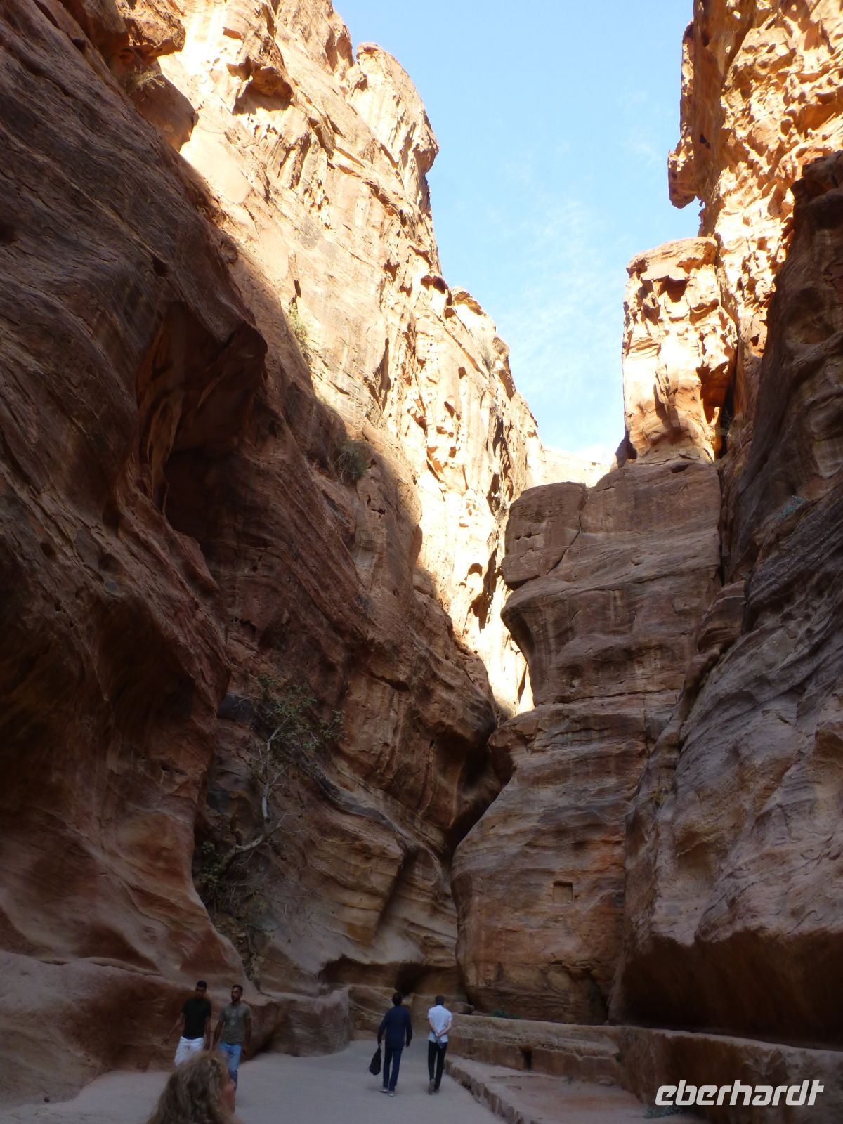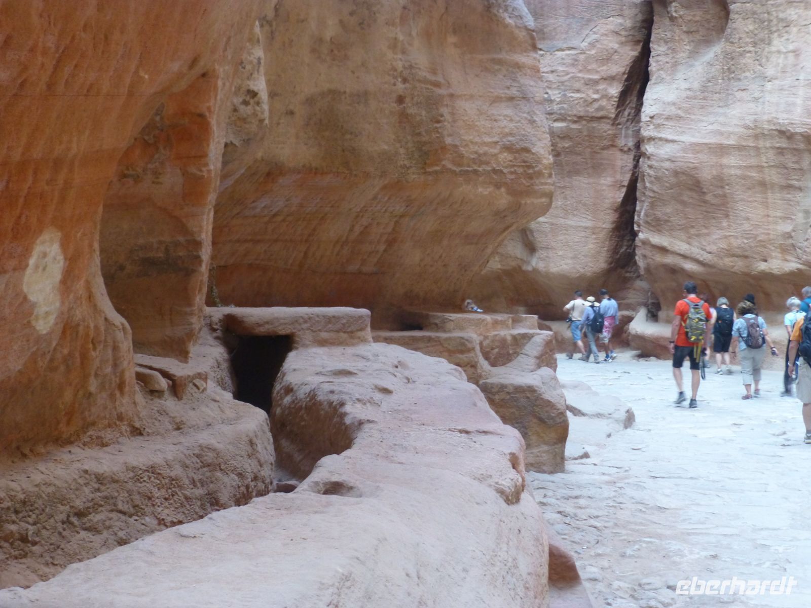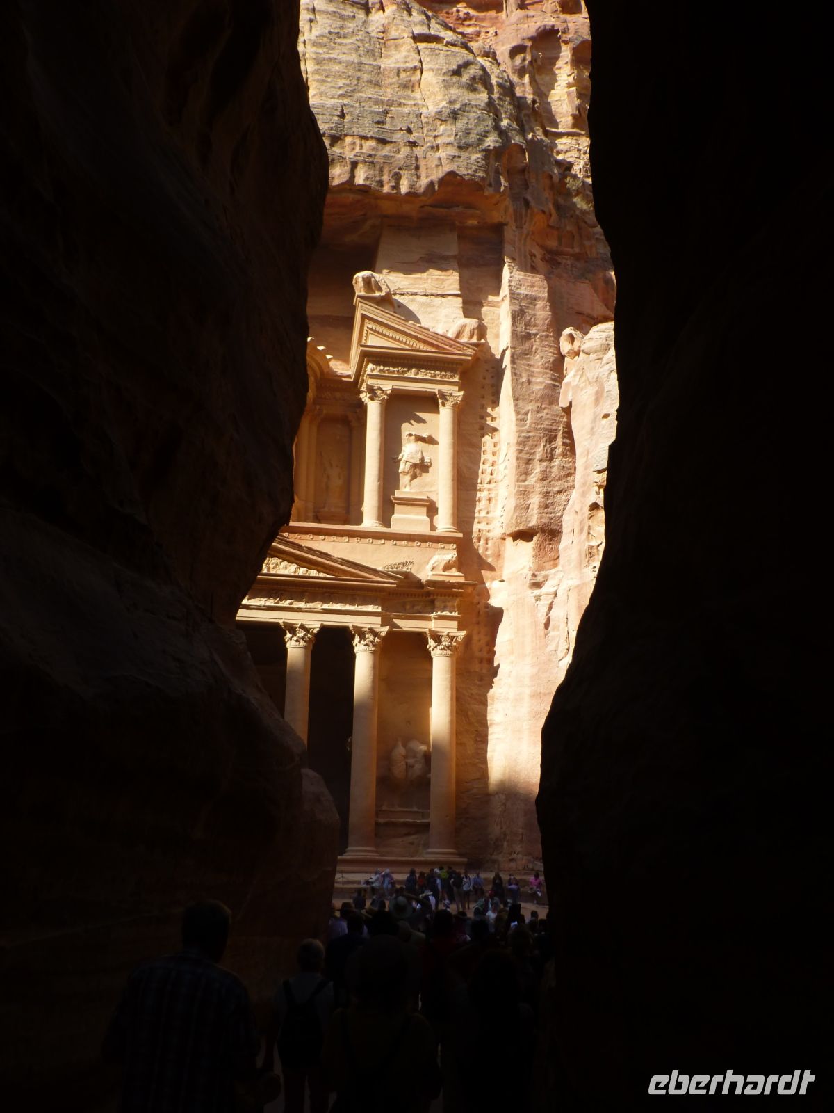 Um 8 Uhr sind wir alle am Start und bereits auf dem Weg zum Siq erklärt uns Mahmoud anhand von Gräbern links und rechts die Bedeutung. Einige von uns haben Dokumentationen über die Stadt gesehen und haben schon den Blick geschärft, z.B. für die Wasserrinne, die uns auf der linken Seite durch den Siq begleitet, in den Fels geschlagen mit Becken hie und da, um die Tiere zu tränken. Die engen Felswände links und rechts, das Sonnenlicht, das einfällt, die Farbigkeit des Sandsteins, wir recken unsere Hälse, drehen sie in alle Himmelsrichtungen, stolpern dabei fast über die Überbleibsel der alten Römerstraße und stehen dann beeindruckt vor dem bekannten Bildmotiv: Das Schatzhaus leuchtet von der Morgensonne angestrahlt durch den dunklen Siq uns entgegen. Herzlich willkommen in der Hauptstadt eines Königreiches, das um Frieden und Reichtum beneidet worden ist, scheint es uns sagen zu wollen. Es ist eine Skulptur, kein Bauwerk, da im Ganzen aus dem Fels geschlagen. Es ist auch das Paradebeispiel, wie frei und spielerisch sich die Nabatäer der Formensprache anderer bedient haben. Das Giebeldreieck teilten sie und zogen es um die Ecke, dazwischen setzen sie eine Rotunde. Wir treffen noch auf Obelisken, Elefanten, was für die Einzigartige Verbindung von Morgen- und Abendland steht.