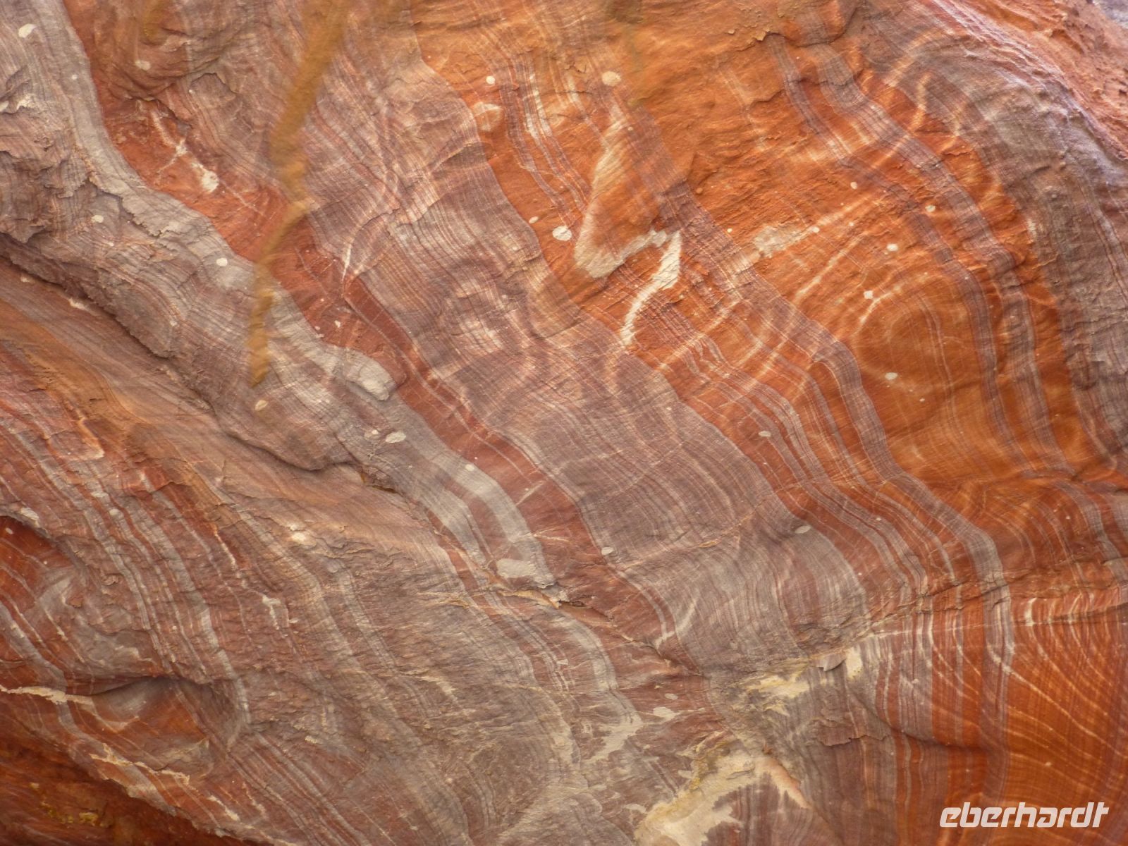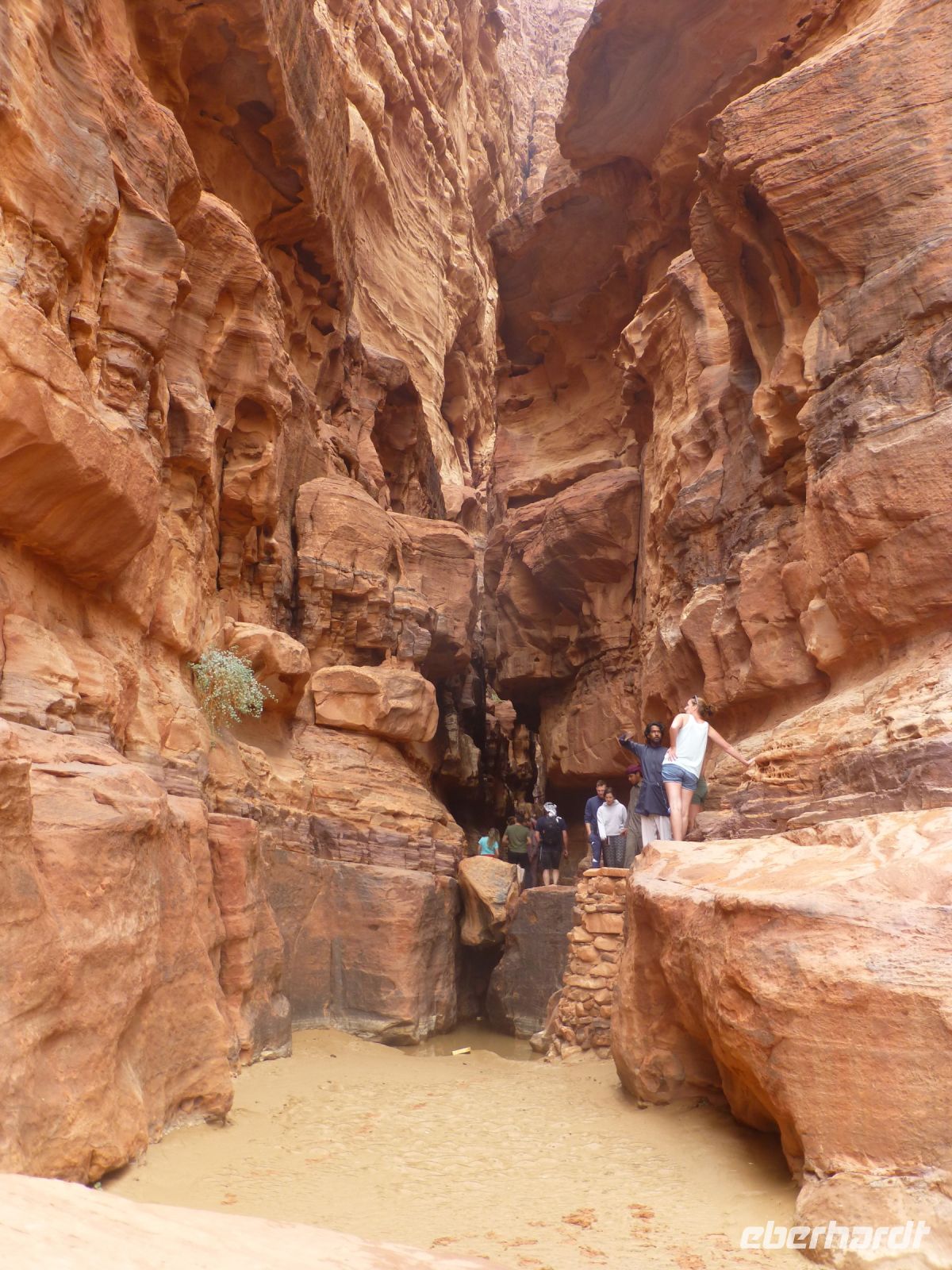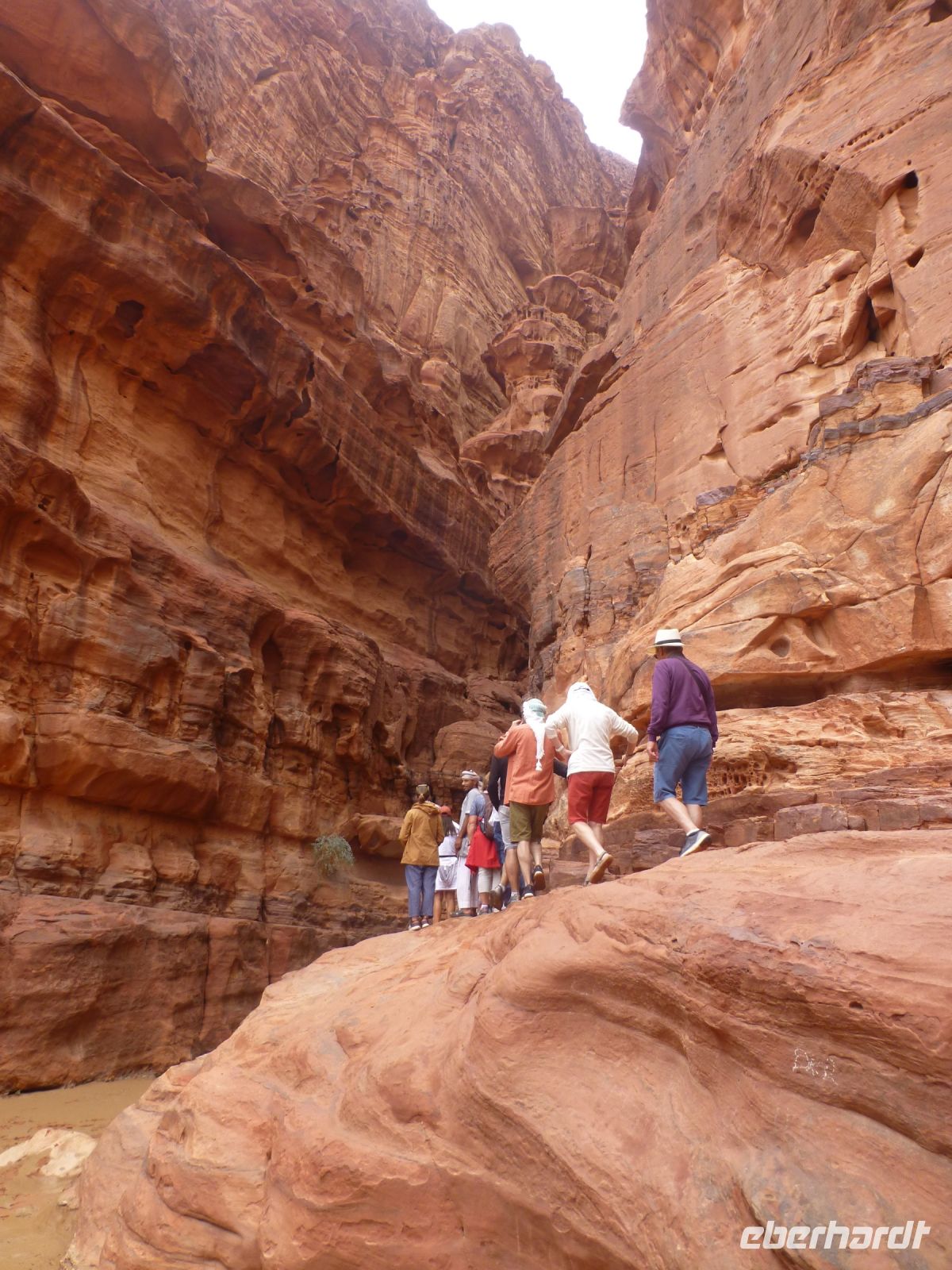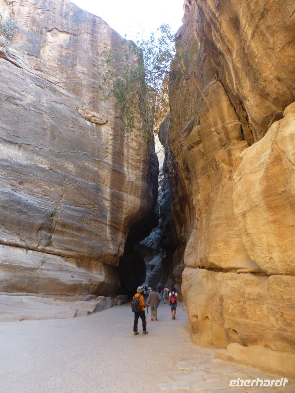 Um 8 Uhr sind wir alle am Start und bereits auf dem Weg zum Siq erklärt uns Mahmoud anhand von Gräbern links und rechts die Bedeutung. Einige von uns haben Dokumentationen über die Stadt gesehen und haben schon den Blick geschärft, z.B. für die Wasserrinne, die uns auf der linken Seite durch den Siq begleitet, in den Fels geschlagen mit Becken hie und da, um die Tiere zu tränken. Die engen Felswände links und rechts, das Sonnenlicht, das einfällt, die Farbigkeit des Sandsteins, wir recken unsere Hälse, drehen sie in alle Himmelsrichtungen, stolpern dabei fast über die Überbleibsel der alten Römerstraße und stehen dann beeindruckt vor dem bekannten Bildmotiv: Das Schatzhaus leuchtet von der Morgensonne angestrahlt durch den dunklen Siq uns entgegen. Herzlich willkommen in der Hauptstadt eines Königreiches, das um Frieden und Reichtum beneidet worden ist, scheint es uns sagen zu wollen. Es ist eine Skulptur, kein Bauwerk, da im Ganzen aus dem Fels geschlagen. Es ist auch das Paradebeispiel, wie frei und spielerisch sich die Nabatäer der Formensprache anderer bedient haben. Das Giebeldreieck teilten sie und zogen es um die Ecke, dazwischen setzen sie eine Rotunde. Wir treffen noch auf Obelisken, Elefanten, was für die Einzigartige Verbindung von Morgen- und Abendland steht.