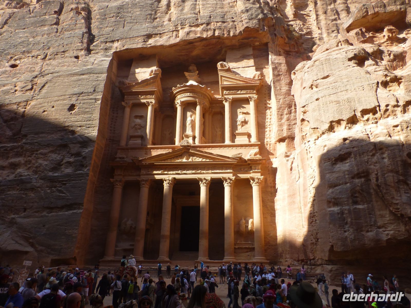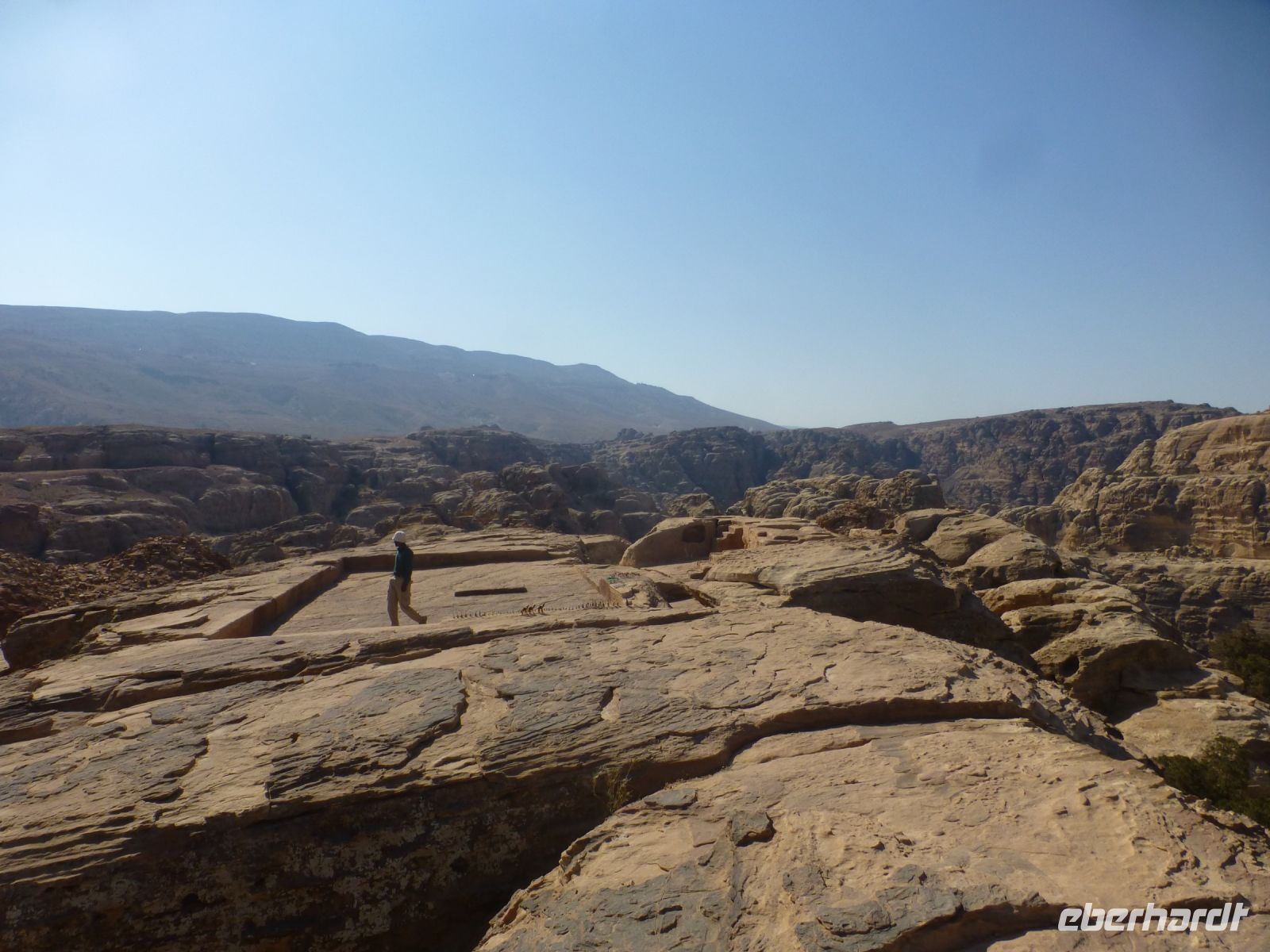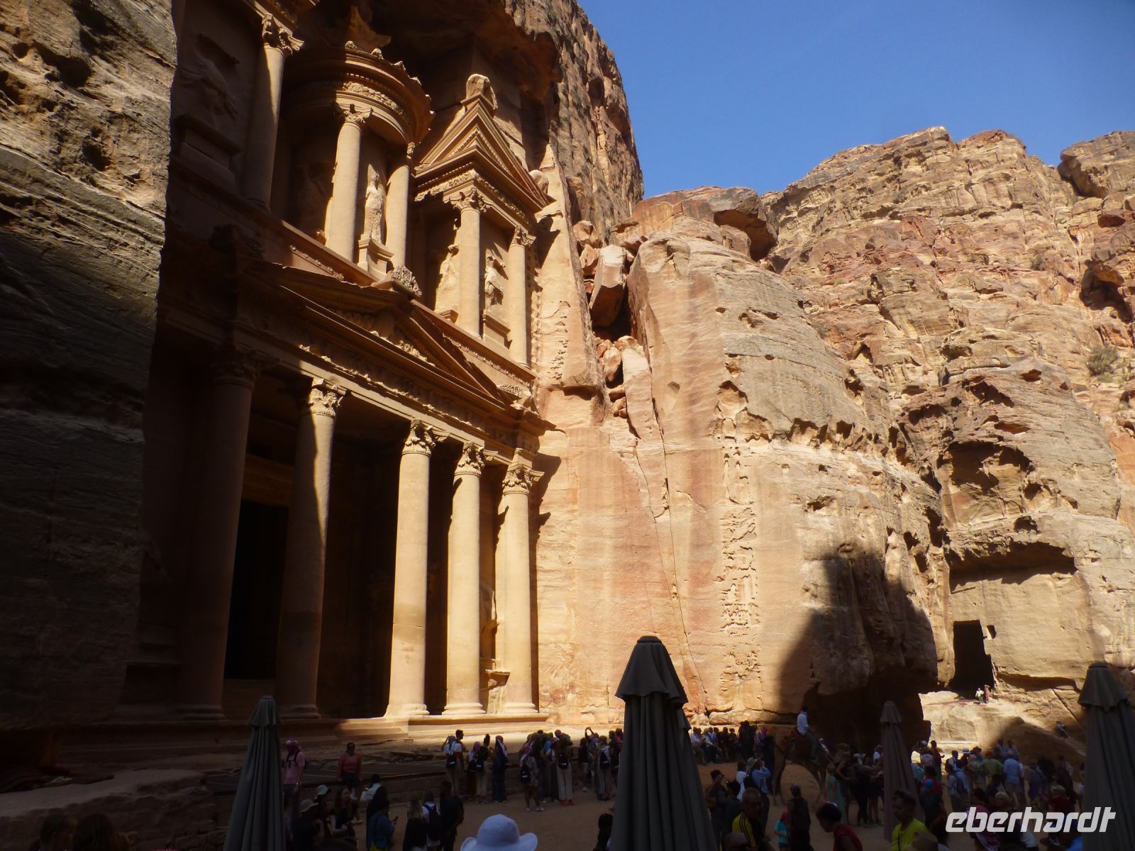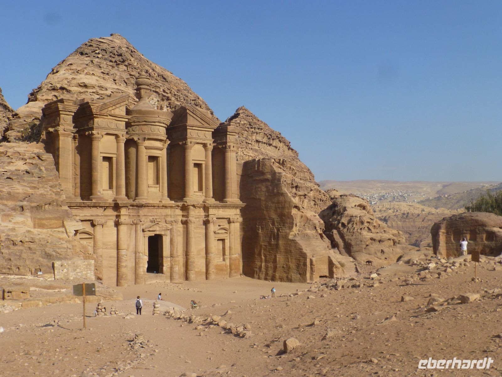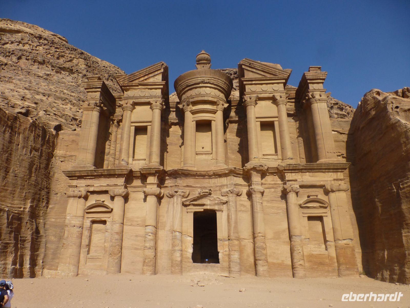 Da ist es gut, die recht stille Tour zum Opferplatz zu kennen. Oben angekommen, präsentiert sich Ed-Deir in seiner vollen Wucht und Schönheit. Dem Schatzhaus nachgeahmt, ist es viel größer und füllt die ganze Breite der Felswand aus. Die Urne auf der Rotunde misst neun Meter und um sie überhaupt sichtbar werden zu lassen, ist die Rückseite des Felsens abgetragen worden.
