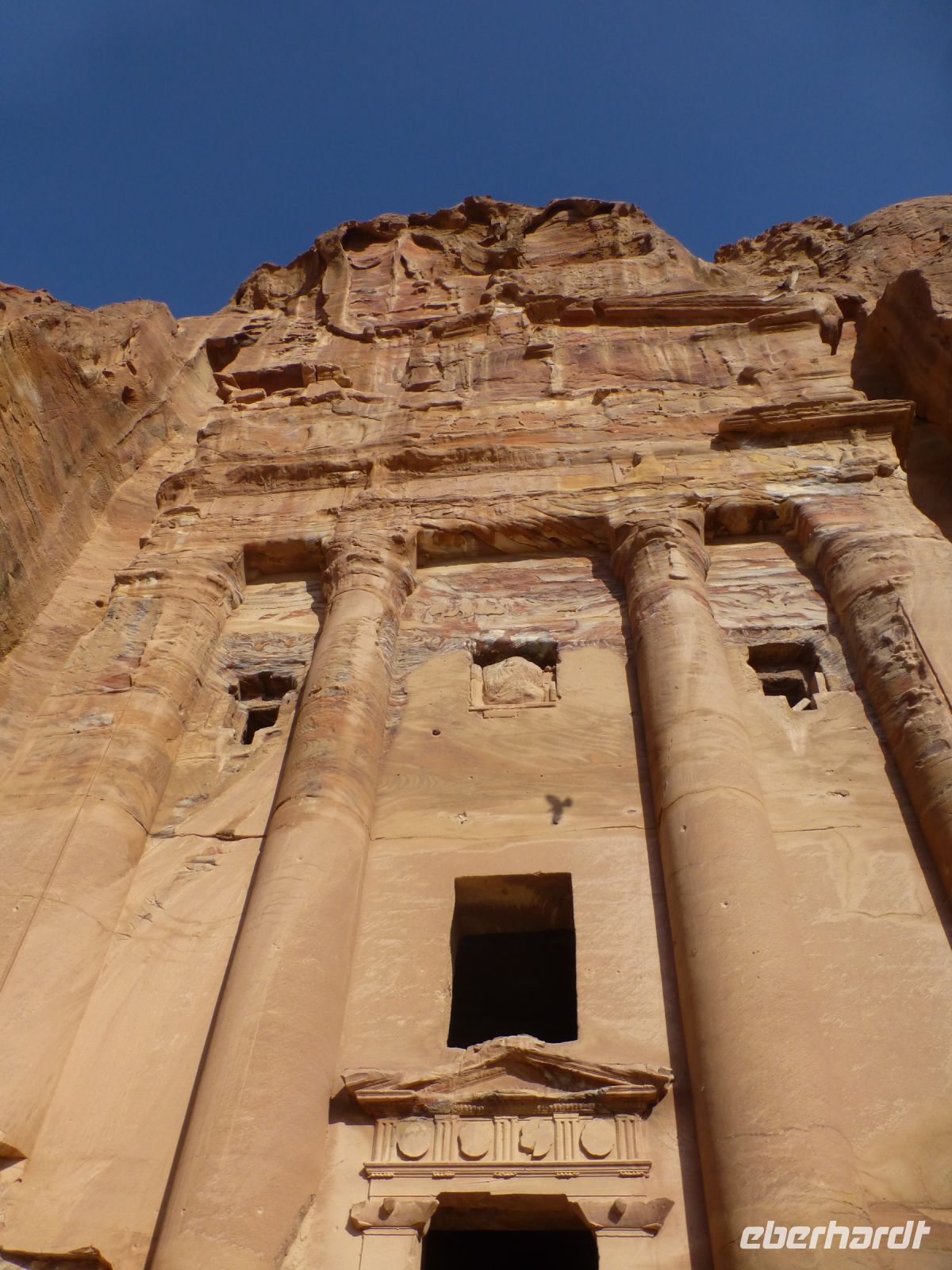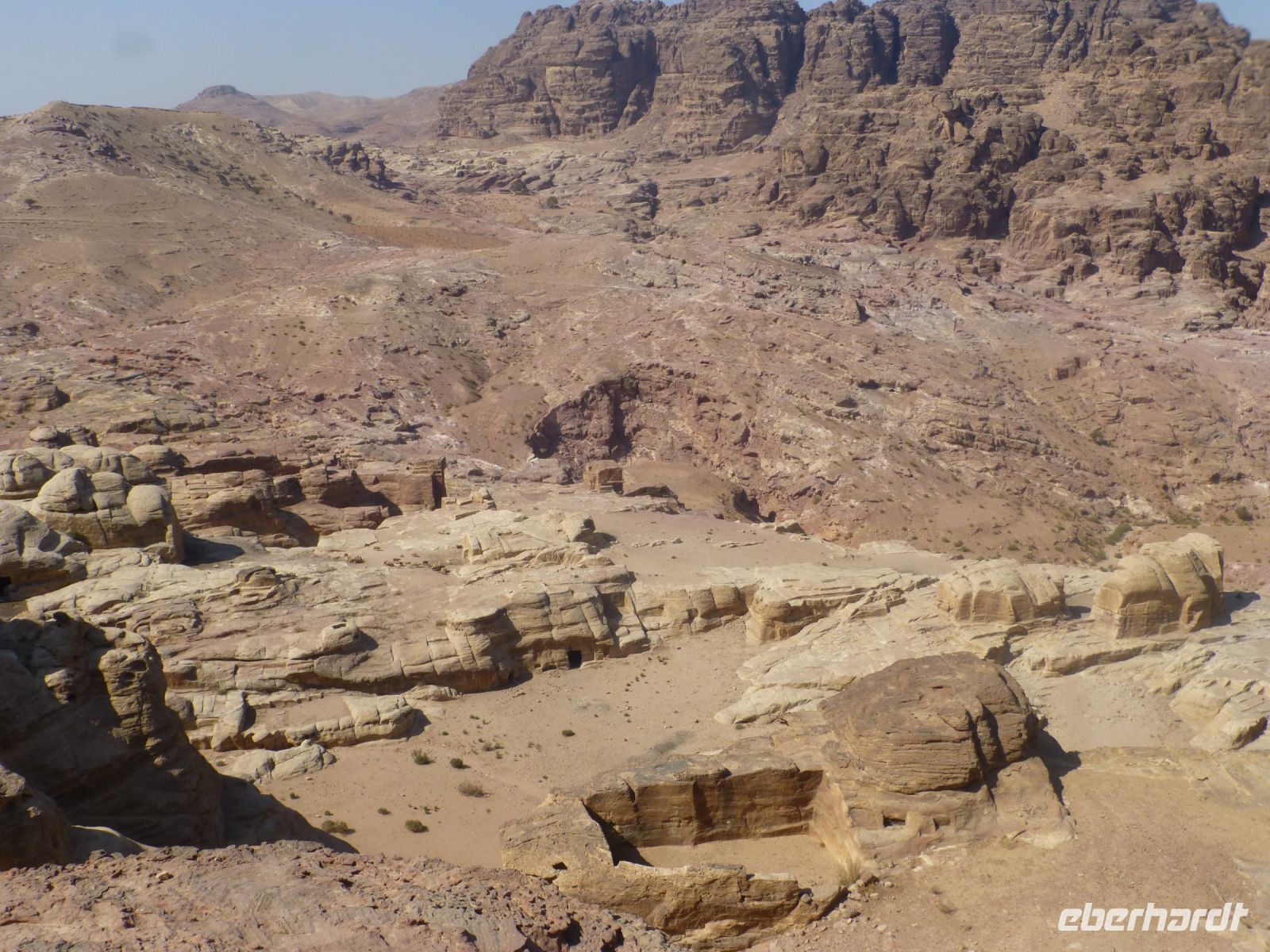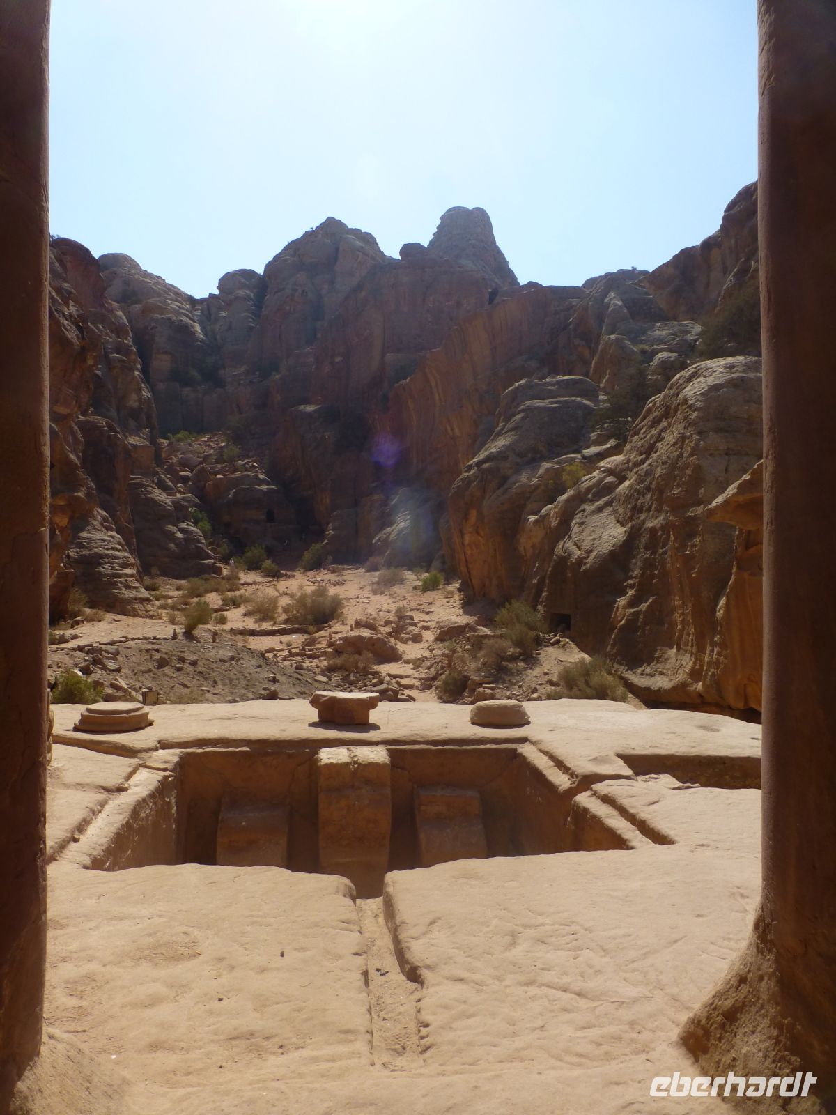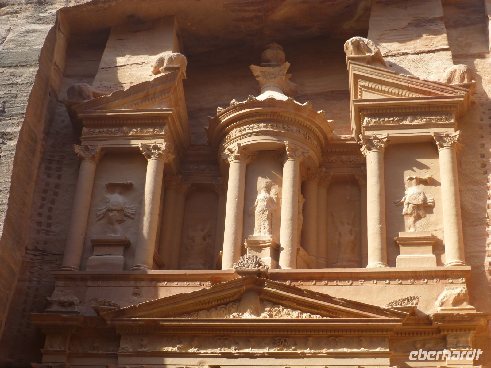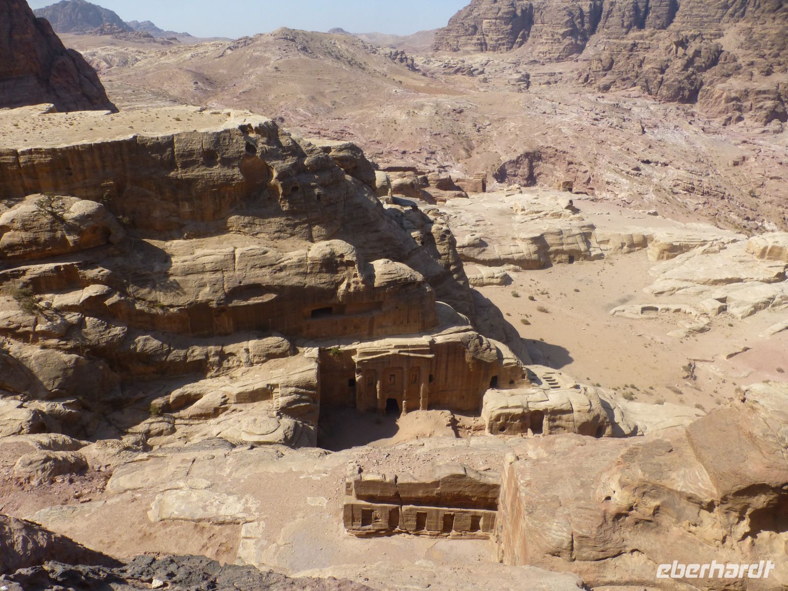 Da ist es gut, die recht stille Tour zum Opferplatz zu kennen. Oben angekommen, präsentiert sich Ed-Deir in seiner vollen Wucht und Schönheit. Dem Schatzhaus nachgeahmt, ist es viel größer und füllt die ganze Breite der Felswand aus. Die Urne auf der Rotunde misst neun Meter und um sie überhaupt sichtbar werden zu lassen, ist die Rückseite des Felsens abgetragen worden.