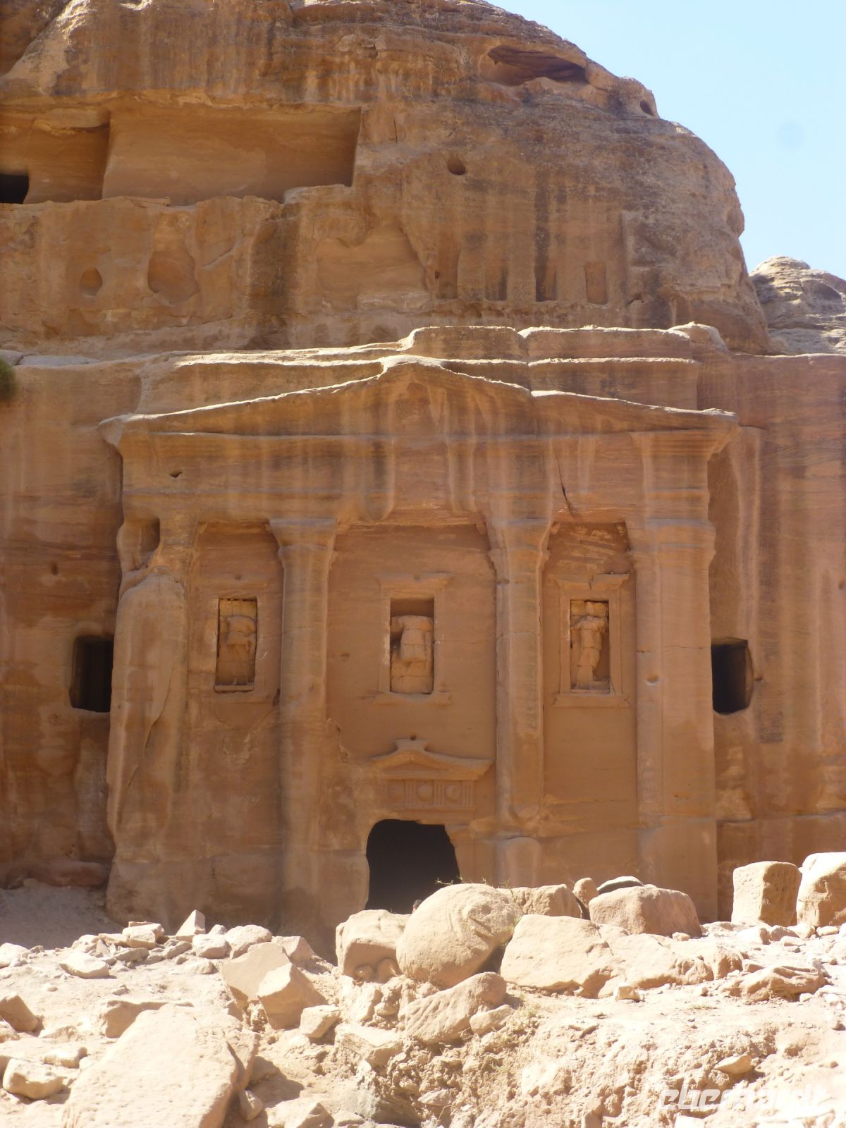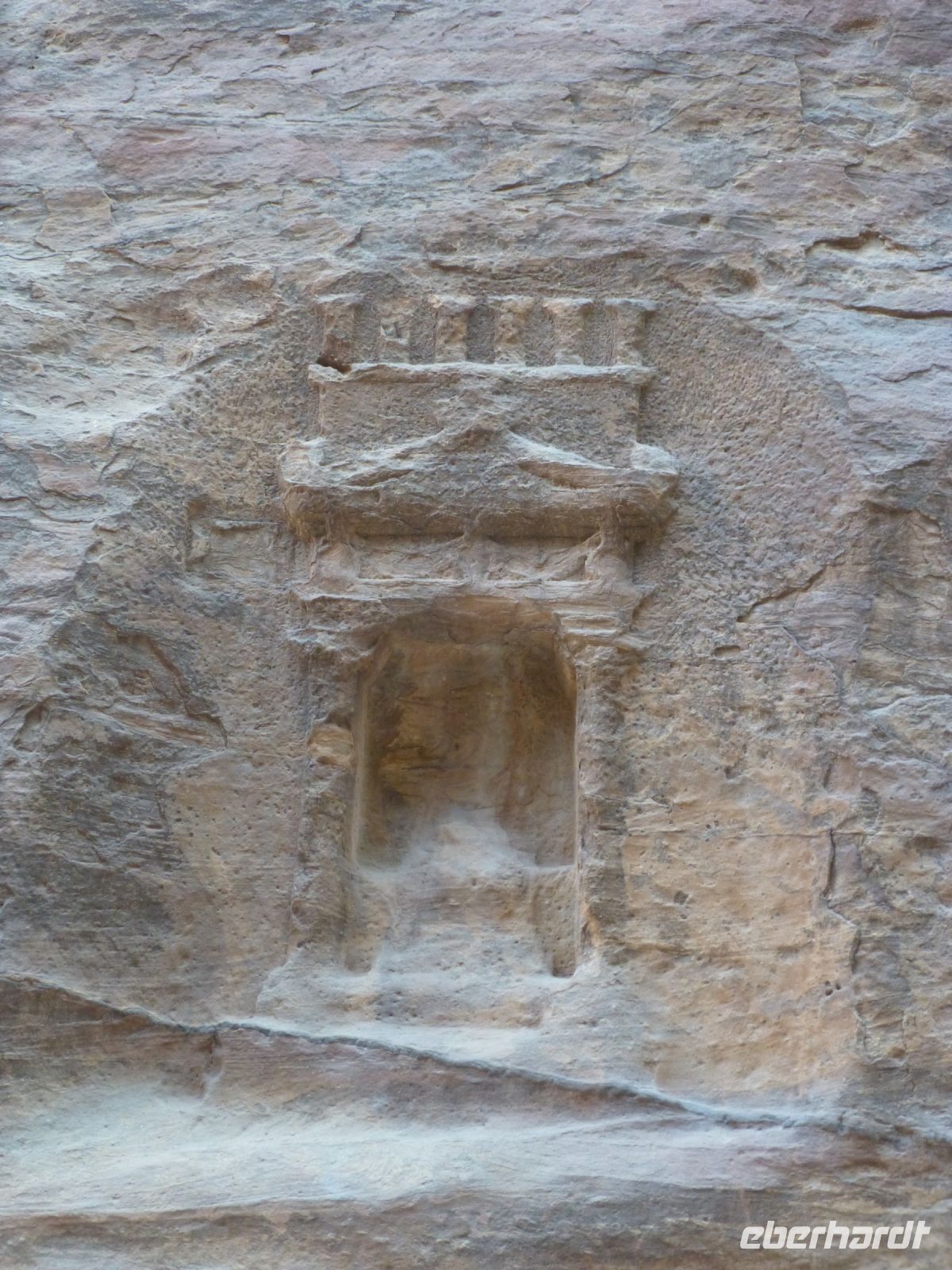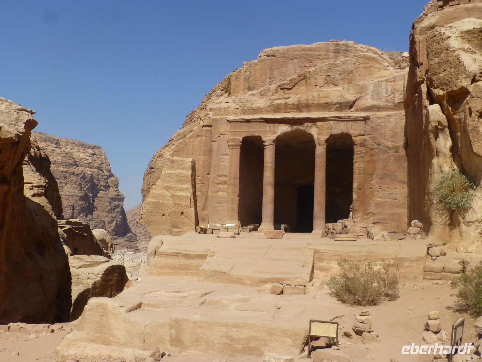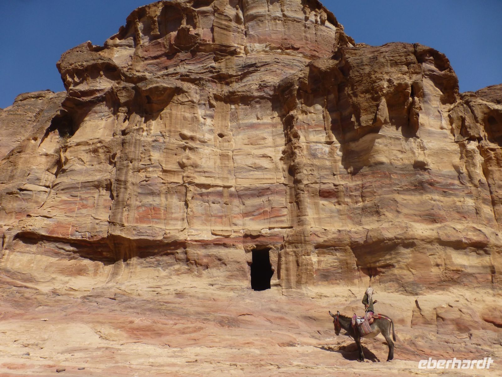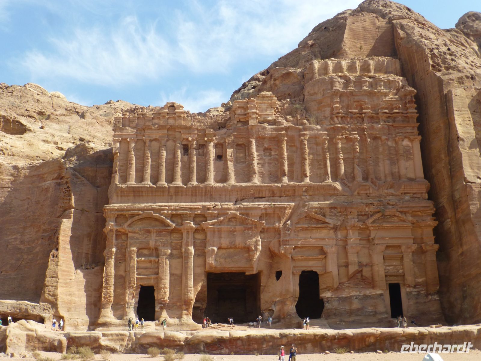 Da ist es gut, die recht stille Tour zum Opferplatz zu kennen. Oben angekommen, präsentiert sich Ed-Deir in seiner vollen Wucht und Schönheit. Dem Schatzhaus nachgeahmt, ist es viel größer und füllt die ganze Breite der Felswand aus. Die Urne auf der Rotunde misst neun Meter und um sie überhaupt sichtbar werden zu lassen, ist die Rückseite des Felsens abgetragen worden.