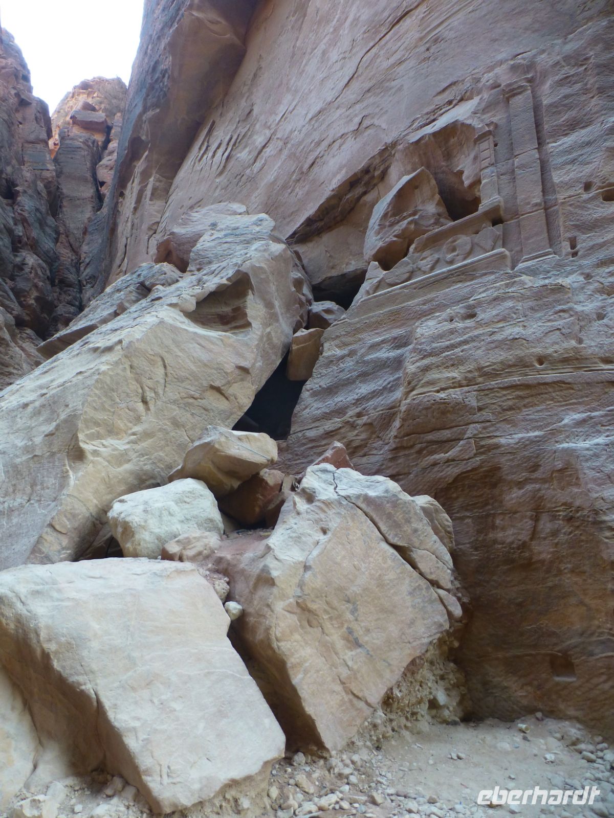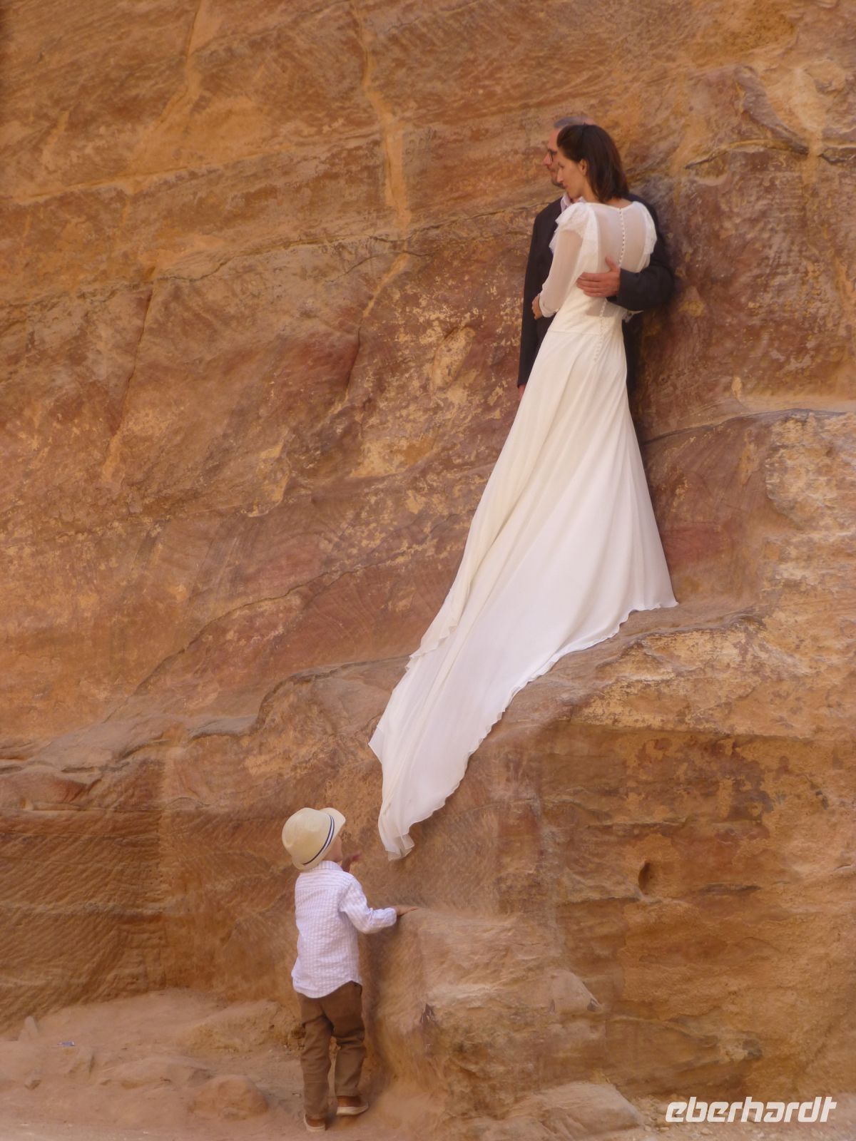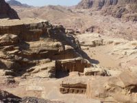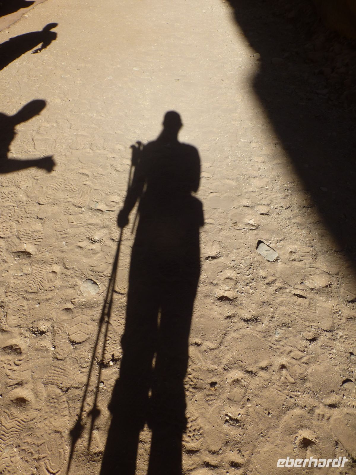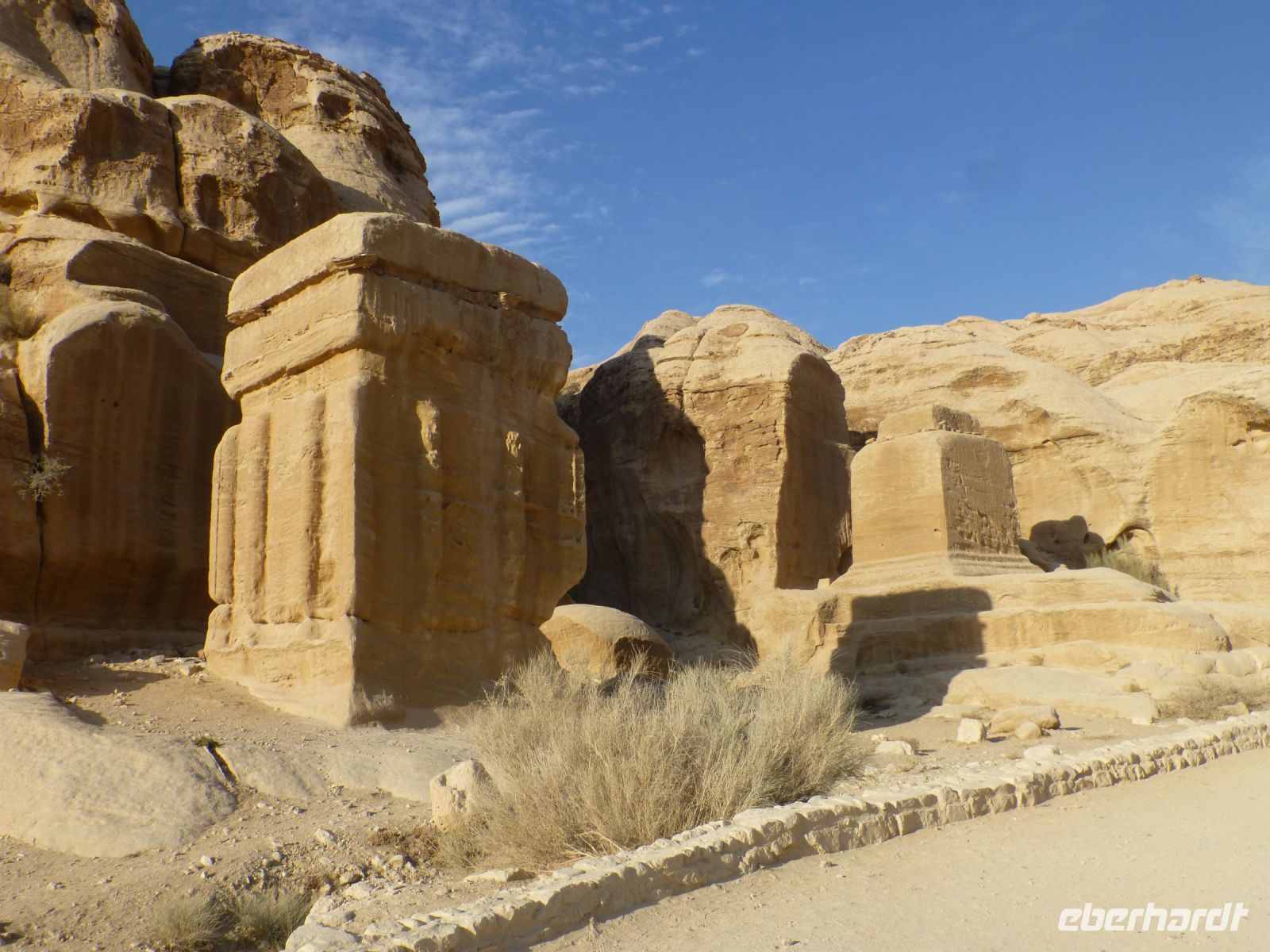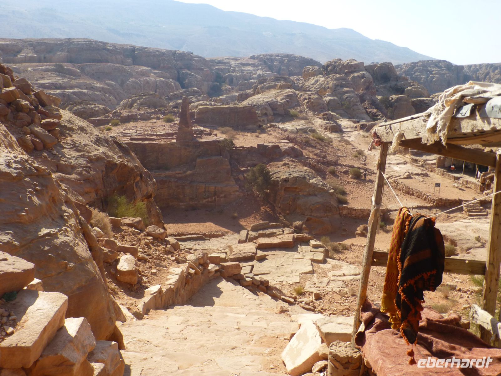 Wieder durch den Siq am uns nun vertrauten Schatzhaus vorbei, führt Mahmoud die Wanderwilligen und Trittsicheren über viele Treppenstufen auf den Opferplatz. Wir bleiben bei jeder Gelegenheit stehen, um das vor uns Liegende erneut in den Blick und in den Fokus der Kamera zu nehmen. Dabei entgeht uns eigentlich, dass der Opferplatz und auch der daneben liegende Berg abgetragen worden sind. Die zwei Obelisken, die dort stehen, sind nicht etwa dort aufgebaut, sondern aus dem oberem Felsteil herausgearbeitet worden. Der Opferplatz ist begradigt worden. Man wundert sich - hier ist doch eigentlich nichts normal, sondern alles mit großem handwerklichen Aufwand einem großen Plan untergeordnet.
