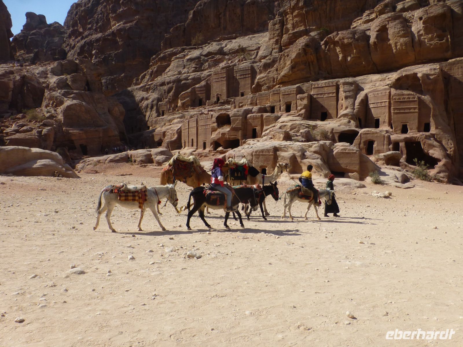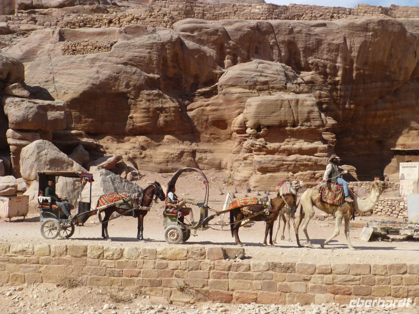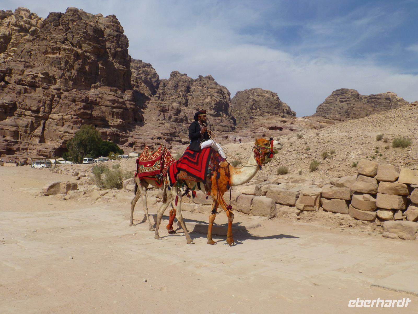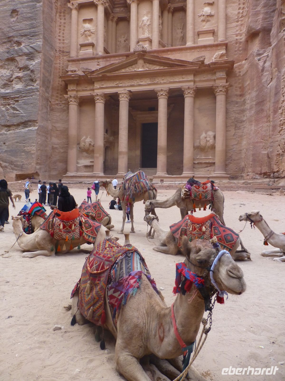 Der Platz vor dem Schatzhaus ist belebt mit all den Touristen, die durch den Siq hierher gespült werden. Die Dromedare, die auf Reiter warten, haben die Ruhe weg, während die Esel noch ein wenig schläfrig wirken.