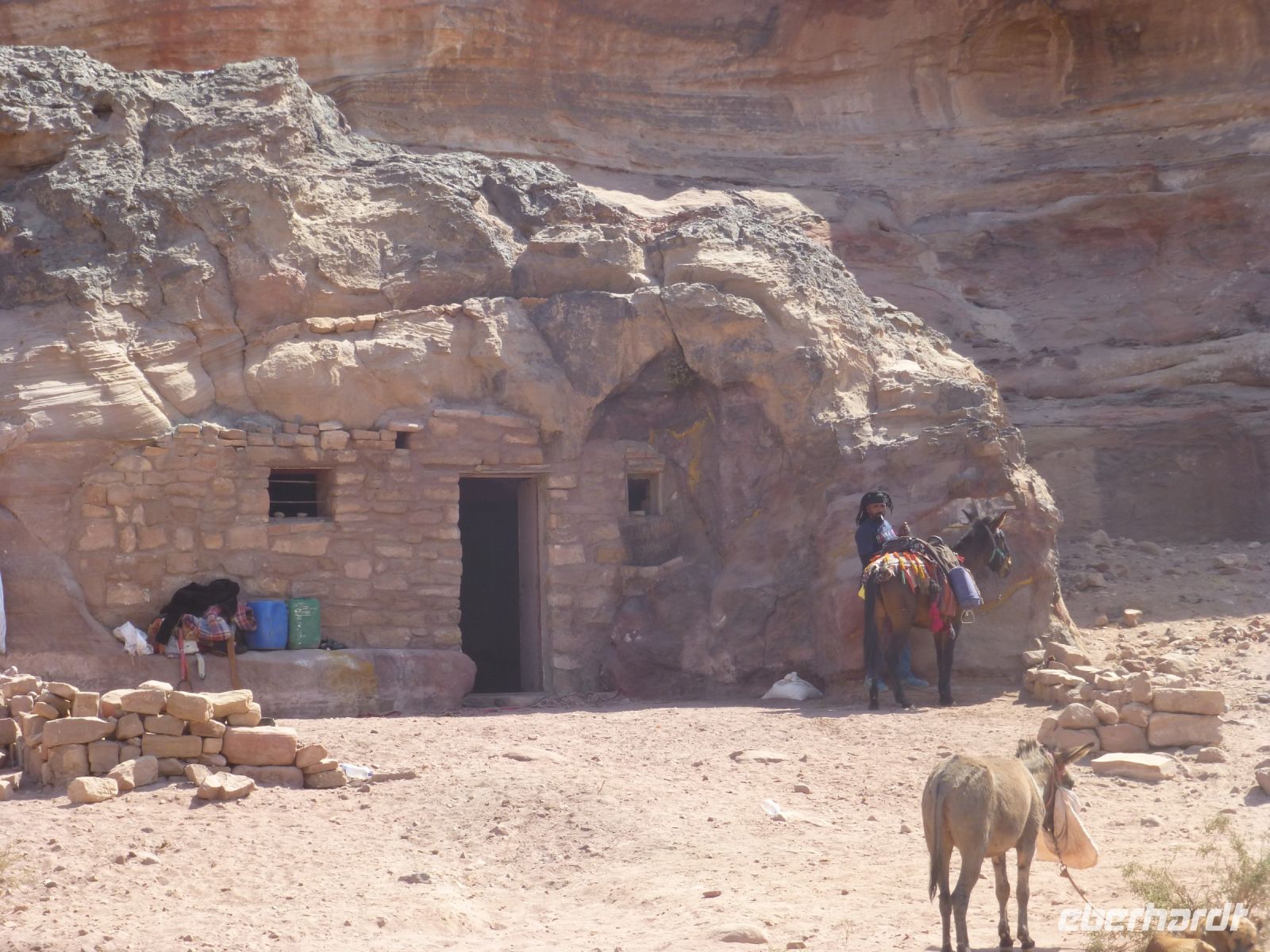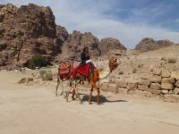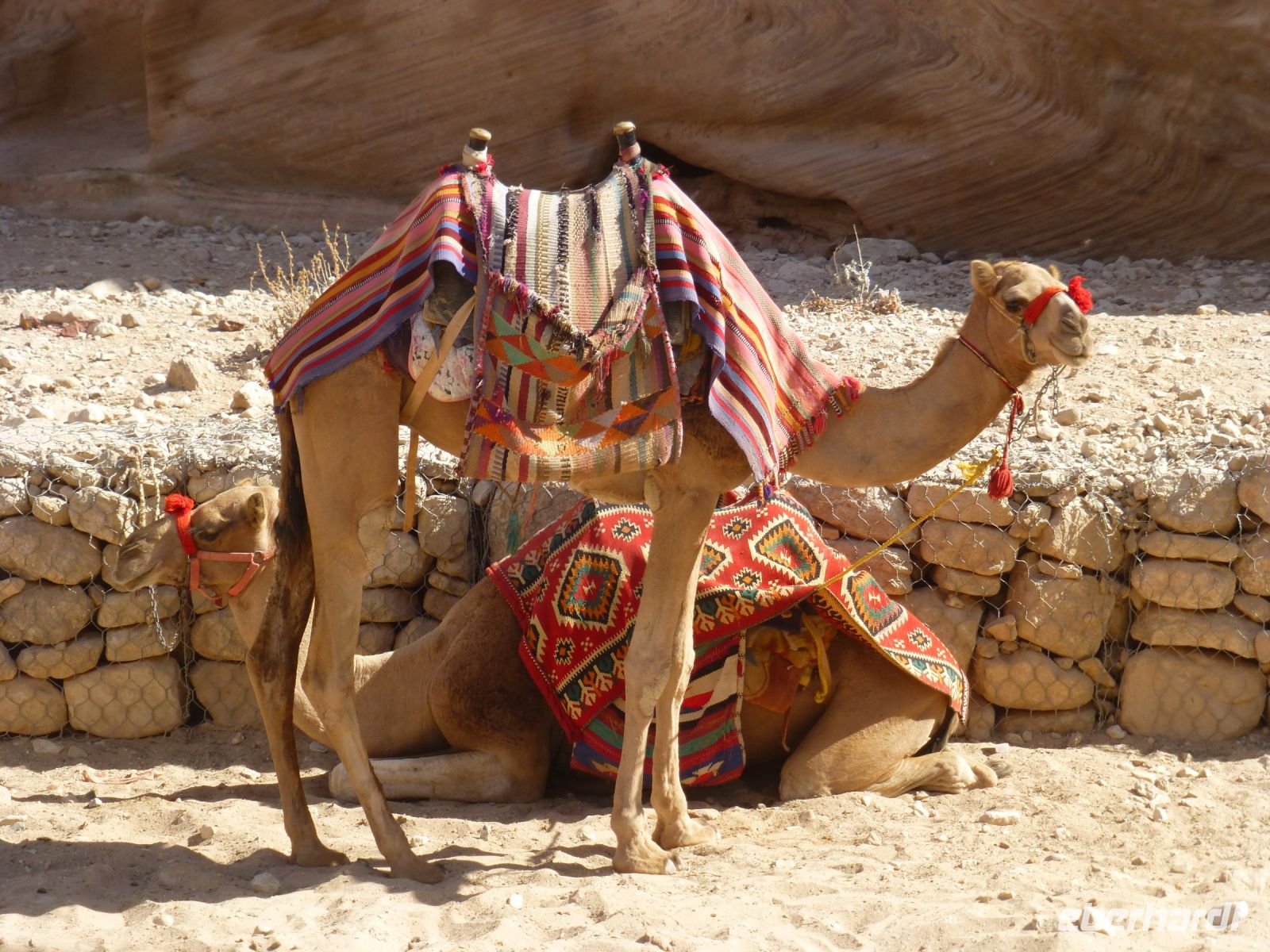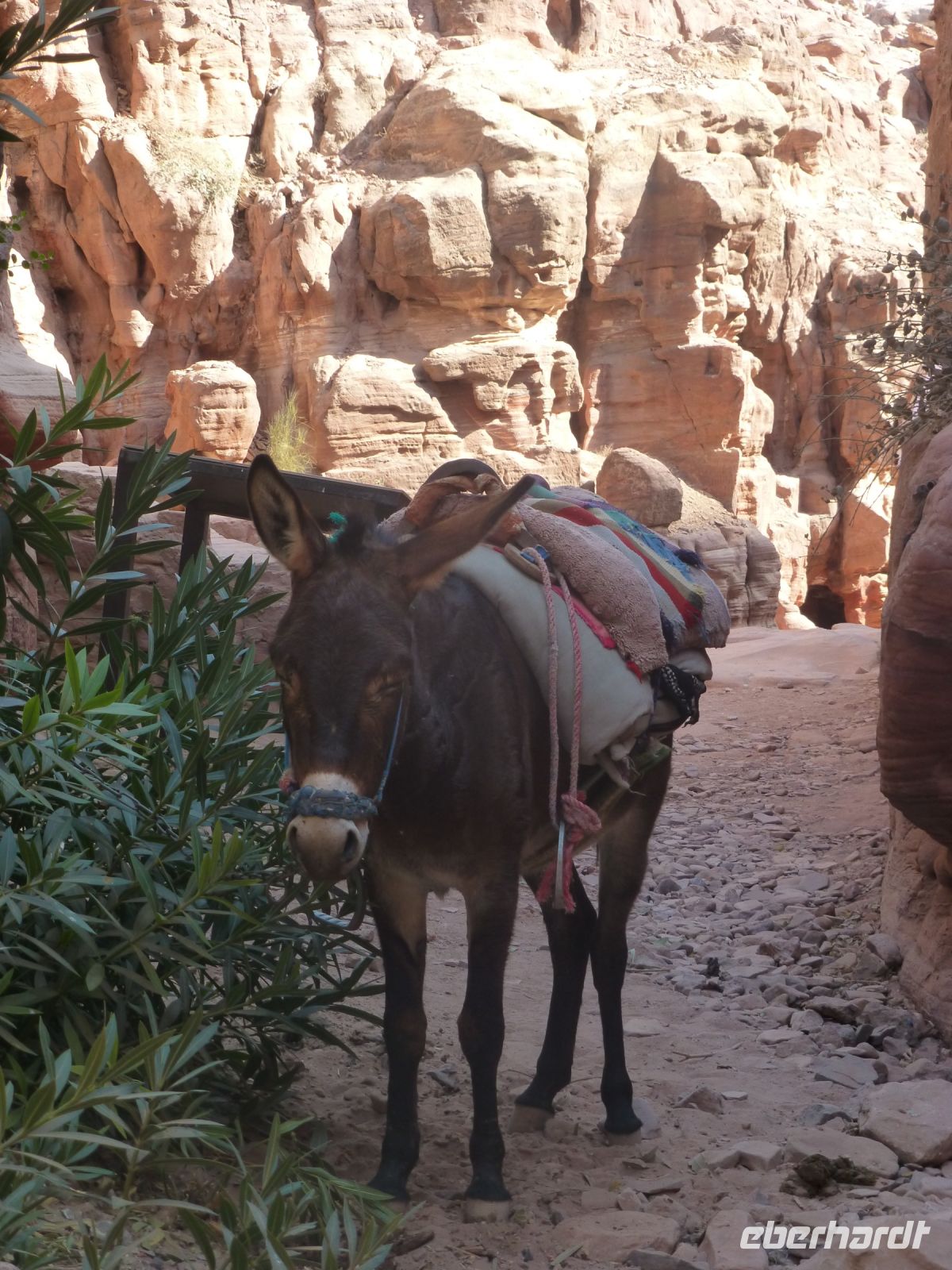 Der Platz vor dem Schatzhaus ist belebt mit all den Touristen, die durch den Siq hierher gespült werden. Die Dromedare, die auf Reiter warten, haben die Ruhe weg, während die Esel noch ein wenig schläfrig wirken.