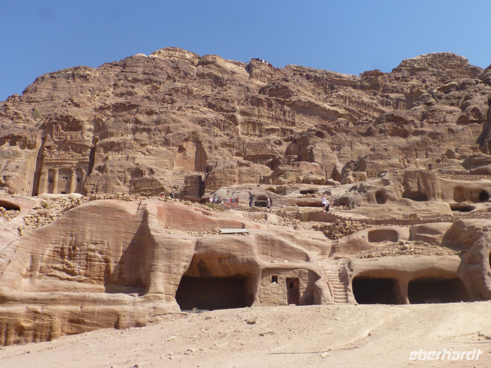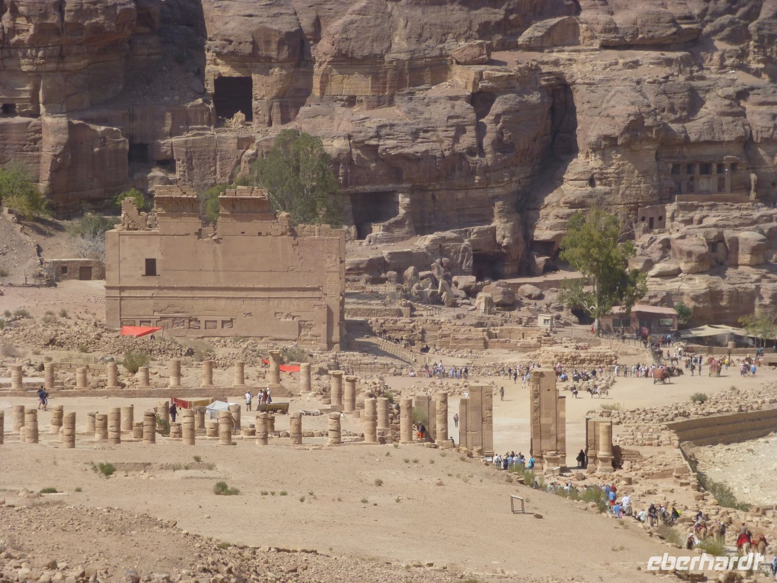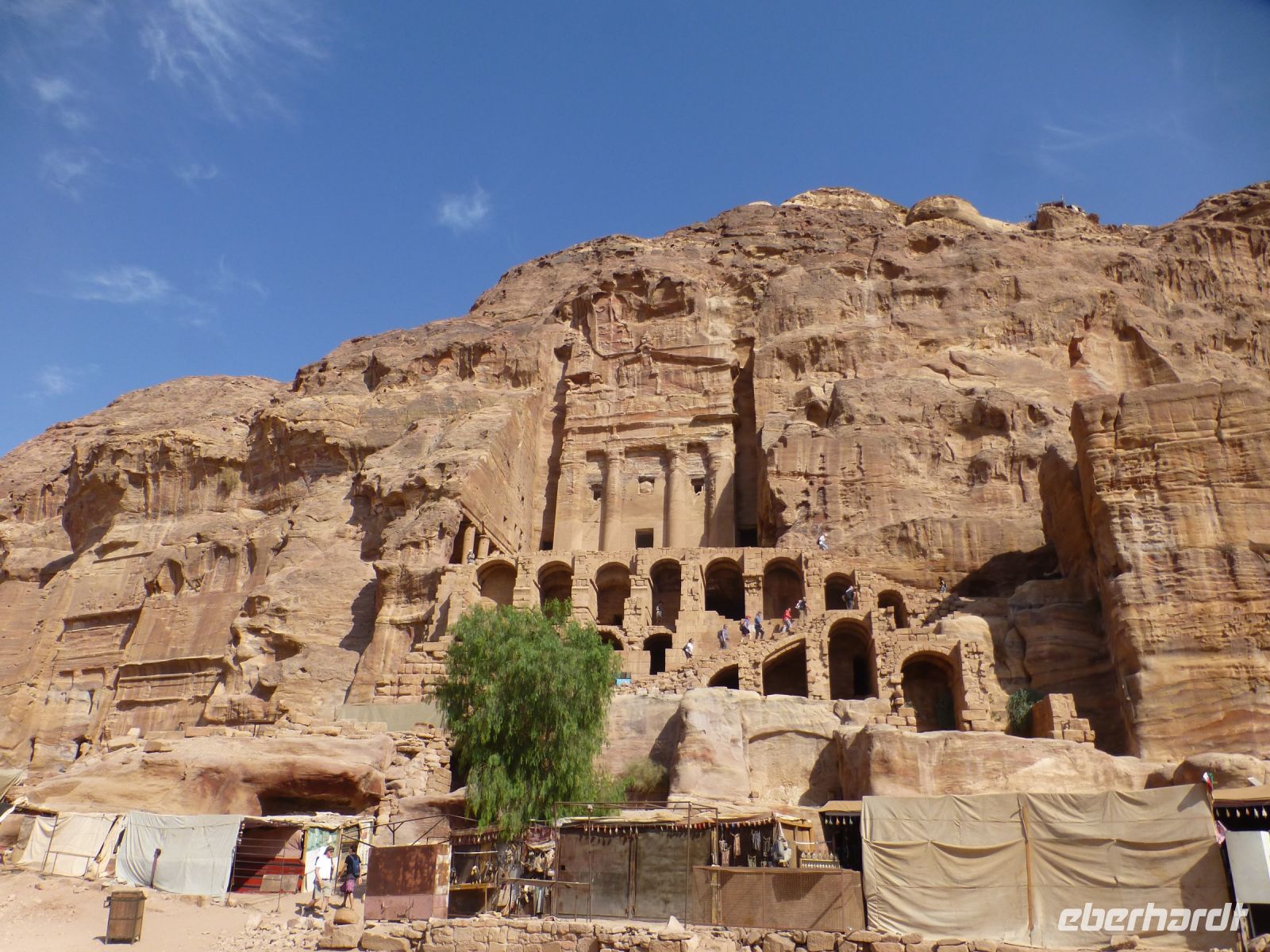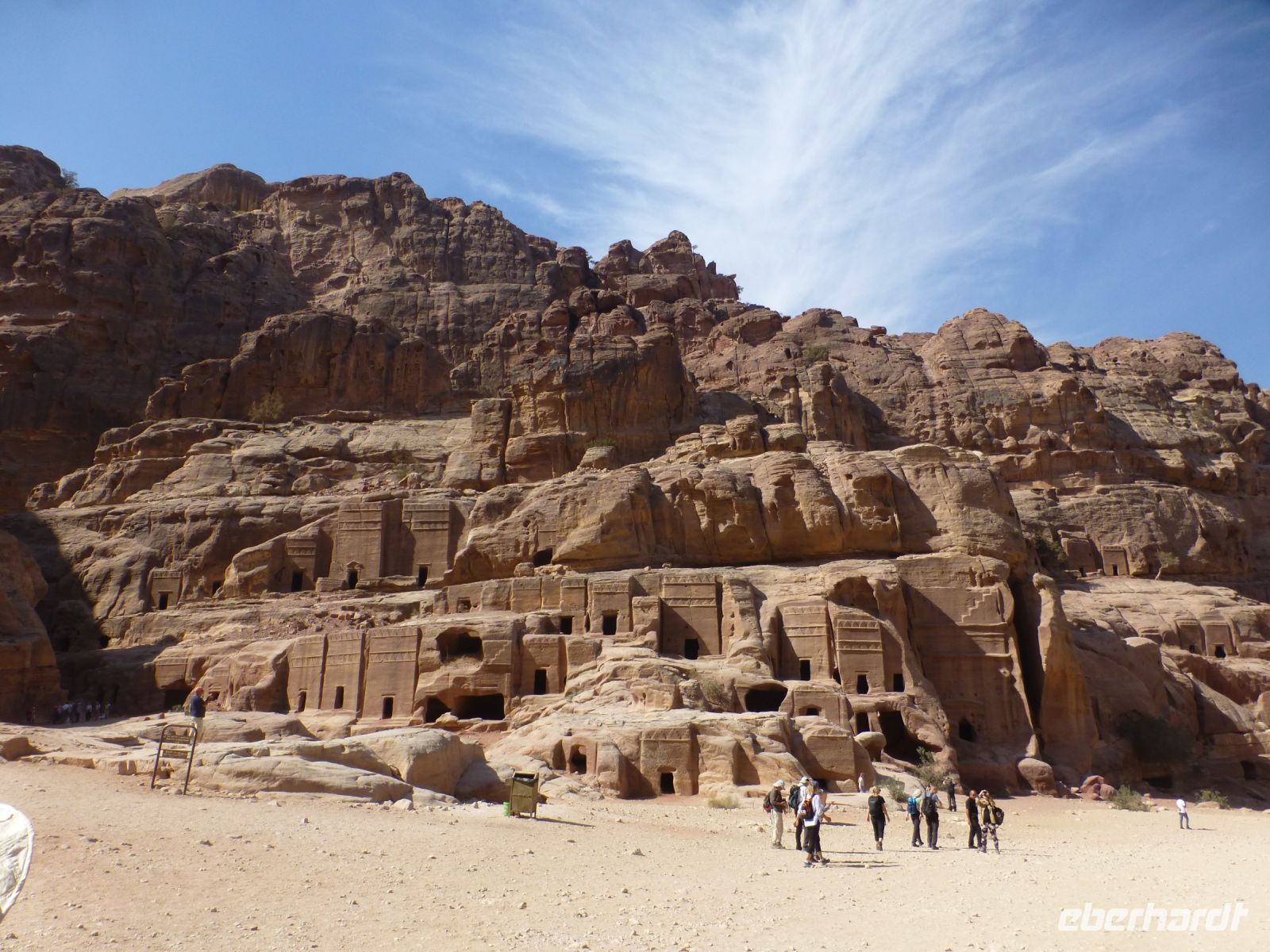 Nach diesem ersten und überwältigenden Eindruck machen wir mit Mahmoud eine Besichtigungstour, kehren in einem Beduinenzelt für einen Tee ein, mit Blick auf das große Theaterrund und laufen dann oberhalb der Ausgrabung zum Großen Tempel. Von hier aus haben wir einen guten Blick auf die Königswand mit 12 Mausoleen. 620 Fassaden hat man gezählt. Sie sind weder Wohnräume noch Tempel, sondern Grabstätten.