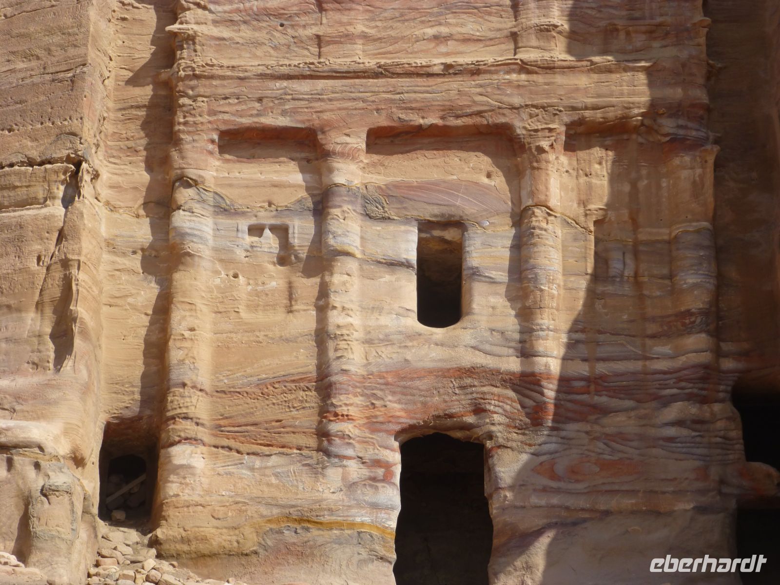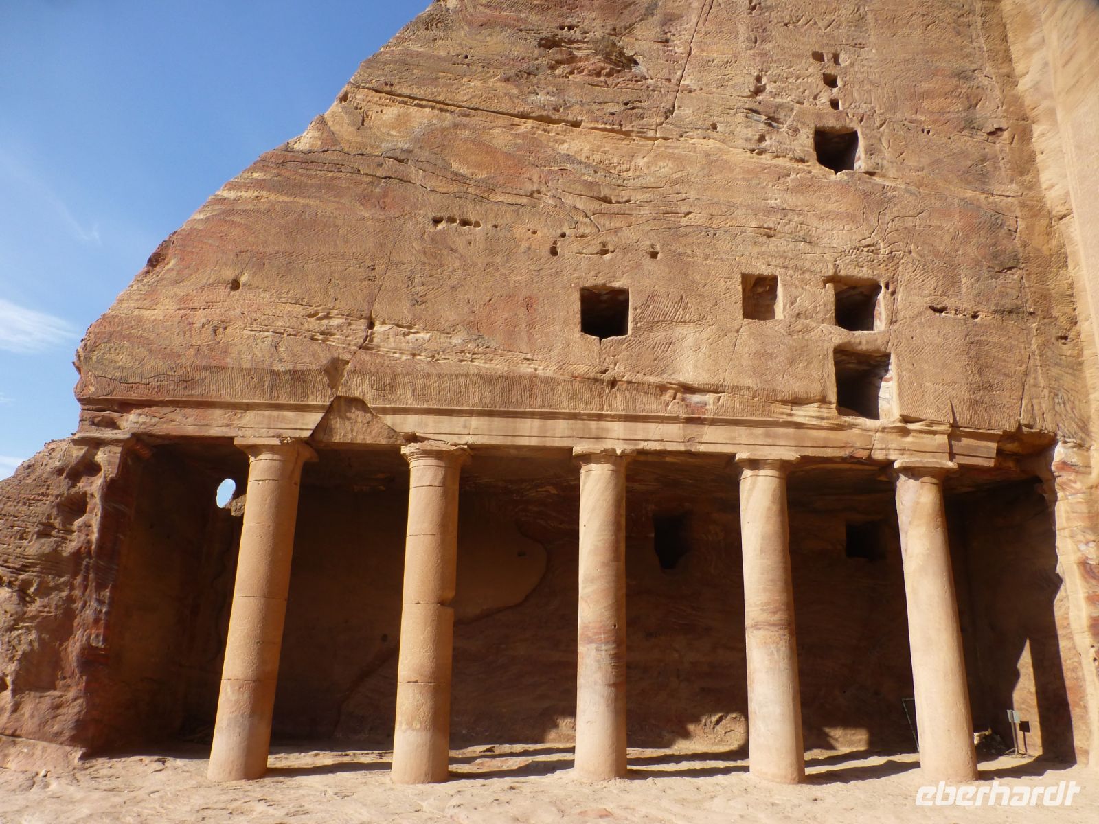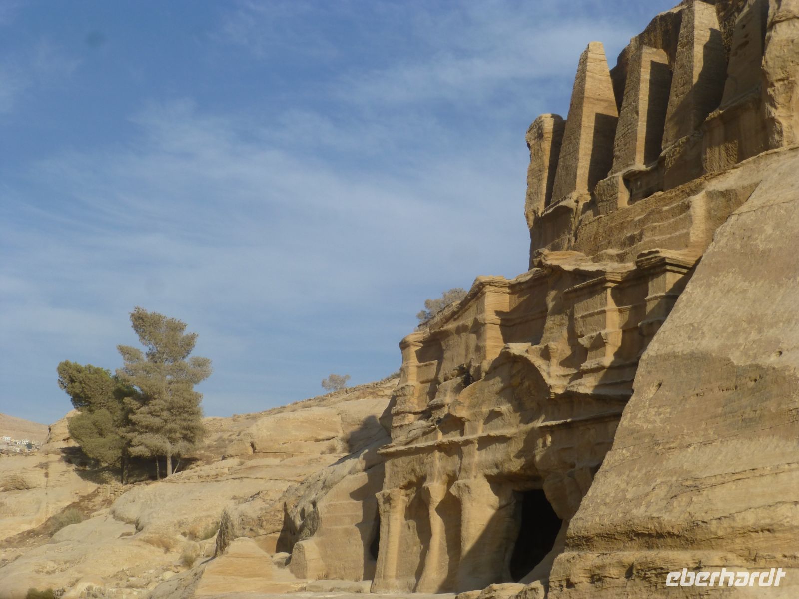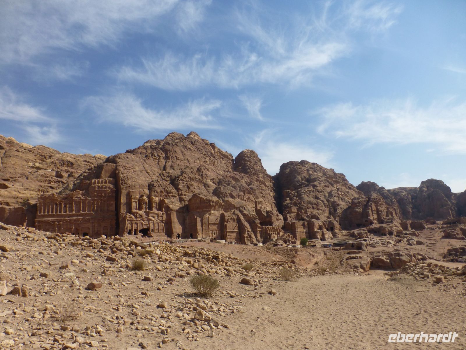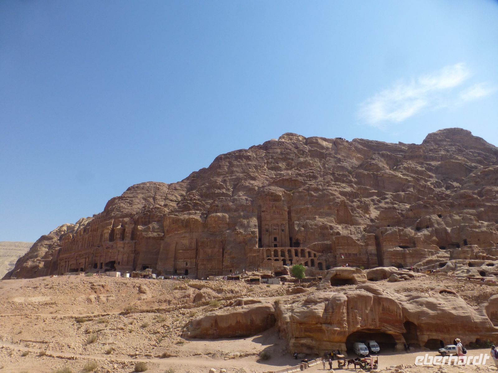 Nach diesem ersten und überwältigenden Eindruck machen wir mit Mahmoud eine Besichtigungstour, kehren in einem Beduinenzelt für einen Tee ein, mit Blick auf das große Theaterrund und laufen dann oberhalb der Ausgrabung zum Großen Tempel. Von hier aus haben wir einen guten Blick auf die Königswand mit 12 Mausoleen. 620 Fassaden hat man gezählt. Sie sind weder Wohnräume noch Tempel, sondern Grabstätten.