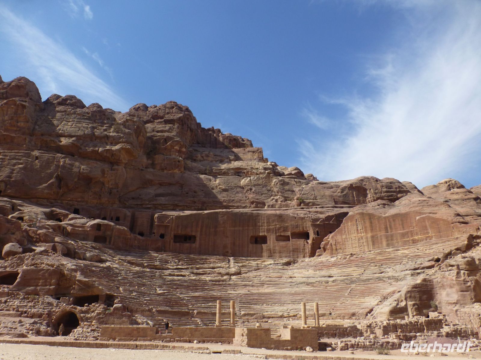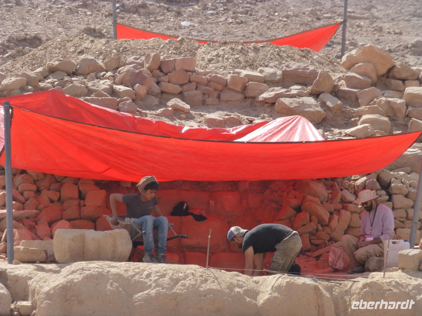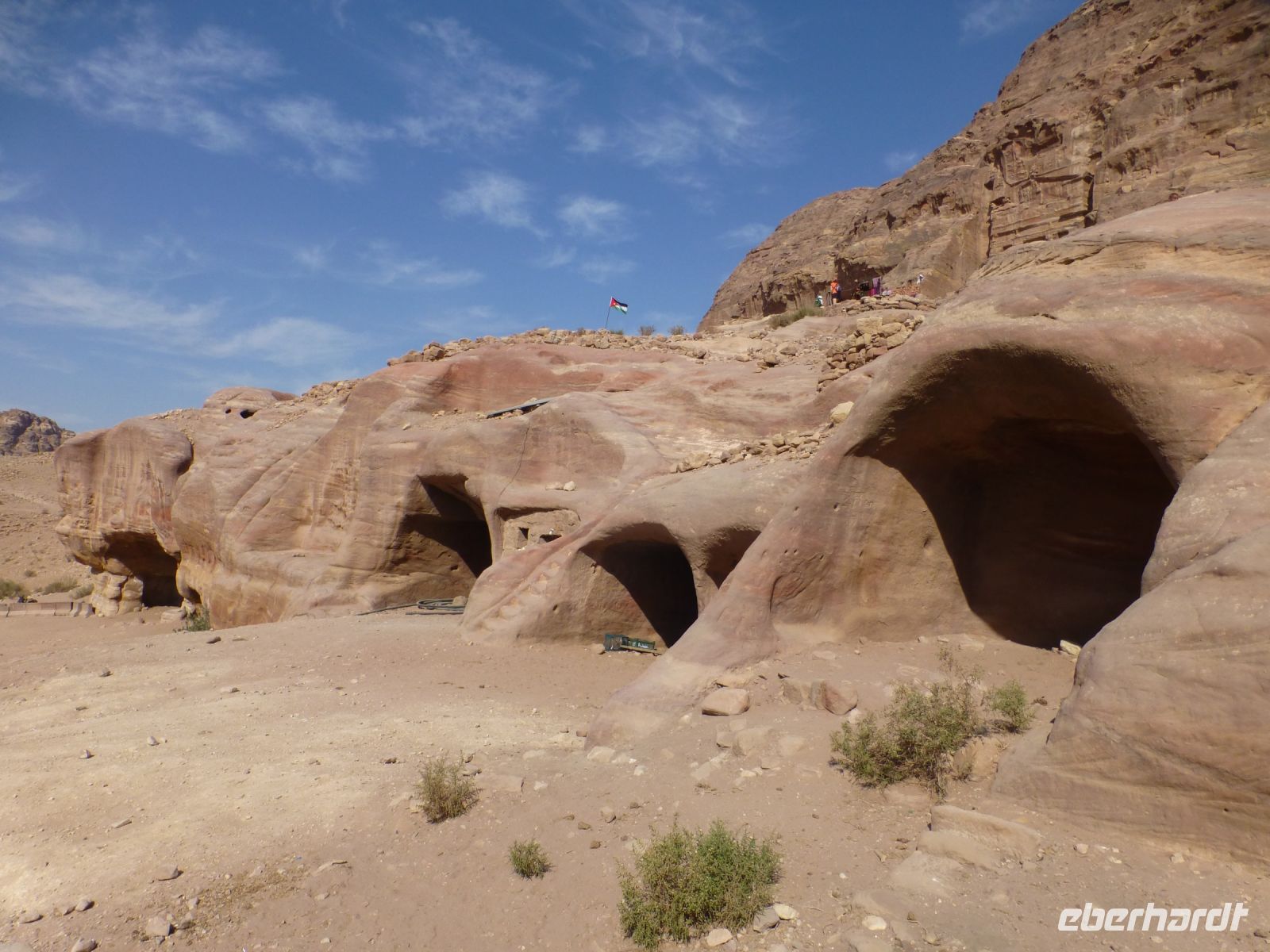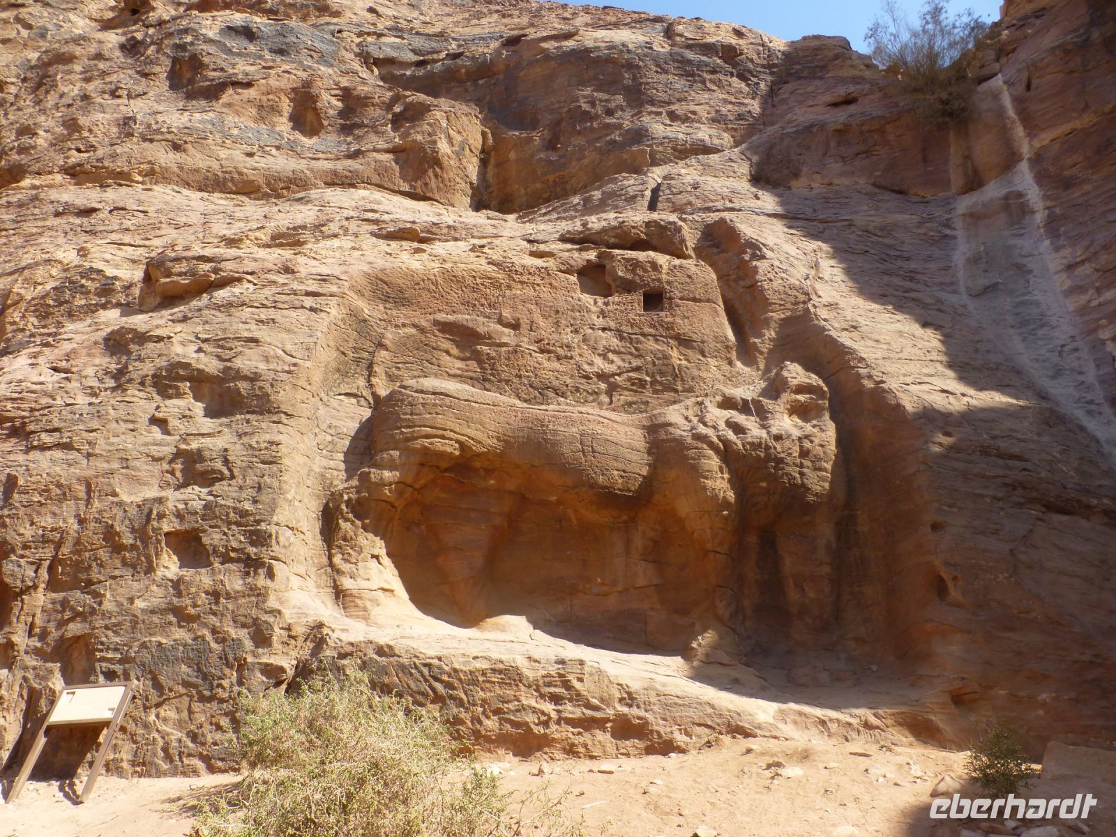 Nach diesem ersten und überwältigenden Eindruck machen wir mit Mahmoud eine Besichtigungstour, kehren in einem Beduinenzelt für einen Tee ein, mit Blick auf das große Theaterrund und laufen dann oberhalb der Ausgrabung zum Großen Tempel. Von hier aus haben wir einen guten Blick auf die Königswand mit 12 Mausoleen. 620 Fassaden hat man gezählt. Sie sind weder Wohnräume noch Tempel, sondern Grabstätten.