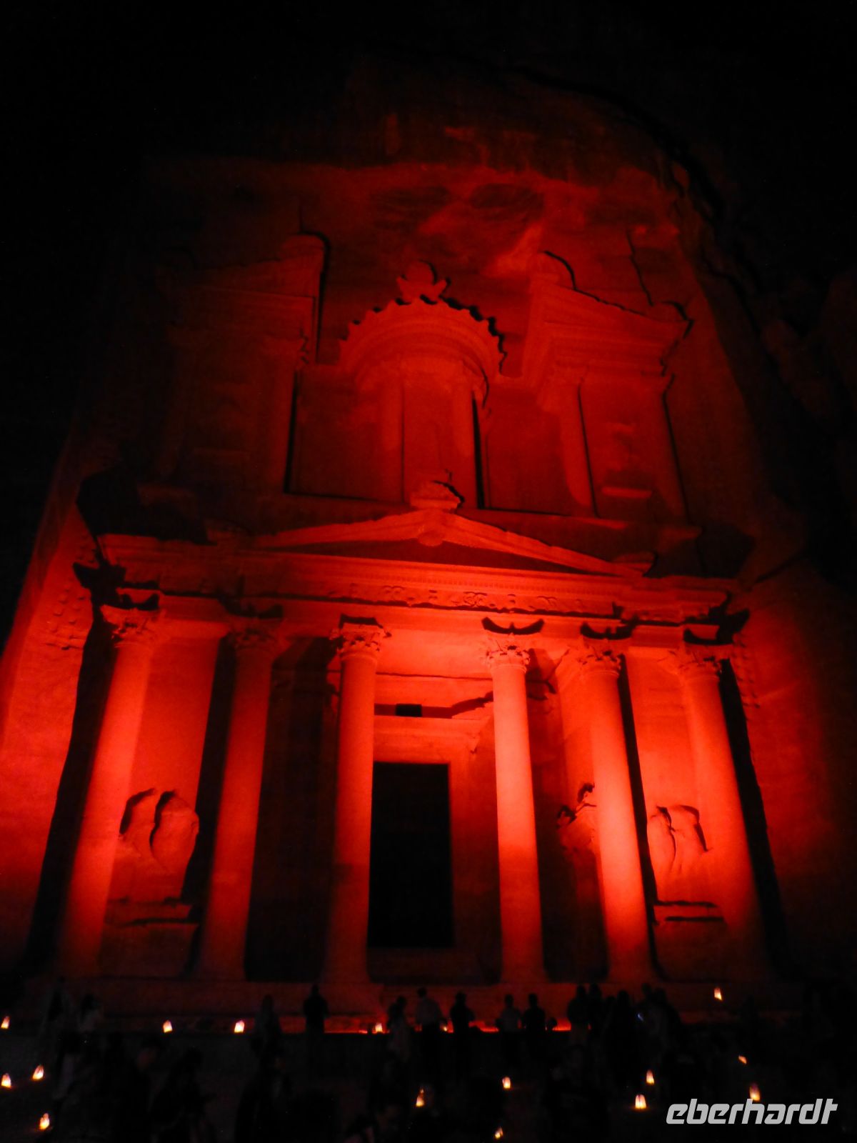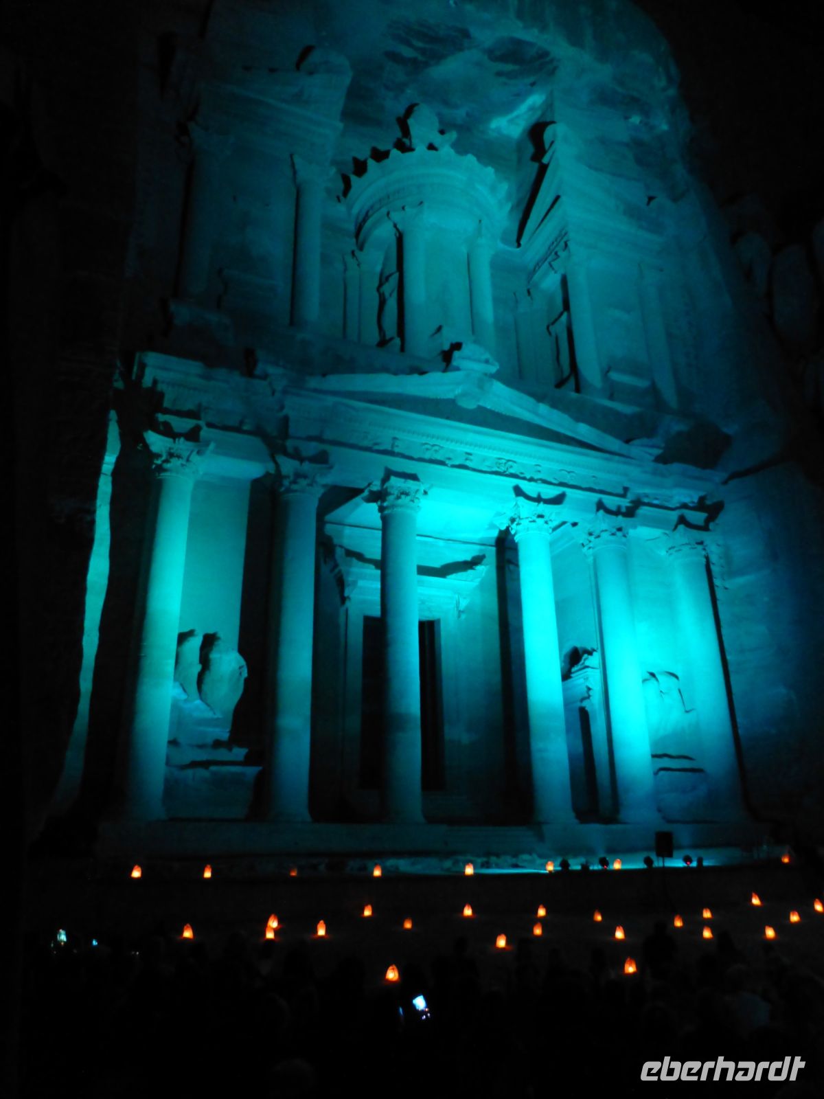 Zum Abendessen geht es wieder den Weg durch den Siq zurück, um gegen 20 Uhr erneut aufzubrechen. Vor dem Schatzhaus erwartet uns „Petra by night“. Den ganzen Weg entlang sind „Tütenlampen“ aufgestellt – Kerzen in Butterbrotbeuteln. Sie leuchten uns warm entgegen. Und N. unser Physiker rechnet schnell hoch, dass es 400 Lampen sein müssten. So gelangen wir durch den nun im Dunkeln liegenden geheimnisvollen Siq zum Schatzhaus und finden sehr bequem Platz auf gepolsterten Bänken gegen einen Kaffee. Zunächst ertönt eine Flöte, dann ein Instrument, das nur auf einer Seite gespielt wird. Die Fassade des Schatzhauses wird in verschiedenen Farben angestrahlt. Erläuterungen eines hiesigen Reiseführers folgen und dann können wir noch eine ganze Weile sitzenbleiben und die Stimmung auf uns wirken lassen.