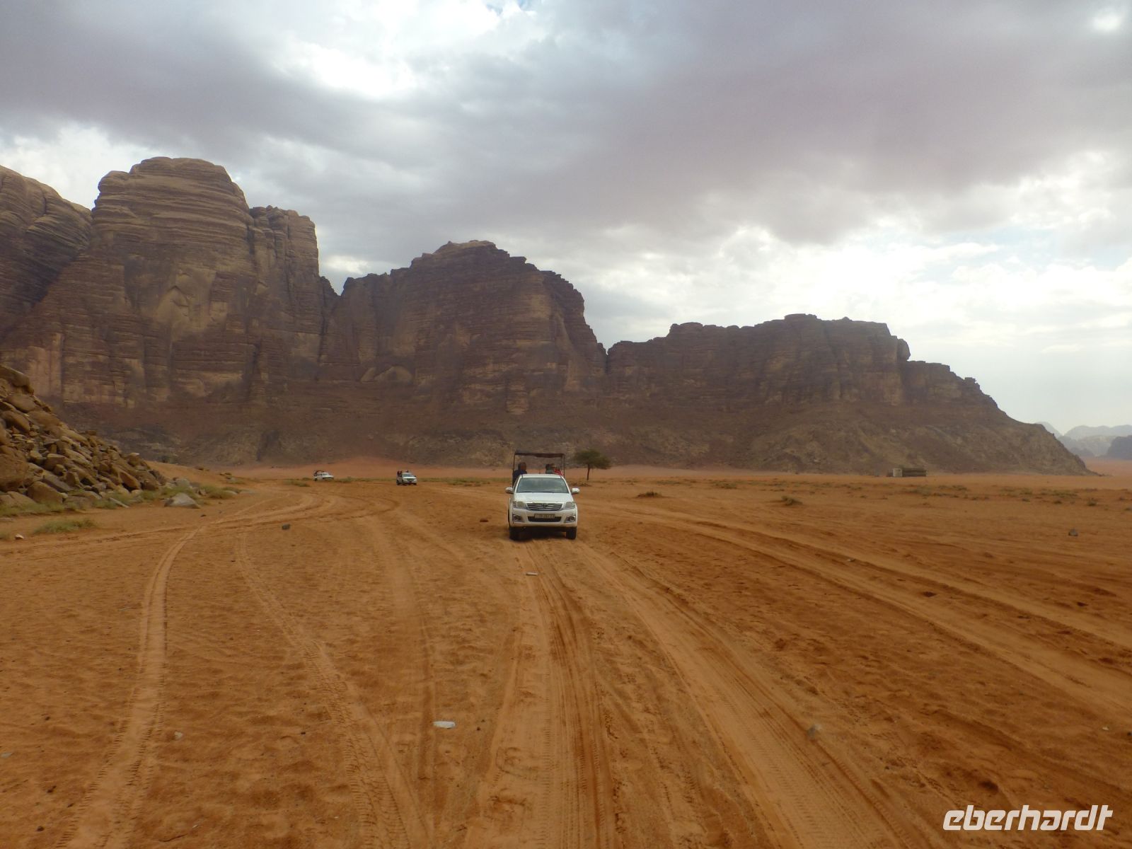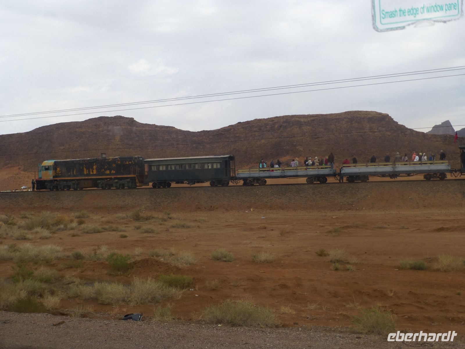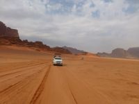 Wir fahren zum Wadi Rum, der schönsten und größten Wüstenlandschaft Jordaniens aus rotem Sand mit bizarren Gesteinsformationen. Auf dem Weg fahren wir parallel zur Hedschahsbahn. Jener berühmten Schienenverbindung, die Medina mit Damaskus verbunden hat über 1320 km weit. Davon sind nur noch Teilstücke erhalten und die Nachricht, die wichtigsten Strecken wieder dauerhaft herzurichten, wird immer wieder aufs Neue wiederholt.