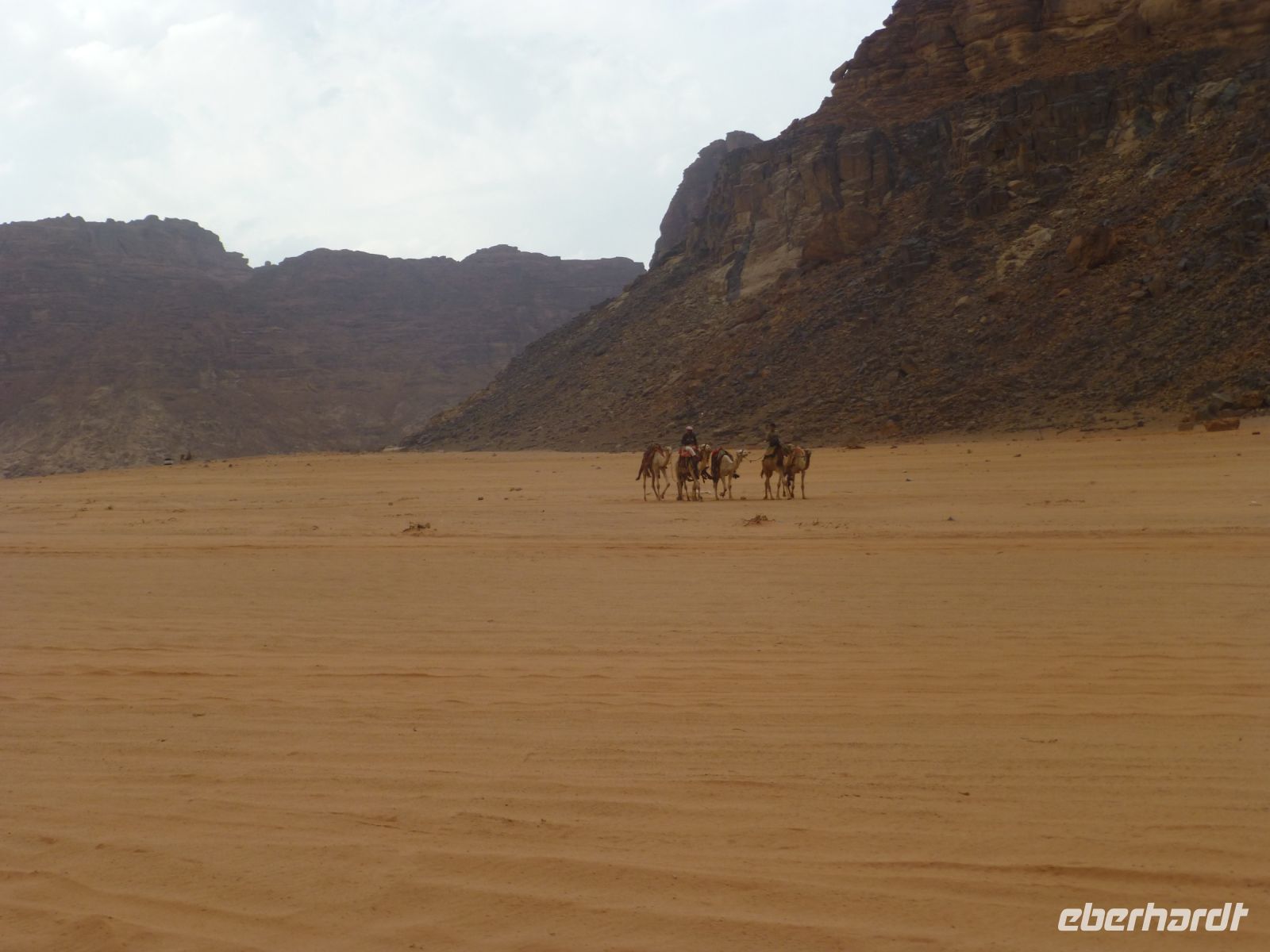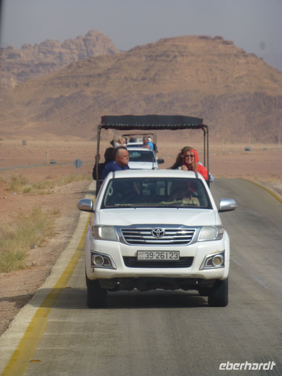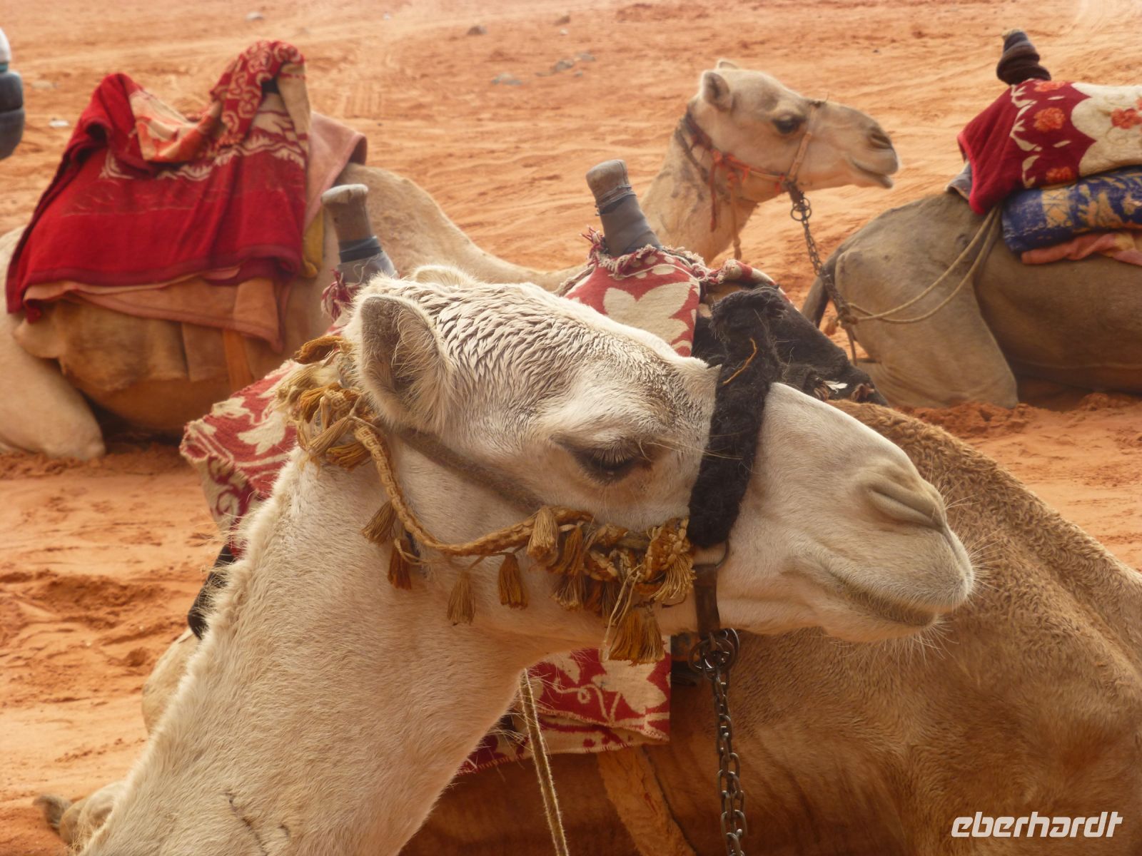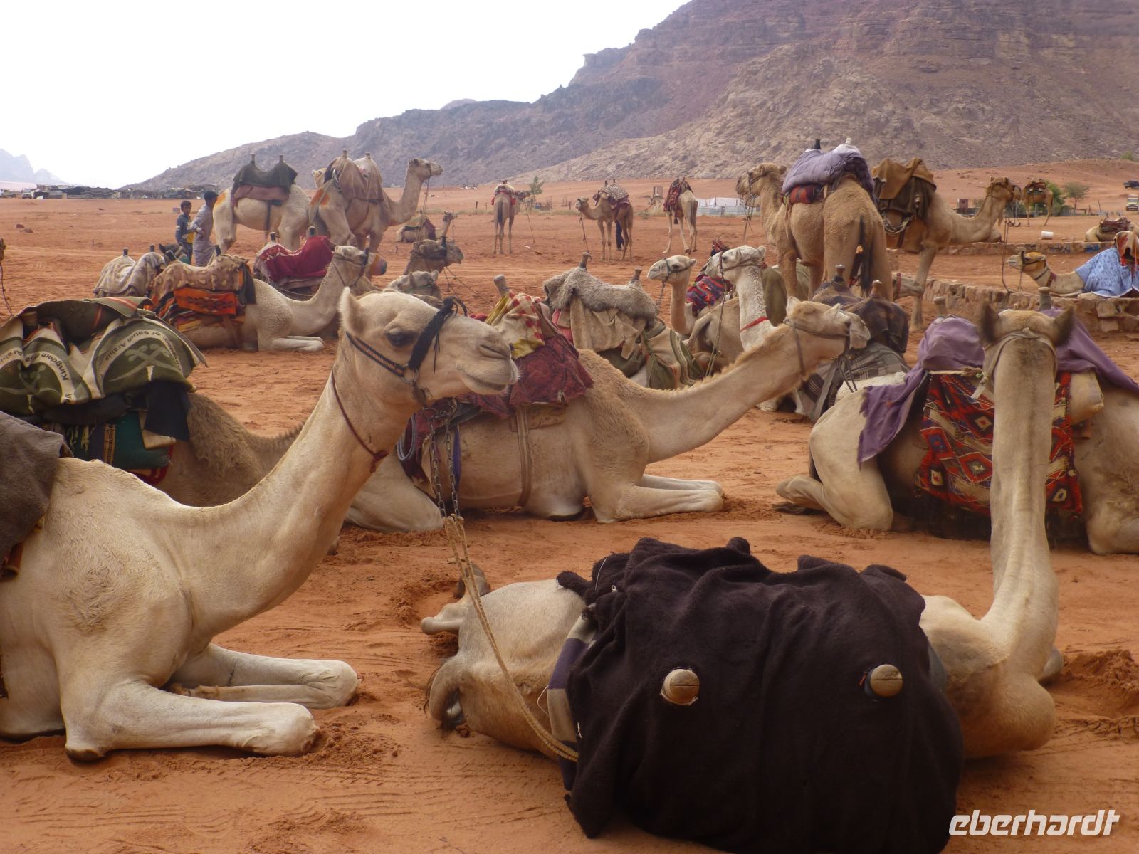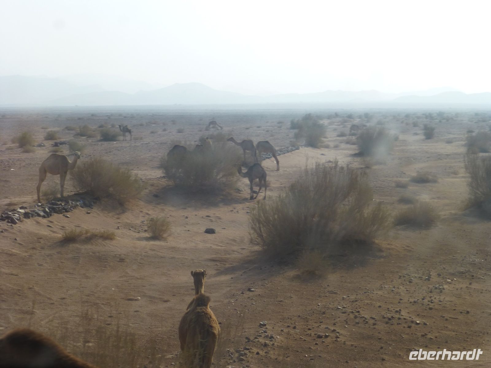 Wir verlassen Aqaba Richtung Norden. Auf einer Bundesstraße geht es zügig voran. Hin und wieder tönt die Hupe unseres Busses, um Eseln dicht an der Fahrbahn zu signalisieren, wir kommen. Und keine Mär, es gibt sie wirklich, die wilden Dromedare, die als gesellig gelten und ihre langen Hälse nach den Schirmakazien strecken.