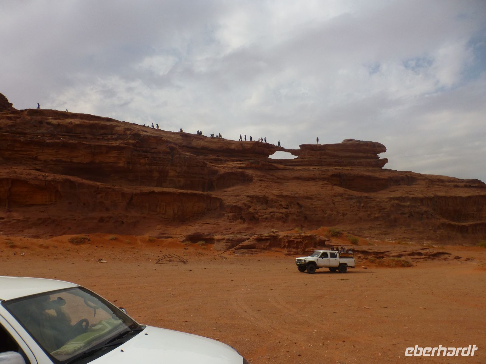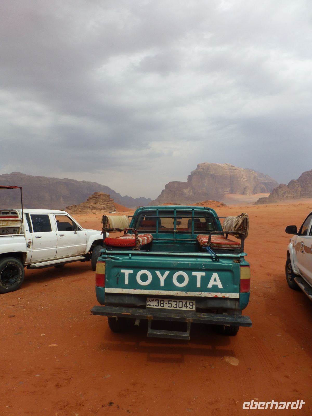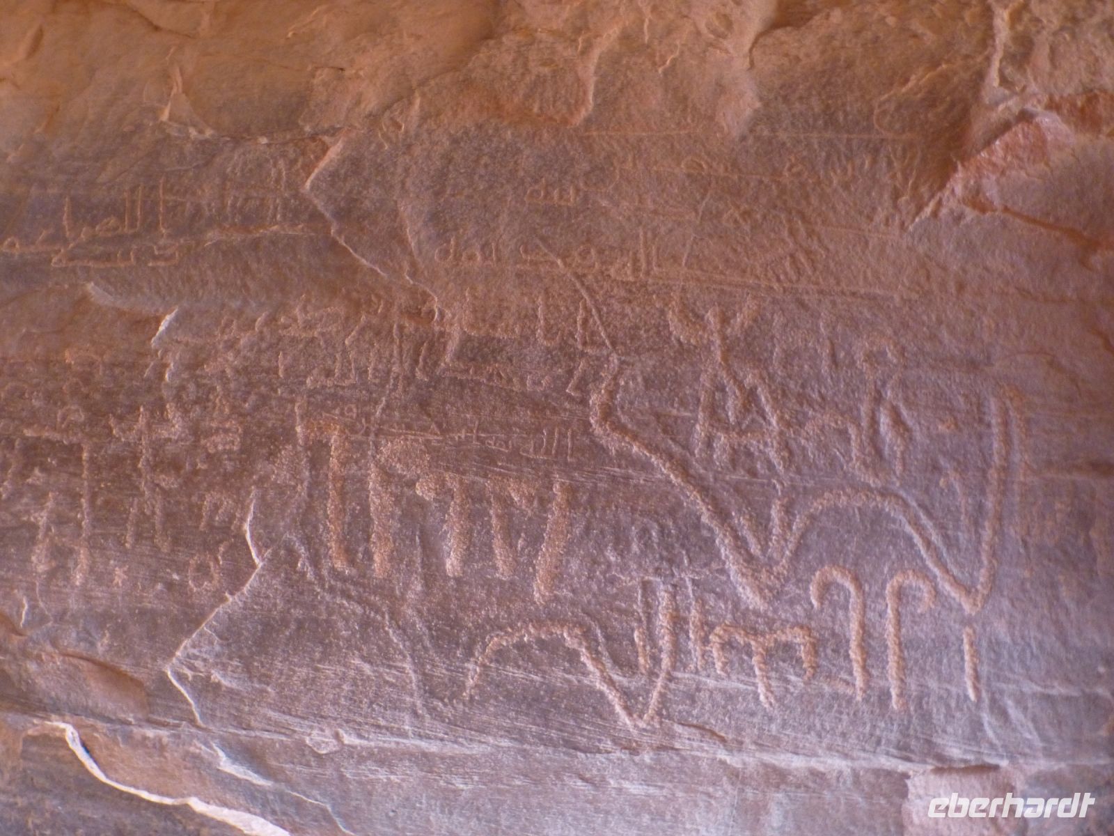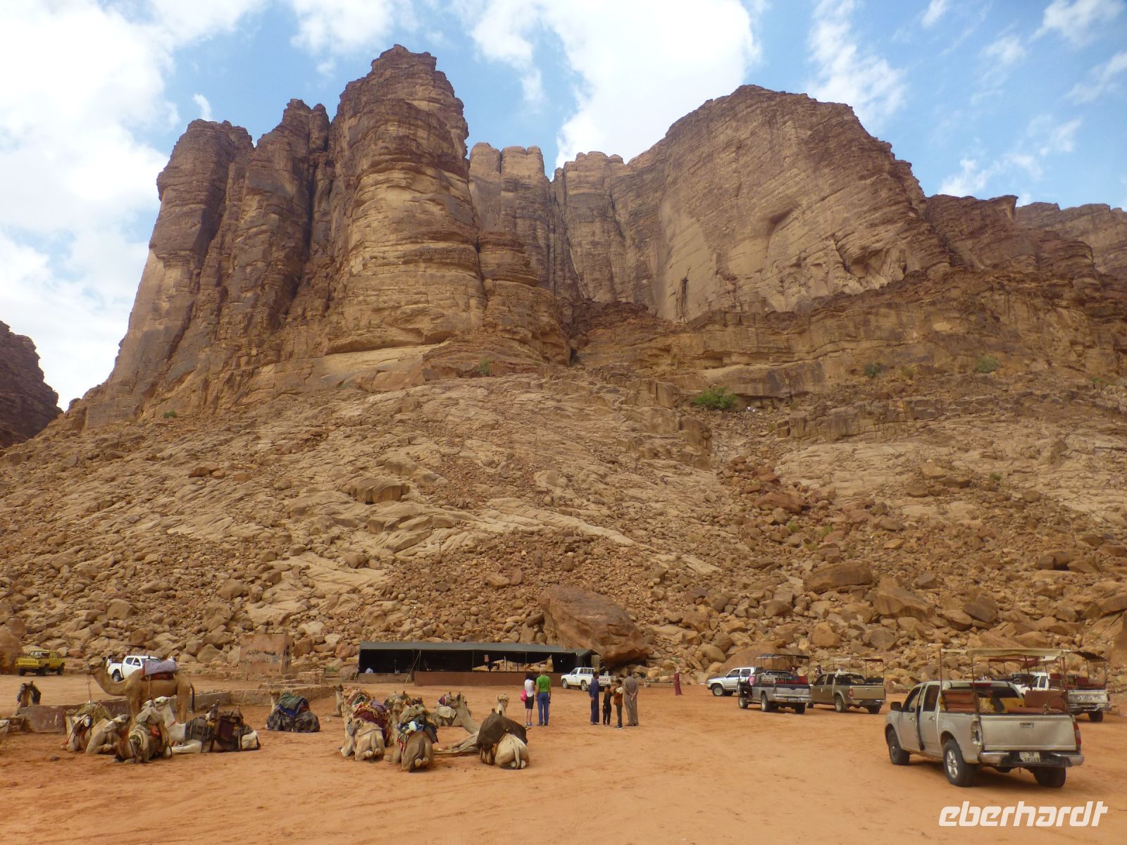 Im Besucherzentrum von Wadi Rum angekommen, nehmen wir auf den umgebauten Ladeflächen von Toyota-Auflegern Platz, dann heißt es, sich gut festhalten. Doch zuvor noch einen langen Blick auf das Gesteinsmassiv gegenüber: die sieben Säulen der Weisheit. Das Buch von Lawrence von Arabien, in dem er die Befreiung von Aqaba und Damaskus beschreibt und damit die Befreiung vom Osmanischen Reich, trägt diesen Titel. Die Tour führt uns zur Lawrence-Quelle, die wir oben in der Felswand ausmachen. Es gibt keinen Weg dorthin und so klettern einige Neugierige über die Steine nach oben. Wir bleiben unten, in Petra sind wir genug hoch und runter gelaufen. Es geht weiter zu einem engen Sik, in dem wir Tierzeichnungen an den Steinen erkennen können. In einem nahegelegenen Beduinenzelt wird uns Kräutertee gereicht, der sehr schmackhaft ist. Auf dem Weg sieht man einige Camps, in denen man mit allen Annehmlichkeiten das Wadi Rum erleben kann.