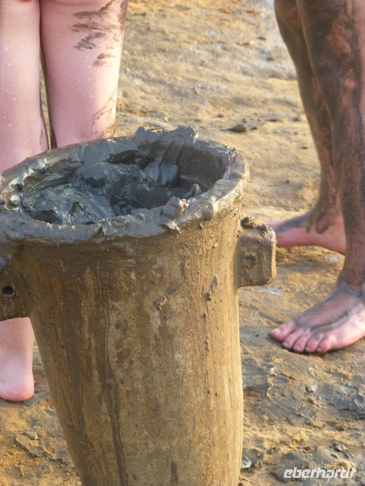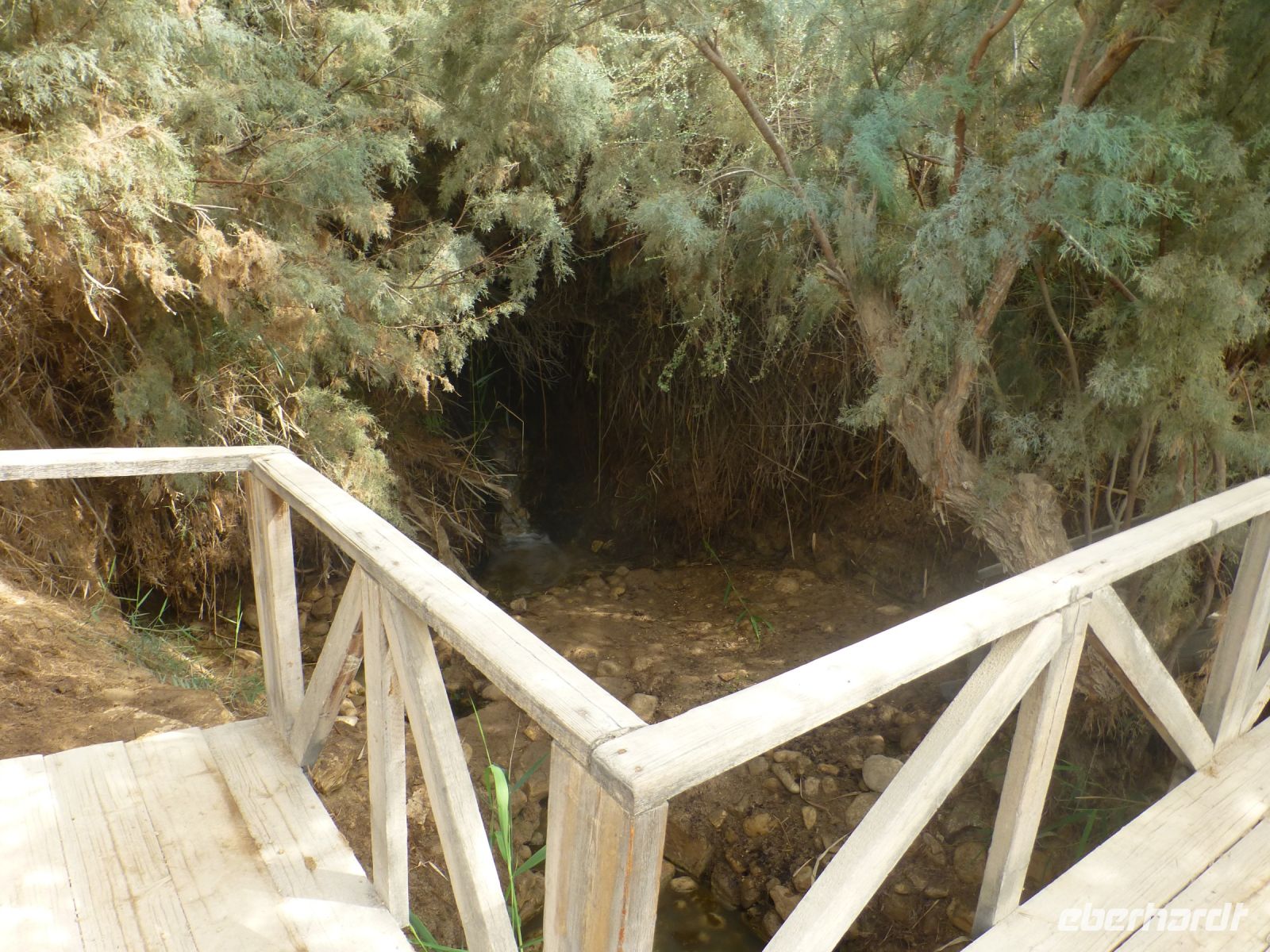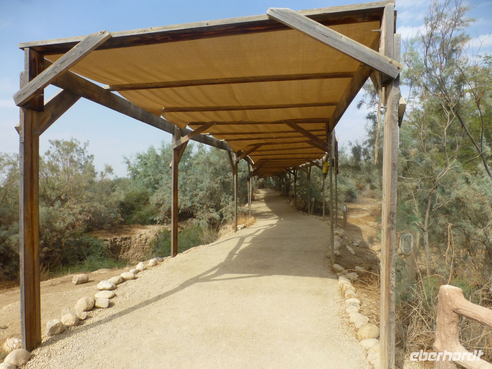 Der Jordan, ein Strom, mit so viel Verheißung aufgeladen ist wie Donau blau ist. Jedes Land – Jordanien und Israel – proklamiert die Taufstelle für sich und so sind auf beiden Uferseiten Zugänge eingerichtet. Erstaunlich doch, dass beide Länder sich auf diese Stelle im Jordan einigen konnten und die Zugänge nicht auf unterschiedlichen Höhen liegen. Zehn Meter trennen uns von den Besuchern der gegenüberliegenden, israelischen Seite. Dort hat man einen breiten Treppenzugang errichtet, auf jordanischer Seite einen angenehmen Schattenplatz aus Holz mit Sitzbänken und einer kleinen Treppe. Fast idyllisch, wenn nicht der Militärposten wäre, der die Grenze bewacht. Gegenüber versenkt man sich in den Jordan und lässt sich dabei ausgiebig fotografieren. In welchem biblischen Fluss wird die Taufe nachgeholt? - Ein milchkaffeebrauner Bach ist das stolze Gewässer mittlerweile geworden.