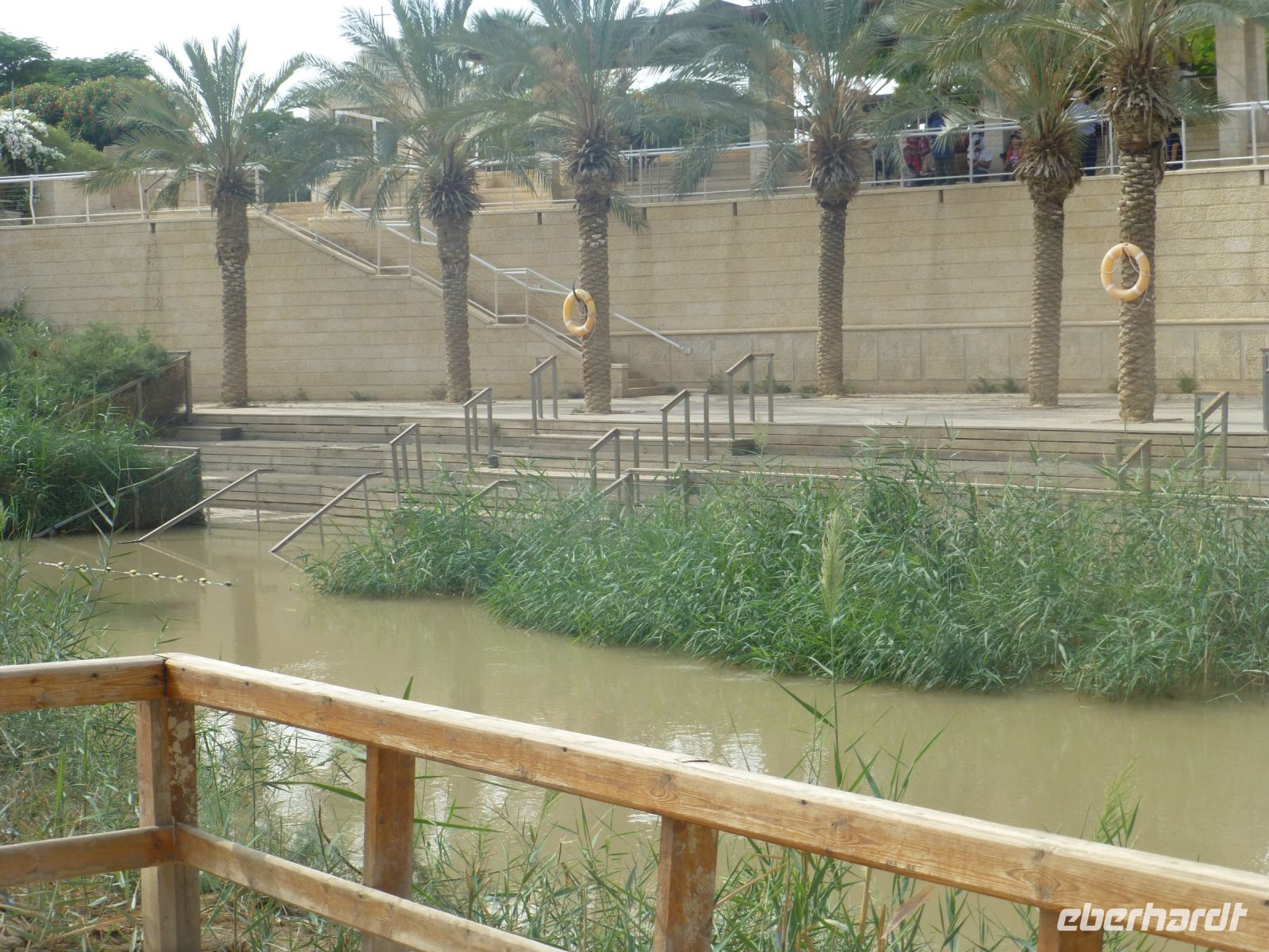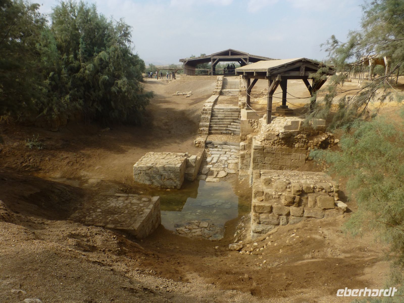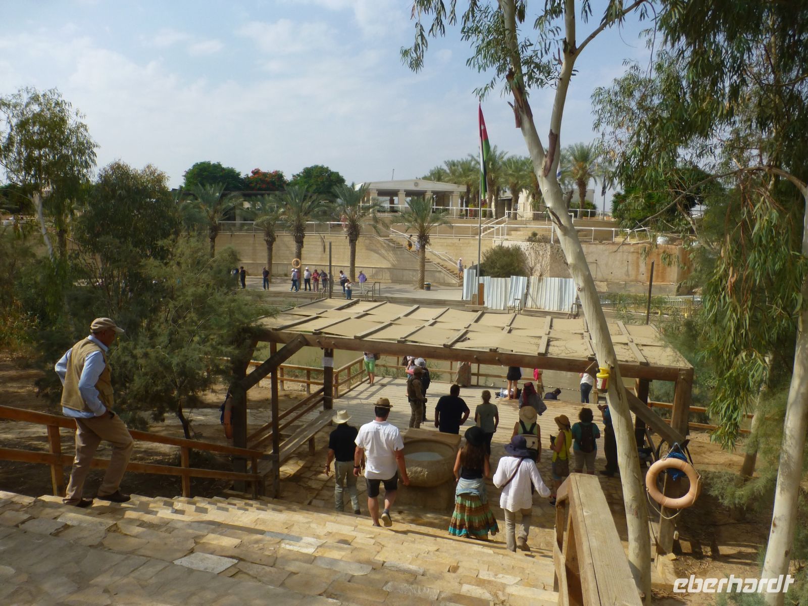 Wir werden zum Glück an dieser Stelle nicht bestraft, sondern von zwei Kleinbussen aufgenommen, die eilig zur Hilfe gerufen worden sind und uns zu unserem letzten Besichtigungsort bringen: zur Taufstelle von Jesus am Jordan. Entlang der Johannesquelle laufen wir zu jener Stelle, wo Johannes der Täufer Jesus getauft haben soll. Da an diesem Ort eine Kirche errichtet worden ist, die nach jedem Erdbeben wieder aufgebaut worden ist, sind die Jordanier fest der Meinung, genügend Hinweise zu haben, dass dieser Ort wie in der Bibel beschrieben auf ihrer Seite liegt.. Der Jordanfluss hat im Laufe der Jahrhunderte seinen Lauf geändert und bildet heute den Grenzfluss zwischen Jordanien und dem von Israel besetzten Westjordanland.