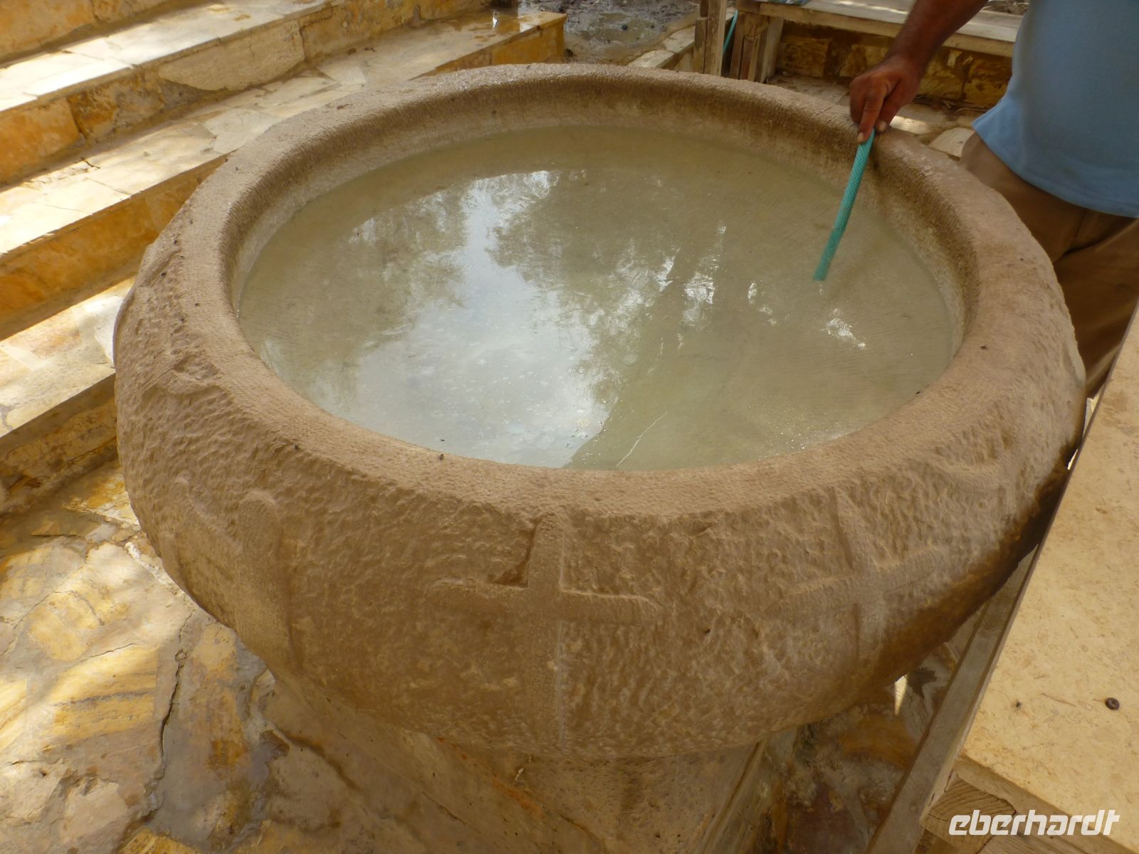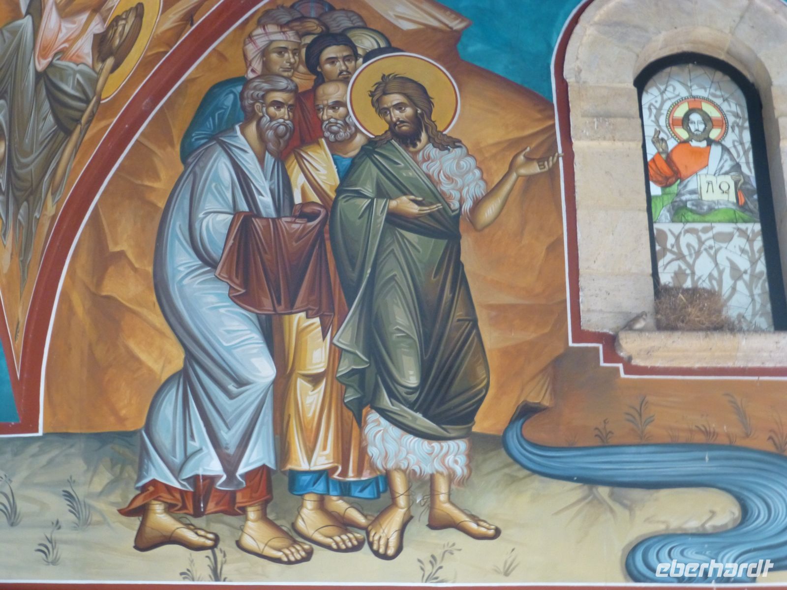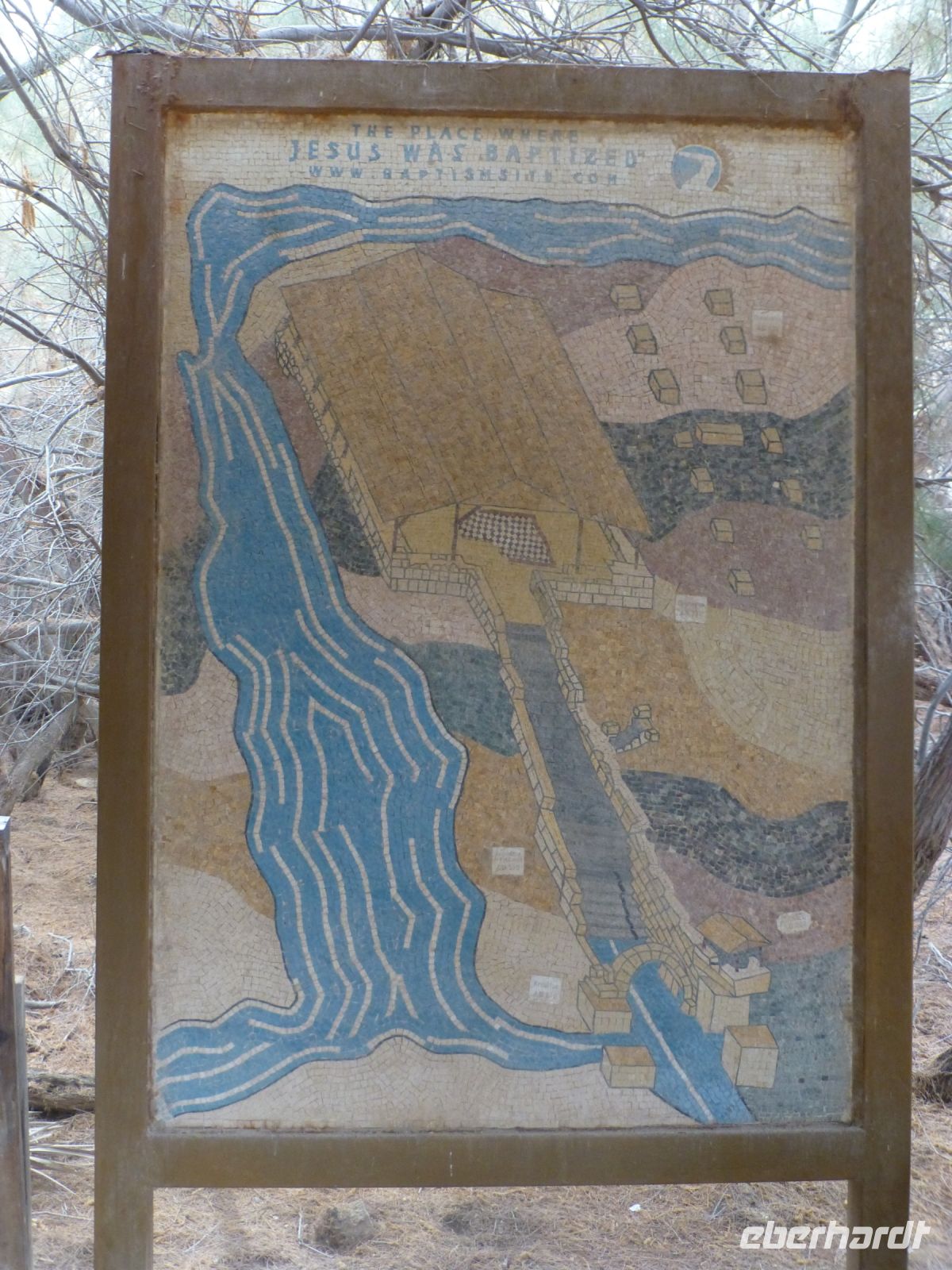 Wir werden zum Glück an dieser Stelle nicht bestraft, sondern von zwei Kleinbussen aufgenommen, die eilig zur Hilfe gerufen worden sind und uns zu unserem letzten Besichtigungsort bringen: zur Taufstelle von Jesus am Jordan. Entlang der Johannesquelle laufen wir zu jener Stelle, wo Johannes der Täufer Jesus getauft haben soll. Da an diesem Ort eine Kirche errichtet worden ist, die nach jedem Erdbeben wieder aufgebaut worden ist, sind die Jordanier fest der Meinung, genügend Hinweise zu haben, dass dieser Ort wie in der Bibel beschrieben auf ihrer Seite liegt.. Der Jordanfluss hat im Laufe der Jahrhunderte seinen Lauf geändert und bildet heute den Grenzfluss zwischen Jordanien und dem von Israel besetzten Westjordanland.