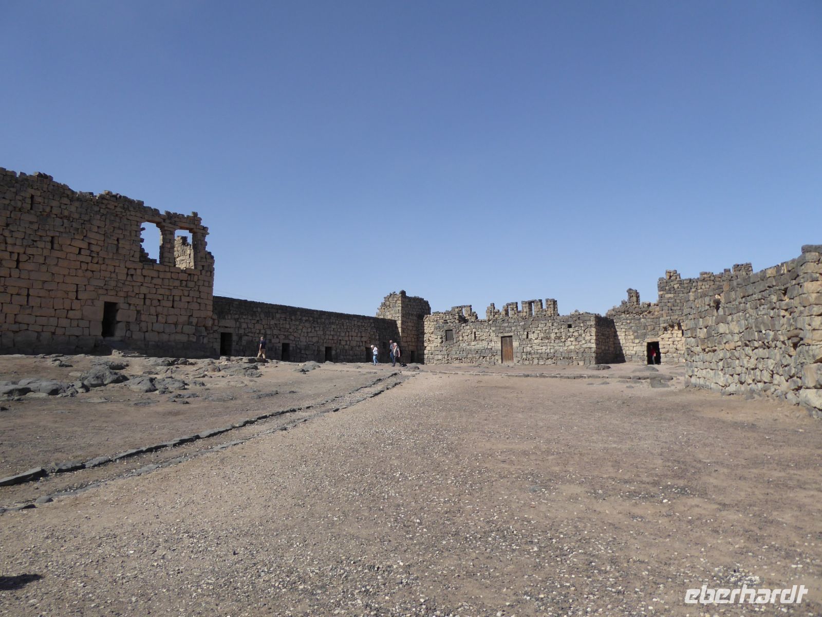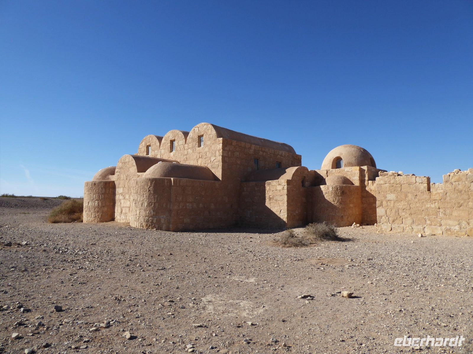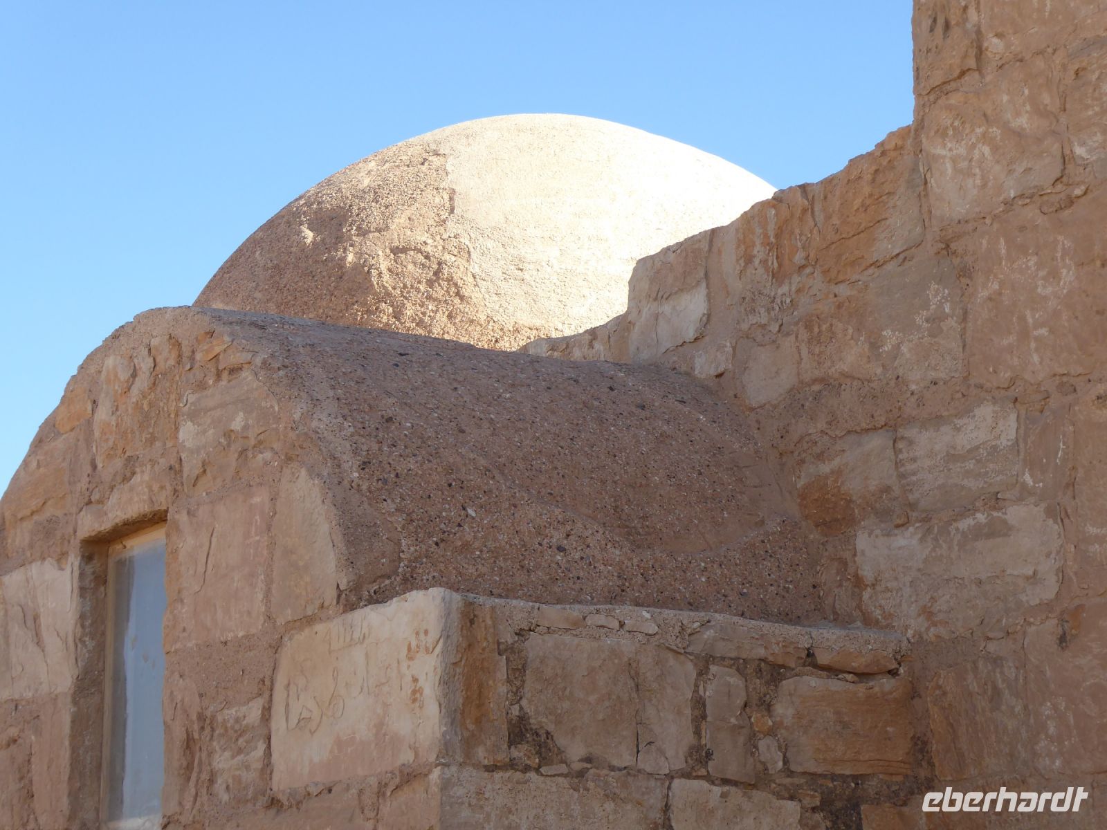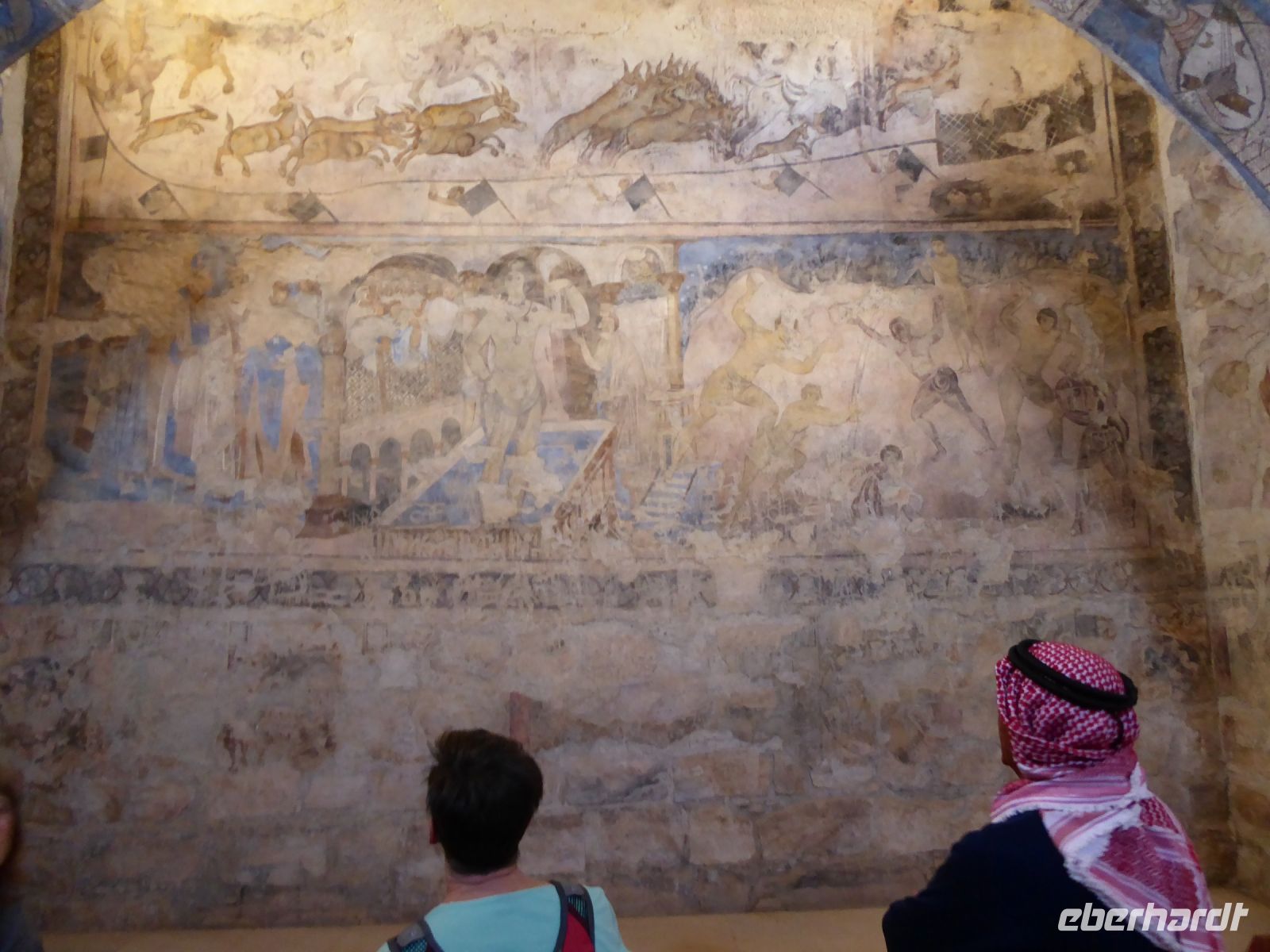 Trotz des reichhaltigen Frühstücks machte sich langsam ein Hungergefühl breit und wir fuhren direkt nach Azraq, wo wir zum Mittagessen bei einer modernen Drusenfamilie eingeladen waren. Neben den leckeren Vorspeisen, bunten Salaten und Joghurtsaucen gab es die berühmte jordanische Spezialität Maqloubeh, eine leckeres Reisgericht mit Hühnerfleisch, das, in einem großen Topf gekocht, kunstvoll auf eine große Platte gestürzt wird. Sieben Gewürze, darunter Safran und Cardamom, 2 Stunden Zubereitungszeit und Kraft in den Armen den schweren Topf um zu stülpen sind dazu nötig. Auch hier wusste Ali viele Geschichten zu erzählen, auch wie man den, in winzigen Tassen gereichten schwarzen Kaffee trinken muss. Zu Fuß erreichten wir das Wüstenschloss Qasr al Azraq, eine aus dunklem Basalt errichtete Befestigungsanlage, die als Teil des arabischen Limes den östlichen Rand des römischen Imperiums sichern sollte. Gewaltige tonnenschwere Tore aus Granitplatten sichern den Komplex. 1917/18 überwinterten Lawrence von Arabien und Sharif Hussein Bin Ali und ihre Mitstreiter in der Anlage. Von hier aus sind es ca. 50 km zur Grenze von Syrien im Norden oder 50 km südlich zur Grenze von Saudi-Arabien. Durch die karge Wüstenlandschaft, vorbei an Militärlagern und Flüchtlingscamps, erreichten wir unsere nächste Station: Qasair Aman, das im achten Jahrhundert errichtete Lustschloss des umayyadischen Prinzen al-Walid ibn Yazid, das in seinem Inneren aufwendig mit Wand- und Deckenmalereien ausgestattet ist. Neben Szenen aus dem Alltagsleben und der Jagd sind auch nackte Frauen dargestellt, die wohl ein griechischer Künstler gemalt haben durfte. Das letzte der Wüstenschlösser ist eher als eine Karawanserei zu bezeichnen: zwei Stockwerke hoch bietet es mit Stallungen und Lagerräumen sämtlichen Komfort, den die Händler für sich und ihre Kamele auf ihrem weiten Ritt durch die Wüste benötigt haben. Auch dieses Gebäude stammt aus dem achten Jahrhundert.