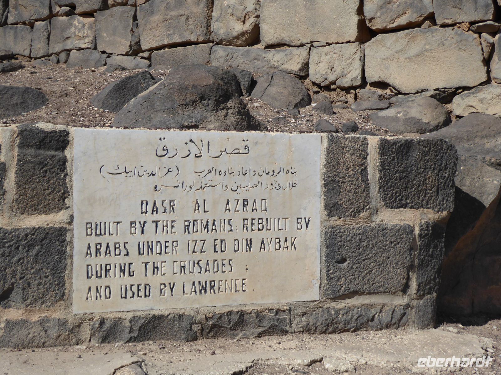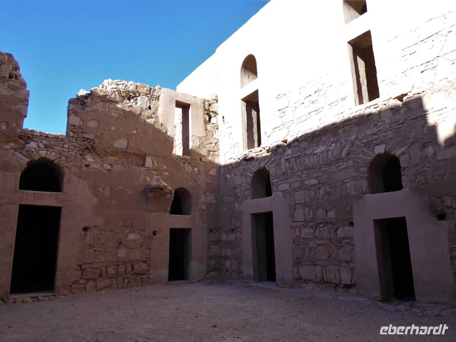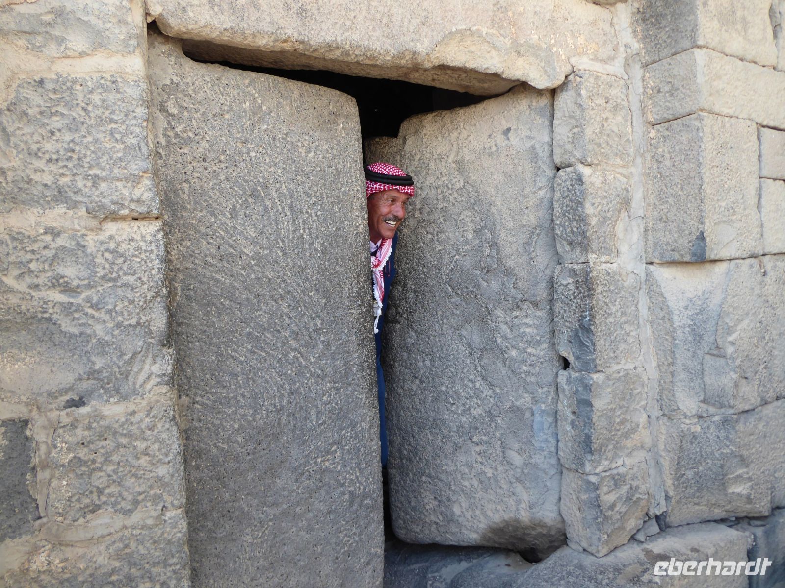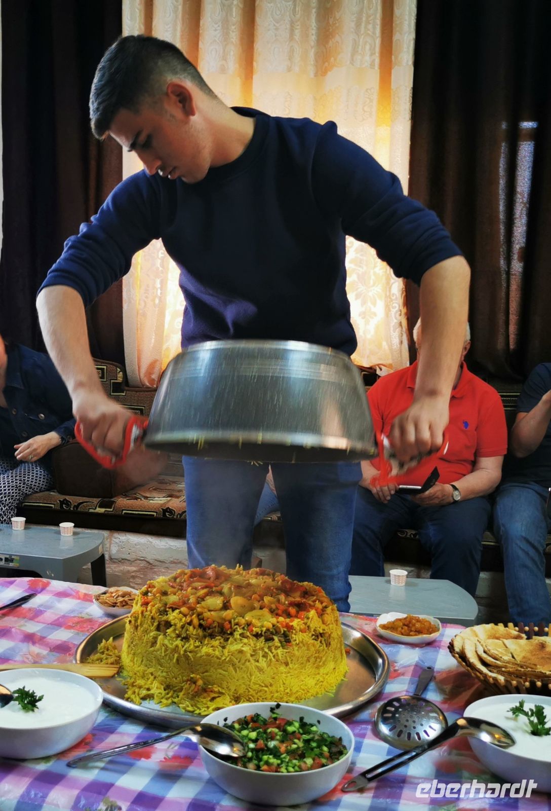 Trotz des reichhaltigen Frühstücks machte sich langsam ein Hungergefühl breit und wir fuhren direkt nach Azraq, wo wir zum Mittagessen bei einer modernen Drusenfamilie eingeladen waren. Neben den leckeren Vorspeisen, bunten Salaten und Joghurtsaucen gab es die berühmte jordanische Spezialität Maqloubeh, eine leckeres Reisgericht mit Hühnerfleisch, das, in einem großen Topf gekocht, kunstvoll auf eine große Platte gestürzt wird. Sieben Gewürze, darunter Safran und Cardamom, 2 Stunden Zubereitungszeit und Kraft in den Armen den schweren Topf um zu stülpen sind dazu nötig. Auch hier wusste Ali viele Geschichten zu erzählen, auch wie man den, in winzigen Tassen gereichten schwarzen Kaffee trinken muss. Zu Fuß erreichten wir das Wüstenschloss Qasr al Azraq, eine aus dunklem Basalt errichtete Befestigungsanlage, die als Teil des arabischen Limes den östlichen Rand des römischen Imperiums sichern sollte. Gewaltige tonnenschwere Tore aus Granitplatten sichern den Komplex. 1917/18 überwinterten Lawrence von Arabien und Sharif Hussein Bin Ali und ihre Mitstreiter in der Anlage. Von hier aus sind es ca. 50 km zur Grenze von Syrien im Norden oder 50 km südlich zur Grenze von Saudi-Arabien. Durch die karge Wüstenlandschaft, vorbei an Militärlagern und Flüchtlingscamps, erreichten wir unsere nächste Station: Qasair Aman, das im achten Jahrhundert errichtete Lustschloss des umayyadischen Prinzen al-Walid ibn Yazid, das in seinem Inneren aufwendig mit Wand- und Deckenmalereien ausgestattet ist. Neben Szenen aus dem Alltagsleben und der Jagd sind auch nackte Frauen dargestellt, die wohl ein griechischer Künstler gemalt haben durfte. Das letzte der Wüstenschlösser ist eher als eine Karawanserei zu bezeichnen: zwei Stockwerke hoch bietet es mit Stallungen und Lagerräumen sämtlichen Komfort, den die Händler für sich und ihre Kamele auf ihrem weiten Ritt durch die Wüste benötigt haben. Auch dieses Gebäude stammt aus dem achten Jahrhundert.