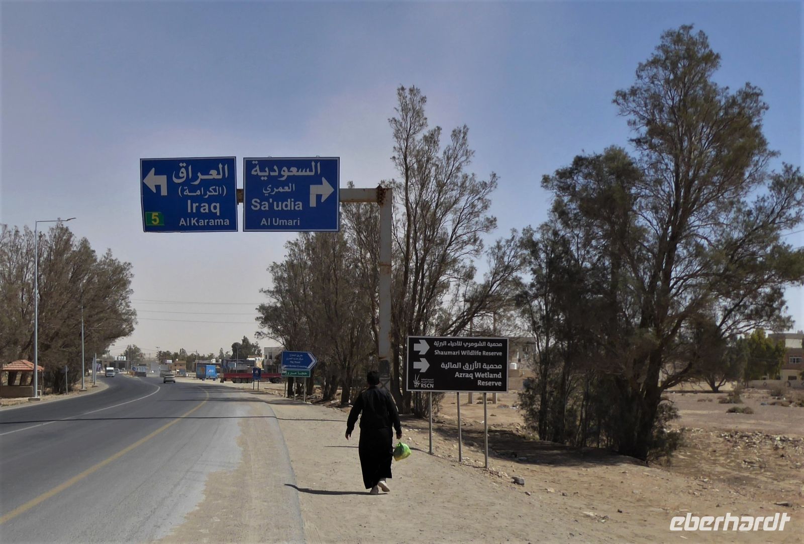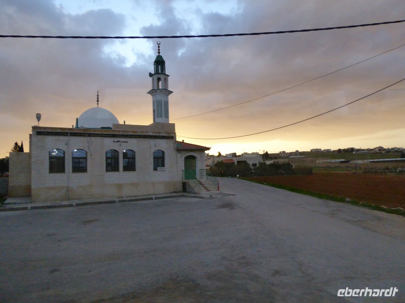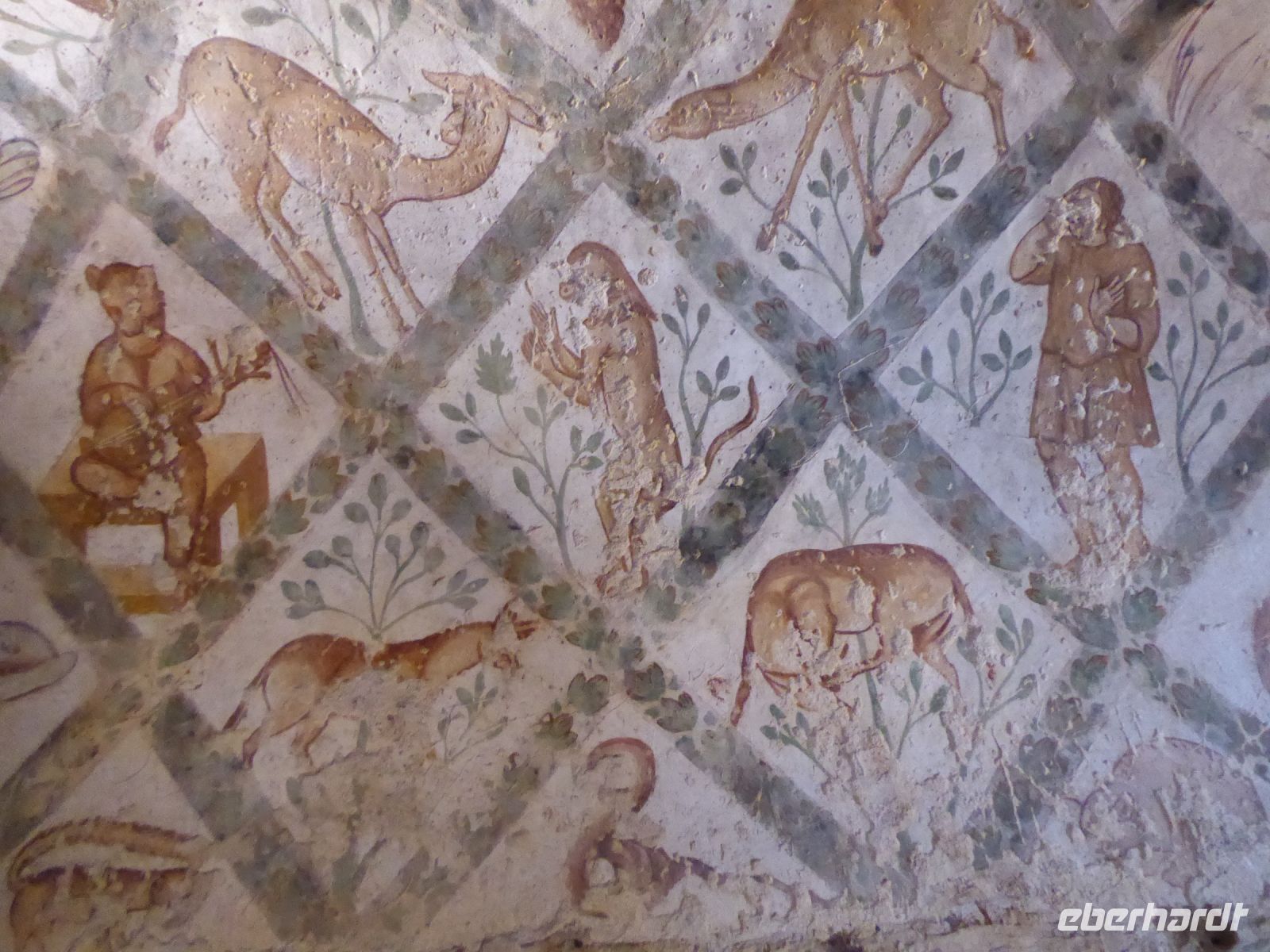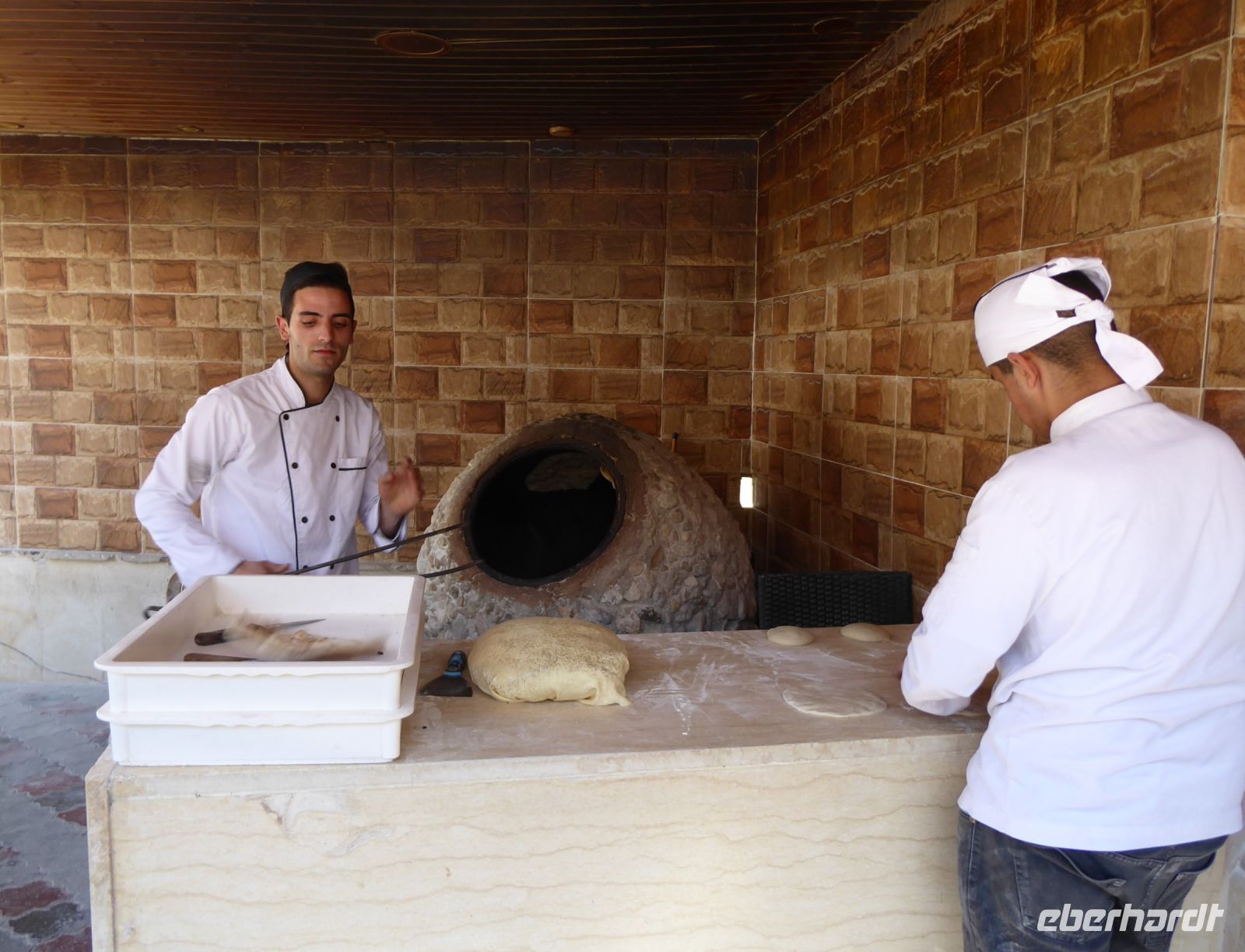 Trotz des reichhaltigen Frühstücks machte sich langsam ein Hungergefühl breit und wir fuhren direkt nach Azraq, wo wir zum Mittagessen bei einer modernen Drusenfamilie eingeladen waren. Neben den leckeren Vorspeisen, bunten Salaten und Joghurtsaucen gab es die berühmte jordanische Spezialität Maqloubeh, eine leckeres Reisgericht mit Hühnerfleisch, das, in einem großen Topf gekocht, kunstvoll auf eine große Platte gestürzt wird. Sieben Gewürze, darunter Safran und Cardamom, 2 Stunden Zubereitungszeit und Kraft in den Armen den schweren Topf um zu stülpen sind dazu nötig. Auch hier wusste Ali viele Geschichten zu erzählen, auch wie man den, in winzigen Tassen gereichten schwarzen Kaffee trinken muss. Zu Fuß erreichten wir das Wüstenschloss Qasr al Azraq, eine aus dunklem Basalt errichtete Befestigungsanlage, die als Teil des arabischen Limes den östlichen Rand des römischen Imperiums sichern sollte. Gewaltige tonnenschwere Tore aus Granitplatten sichern den Komplex. 1917/18 überwinterten Lawrence von Arabien und Sharif Hussein Bin Ali und ihre Mitstreiter in der Anlage. Von hier aus sind es ca. 50 km zur Grenze von Syrien im Norden oder 50 km südlich zur Grenze von Saudi-Arabien. Durch die karge Wüstenlandschaft, vorbei an Militärlagern und Flüchtlingscamps, erreichten wir unsere nächste Station: Qasair Aman, das im achten Jahrhundert errichtete Lustschloss des umayyadischen Prinzen al-Walid ibn Yazid, das in seinem Inneren aufwendig mit Wand- und Deckenmalereien ausgestattet ist. Neben Szenen aus dem Alltagsleben und der Jagd sind auch nackte Frauen dargestellt, die wohl ein griechischer Künstler gemalt haben durfte. Das letzte der Wüstenschlösser ist eher als eine Karawanserei zu bezeichnen: zwei Stockwerke hoch bietet es mit Stallungen und Lagerräumen sämtlichen Komfort, den die Händler für sich und ihre Kamele auf ihrem weiten Ritt durch die Wüste benötigt haben. Auch dieses Gebäude stammt aus dem achten Jahrhundert.