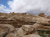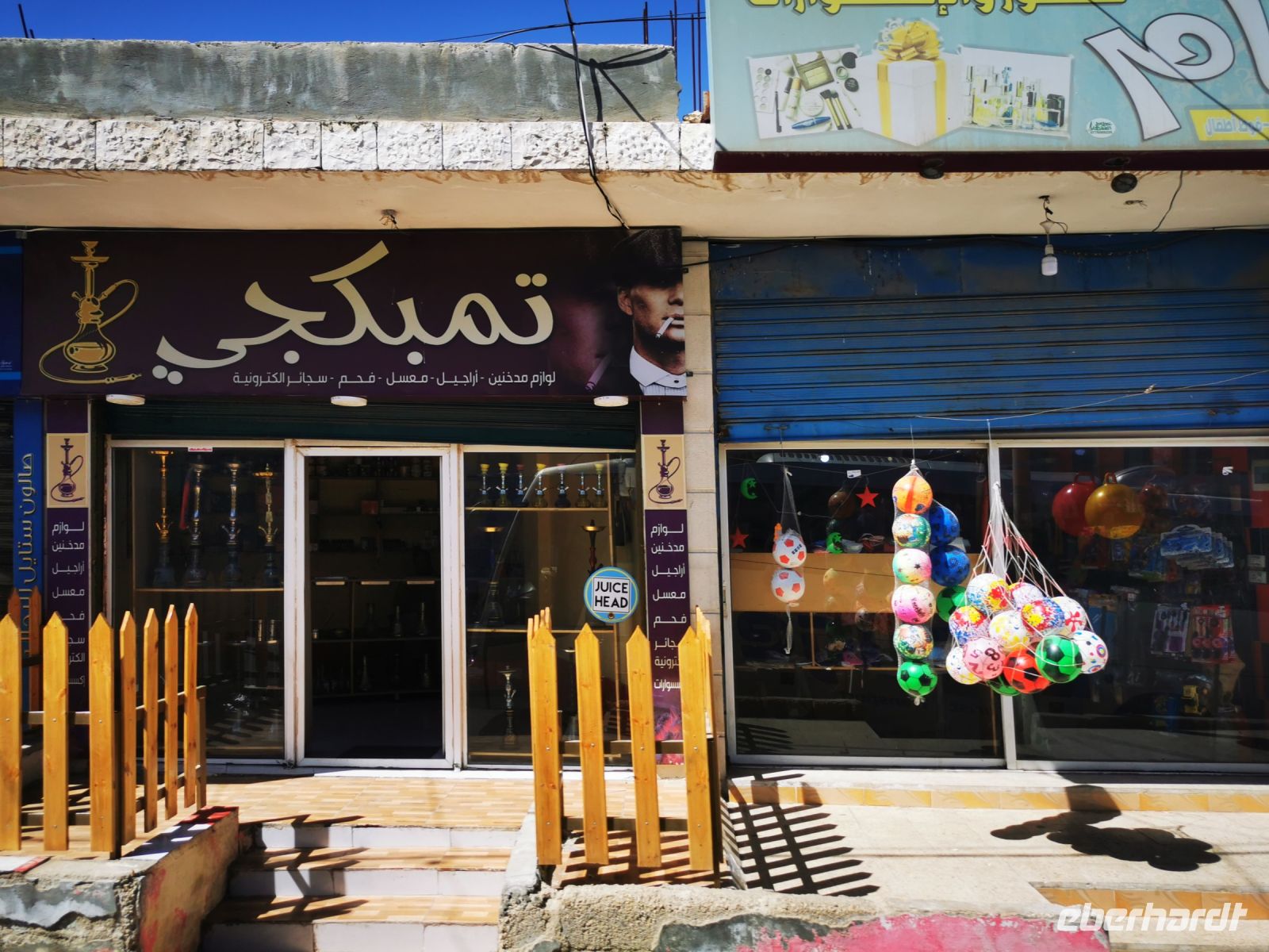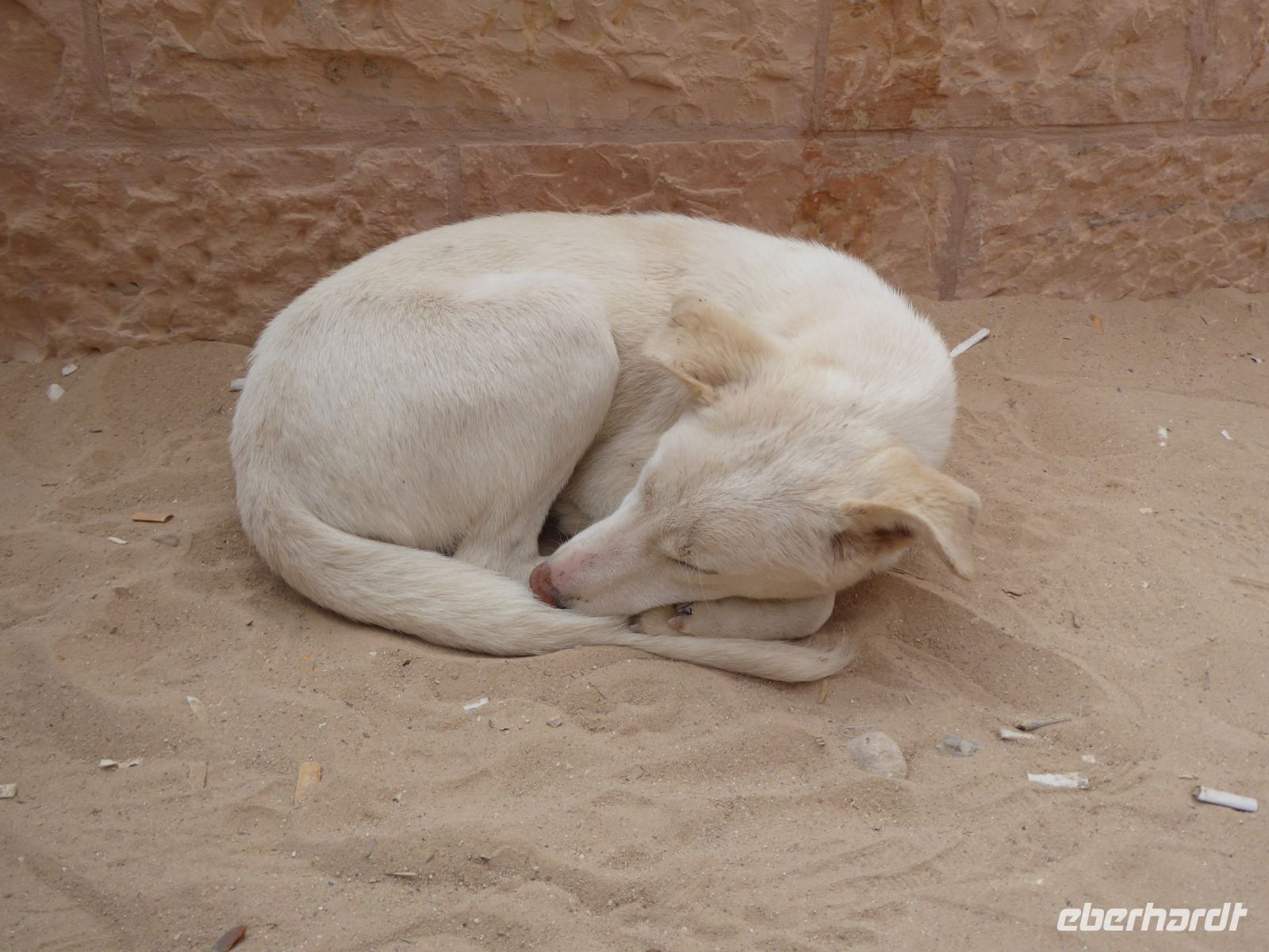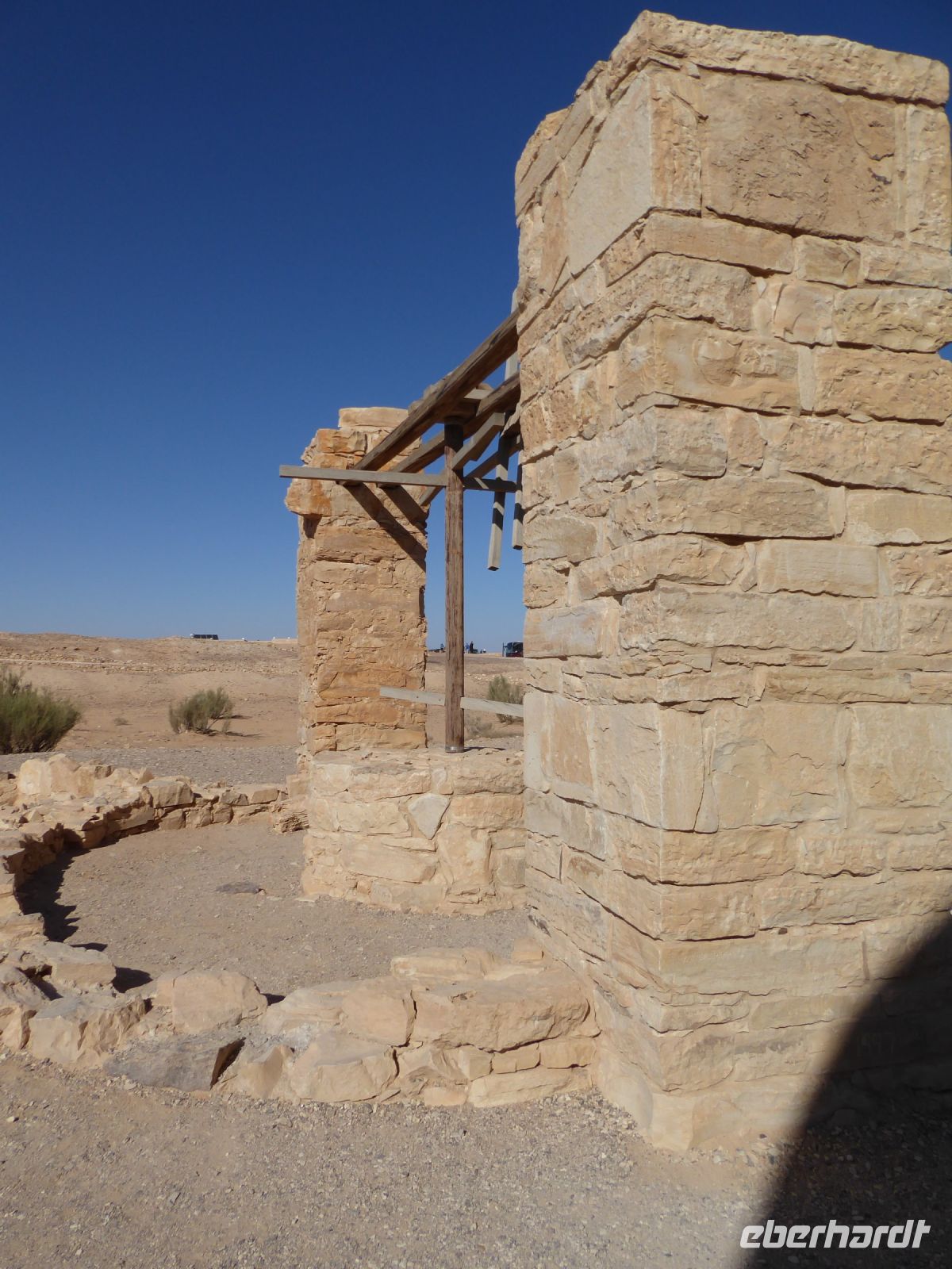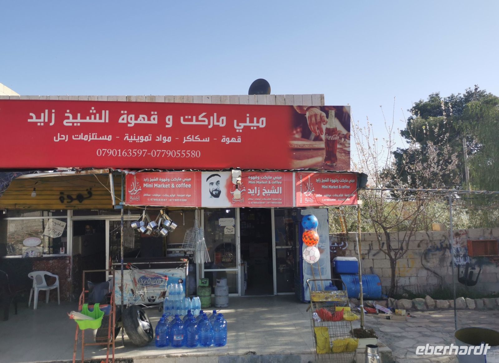 Trotz des reichhaltigen Frühstücks machte sich langsam ein Hungergefühl breit und wir fuhren direkt nach Azraq, wo wir zum Mittagessen bei einer modernen Drusenfamilie eingeladen waren. Neben den leckeren Vorspeisen, bunten Salaten und Joghurtsaucen gab es die berühmte jordanische Spezialität Maqloubeh, eine leckeres Reisgericht mit Hühnerfleisch, das, in einem großen Topf gekocht, kunstvoll auf eine große Platte gestürzt wird. Sieben Gewürze, darunter Safran und Cardamom, 2 Stunden Zubereitungszeit und Kraft in den Armen den schweren Topf um zu stülpen sind dazu nötig. Auch hier wusste Ali viele Geschichten zu erzählen, auch wie man den, in winzigen Tassen gereichten schwarzen Kaffee trinken muss. Zu Fuß erreichten wir das Wüstenschloss Qasr al Azraq, eine aus dunklem Basalt errichtete Befestigungsanlage, die als Teil des arabischen Limes den östlichen Rand des römischen Imperiums sichern sollte. Gewaltige tonnenschwere Tore aus Granitplatten sichern den Komplex. 1917/18 überwinterten Lawrence von Arabien und Sharif Hussein Bin Ali und ihre Mitstreiter in der Anlage. Von hier aus sind es ca. 50 km zur Grenze von Syrien im Norden oder 50 km südlich zur Grenze von Saudi-Arabien. Durch die karge Wüstenlandschaft, vorbei an Militärlagern und Flüchtlingscamps, erreichten wir unsere nächste Station: Qasair Aman, das im achten Jahrhundert errichtete Lustschloss des umayyadischen Prinzen al-Walid ibn Yazid, das in seinem Inneren aufwendig mit Wand- und Deckenmalereien ausgestattet ist. Neben Szenen aus dem Alltagsleben und der Jagd sind auch nackte Frauen dargestellt, die wohl ein griechischer Künstler gemalt haben durfte. Das letzte der Wüstenschlösser ist eher als eine Karawanserei zu bezeichnen: zwei Stockwerke hoch bietet es mit Stallungen und Lagerräumen sämtlichen Komfort, den die Händler für sich und ihre Kamele auf ihrem weiten Ritt durch die Wüste benötigt haben. Auch dieses Gebäude stammt aus dem achten Jahrhundert.
