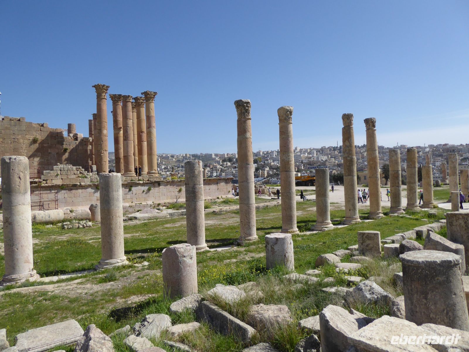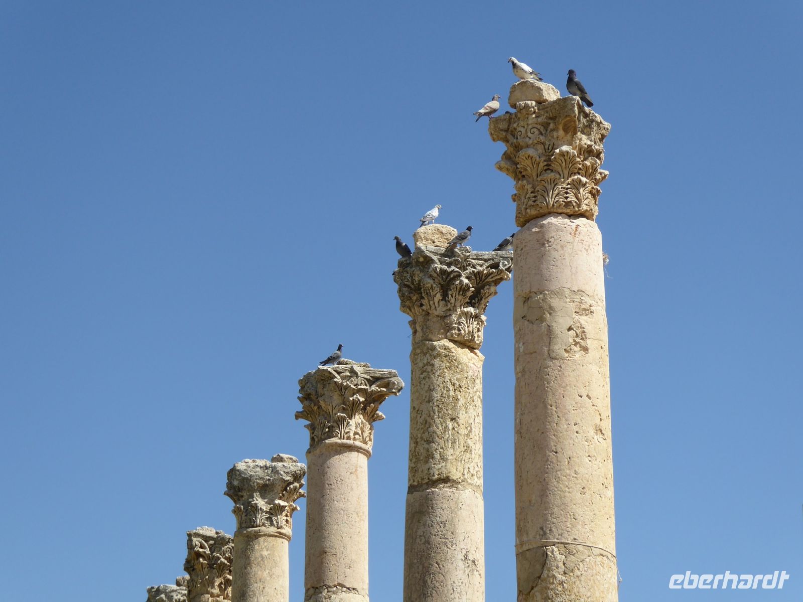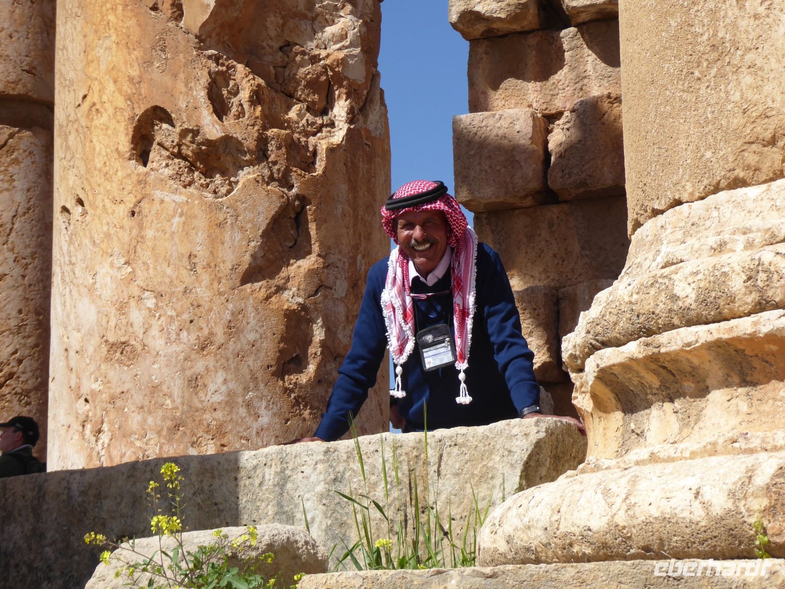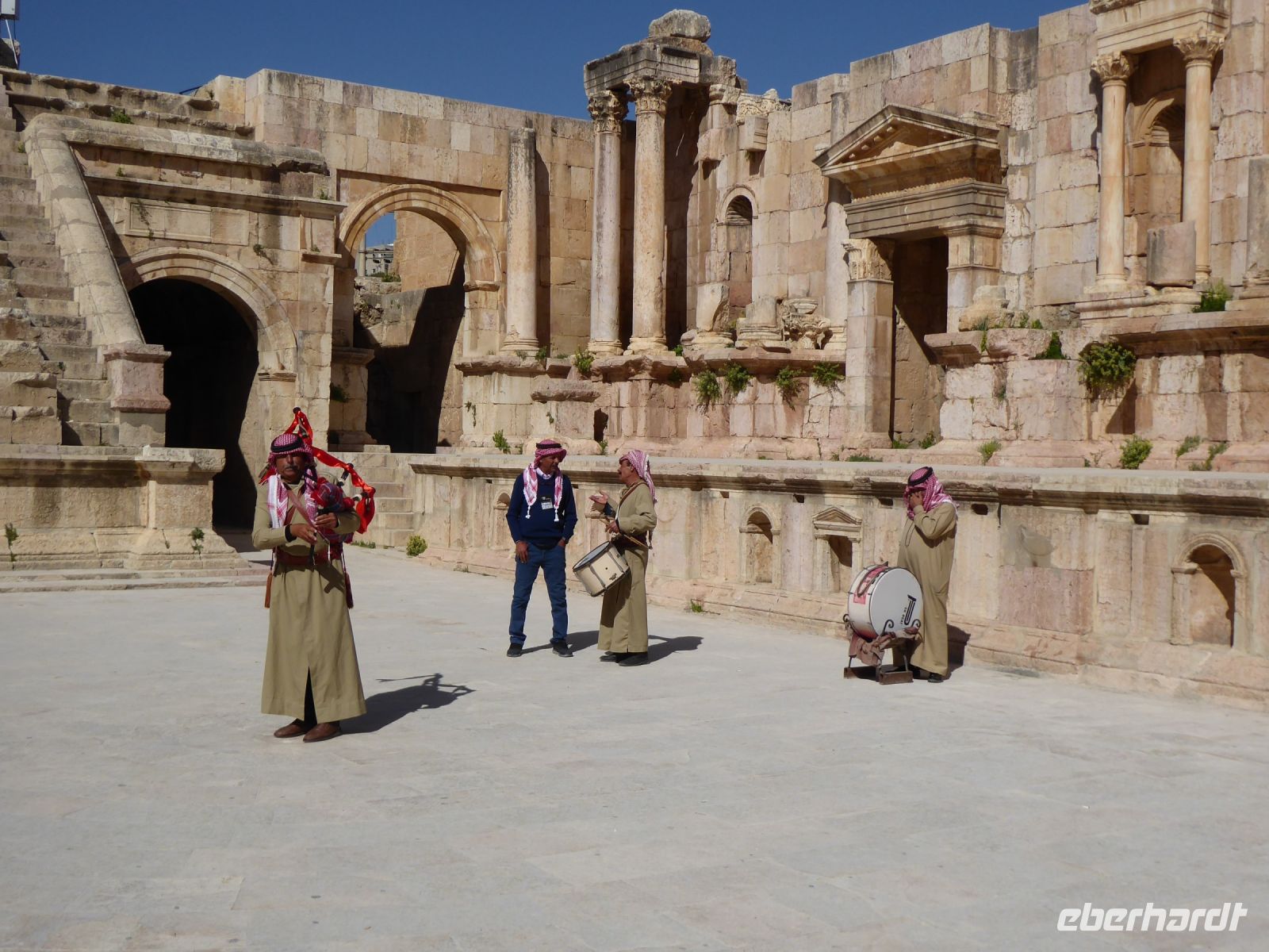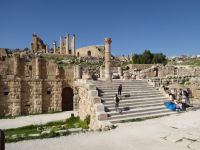 Heute stand ein Ausflug in die antike römische Stadt Gerasa auf unserem Programm. in einer knappen Stunde erreichten wir die genau im Norden von Amman liegende Stadt Jerash, wo uns von Ali die Geschichte der Region erläuterte, die unter der römischen Herrschaft als Teil der Provinz Syria Mitglied des zehn Städtebundes wurde. Ab dem ersten vorchristlichen Jahrhundert stieg die Stadt zu einem mächtigen Handelszentrum auf, das der älteren Stadt Petra massiv Konkurrenz machte. Zudem wurden ganz in der Nähe Eisenerz abgebaut. Der Reichtum der Stadt lässt sich an ihrer regen Bautätigkeit nachweisen. Bis heute beeindrucken die imposanten Säulenreihen die Besucher. Man betritt die Anlage durch einen riesigen Basar, der sämtliches an touristischen Devotionalien bereithält. Die antike Stadt war von einer gewaltigen Stadtmauer umgeben, die durch mehrere Tore betreten werden konnte. Dem Südtor vorgelagert ist der gewaltige Triumphbogen zu Ehren Kaiser Hadrian aus der ersten Hälfte des zweiten Jahrhunderts. Gleich dahinter dehnen sich die großzügigen Pferdeställe aus, an die sich ein Hippodrom, eine Pferderennbahn, anschließt. Vom ovalen, säulenumstandenen Forum gelangt man zum Zeus Tempel und zum Theater. Davor ließ uns Ali an den Blättern eines Pfefferbaumes schnuppern und innen spielten Musiker flotte Weisen auf arabischen Instrumenten. Die gesamte Anlage ist wohltuend grün. Ein Nymphäum, ein Jupiter Tempel und weitere Heiligtümer säumen die Hauptachse des Ortes. Mehrere spätantike und mittelalterliche Kirchenbauten, wie die Kirche Sankt Cosmas und Damian mit ihrem besonders schönen Mosaikboden aus dem sechsten Jahrhundert und eine Synagoge belegen das friedliche Zusammenleben der Menschen unterschiedlicher Religionen. Das beeindruckendste Bauwerk, damals wie heute, ist mit Sicherheit der Artemis Tempel. Elf von einst zweiunddreißig Säulen ragen bis heute 13 m hoch in den Himmel. Die Pilger damals näherten sich dem Bauwerk über eine Prozessionstreppe, die, von der Stadt heraufführend, die Tempelanlage noch größer erscheinen ließ. Beeindruckt von der Größe der antiken Stadt und der unglaublichen Menge an Säulen, verließen wir Gerasa und kehrten in einem nahe gelegenen Restaurant ein. Unglaublich, dass ein Lokal dieser Größenordnung, in dem gut 500 Menschen Platz finden, uns das Gefühl vermittelt, als gern gesehene Gäste gut und reichlich bewirtet zu werden.