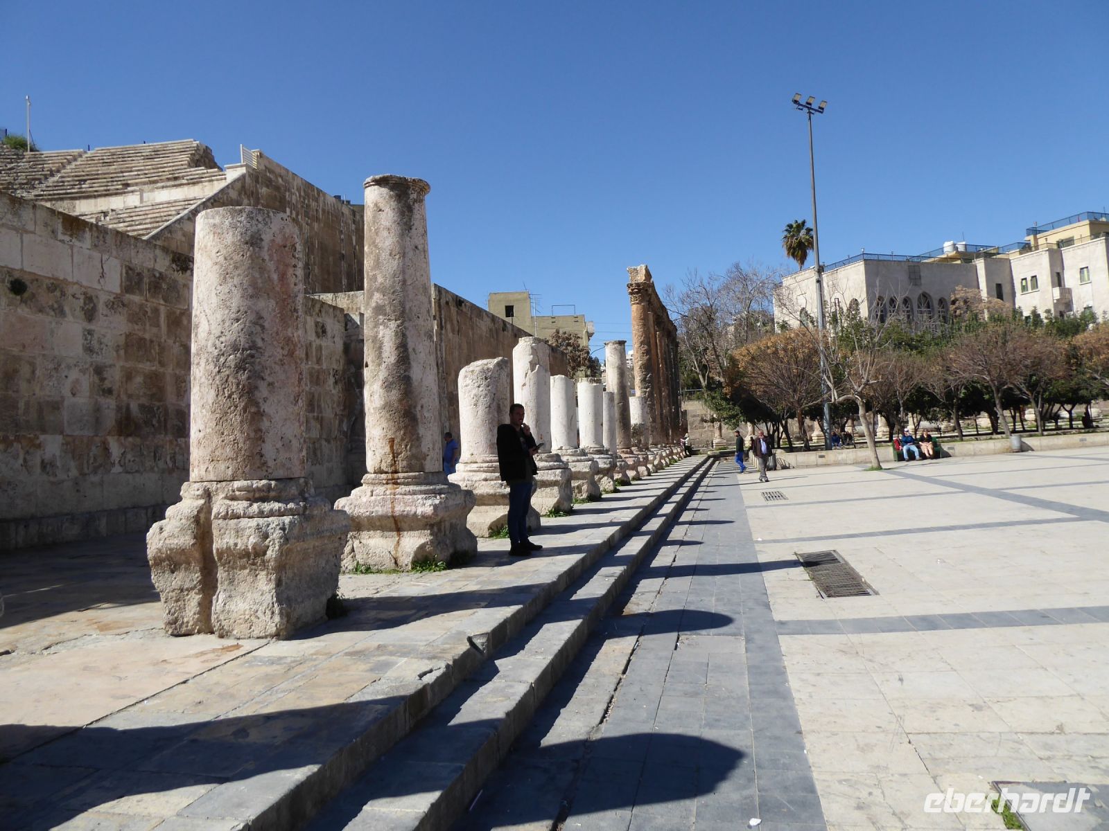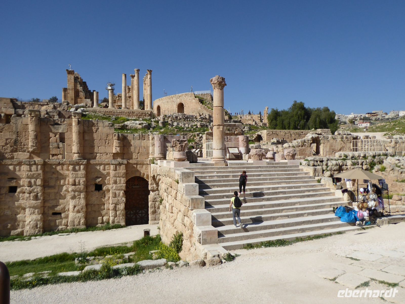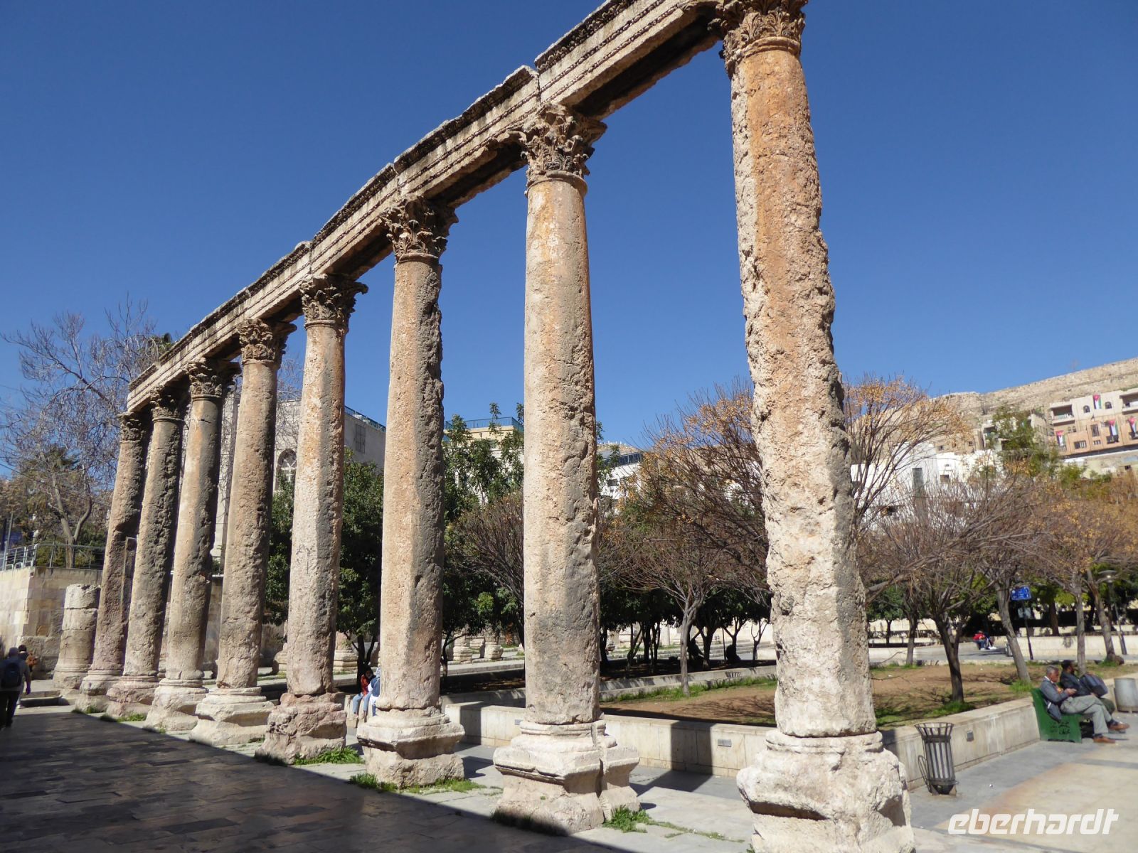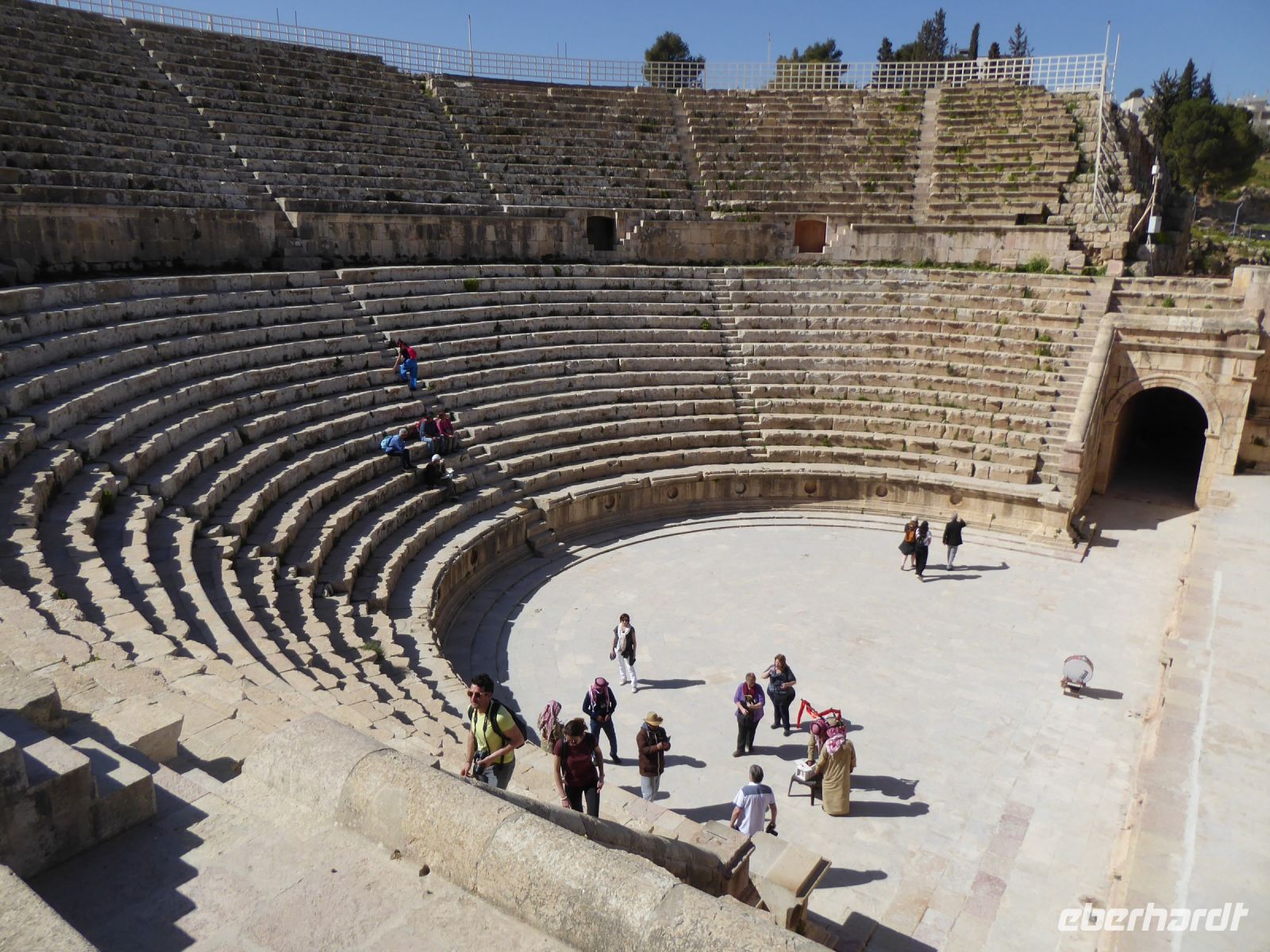 Heute stand ein Ausflug in die antike römische Stadt Gerasa auf unserem Programm. in einer knappen Stunde erreichten wir die genau im Norden von Amman liegende Stadt Jerash, wo uns von Ali die Geschichte der Region erläuterte, die unter der römischen Herrschaft als Teil der Provinz Syria Mitglied des zehn Städtebundes wurde. Ab dem ersten vorchristlichen Jahrhundert stieg die Stadt zu einem mächtigen Handelszentrum auf, das der älteren Stadt Petra massiv Konkurrenz machte. Zudem wurden ganz in der Nähe Eisenerz abgebaut. Der Reichtum der Stadt lässt sich an ihrer regen Bautätigkeit nachweisen. Bis heute beeindrucken die imposanten Säulenreihen die Besucher. Man betritt die Anlage durch einen riesigen Basar, der sämtliches an touristischen Devotionalien bereithält. Die antike Stadt war von einer gewaltigen Stadtmauer umgeben, die durch mehrere Tore betreten werden konnte. Dem Südtor vorgelagert ist der gewaltige Triumphbogen zu Ehren Kaiser Hadrian aus der ersten Hälfte des zweiten Jahrhunderts. Gleich dahinter dehnen sich die großzügigen Pferdeställe aus, an die sich ein Hippodrom, eine Pferderennbahn, anschließt. Vom ovalen, säulenumstandenen Forum gelangt man zum Zeus Tempel und zum Theater. Davor ließ uns Ali an den Blättern eines Pfefferbaumes schnuppern und innen spielten Musiker flotte Weisen auf arabischen Instrumenten. Die gesamte Anlage ist wohltuend grün. Ein Nymphäum, ein Jupiter Tempel und weitere Heiligtümer säumen die Hauptachse des Ortes. Mehrere spätantike und mittelalterliche Kirchenbauten, wie die Kirche Sankt Cosmas und Damian mit ihrem besonders schönen Mosaikboden aus dem sechsten Jahrhundert und eine Synagoge belegen das friedliche Zusammenleben der Menschen unterschiedlicher Religionen. Das beeindruckendste Bauwerk, damals wie heute, ist mit Sicherheit der Artemis Tempel. Elf von einst zweiunddreißig Säulen ragen bis heute 13 m hoch in den Himmel. Die Pilger damals näherten sich dem Bauwerk über eine Prozessionstreppe, die, von der Stadt heraufführend, die Tempelanlage noch größer erscheinen ließ. Beeindruckt von der Größe der antiken Stadt und der unglaublichen Menge an Säulen, verließen wir Gerasa und kehrten in einem nahe gelegenen Restaurant ein. Unglaublich, dass ein Lokal dieser Größenordnung, in dem gut 500 Menschen Platz finden, uns das Gefühl vermittelt, als gern gesehene Gäste gut und reichlich bewirtet zu werden.