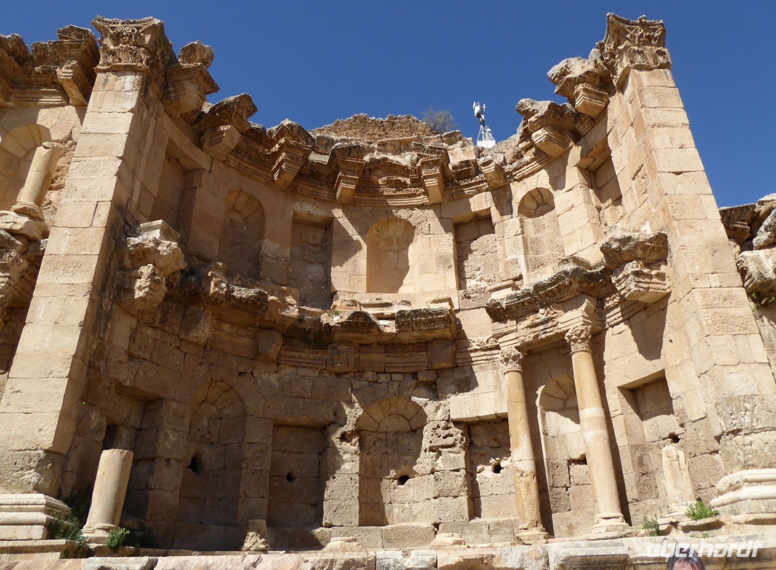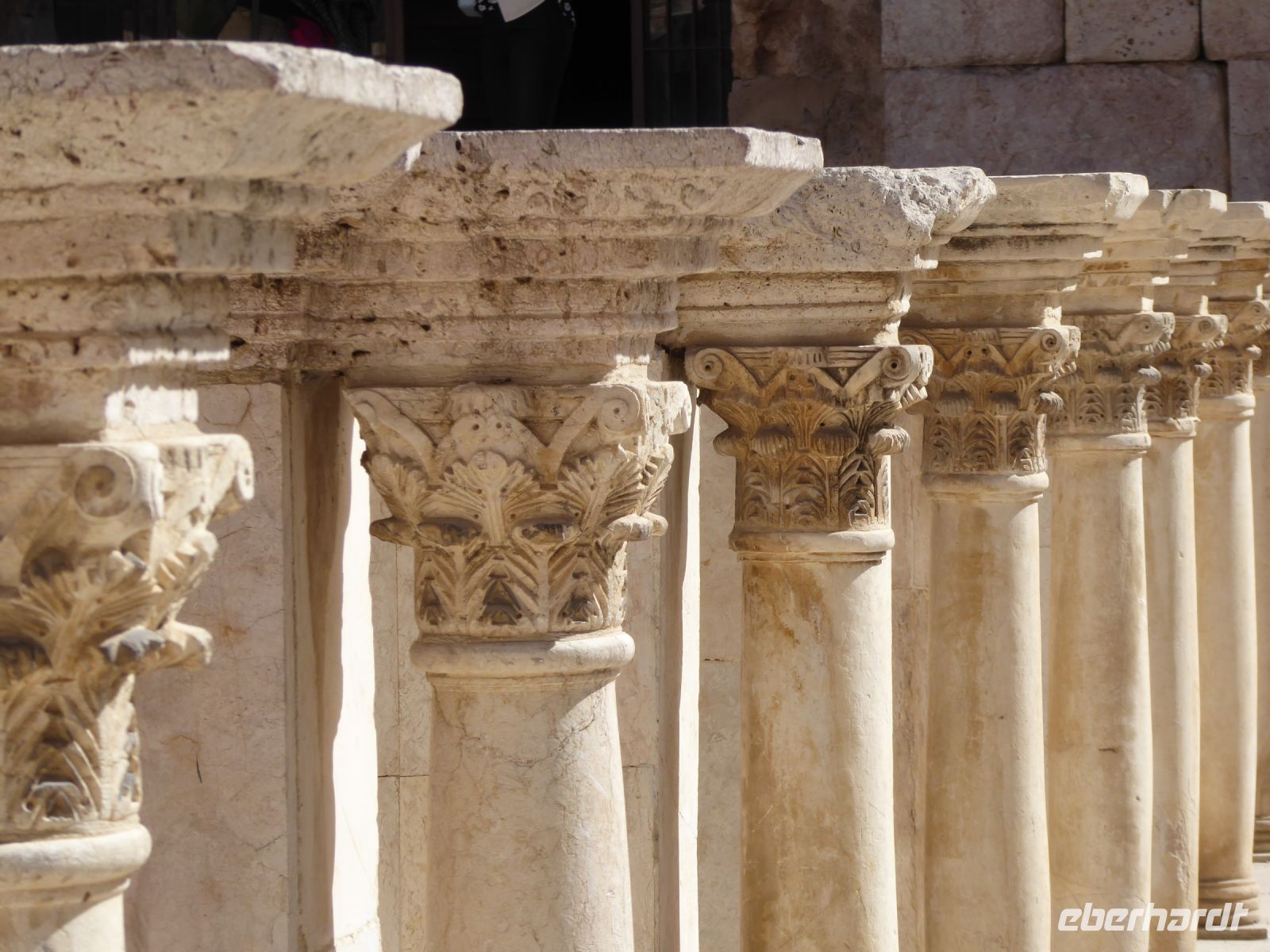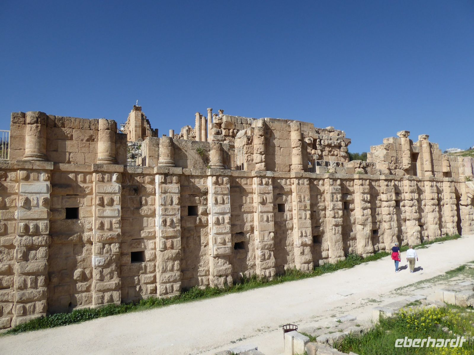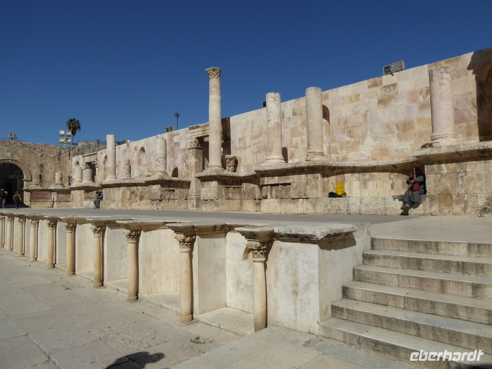 Heute stand ein Ausflug in die antike römische Stadt Gerasa auf unserem Programm. in einer knappen Stunde erreichten wir die genau im Norden von Amman liegende Stadt Jerash, wo uns von Ali die Geschichte der Region erläuterte, die unter der römischen Herrschaft als Teil der Provinz Syria Mitglied des zehn Städtebundes wurde. Ab dem ersten vorchristlichen Jahrhundert stieg die Stadt zu einem mächtigen Handelszentrum auf, das der älteren Stadt Petra massiv Konkurrenz machte. Zudem wurden ganz in der Nähe Eisenerz abgebaut. Der Reichtum der Stadt lässt sich an ihrer regen Bautätigkeit nachweisen. Bis heute beeindrucken die imposanten Säulenreihen die Besucher. Man betritt die Anlage durch einen riesigen Basar, der sämtliches an touristischen Devotionalien bereithält. Die antike Stadt war von einer gewaltigen Stadtmauer umgeben, die durch mehrere Tore betreten werden konnte. Dem Südtor vorgelagert ist der gewaltige Triumphbogen zu Ehren Kaiser Hadrian aus der ersten Hälfte des zweiten Jahrhunderts. Gleich dahinter dehnen sich die großzügigen Pferdeställe aus, an die sich ein Hippodrom, eine Pferderennbahn, anschließt. Vom ovalen, säulenumstandenen Forum gelangt man zum Zeus Tempel und zum Theater. Davor ließ uns Ali an den Blättern eines Pfefferbaumes schnuppern und innen spielten Musiker flotte Weisen auf arabischen Instrumenten. Die gesamte Anlage ist wohltuend grün. Ein Nymphäum, ein Jupiter Tempel und weitere Heiligtümer säumen die Hauptachse des Ortes. Mehrere spätantike und mittelalterliche Kirchenbauten, wie die Kirche Sankt Cosmas und Damian mit ihrem besonders schönen Mosaikboden aus dem sechsten Jahrhundert und eine Synagoge belegen das friedliche Zusammenleben der Menschen unterschiedlicher Religionen. Das beeindruckendste Bauwerk, damals wie heute, ist mit Sicherheit der Artemis Tempel. Elf von einst zweiunddreißig Säulen ragen bis heute 13 m hoch in den Himmel. Die Pilger damals näherten sich dem Bauwerk über eine Prozessionstreppe, die, von der Stadt heraufführend, die Tempelanlage noch größer erscheinen ließ. Beeindruckt von der Größe der antiken Stadt und der unglaublichen Menge an Säulen, verließen wir Gerasa und kehrten in einem nahe gelegenen Restaurant ein. Unglaublich, dass ein Lokal dieser Größenordnung, in dem gut 500 Menschen Platz finden, uns das Gefühl vermittelt, als gern gesehene Gäste gut und reichlich bewirtet zu werden.