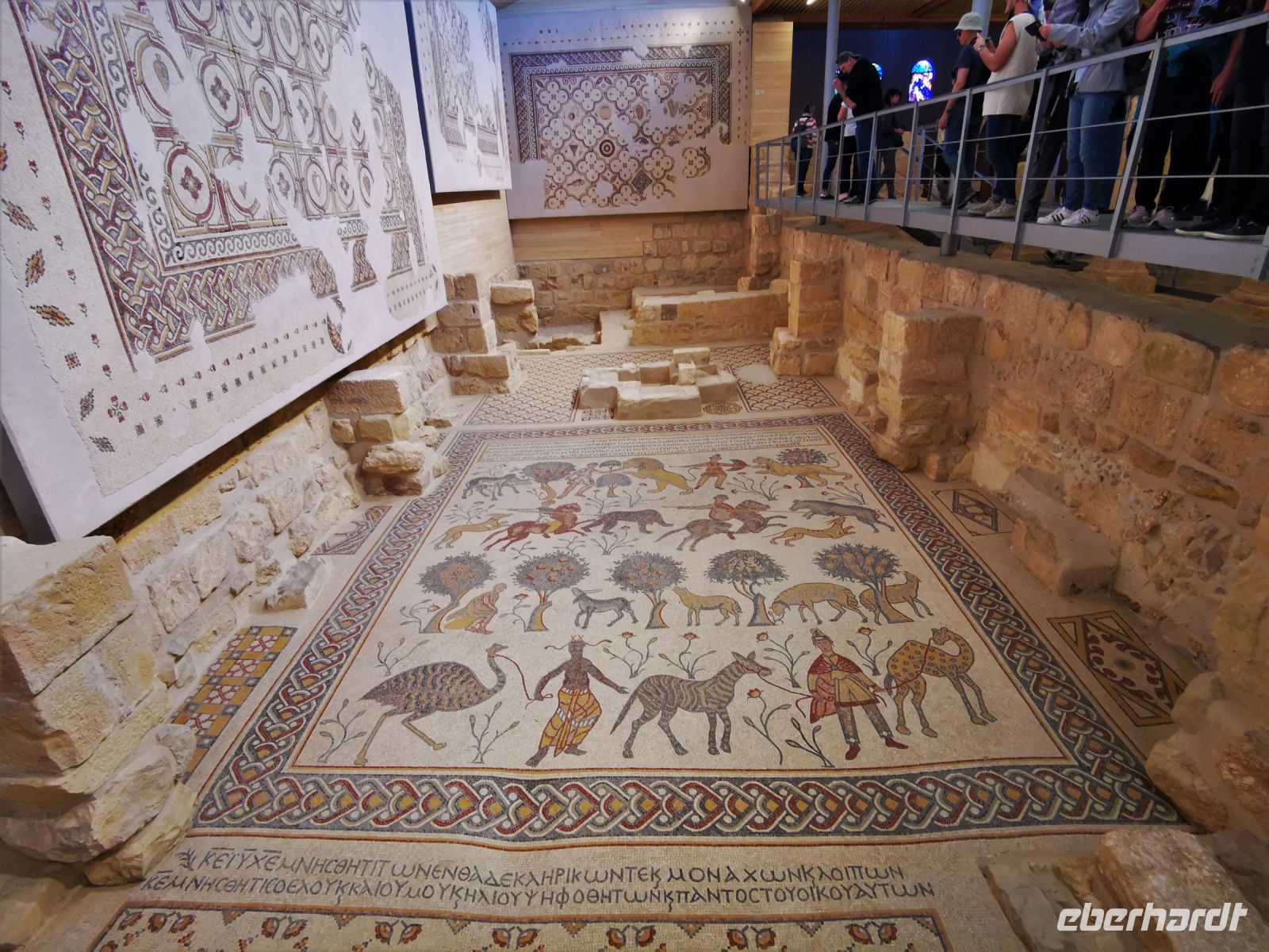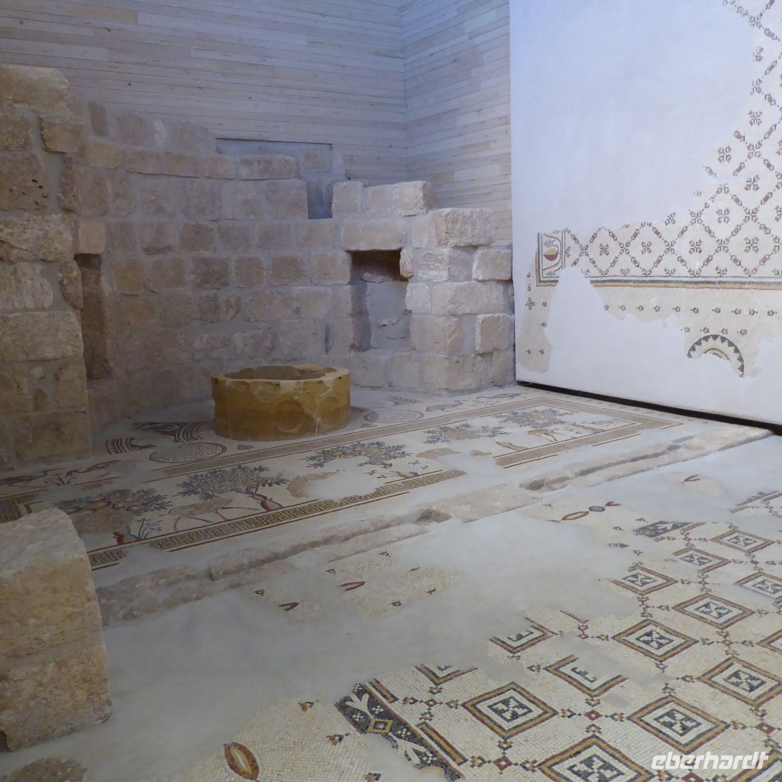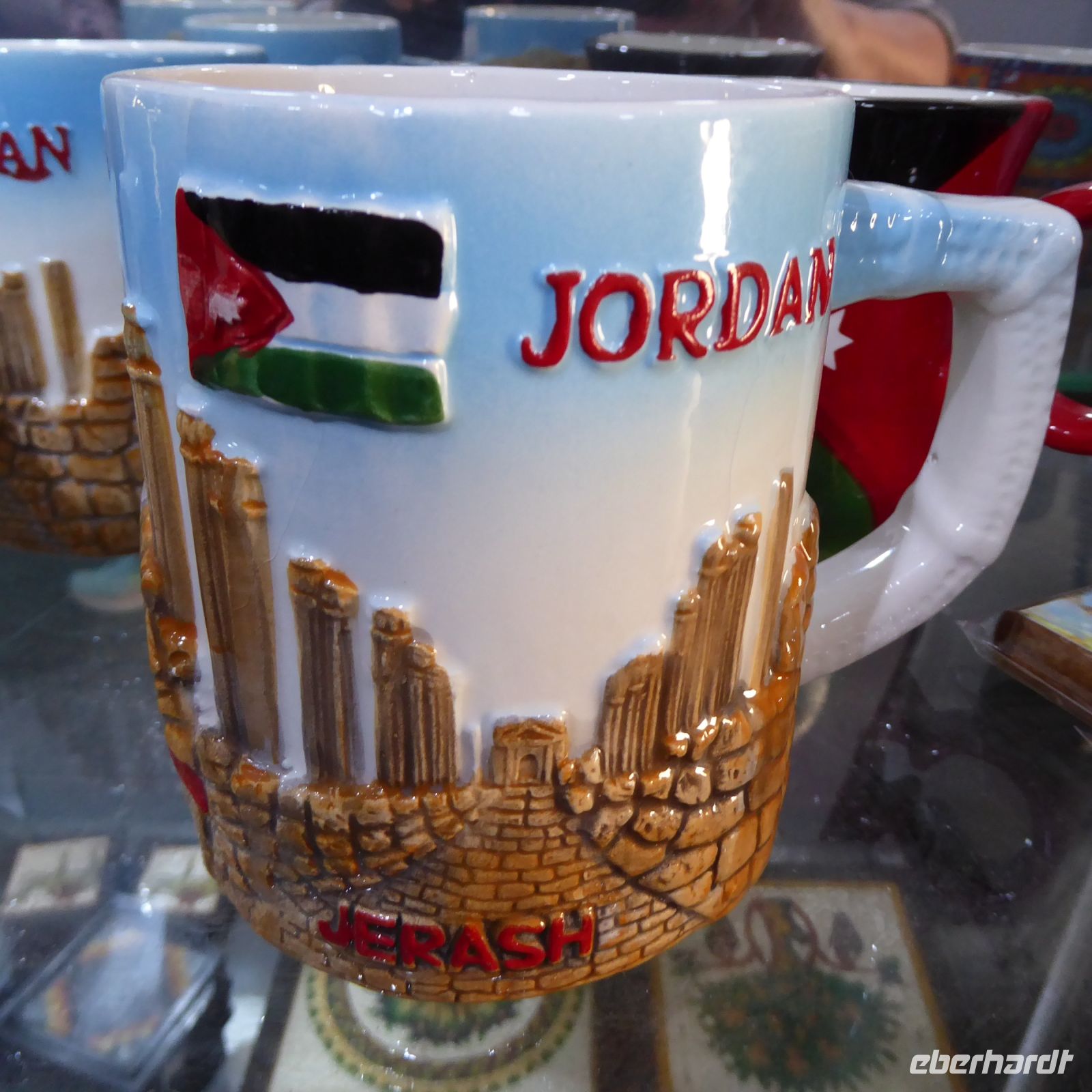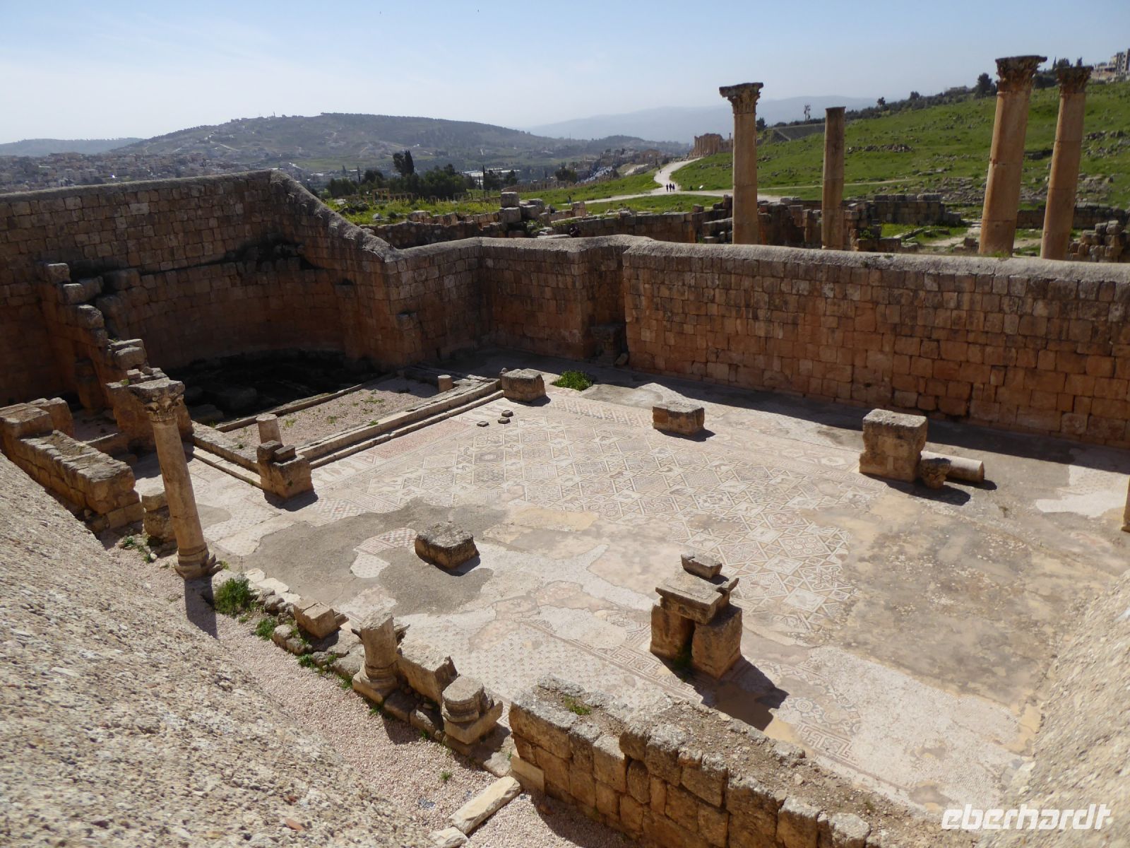 Heute stand ein Ausflug in die antike römische Stadt Gerasa auf unserem Programm. in einer knappen Stunde erreichten wir die genau im Norden von Amman liegende Stadt Jerash, wo uns von Ali die Geschichte der Region erläuterte, die unter der römischen Herrschaft als Teil der Provinz Syria Mitglied des zehn Städtebundes wurde. Ab dem ersten vorchristlichen Jahrhundert stieg die Stadt zu einem mächtigen Handelszentrum auf, das der älteren Stadt Petra massiv Konkurrenz machte. Zudem wurden ganz in der Nähe Eisenerz abgebaut. Der Reichtum der Stadt lässt sich an ihrer regen Bautätigkeit nachweisen. Bis heute beeindrucken die imposanten Säulenreihen die Besucher. Man betritt die Anlage durch einen riesigen Basar, der sämtliches an touristischen Devotionalien bereithält. Die antike Stadt war von einer gewaltigen Stadtmauer umgeben, die durch mehrere Tore betreten werden konnte. Dem Südtor vorgelagert ist der gewaltige Triumphbogen zu Ehren Kaiser Hadrian aus der ersten Hälfte des zweiten Jahrhunderts. Gleich dahinter dehnen sich die großzügigen Pferdeställe aus, an die sich ein Hippodrom, eine Pferderennbahn, anschließt. Vom ovalen, säulenumstandenen Forum gelangt man zum Zeus Tempel und zum Theater. Davor ließ uns Ali an den Blättern eines Pfefferbaumes schnuppern und innen spielten Musiker flotte Weisen auf arabischen Instrumenten. Die gesamte Anlage ist wohltuend grün. Ein Nymphäum, ein Jupiter Tempel und weitere Heiligtümer säumen die Hauptachse des Ortes. Mehrere spätantike und mittelalterliche Kirchenbauten, wie die Kirche Sankt Cosmas und Damian mit ihrem besonders schönen Mosaikboden aus dem sechsten Jahrhundert und eine Synagoge belegen das friedliche Zusammenleben der Menschen unterschiedlicher Religionen. Das beeindruckendste Bauwerk, damals wie heute, ist mit Sicherheit der Artemis Tempel. Elf von einst zweiunddreißig Säulen ragen bis heute 13 m hoch in den Himmel. Die Pilger damals näherten sich dem Bauwerk über eine Prozessionstreppe, die, von der Stadt heraufführend, die Tempelanlage noch größer erscheinen ließ. Beeindruckt von der Größe der antiken Stadt und der unglaublichen Menge an Säulen, verließen wir Gerasa und kehrten in einem nahe gelegenen Restaurant ein. Unglaublich, dass ein Lokal dieser Größenordnung, in dem gut 500 Menschen Platz finden, uns das Gefühl vermittelt, als gern gesehene Gäste gut und reichlich bewirtet zu werden.