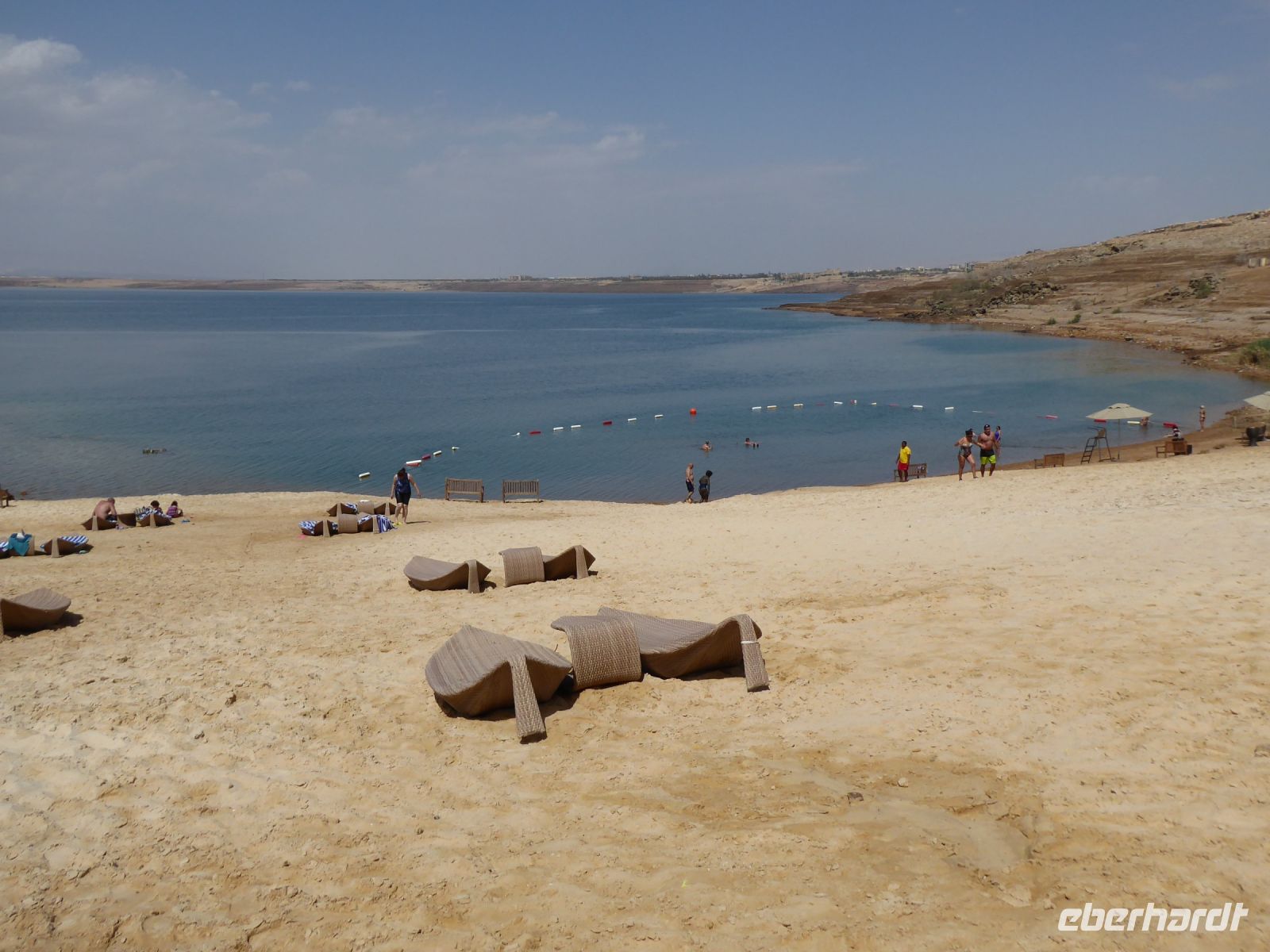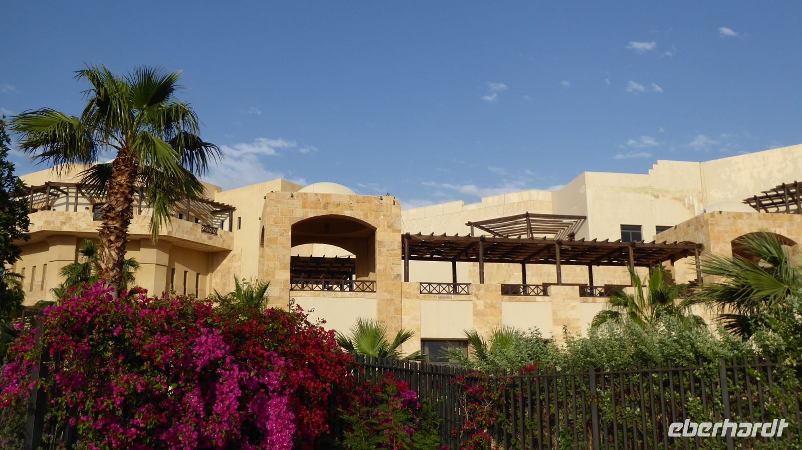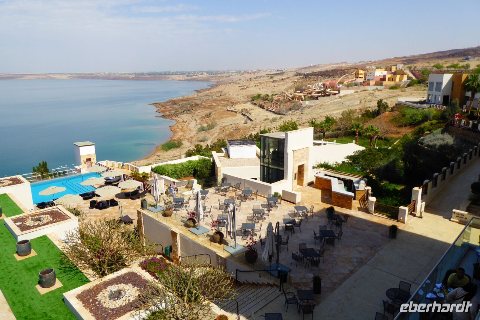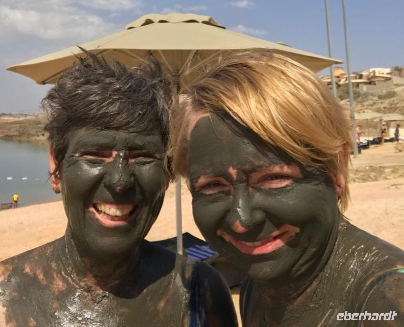 Unser heutiger Tag am Ende unserer Rundreise durch Jordanien stand ganz im Zeichen der Entspannung. In der wunderschönen Hotelanlage des Hilton Hotel in Swameh blieben keine Wünsche offen. Das Wetter war herrlich und die blumengeschmückte Anlage bot Vielfältiges für jeden Geschmack. Ob Whirlpool, 17° frischer Sommer Pool oder eine Massage im Wellnessbereich, jeder konnte nach seiner Facon glücklich werden. Das schönste Erlebnis aber war sicher das Bad im Toten Meer. Im 30 % gesättigten Salzwasser kann man sich einfach treiben lassen und bei einem Schwätzchen vergeht die Zeit im Nu. Doch halt, eines sollte man nicht vergessen zu Erwähnen, den Spaß den wir hatten, als wir uns von Kopf bis Fuß mit dem schwarzen Schlamm aus den Tiefen des Toten Meeres eingeschmiert hatten. Als kleine schwarze Monster stiegen wir wieder ins warme Wasser des Toten Meeres um mit zarte Kinderhaut wieder heraus zu steigen. Letzte Schlammreste entfernten wir bei einer herrlichen Dusche in unseren schönen Panoramazimmern, von denen aus wir einen herrlichen Blick über das Meer auf das gegenüberliegende Ufer bis Jerusalem und Jericho hatten. In allen unseren Unterkünften, selbst in der Wüste, stand uns schier unerschöpflich Wasser zur Verfügung. Ein Luxus, den man gar nicht hoch genug schätzen kann, in einem Land, das 70 % seines Wasserverbrauchs aus fossilen Grundwasserressourcen mit geringer Neubildungsrate deckt. In den letzten fünfzig Jahren hat sich die Bevölkerung Jordaniens verzehnfacht. Heute leben gut 11 Millionen Menschen in diesem Wüstenstaat, der eine Million Flüchtlinge aus Syrien und vor Corona zusätzlich 5 Millionen Touristen im Jahr beherbergte. Eine echte Herausforderung!