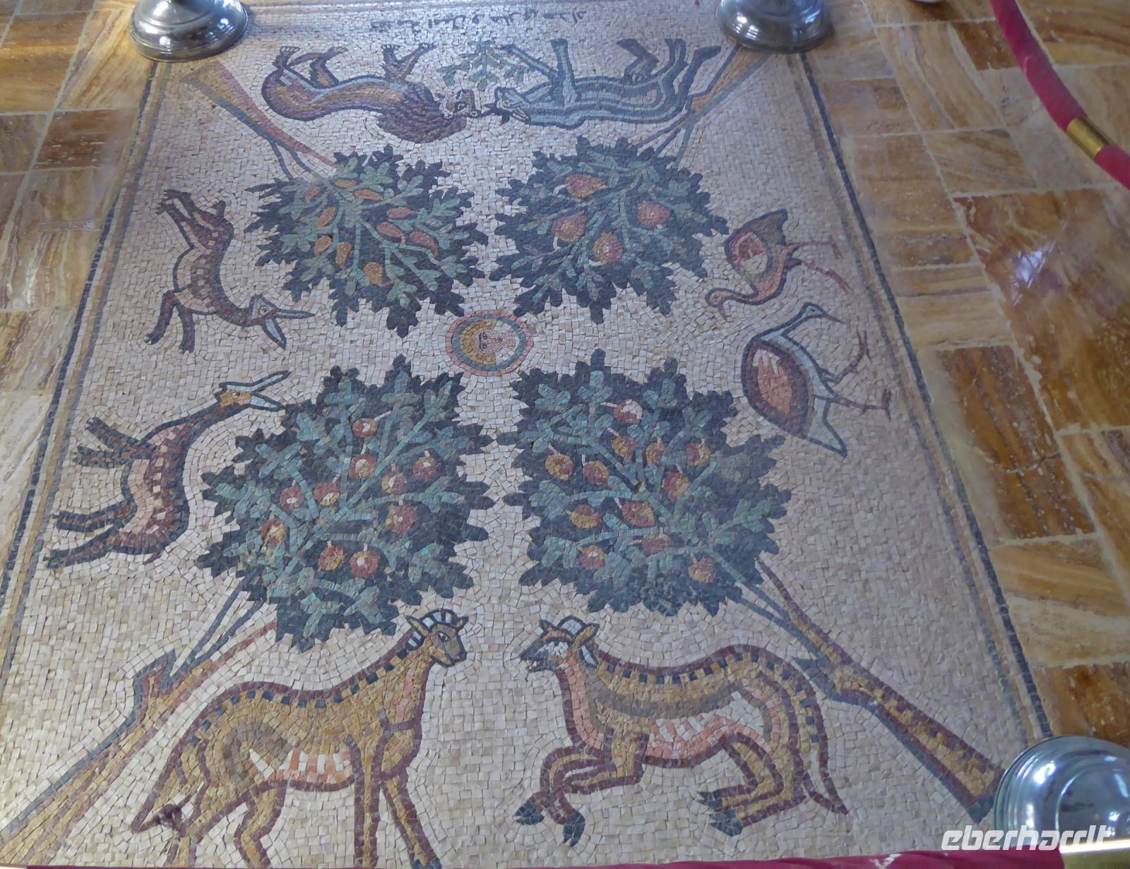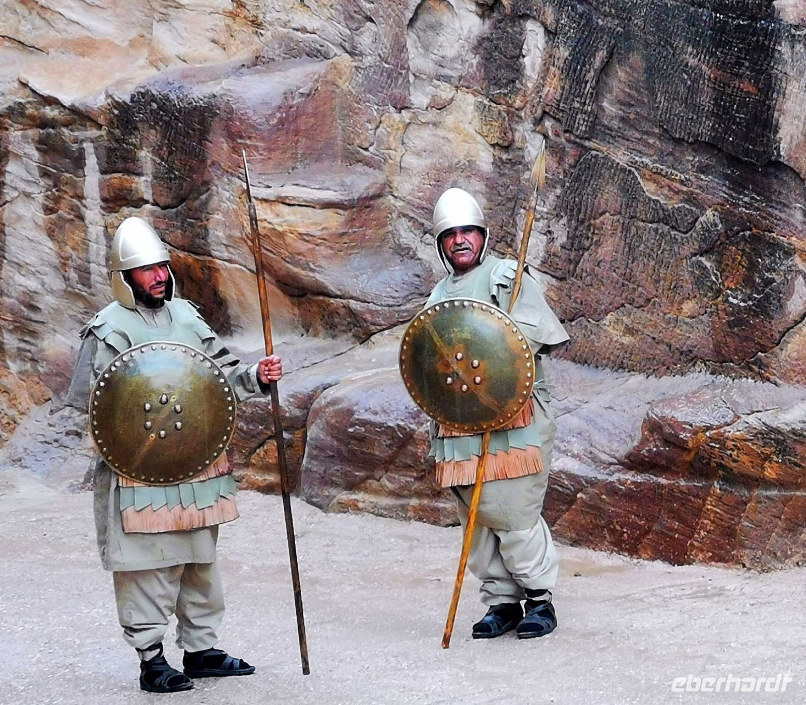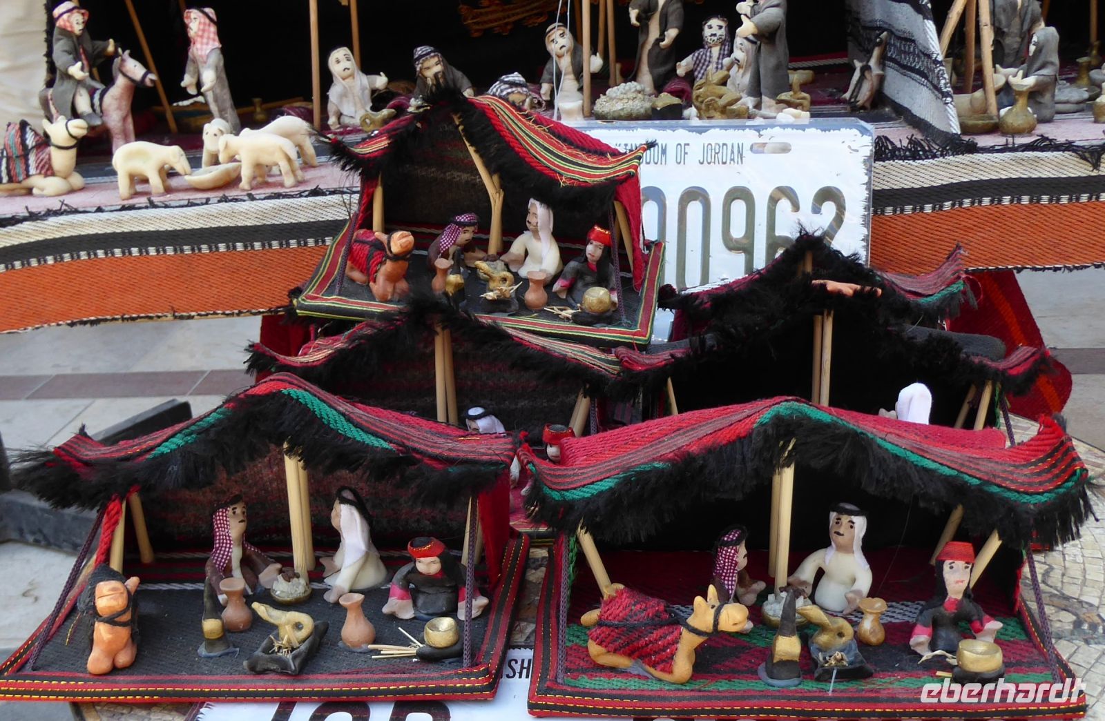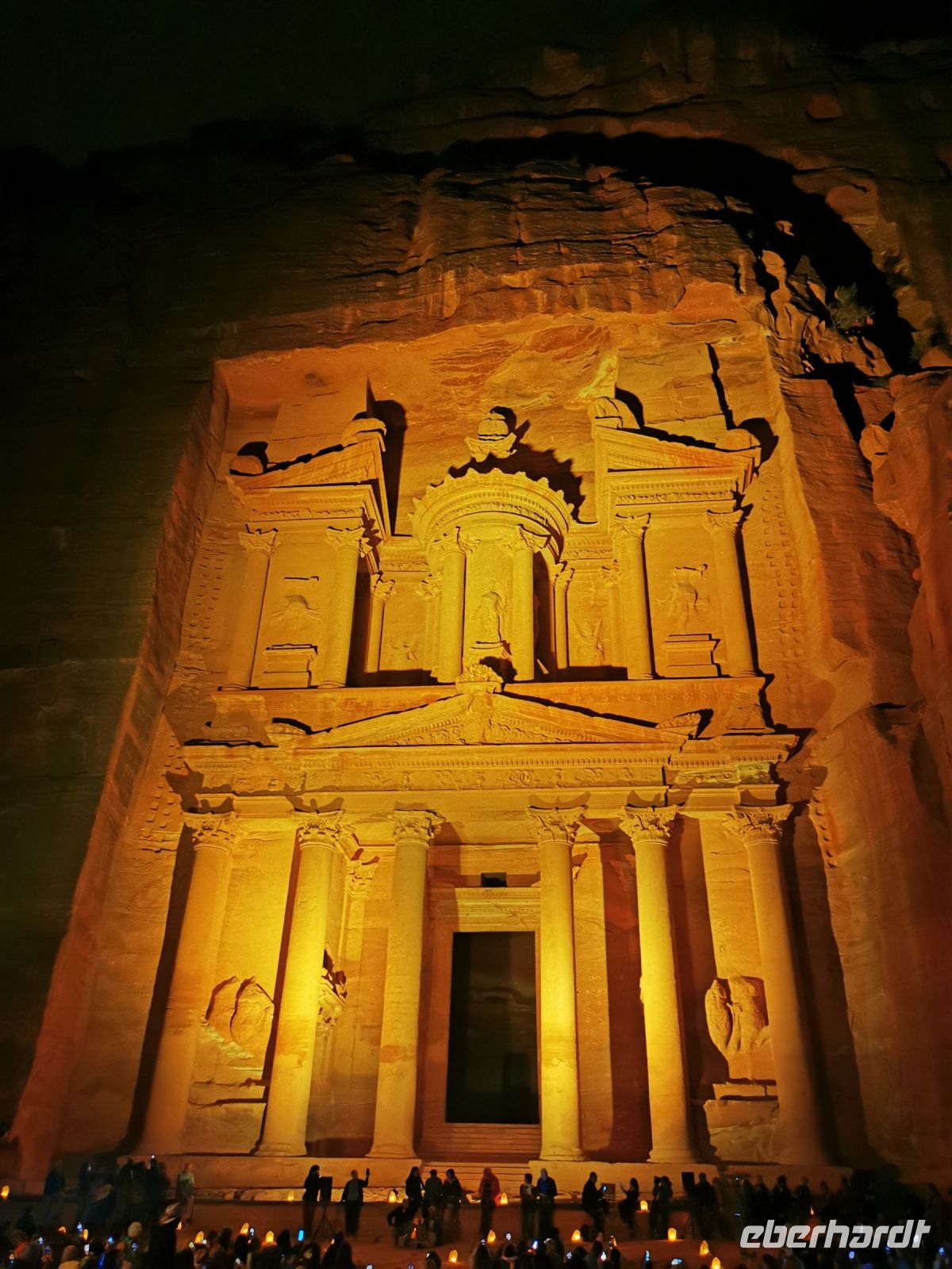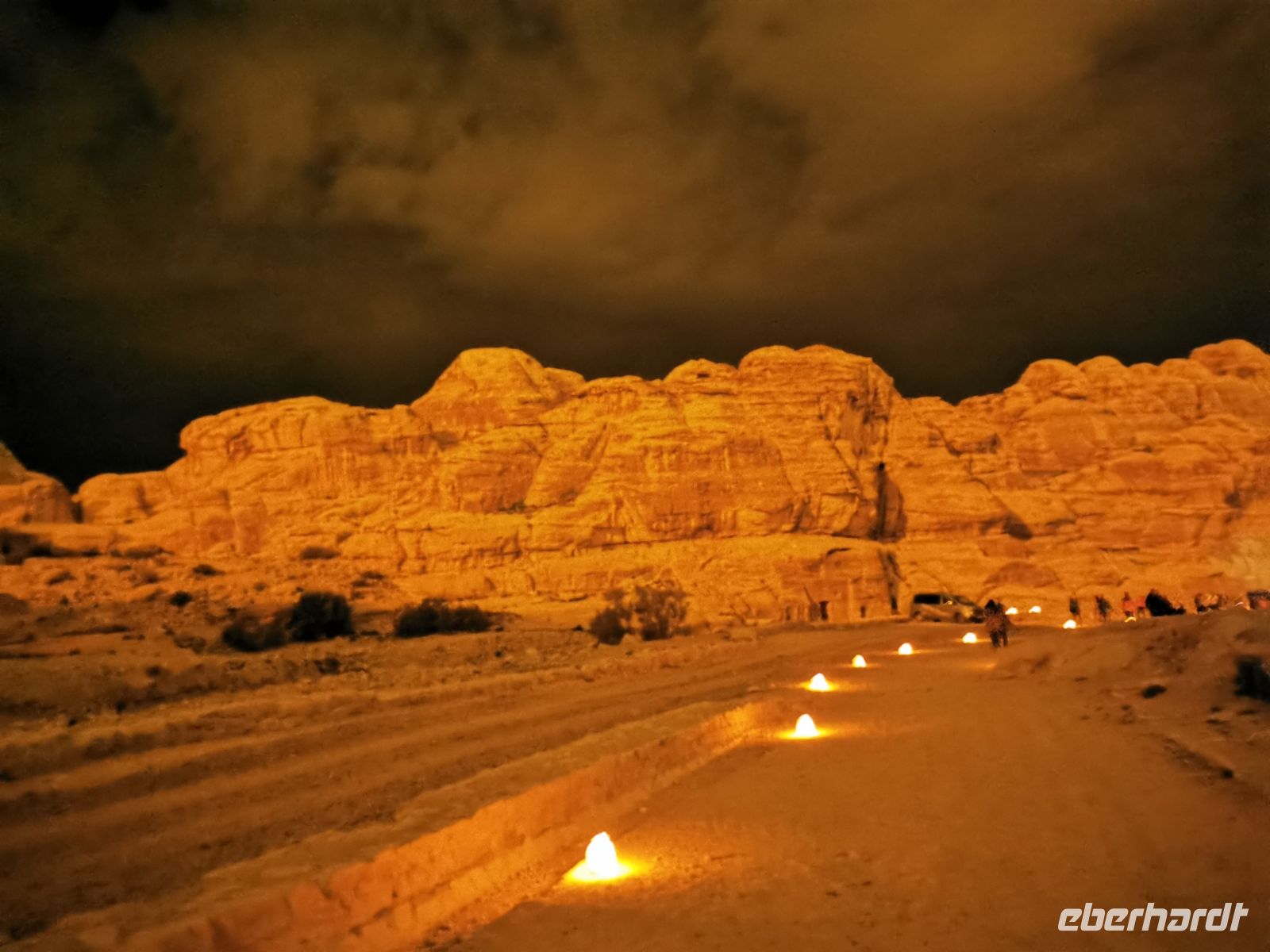 Heute hieß es Abschied nehmen von der Hauptstadt Amman, unser Weg führte uns in den Süden hinunter zum Berg Nebo. Diese Berg mit seinen 808 Höhenmeter liegt in dem Gebirge Abarim, und ist ein Ausläufer jenes Plateaus das zum Toten Meer hin abfällt. Von hier hat man eine Aussicht auf das Jordantal, das Tote Meer, nach Palästina und Israel. Nach dem fünften Buch Mose durfte Moses von hier aus das gelobte Land sehen, musste aber sterben ohne es selbst betreten zu haben. Sein Grab wurde bis heute nicht entdeckt. Für den Besuch Papst Benedikts XVI im Jahre 2009 wurde die Gesamtanlage mit der Nebo- Kirche, in deren Innerem sich die Reste einer mittelalterlichen Pilgerstätte und eine Taufkapelle befinden, den Denkmälern und dem großen Franziskanerkloster, aufgehübscht und mit Besucherwegen versehen. Der Olivenhain wird von einem aus Italien stammenden Klosterbruder liebevoll gepflegt. Gerade war er dabei einen der Olivenbäume zu schneiden. Nach einem freundlichen italienischen Wortwechsel nutzte ich die Chance, ihn zu fragen ob ich für meine Gruppe ein paar Olivenzweige bekommen könne. Beschenkt mit Ölbaumzweigen vom Berg Nebo, dezent in ein großes Halstuch gewickelt, folgte ich der Gruppe, die sich bereits unter dem berühmten Kreuz Mose zu einem informellen Gruppenfoto versammelte. Anschließend bewunderten wir noch die wunderschönen alten Mosaiken im Inneren der Nebo Kirche, bevor wir unsere Reise Richtung Madaba, dem Zentrum der Mosaikherstellung, fortsetzten. Madaba ist eine hübsche Stadt mit 70.000 Einwohnern, die sich in ihrem Zentrum ihren alten fast dörflichen Charme bewahrt hat. Unser erster Weg führte uns vorbei an vielen kleinen Verkaufsläden mit verlockenden Angebot zur Sankt Georgs-Kirche, einer griechisch-orthodoxen Kirche, in der sich das berühmte spätantike Mosaik mit der ältesten original erhaltenen kartographischen Darstellung des Heiligen Landes befindet. Ehrfürchtig betrachteten wir die Reste dieser ursprünglich 21 m × 7 m großen, repräsentativen, detailreichen topographischen Karte. Zum Mittagessen waren wir in einem kleinen Restaurant eingeladen, wo wir wieder mit leckeren arabischen Köstlichkeiten verwöhnt wurden. Lange Zeit blieb uns nicht zu verweilen, wollten wir doch noch die Kreuzritterburg Kerak besichtigen. Wir entschieden uns, die Fahrt über eine Nebenstraße fortzusetzen, die uns durch die geologisch interessante und beeindruckende Schlucht des Wadi Mujib führte. Trotz aller Kargheit sieht man überall Beduinenzelte und Herden hochbeiniger Ziegen oder Schafe. Reichlich zwei Stunden später erreichten wir die strategisch günstig gelegene Kreuzritterburg von Kerak, die auf einem 1000 m hohen Felsvorsprung thront. Das Bollwerk aus der Mitte des zwölften Jahrhunderts diente den Kreuzrittern als Schutz ihres Einflussgebietes und war der Ausgangspunkt für die unbarmherzigen und grausamen Feldzüge des Fürsten Rainald von Châtillon. Nach dessen Ermordung in Hattin fiel die Festung in die Hände von Saladin. Unterwegs sahen wir in allen Orten die spitzigen Türme der Minarette, Funkmasten und die neue Sirenen in den Himmel ragen, blühende Bäume, gepflegte Anwesen neben Bauruinen und Beduinenlager. Am frühen Abend erreichten wir schließlich unser Etappenziel Petra in Wadi Musa, wo wir im Hotel Petra Moon die nächsten beiden Nächte zu Gast waren. Nach einem wundervollen, aber schnellen Abendessen vom Buffet marschierten wir los Richtung Tal zum Eingang in die Felsenstadt. Der im Dunkeln liegende Zuweg war mit Lichtern romantisch illuminiert und vor dem Schatzhaus lag ein ganzer Teppich flackernder Kerzen. Tausende Zuschauer teilen mit uns die Eindrücke der Lichtshow „Petra by night“. Gewiss nicht nur für unsere drei Petras ein Erlebnis der besonderen Art! Mit einem schönen Spaziergang zurück zum Hotel endete ein langer Reisetag mit vielen Eindrücken.