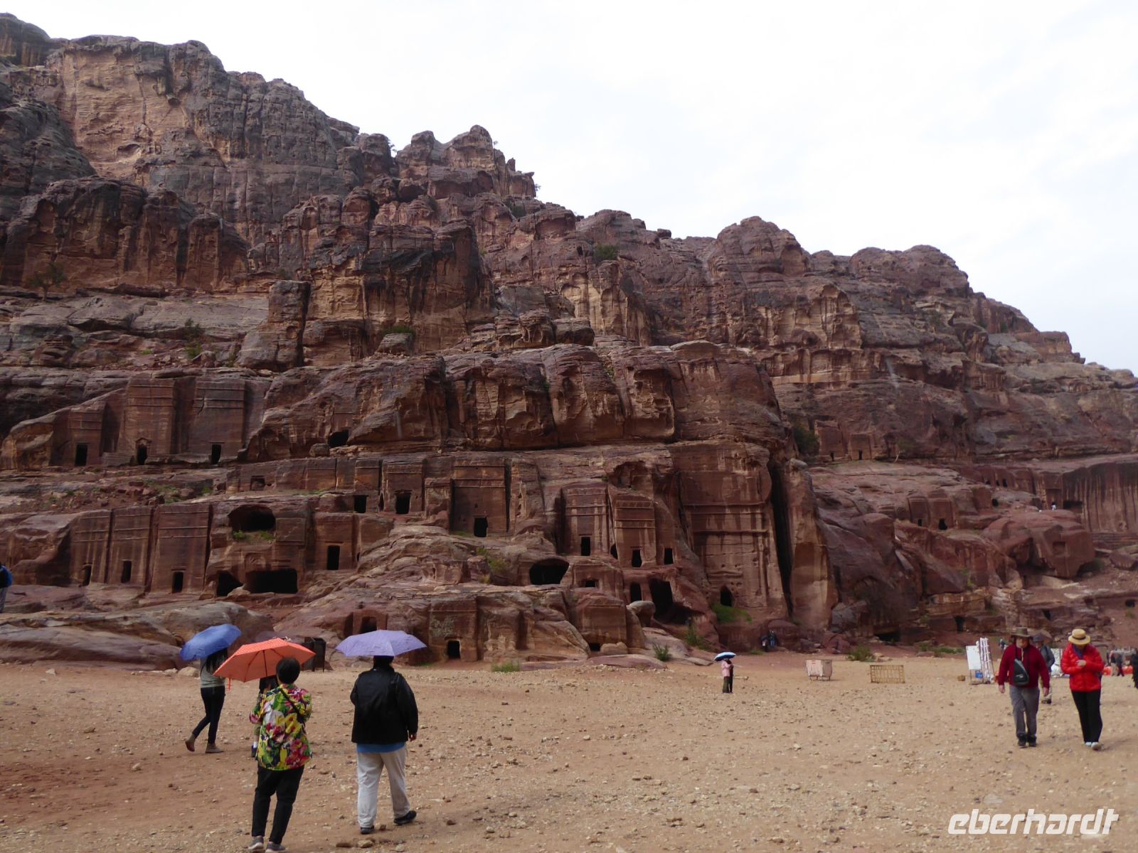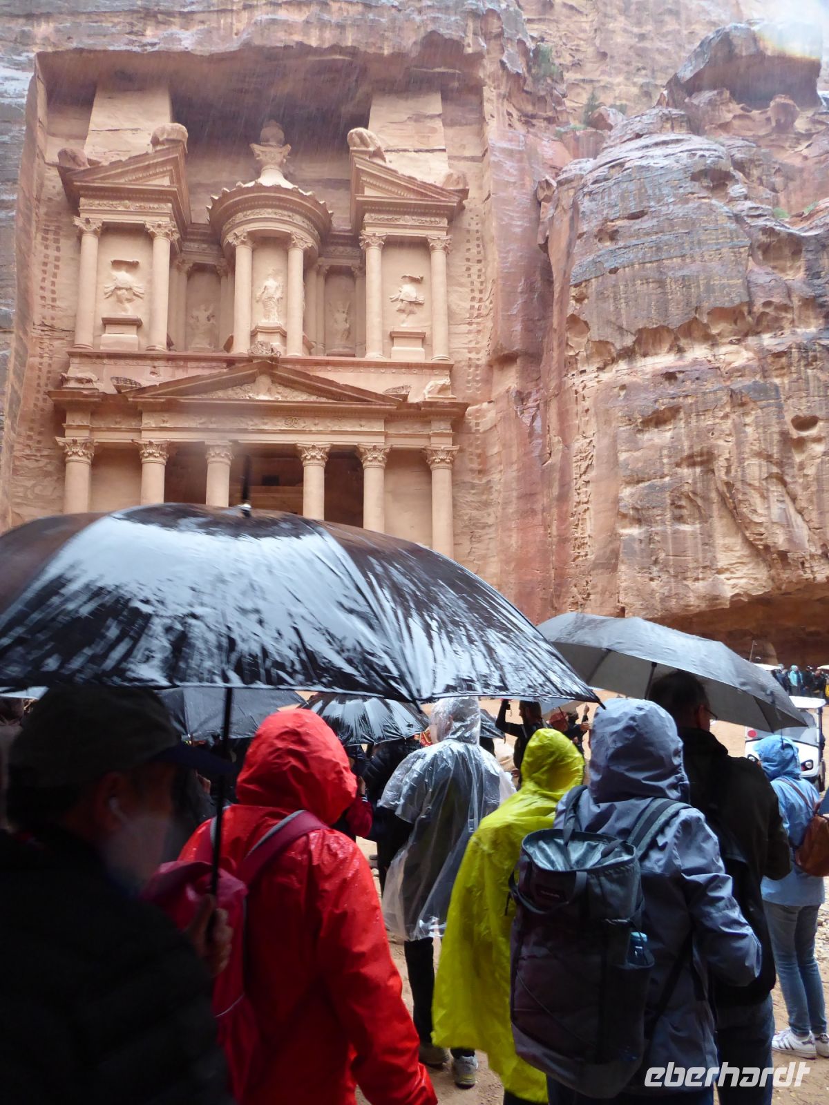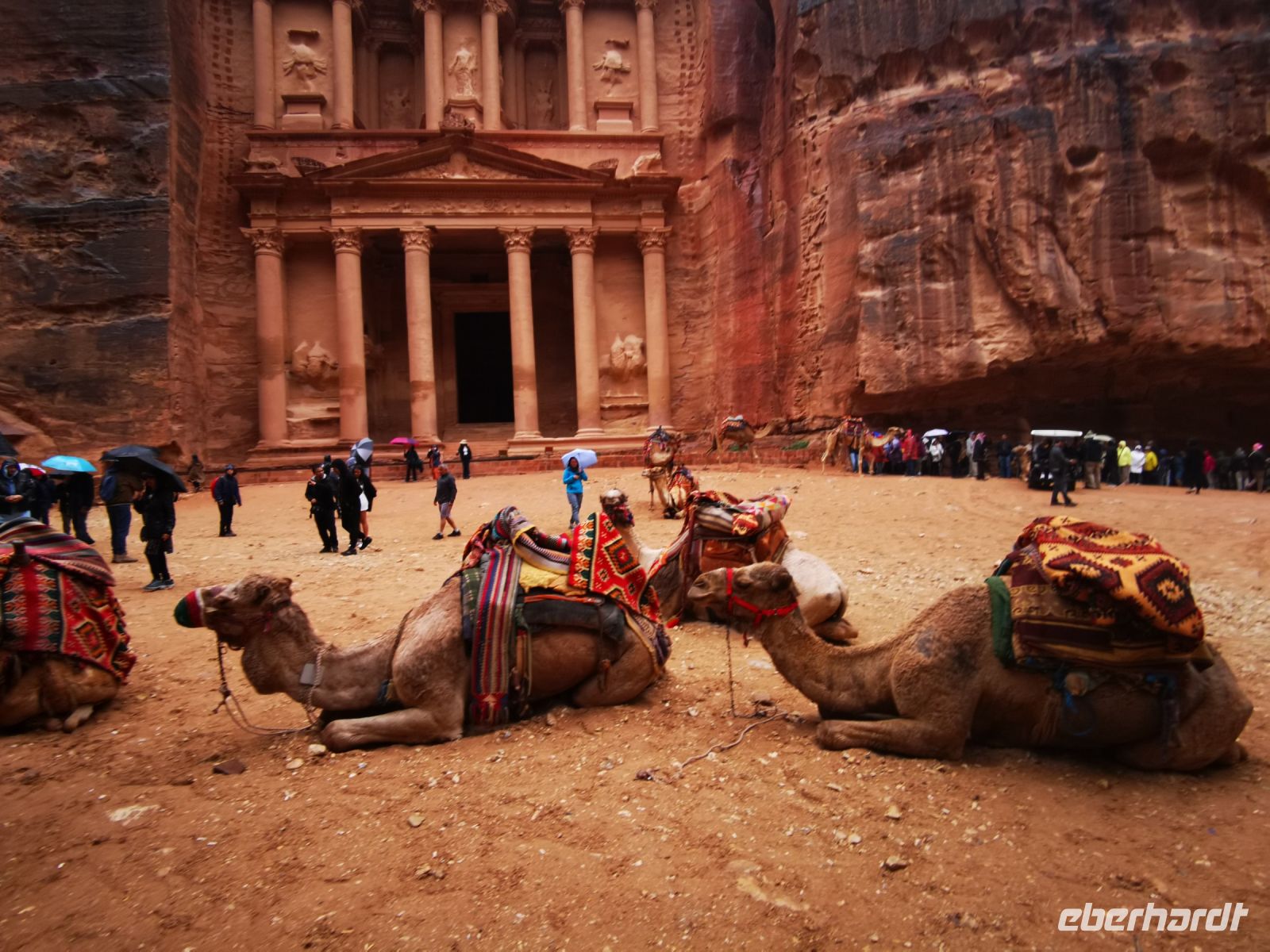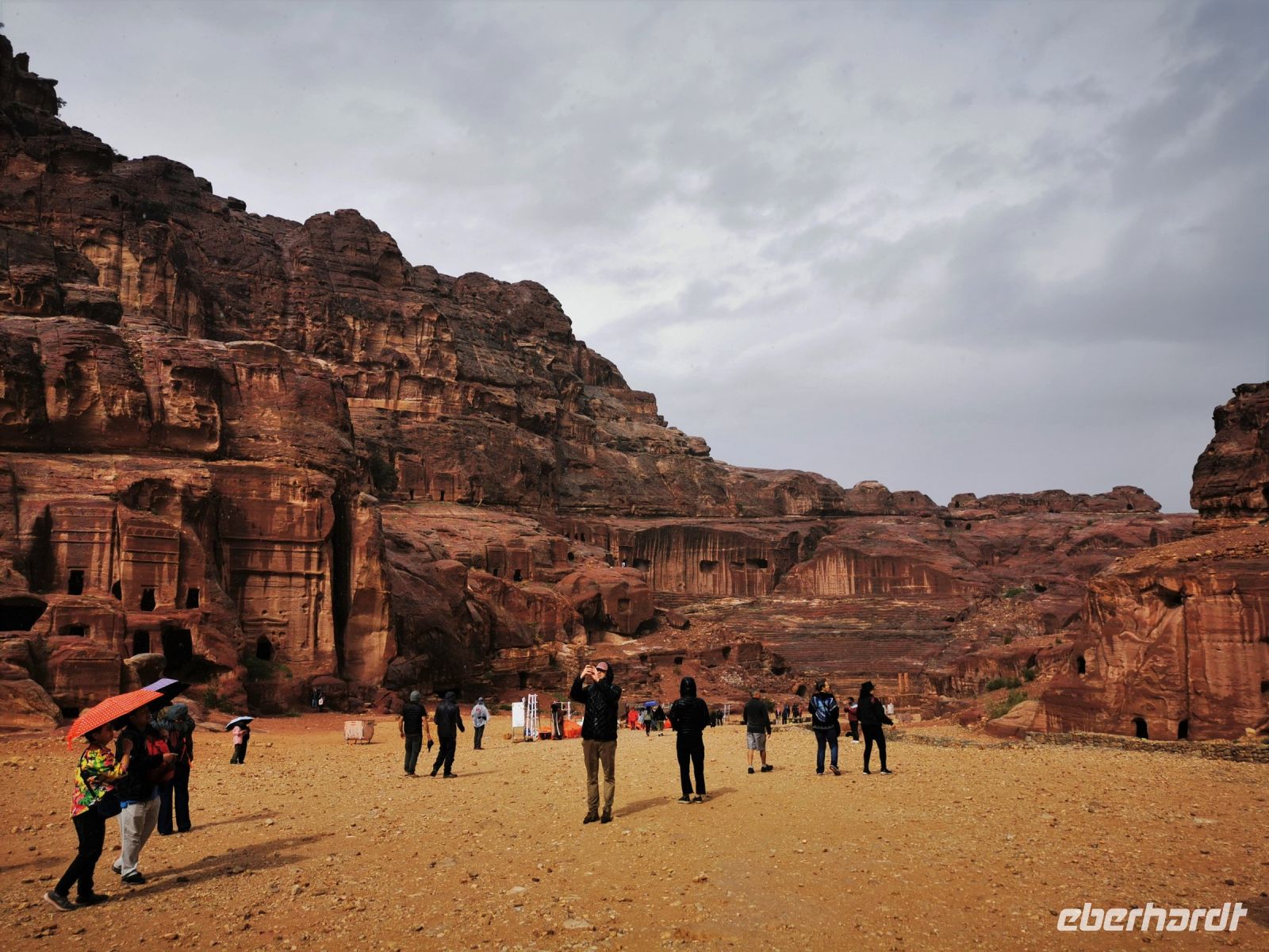 Nachdem wir uns gestern der Felsenstadt Petra romantisch emotional genähert hatten, erwartete uns heute das antike Petra. Pünktlich um 8:00 Uhr standen wir am Eingang der seit 1985 zum Weltkulturerbe erklärten Stätte. Gespannt folgten wir unserem Guide Ali, um in all die Geheimnisse der weitläufigen Anlage, die einst die Hauptstadt des Reichs der Nabatäer war, eingeweiht zu werden. Noch war uns der Wettergott hold und bei den berühmten Djinn Blöcken ließ sich gemütlich sitzen und wir erfuhren viel über die Geschichte der legendären Felsenstadt im Wüstensand, die inoffiziell als neues der sieben Weltwunder gezählt wird. Die Wiederentdeckung der Nabatäerstadt, die seit den Kreuzzügen kein Europäer mehr betreten hatte, haben wir dem Schweizer Arabienreisenden Johann Ludwig Burkhardt zu verdanken, der im neunzehnten Jahrhundert unter dem Pseudonym Scheich Ibrahim ibn Abdallah das osmanische Reich bereiste. 1812 entdeckte er eher zufällig die Ruinen von Petra. Nach dem Ersten Weltkrieg erfolgten archäologische Ausgrabungen und wenig später die touristische Erschließung der Ruinenstätte. In der Folge mussten die dort heimischen Beduinen umgesiedelt werden. Ihre Nachfahren leben heute von den zahlreichen Souvenirshops und Imbissbuden und bieten mit ihren Kamelen, Pferden, Eseln und modernen Golfcars den Touristen ihren Service an. Noch bevor wir den Eingang zum Siq, erreicht hatten, waren wir bereits komplett durchnässt. Ein frischer Wind blies durch unsere Jacken, die Temperatur sank auf 6 °C, die laut Wetter App eine gefühlte Temperatur von 2° ergaben. Der Siq, eine fast 1 km lange Schlucht, führt direkt zum sogenannten Schatzhaus, dem Khazne al-Firaun. Normalerweise darf man es nicht betreten, doch die durchnässten Besucherscharen stürmten den trockenen Raum und kamen erst nach Abklingen des starken Regens wieder nach draußen, wo nasse Kamele das berühmte Postkartenmotiv Petras mit einem Farbakzent aufhübschten. Plötzlich sah man auch überall üppiges Grün zwischen den Steinen hervor blitzen. Alles erschien wie frisch gewaschen, und als wir weiter zum römischen Theater und zur römischen Stadt gingen, schien auch schon wieder die Sonne. In einer kleinen improvisierten Imbissbude bei den Königsgräbern ließen wir uns frischen Granatapfelsaft schmecken. Der Weg zum Opferplatz war bereits gesperrt und so stiegen wir lediglich zu den Königsgräbern hinauf. Danach drängte Ali zum Rückweg, denn der Siq sollte wegen eindringender Wassermassen gesperrt werden - und tatsächlich wurde Petra ab 14:00 Uhr evakuiert. Durch die Umsicht unseres Guides konnten wir das Gelände noch selber verlassen und strebten unserem Hotel, Petra Moon, zu. Dort hieß es zuerst einmal die nassen Kleider zu trocknen und nach einer heißen Dusche waren die Wetterkapriolen schnell wieder vergessen. Der weitere Tag stand zur freien Verfügung und erst am Abend traf die Gruppe im Hotel wieder zusammen.