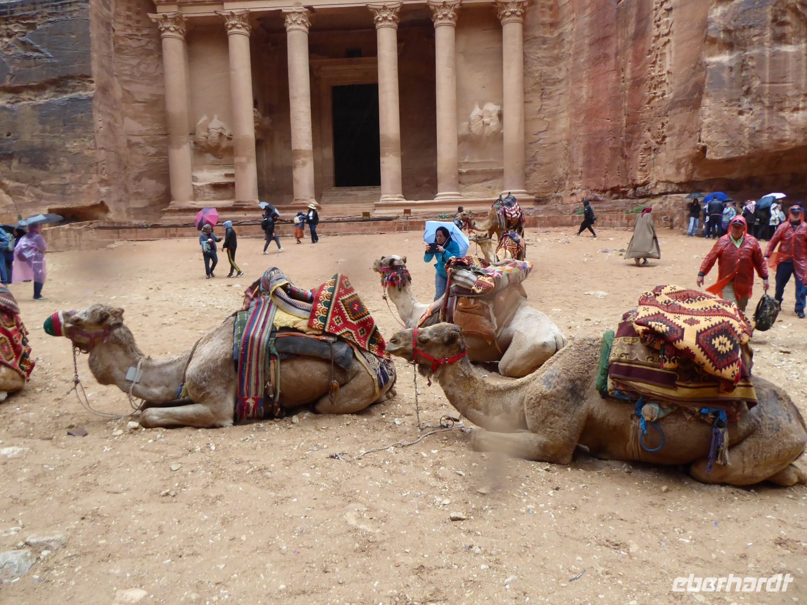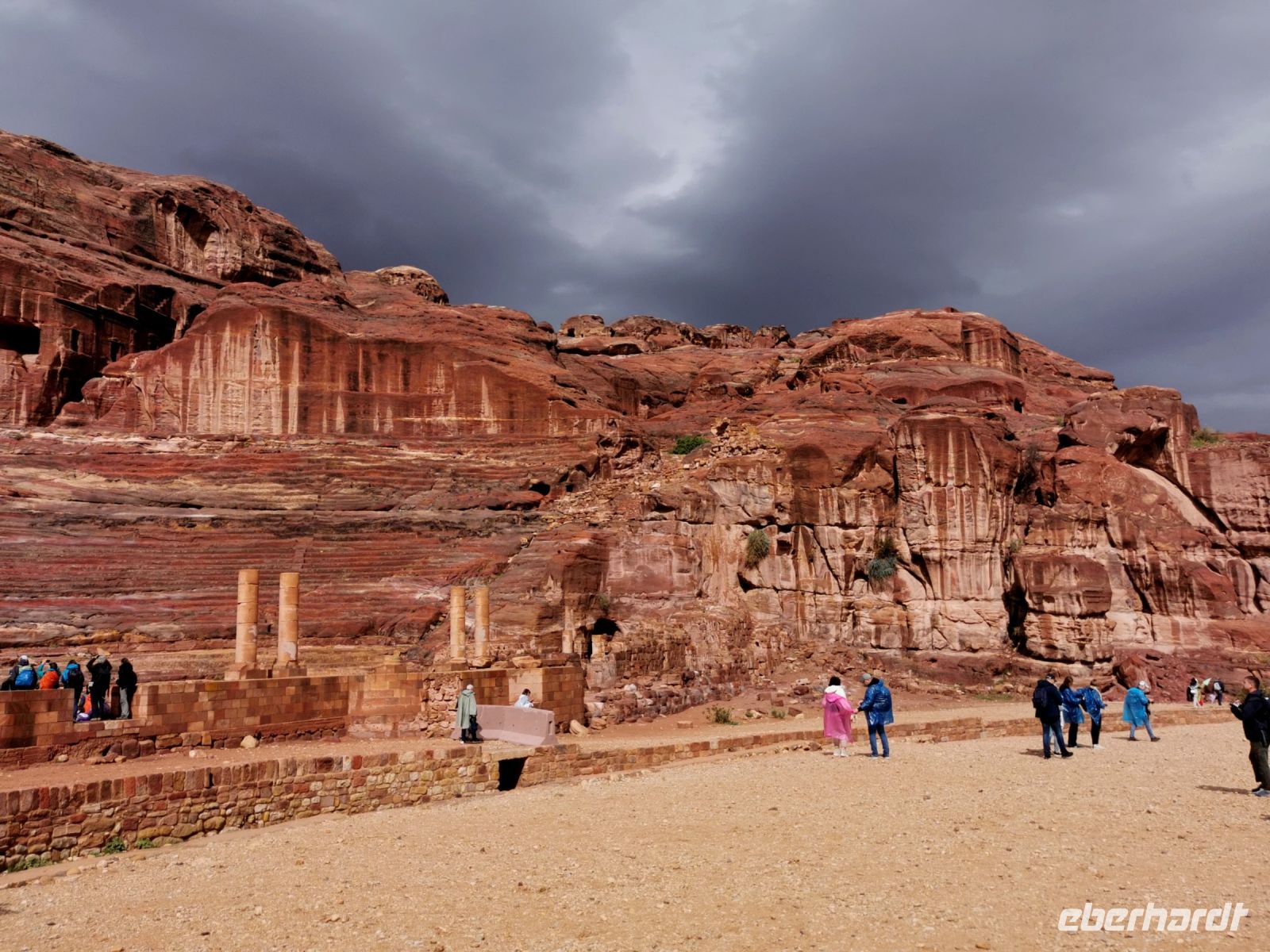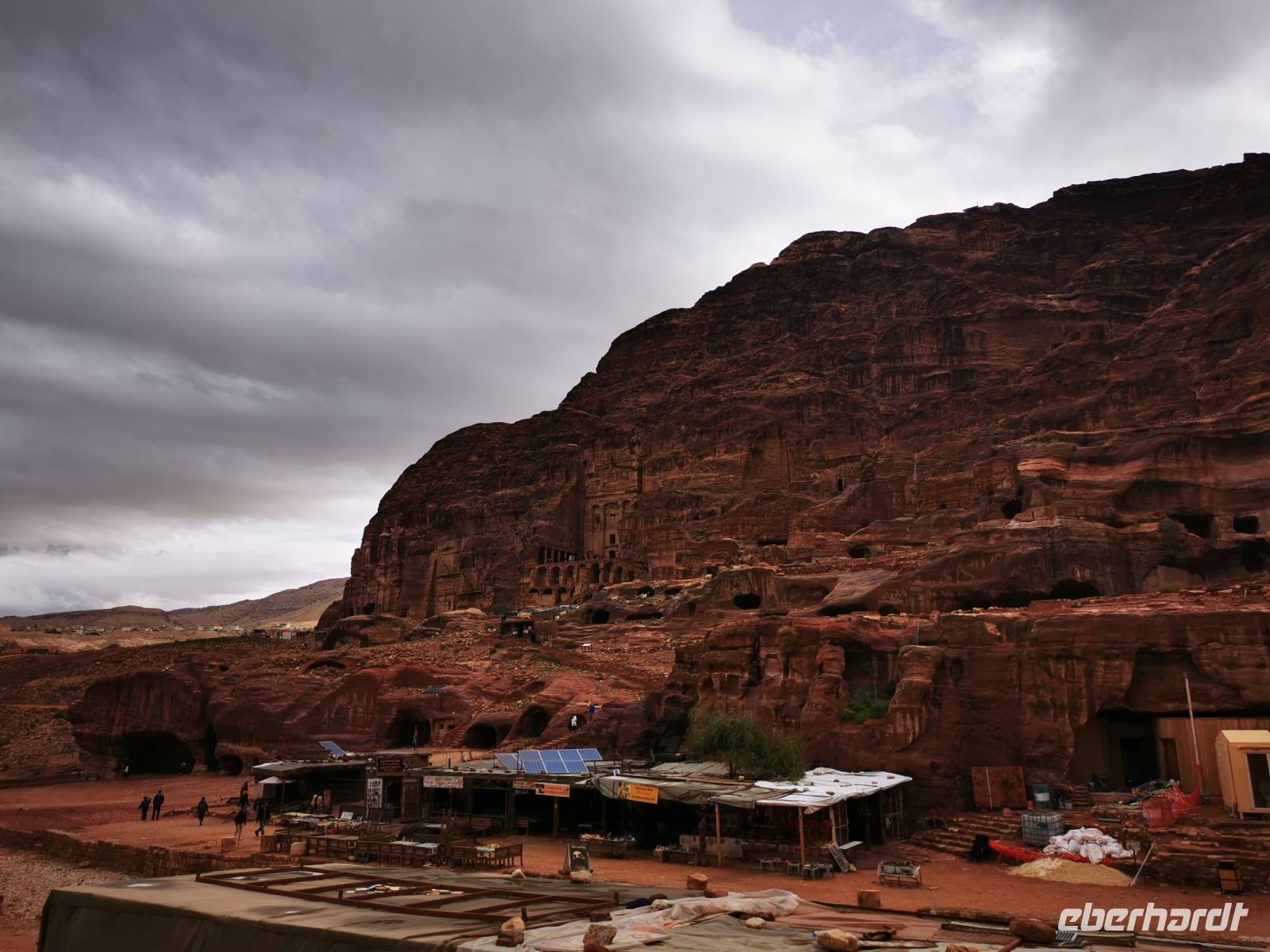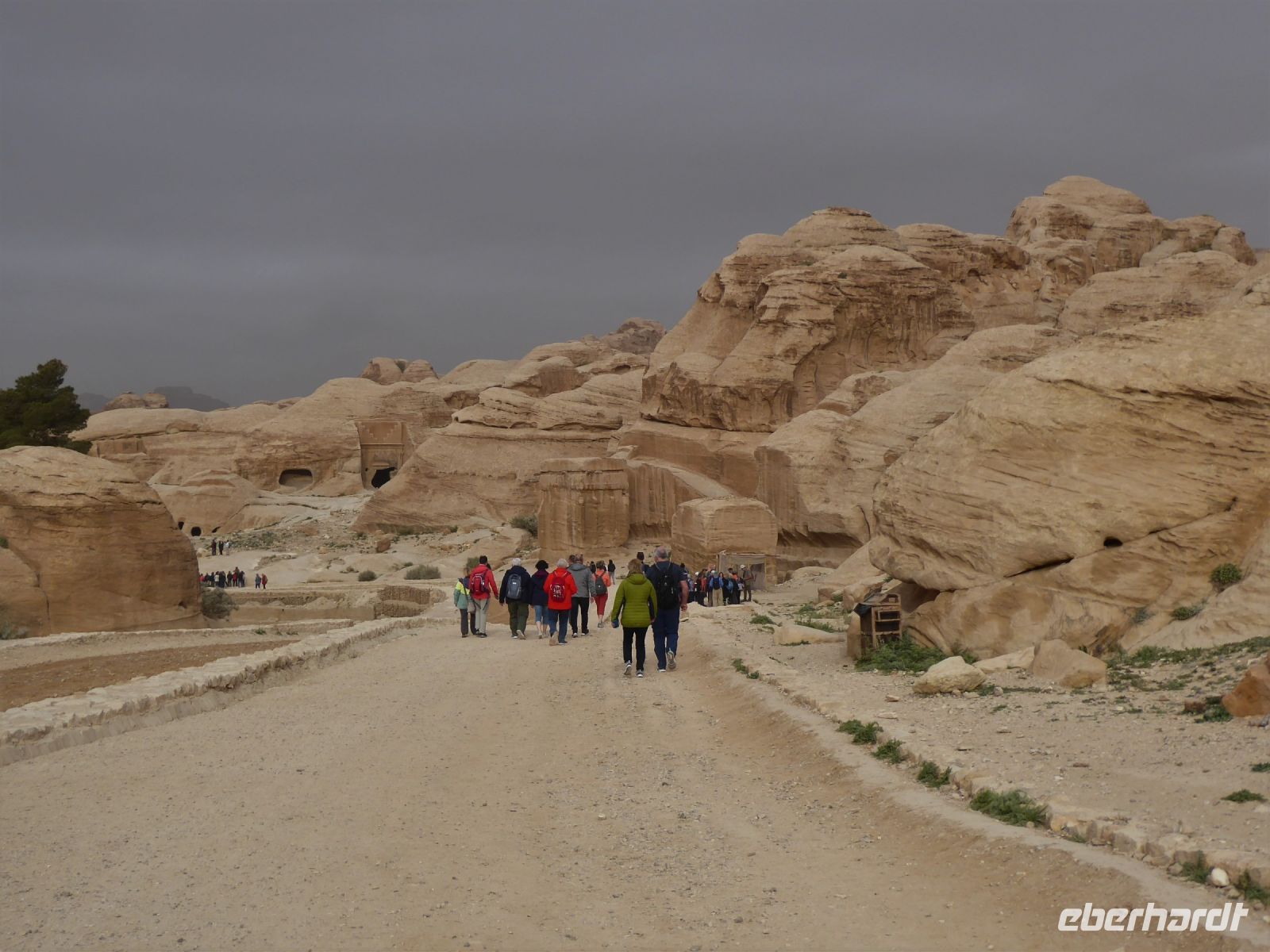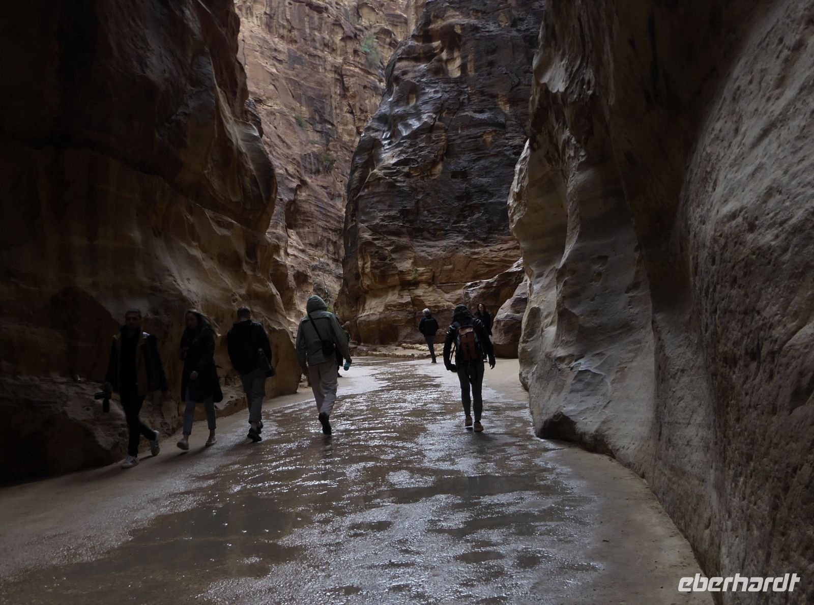 Nachdem wir uns gestern der Felsenstadt Petra romantisch emotional genähert hatten, erwartete uns heute das antike Petra. Pünktlich um 8:00 Uhr standen wir am Eingang der seit 1985 zum Weltkulturerbe erklärten Stätte. Gespannt folgten wir unserem Guide Ali, um in all die Geheimnisse der weitläufigen Anlage, die einst die Hauptstadt des Reichs der Nabatäer war, eingeweiht zu werden. Noch war uns der Wettergott hold und bei den berühmten Djinn Blöcken ließ sich gemütlich sitzen und wir erfuhren viel über die Geschichte der legendären Felsenstadt im Wüstensand, die inoffiziell als neues der sieben Weltwunder gezählt wird. Die Wiederentdeckung der Nabatäerstadt, die seit den Kreuzzügen kein Europäer mehr betreten hatte, haben wir dem Schweizer Arabienreisenden Johann Ludwig Burkhardt zu verdanken, der im neunzehnten Jahrhundert unter dem Pseudonym Scheich Ibrahim ibn Abdallah das osmanische Reich bereiste. 1812 entdeckte er eher zufällig die Ruinen von Petra. Nach dem Ersten Weltkrieg erfolgten archäologische Ausgrabungen und wenig später die touristische Erschließung der Ruinenstätte. In der Folge mussten die dort heimischen Beduinen umgesiedelt werden. Ihre Nachfahren leben heute von den zahlreichen Souvenirshops und Imbissbuden und bieten mit ihren Kamelen, Pferden, Eseln und modernen Golfcars den Touristen ihren Service an. Noch bevor wir den Eingang zum Siq, erreicht hatten, waren wir bereits komplett durchnässt. Ein frischer Wind blies durch unsere Jacken, die Temperatur sank auf 6 °C, die laut Wetter App eine gefühlte Temperatur von 2° ergaben. Der Siq, eine fast 1 km lange Schlucht, führt direkt zum sogenannten Schatzhaus, dem Khazne al-Firaun. Normalerweise darf man es nicht betreten, doch die durchnässten Besucherscharen stürmten den trockenen Raum und kamen erst nach Abklingen des starken Regens wieder nach draußen, wo nasse Kamele das berühmte Postkartenmotiv Petras mit einem Farbakzent aufhübschten. Plötzlich sah man auch überall üppiges Grün zwischen den Steinen hervor blitzen. Alles erschien wie frisch gewaschen, und als wir weiter zum römischen Theater und zur römischen Stadt gingen, schien auch schon wieder die Sonne. In einer kleinen improvisierten Imbissbude bei den Königsgräbern ließen wir uns frischen Granatapfelsaft schmecken. Der Weg zum Opferplatz war bereits gesperrt und so stiegen wir lediglich zu den Königsgräbern hinauf. Danach drängte Ali zum Rückweg, denn der Siq sollte wegen eindringender Wassermassen gesperrt werden - und tatsächlich wurde Petra ab 14:00 Uhr evakuiert. Durch die Umsicht unseres Guides konnten wir das Gelände noch selber verlassen und strebten unserem Hotel, Petra Moon, zu. Dort hieß es zuerst einmal die nassen Kleider zu trocknen und nach einer heißen Dusche waren die Wetterkapriolen schnell wieder vergessen. Der weitere Tag stand zur freien Verfügung und erst am Abend traf die Gruppe im Hotel wieder zusammen.