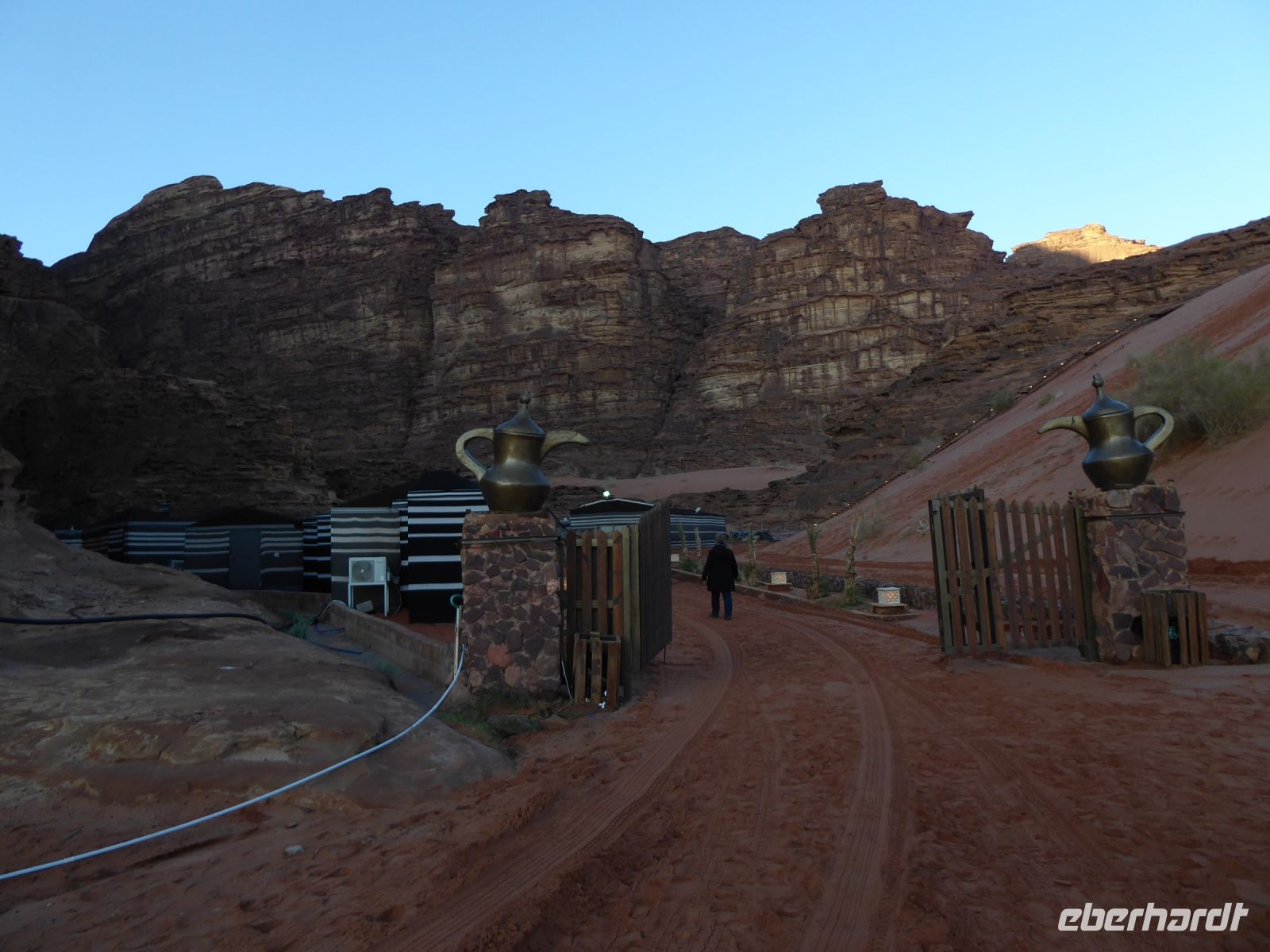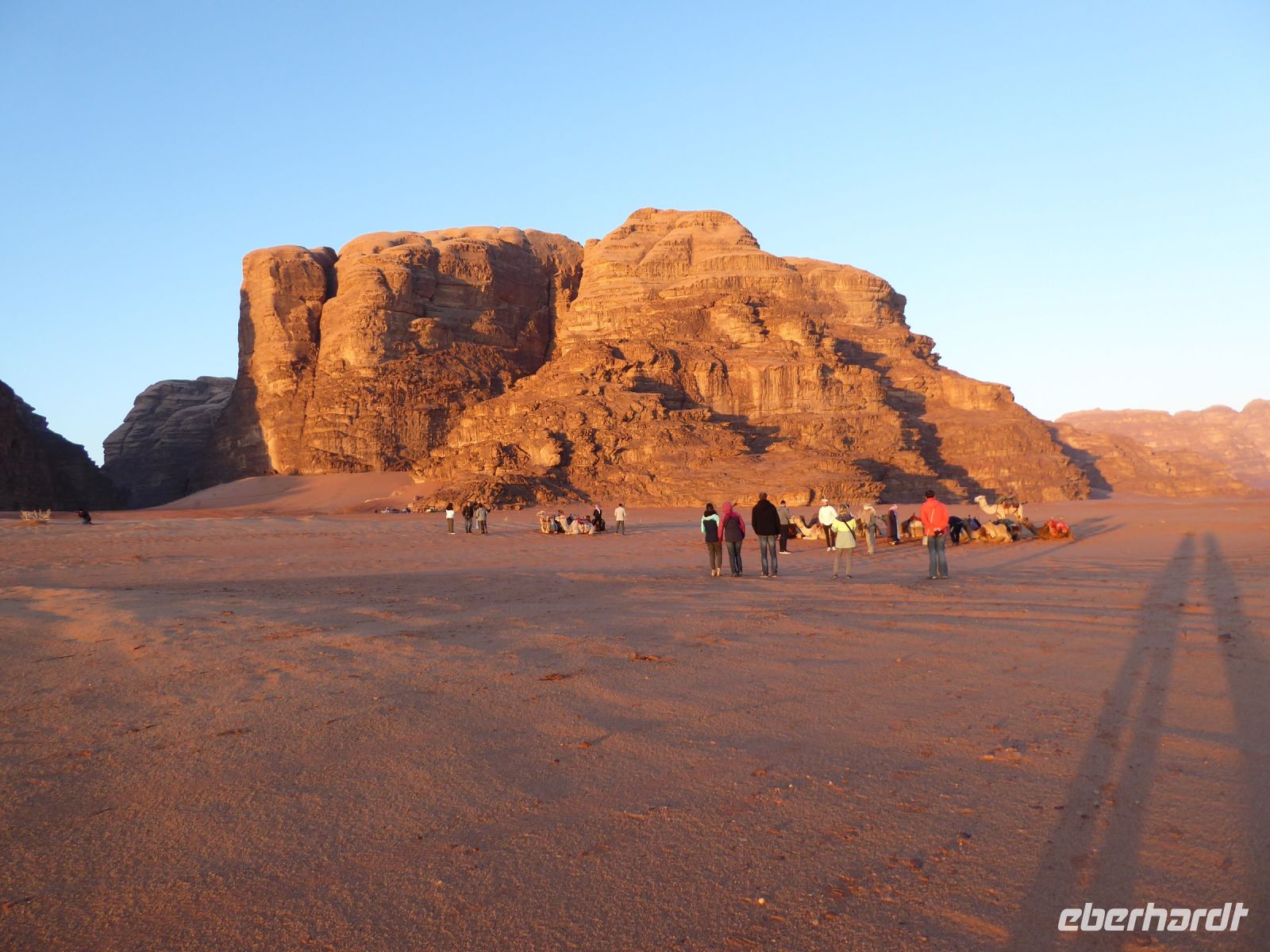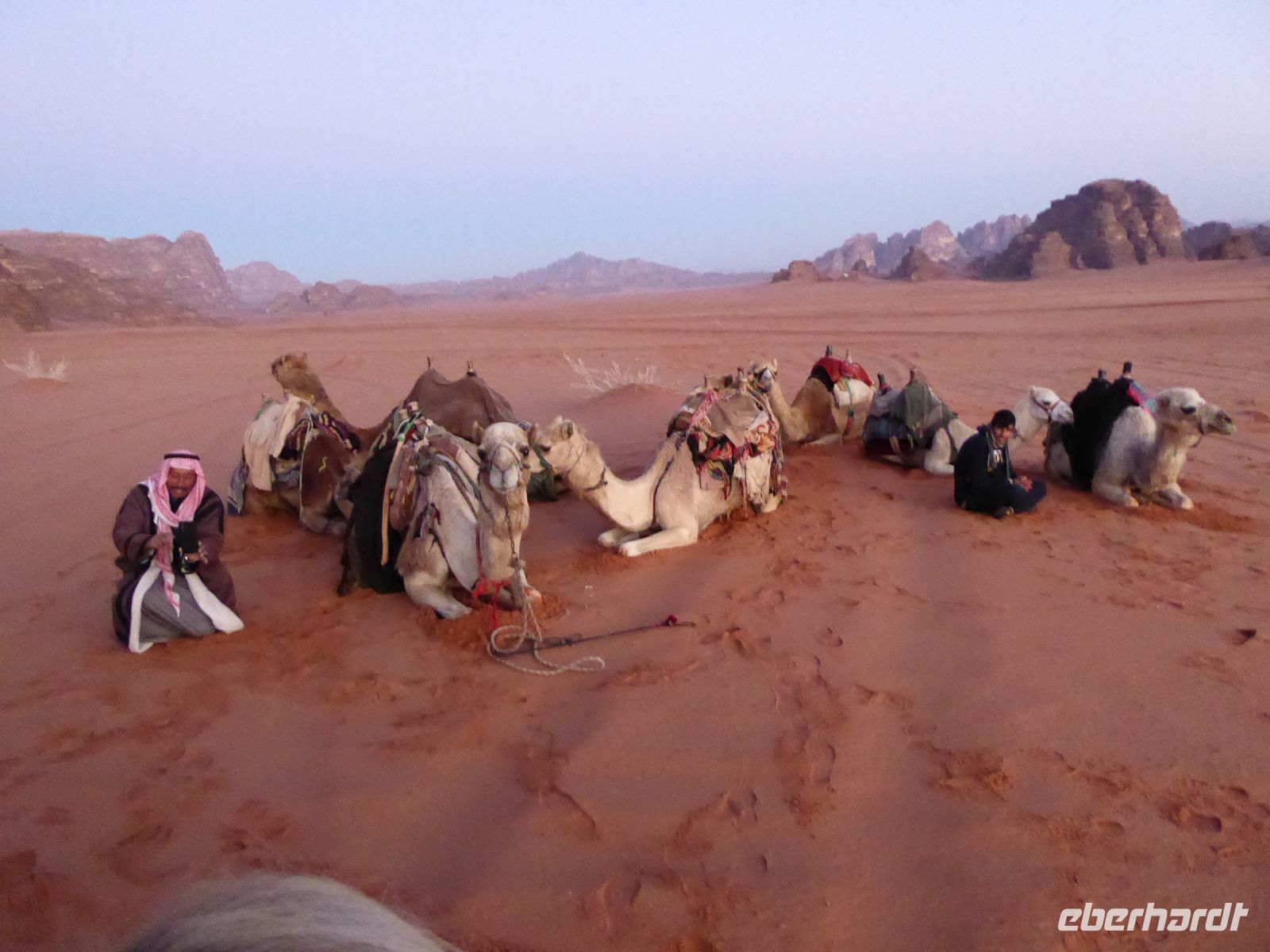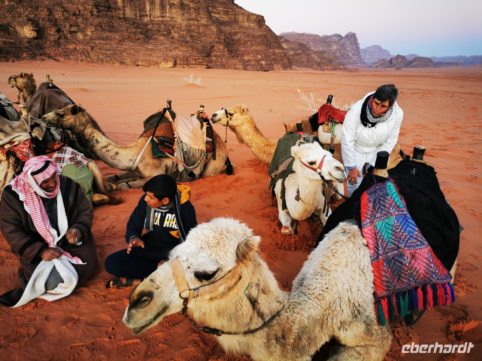 Für den heutigen Tag war sogar Schnee angekündigt und so wollten wir die Besichtigung von Petra kürzer halten. Das Wetter hatte jedoch ein Einsehen, und so konnte, wer wollte, heute zusammen mit Ali noch einmal Petra ganz intensiv erleben. Der Weg führte bis zur byzantinischen Kirche und zum Kloster Ed-Deir. Das schlechte Wetter hatte durchaus auch seine guten Seiten, es waren weniger Besucher in der Felsenstadt. Mit weniger Rummel gewann Petra viel von seinem ursprünglichen Charakter zurück. Ein Teil der Gruppe, der heute nicht mehr in die Felsenstadt hinein wollte, schloss sich am späten Vormittag der Reisebegleitung zu einem Spaziergang über das Hochplateau an. Gestern sahen wir in Petra bizarre Muster im Sandstein, der durch Eisen- und Manganoxide intensiv rot und schwarz eingefärbt ist, und heute kletterten wir durch die oberen, durch Erosion tief zerklüfteten, hellen Sandsteinschichten. Der jordanische Architekt und Künstler Ammar Khammash schrieb dazu: „Petra ist ein wundervoller Ort, an dem Geologie und Archäologie auf schöne Weise koexistieren. Um die Monumente Petras besser zu begreifen sollte man der Geologie des Ortes mehr Aufmerksamkeit widmen und sich bemühen, die Eigenschaften der Steine zu verstehen […]“ Hier sahen wir Wohnhöhlen aus unbestimmten Zeiten und wie aus dem Nichts standen plötzlich ein paar junge Beduinen vor uns, die, so schnell wie sie erschienen waren, auch wieder verschwanden. Kein offizieller Weg führte durch diese bizarre Landschaft, und doch kamen wir erstaunlich schnell voran. Unser Ziel waren die Ruinen der Kreuzfahrerburg Al Wu´eira, die wir genau zur Mittagsstunde erreichten. Die Festung war ein Außenposten der 25 km nördlich gelegenen Kreuzfahrerfestung Montréal in Shobak. Von fern erschallte der Ruf des Muezzin, der die Gläubigen zum Mittagsgebet rief. Nur wenige Meter vom touristischen Zentrum Petras entfernt, war man ganz allein und fühlte sich in archaische Zeiten zurückversetzt. Zwischen den Steinblöcken entdeckten wir blühende Pflanzen - der Regen hatte sie sichtbar gemacht - die Wüste lebt! Und auch die unvermeidlichen Spuren der Zivilisation, Plastikmüll in allen Variationen, verlassene Feuerstellen und Glasscherben zeigen, dass sich hier in dieser unwirtlichen Gegend, zumindest temporär, Menschen aufhalten. Nach unserem Spaziergang blieb noch genügend Zeit, das sehr interessante archäologische Museum in Petra zu besuchen, einen kleinen Einkaufsbummel zu machen und sogar für einen kleinen Mittagsimbiss reichte die Zeit, bevor uns am frühen Nachmittag unser Bus am Hotel abholte. Die Koffer waren bereits verstaut und so fuhren wir direkt weiter zum nächsten Punkt unserer Reise: die heutige Nacht wollten wir in einem Wüstencamp im Wadi Rum verbringen. Bevor wir die Region verließen, machten wir noch einen kurzen Fotostopp und warfen von oben einen Blick auf die berühmte Stadt Petra und die umliegenden Berge. Kurz vor Sonnenuntergang erreichten wir dann das Wadi Rum. Es gehört zum sogenannten Rift Valley, das, wie auch der Jordangraben, der Golf von Aqaba und das Rote Meer vor ca. 30 Mio Jahren gebildet wurde. Der rote Sandstein, der über Jahrhunderte zu bizarren Formen geschliffen wurde liegt auf einem Sockel aus Granit. Wie Felszeichnungen belegen, wurde das Gebiet bereits in der Steinzeit besiedelt. Die höchste Erhebung ist der Djebel Umm ad-Dami mit einer Höhe von 1832 m. Von dort ist es nicht mehr weit bis an die Grenze nach Saudi-Arabien. Unser Camp, das Rahayes Desert Camp, liegt im Norden des Wadi Rum. Schnell bezogen wir unsere Zelte, die allen in der Wüste benötigten Komfort boten: Licht, eine Toilette mit Wasserspülung, eine Dusche, Steckdosen, WLAN, eine Klimaanlage, die den Raum wohlig erwärmt hat, erstaunlich bequeme Betten und eine Tür zum Abschließen! Zum gemeinsamen Abendessen, mit leckeren Salaten vom Buffet, gebratenen Hühnern und Lammfleisch direkt aus dem Ofen, trafen wir uns alle in einem riesigen Zelt mit bequemen Sofas. Über uns der Sternenhimmel und eine sonderbare Stille. Doch der Abend war kurz und schnell strebten wir zu unseren Betten, wollten wir doch bei einem Kamelritt am frühen Morgen den Sonnenaufgang genießen.