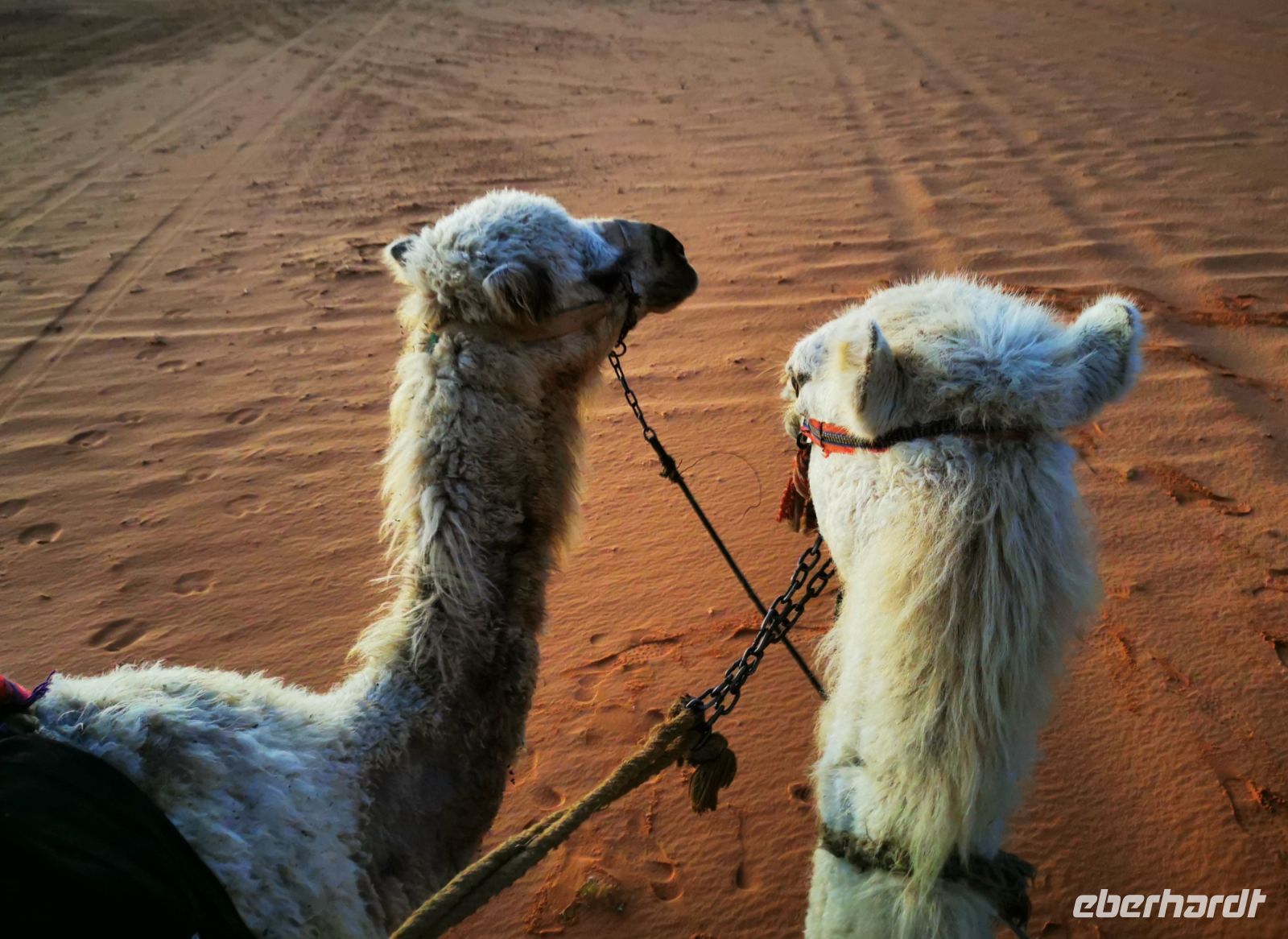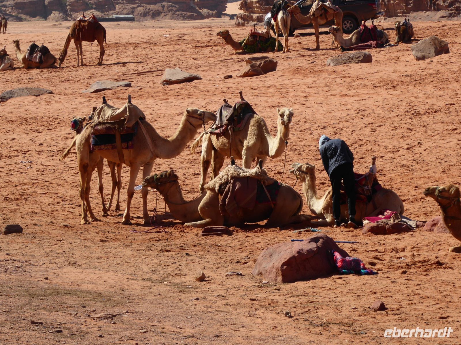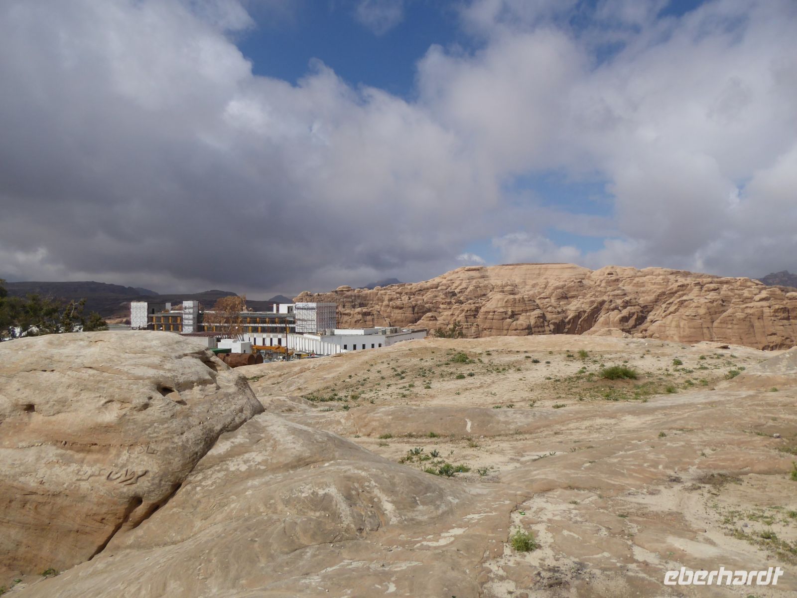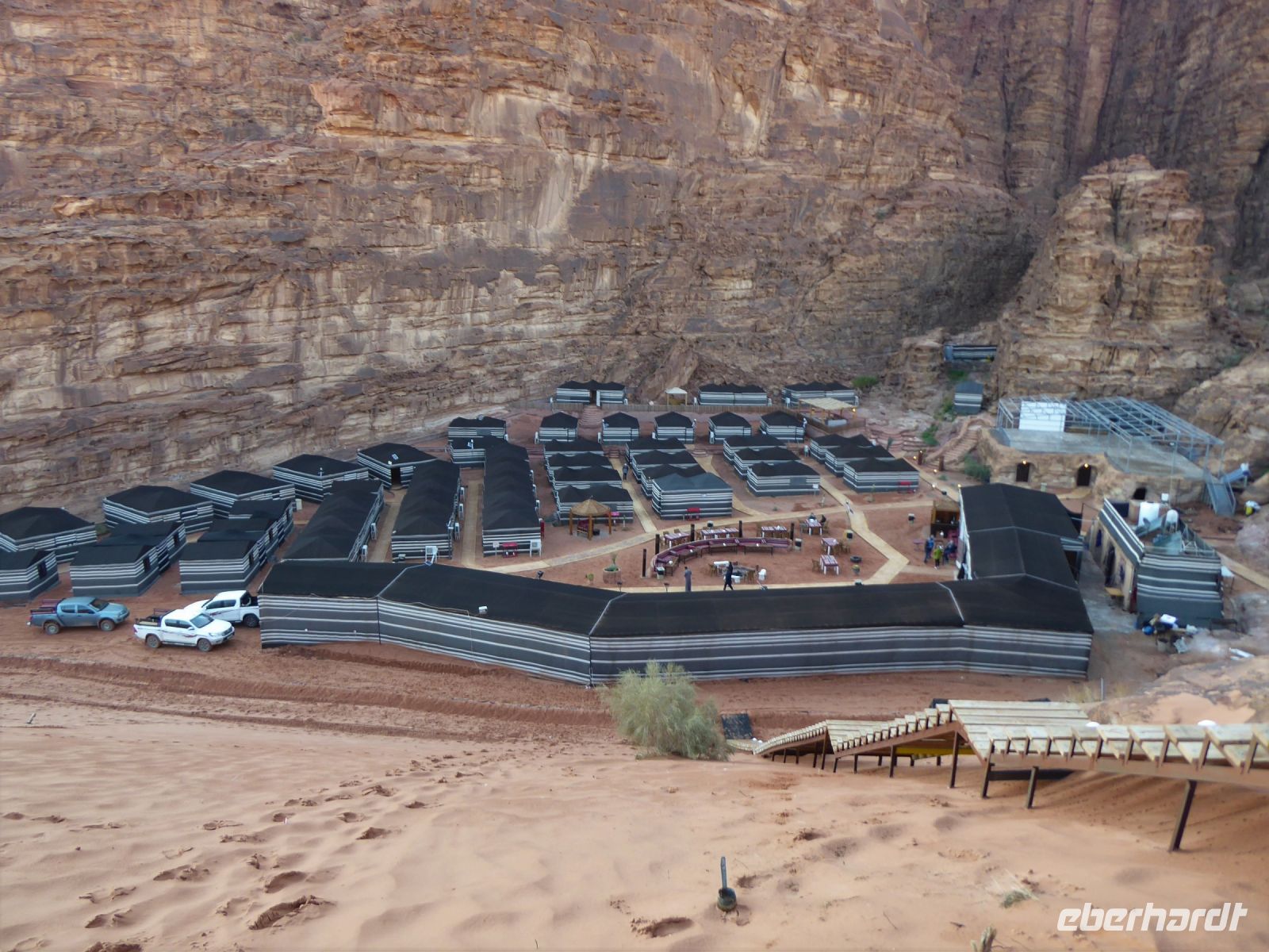 Für den heutigen Tag war sogar Schnee angekündigt und so wollten wir die Besichtigung von Petra kürzer halten. Das Wetter hatte jedoch ein Einsehen, und so konnte, wer wollte, heute zusammen mit Ali noch einmal Petra ganz intensiv erleben. Der Weg führte bis zur byzantinischen Kirche und zum Kloster Ed-Deir. Das schlechte Wetter hatte durchaus auch seine guten Seiten, es waren weniger Besucher in der Felsenstadt. Mit weniger Rummel gewann Petra viel von seinem ursprünglichen Charakter zurück. Ein Teil der Gruppe, der heute nicht mehr in die Felsenstadt hinein wollte, schloss sich am späten Vormittag der Reisebegleitung zu einem Spaziergang über das Hochplateau an. Gestern sahen wir in Petra bizarre Muster im Sandstein, der durch Eisen- und Manganoxide intensiv rot und schwarz eingefärbt ist, und heute kletterten wir durch die oberen, durch Erosion tief zerklüfteten, hellen Sandsteinschichten. Der jordanische Architekt und Künstler Ammar Khammash schrieb dazu: „Petra ist ein wundervoller Ort, an dem Geologie und Archäologie auf schöne Weise koexistieren. Um die Monumente Petras besser zu begreifen sollte man der Geologie des Ortes mehr Aufmerksamkeit widmen und sich bemühen, die Eigenschaften der Steine zu verstehen […]“ Hier sahen wir Wohnhöhlen aus unbestimmten Zeiten und wie aus dem Nichts standen plötzlich ein paar junge Beduinen vor uns, die, so schnell wie sie erschienen waren, auch wieder verschwanden. Kein offizieller Weg führte durch diese bizarre Landschaft, und doch kamen wir erstaunlich schnell voran. Unser Ziel waren die Ruinen der Kreuzfahrerburg Al Wu´eira, die wir genau zur Mittagsstunde erreichten. Die Festung war ein Außenposten der 25 km nördlich gelegenen Kreuzfahrerfestung Montréal in Shobak. Von fern erschallte der Ruf des Muezzin, der die Gläubigen zum Mittagsgebet rief. Nur wenige Meter vom touristischen Zentrum Petras entfernt, war man ganz allein und fühlte sich in archaische Zeiten zurückversetzt. Zwischen den Steinblöcken entdeckten wir blühende Pflanzen - der Regen hatte sie sichtbar gemacht - die Wüste lebt! Und auch die unvermeidlichen Spuren der Zivilisation, Plastikmüll in allen Variationen, verlassene Feuerstellen und Glasscherben zeigen, dass sich hier in dieser unwirtlichen Gegend, zumindest temporär, Menschen aufhalten. Nach unserem Spaziergang blieb noch genügend Zeit, das sehr interessante archäologische Museum in Petra zu besuchen, einen kleinen Einkaufsbummel zu machen und sogar für einen kleinen Mittagsimbiss reichte die Zeit, bevor uns am frühen Nachmittag unser Bus am Hotel abholte. Die Koffer waren bereits verstaut und so fuhren wir direkt weiter zum nächsten Punkt unserer Reise: die heutige Nacht wollten wir in einem Wüstencamp im Wadi Rum verbringen. Bevor wir die Region verließen, machten wir noch einen kurzen Fotostopp und warfen von oben einen Blick auf die berühmte Stadt Petra und die umliegenden Berge. Kurz vor Sonnenuntergang erreichten wir dann das Wadi Rum. Es gehört zum sogenannten Rift Valley, das, wie auch der Jordangraben, der Golf von Aqaba und das Rote Meer vor ca. 30 Mio Jahren gebildet wurde. Der rote Sandstein, der über Jahrhunderte zu bizarren Formen geschliffen wurde liegt auf einem Sockel aus Granit. Wie Felszeichnungen belegen, wurde das Gebiet bereits in der Steinzeit besiedelt. Die höchste Erhebung ist der Djebel Umm ad-Dami mit einer Höhe von 1832 m. Von dort ist es nicht mehr weit bis an die Grenze nach Saudi-Arabien. Unser Camp, das Rahayes Desert Camp, liegt im Norden des Wadi Rum. Schnell bezogen wir unsere Zelte, die allen in der Wüste benötigten Komfort boten: Licht, eine Toilette mit Wasserspülung, eine Dusche, Steckdosen, WLAN, eine Klimaanlage, die den Raum wohlig erwärmt hat, erstaunlich bequeme Betten und eine Tür zum Abschließen! Zum gemeinsamen Abendessen, mit leckeren Salaten vom Buffet, gebratenen Hühnern und Lammfleisch direkt aus dem Ofen, trafen wir uns alle in einem riesigen Zelt mit bequemen Sofas. Über uns der Sternenhimmel und eine sonderbare Stille. Doch der Abend war kurz und schnell strebten wir zu unseren Betten, wollten wir doch bei einem Kamelritt am frühen Morgen den Sonnenaufgang genießen.