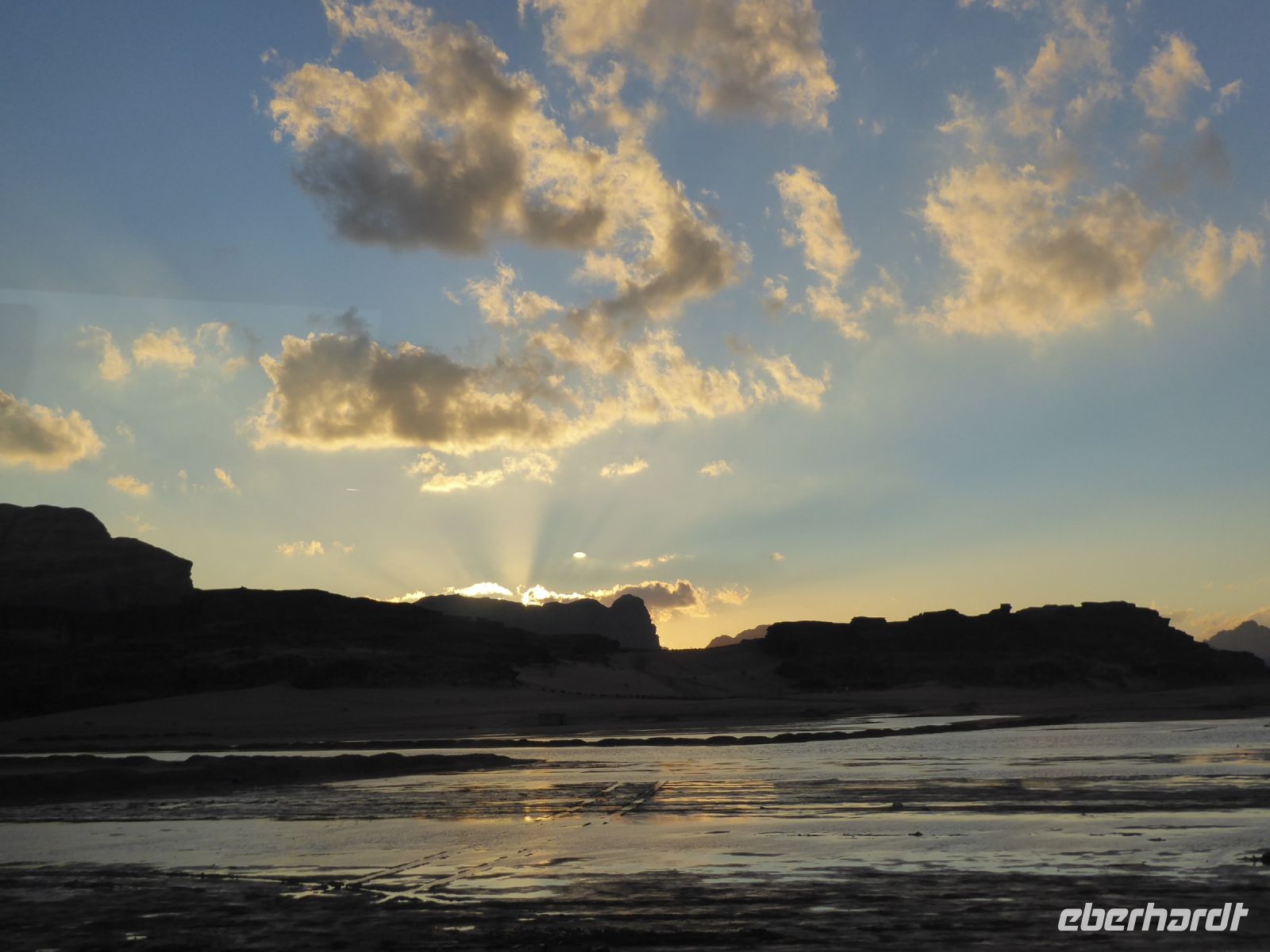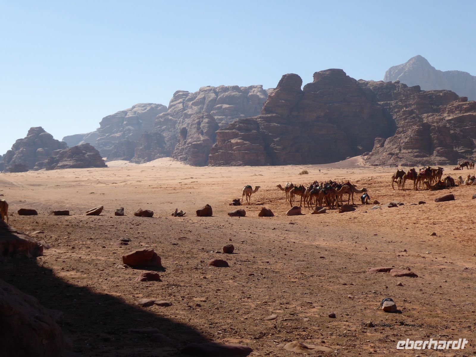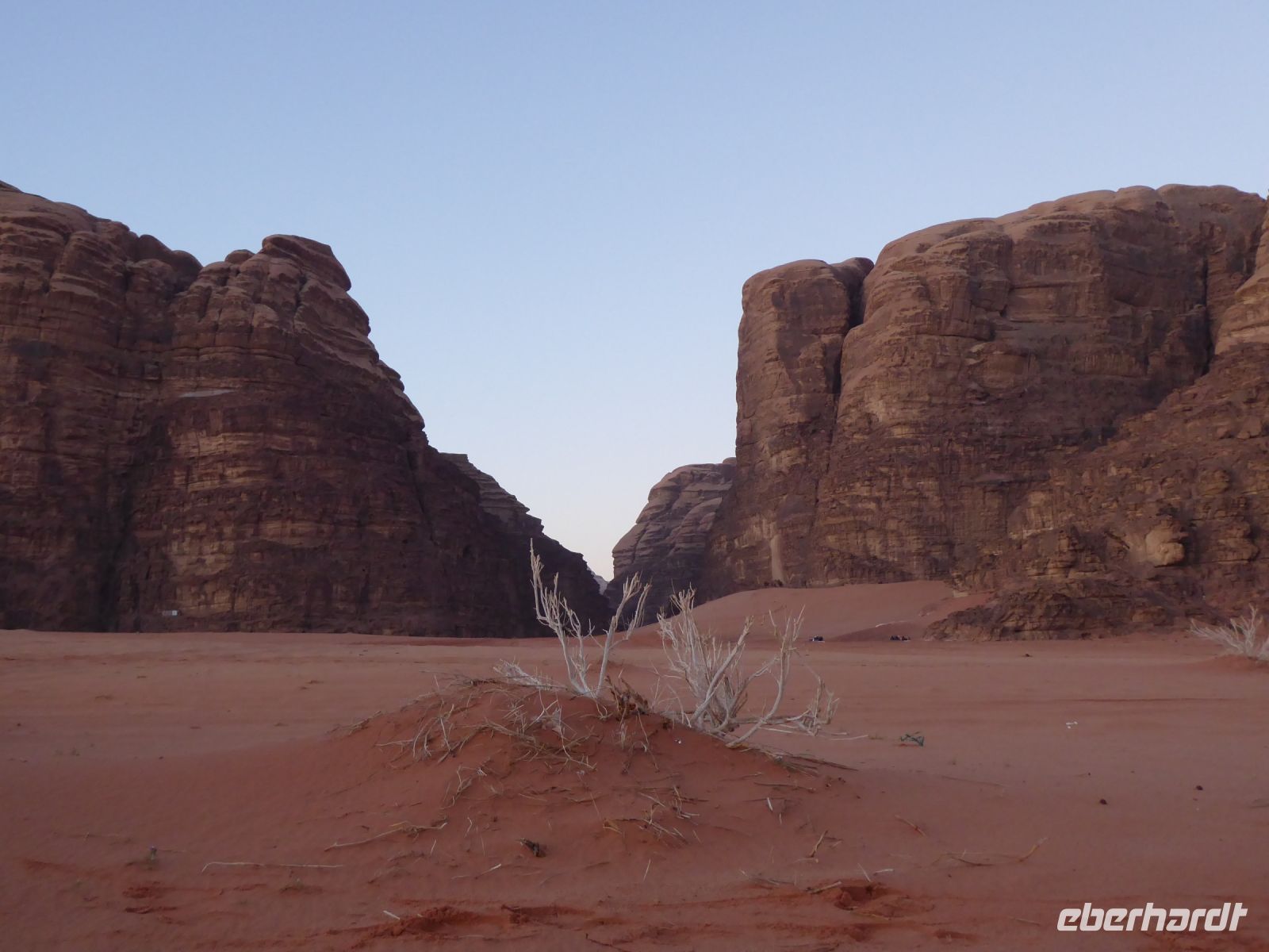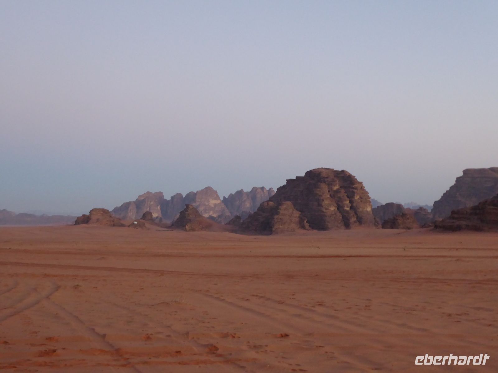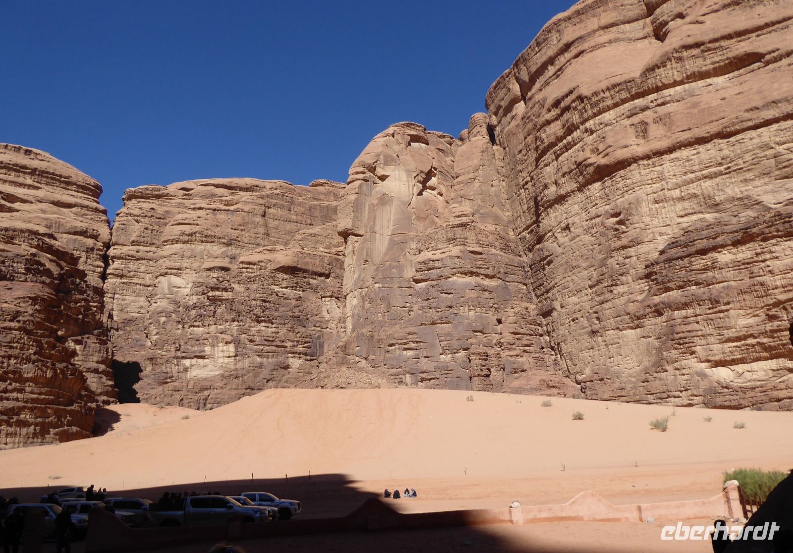 Für den heutigen Tag war sogar Schnee angekündigt und so wollten wir die Besichtigung von Petra kürzer halten. Das Wetter hatte jedoch ein Einsehen, und so konnte, wer wollte, heute zusammen mit Ali noch einmal Petra ganz intensiv erleben. Der Weg führte bis zur byzantinischen Kirche und zum Kloster Ed-Deir. Das schlechte Wetter hatte durchaus auch seine guten Seiten, es waren weniger Besucher in der Felsenstadt. Mit weniger Rummel gewann Petra viel von seinem ursprünglichen Charakter zurück. Ein Teil der Gruppe, der heute nicht mehr in die Felsenstadt hinein wollte, schloss sich am späten Vormittag der Reisebegleitung zu einem Spaziergang über das Hochplateau an. Gestern sahen wir in Petra bizarre Muster im Sandstein, der durch Eisen- und Manganoxide intensiv rot und schwarz eingefärbt ist, und heute kletterten wir durch die oberen, durch Erosion tief zerklüfteten, hellen Sandsteinschichten. Der jordanische Architekt und Künstler Ammar Khammash schrieb dazu: „Petra ist ein wundervoller Ort, an dem Geologie und Archäologie auf schöne Weise koexistieren. Um die Monumente Petras besser zu begreifen sollte man der Geologie des Ortes mehr Aufmerksamkeit widmen und sich bemühen, die Eigenschaften der Steine zu verstehen […]“ Hier sahen wir Wohnhöhlen aus unbestimmten Zeiten und wie aus dem Nichts standen plötzlich ein paar junge Beduinen vor uns, die, so schnell wie sie erschienen waren, auch wieder verschwanden. Kein offizieller Weg führte durch diese bizarre Landschaft, und doch kamen wir erstaunlich schnell voran. Unser Ziel waren die Ruinen der Kreuzfahrerburg Al Wu´eira, die wir genau zur Mittagsstunde erreichten. Die Festung war ein Außenposten der 25 km nördlich gelegenen Kreuzfahrerfestung Montréal in Shobak. Von fern erschallte der Ruf des Muezzin, der die Gläubigen zum Mittagsgebet rief. Nur wenige Meter vom touristischen Zentrum Petras entfernt, war man ganz allein und fühlte sich in archaische Zeiten zurückversetzt. Zwischen den Steinblöcken entdeckten wir blühende Pflanzen - der Regen hatte sie sichtbar gemacht - die Wüste lebt! Und auch die unvermeidlichen Spuren der Zivilisation, Plastikmüll in allen Variationen, verlassene Feuerstellen und Glasscherben zeigen, dass sich hier in dieser unwirtlichen Gegend, zumindest temporär, Menschen aufhalten. Nach unserem Spaziergang blieb noch genügend Zeit, das sehr interessante archäologische Museum in Petra zu besuchen, einen kleinen Einkaufsbummel zu machen und sogar für einen kleinen Mittagsimbiss reichte die Zeit, bevor uns am frühen Nachmittag unser Bus am Hotel abholte. Die Koffer waren bereits verstaut und so fuhren wir direkt weiter zum nächsten Punkt unserer Reise: die heutige Nacht wollten wir in einem Wüstencamp im Wadi Rum verbringen. Bevor wir die Region verließen, machten wir noch einen kurzen Fotostopp und warfen von oben einen Blick auf die berühmte Stadt Petra und die umliegenden Berge. Kurz vor Sonnenuntergang erreichten wir dann das Wadi Rum. Es gehört zum sogenannten Rift Valley, das, wie auch der Jordangraben, der Golf von Aqaba und das Rote Meer vor ca. 30 Mio Jahren gebildet wurde. Der rote Sandstein, der über Jahrhunderte zu bizarren Formen geschliffen wurde liegt auf einem Sockel aus Granit. Wie Felszeichnungen belegen, wurde das Gebiet bereits in der Steinzeit besiedelt. Die höchste Erhebung ist der Djebel Umm ad-Dami mit einer Höhe von 1832 m. Von dort ist es nicht mehr weit bis an die Grenze nach Saudi-Arabien. Unser Camp, das Rahayes Desert Camp, liegt im Norden des Wadi Rum. Schnell bezogen wir unsere Zelte, die allen in der Wüste benötigten Komfort boten: Licht, eine Toilette mit Wasserspülung, eine Dusche, Steckdosen, WLAN, eine Klimaanlage, die den Raum wohlig erwärmt hat, erstaunlich bequeme Betten und eine Tür zum Abschließen! Zum gemeinsamen Abendessen, mit leckeren Salaten vom Buffet, gebratenen Hühnern und Lammfleisch direkt aus dem Ofen, trafen wir uns alle in einem riesigen Zelt mit bequemen Sofas. Über uns der Sternenhimmel und eine sonderbare Stille. Doch der Abend war kurz und schnell strebten wir zu unseren Betten, wollten wir doch bei einem Kamelritt am frühen Morgen den Sonnenaufgang genießen.