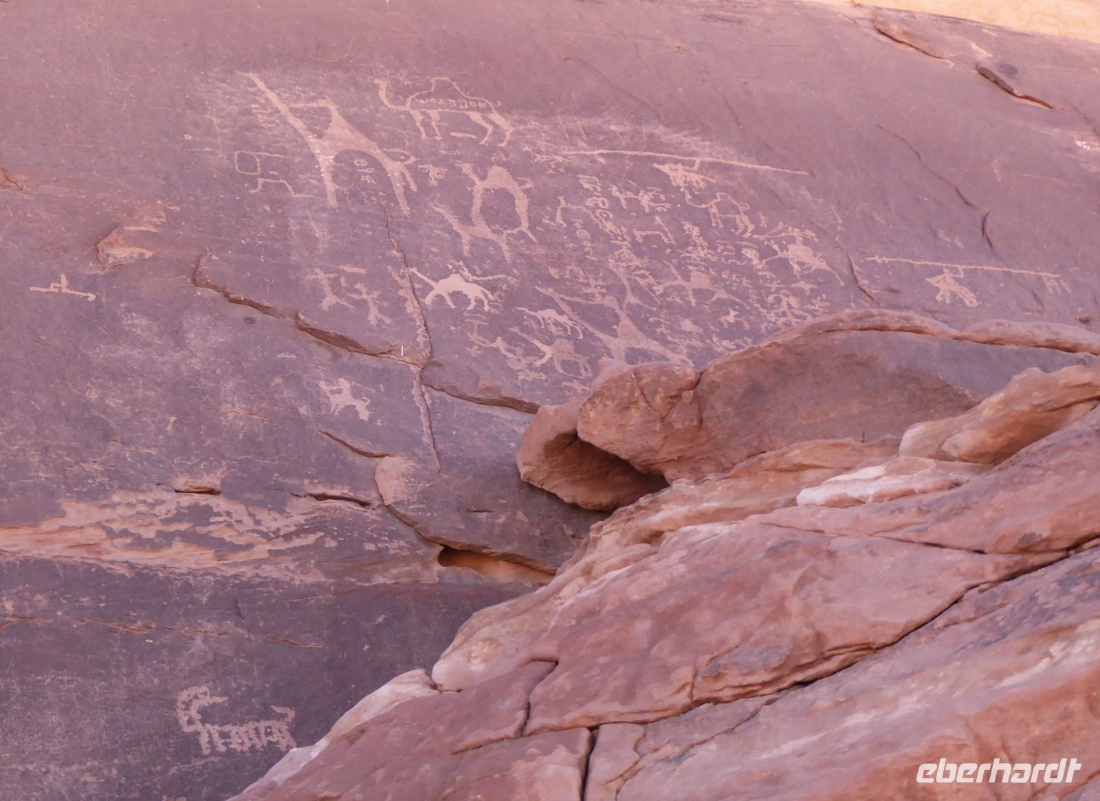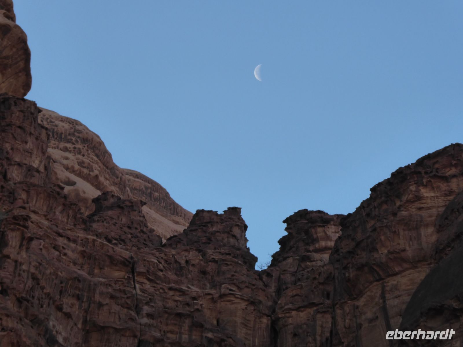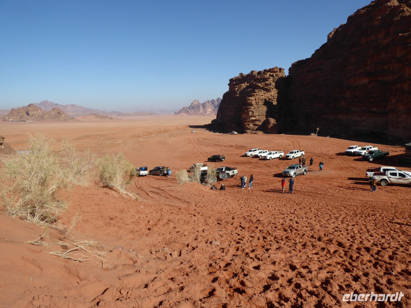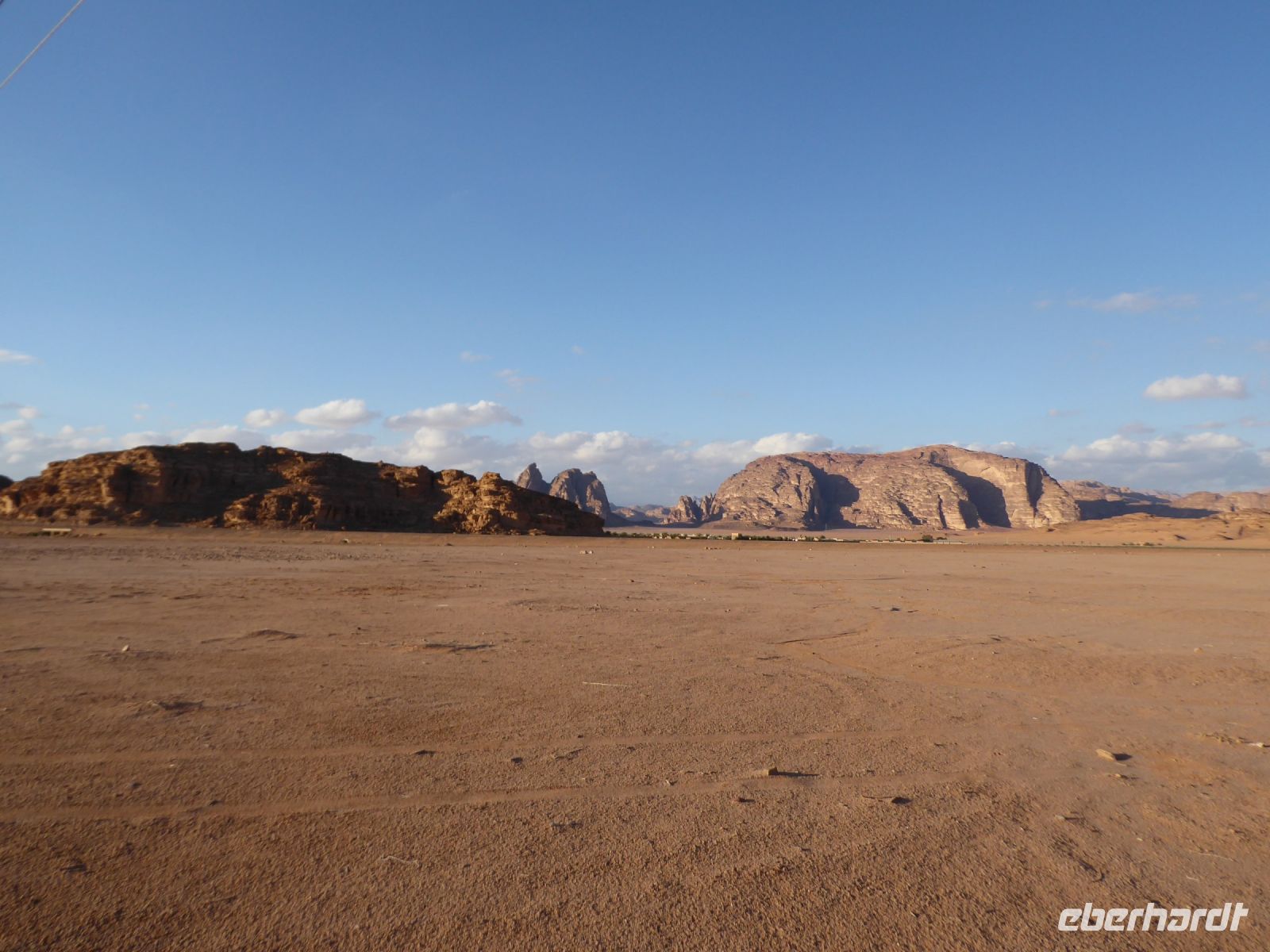 Für den heutigen Tag war sogar Schnee angekündigt und so wollten wir die Besichtigung von Petra kürzer halten. Das Wetter hatte jedoch ein Einsehen, und so konnte, wer wollte, heute zusammen mit Ali noch einmal Petra ganz intensiv erleben. Der Weg führte bis zur byzantinischen Kirche und zum Kloster Ed-Deir. Das schlechte Wetter hatte durchaus auch seine guten Seiten, es waren weniger Besucher in der Felsenstadt. Mit weniger Rummel gewann Petra viel von seinem ursprünglichen Charakter zurück. Ein Teil der Gruppe, der heute nicht mehr in die Felsenstadt hinein wollte, schloss sich am späten Vormittag der Reisebegleitung zu einem Spaziergang über das Hochplateau an. Gestern sahen wir in Petra bizarre Muster im Sandstein, der durch Eisen- und Manganoxide intensiv rot und schwarz eingefärbt ist, und heute kletterten wir durch die oberen, durch Erosion tief zerklüfteten, hellen Sandsteinschichten. Der jordanische Architekt und Künstler Ammar Khammash schrieb dazu: „Petra ist ein wundervoller Ort, an dem Geologie und Archäologie auf schöne Weise koexistieren. Um die Monumente Petras besser zu begreifen sollte man der Geologie des Ortes mehr Aufmerksamkeit widmen und sich bemühen, die Eigenschaften der Steine zu verstehen […]“ Hier sahen wir Wohnhöhlen aus unbestimmten Zeiten und wie aus dem Nichts standen plötzlich ein paar junge Beduinen vor uns, die, so schnell wie sie erschienen waren, auch wieder verschwanden. Kein offizieller Weg führte durch diese bizarre Landschaft, und doch kamen wir erstaunlich schnell voran. Unser Ziel waren die Ruinen der Kreuzfahrerburg Al Wu´eira, die wir genau zur Mittagsstunde erreichten. Die Festung war ein Außenposten der 25 km nördlich gelegenen Kreuzfahrerfestung Montréal in Shobak. Von fern erschallte der Ruf des Muezzin, der die Gläubigen zum Mittagsgebet rief. Nur wenige Meter vom touristischen Zentrum Petras entfernt, war man ganz allein und fühlte sich in archaische Zeiten zurückversetzt. Zwischen den Steinblöcken entdeckten wir blühende Pflanzen - der Regen hatte sie sichtbar gemacht - die Wüste lebt! Und auch die unvermeidlichen Spuren der Zivilisation, Plastikmüll in allen Variationen, verlassene Feuerstellen und Glasscherben zeigen, dass sich hier in dieser unwirtlichen Gegend, zumindest temporär, Menschen aufhalten. Nach unserem Spaziergang blieb noch genügend Zeit, das sehr interessante archäologische Museum in Petra zu besuchen, einen kleinen Einkaufsbummel zu machen und sogar für einen kleinen Mittagsimbiss reichte die Zeit, bevor uns am frühen Nachmittag unser Bus am Hotel abholte. Die Koffer waren bereits verstaut und so fuhren wir direkt weiter zum nächsten Punkt unserer Reise: die heutige Nacht wollten wir in einem Wüstencamp im Wadi Rum verbringen. Bevor wir die Region verließen, machten wir noch einen kurzen Fotostopp und warfen von oben einen Blick auf die berühmte Stadt Petra und die umliegenden Berge. Kurz vor Sonnenuntergang erreichten wir dann das Wadi Rum. Es gehört zum sogenannten Rift Valley, das, wie auch der Jordangraben, der Golf von Aqaba und das Rote Meer vor ca. 30 Mio Jahren gebildet wurde. Der rote Sandstein, der über Jahrhunderte zu bizarren Formen geschliffen wurde liegt auf einem Sockel aus Granit. Wie Felszeichnungen belegen, wurde das Gebiet bereits in der Steinzeit besiedelt. Die höchste Erhebung ist der Djebel Umm ad-Dami mit einer Höhe von 1832 m. Von dort ist es nicht mehr weit bis an die Grenze nach Saudi-Arabien. Unser Camp, das Rahayes Desert Camp, liegt im Norden des Wadi Rum. Schnell bezogen wir unsere Zelte, die allen in der Wüste benötigten Komfort boten: Licht, eine Toilette mit Wasserspülung, eine Dusche, Steckdosen, WLAN, eine Klimaanlage, die den Raum wohlig erwärmt hat, erstaunlich bequeme Betten und eine Tür zum Abschließen! Zum gemeinsamen Abendessen, mit leckeren Salaten vom Buffet, gebratenen Hühnern und Lammfleisch direkt aus dem Ofen, trafen wir uns alle in einem riesigen Zelt mit bequemen Sofas. Über uns der Sternenhimmel und eine sonderbare Stille. Doch der Abend war kurz und schnell strebten wir zu unseren Betten, wollten wir doch bei einem Kamelritt am frühen Morgen den Sonnenaufgang genießen.
