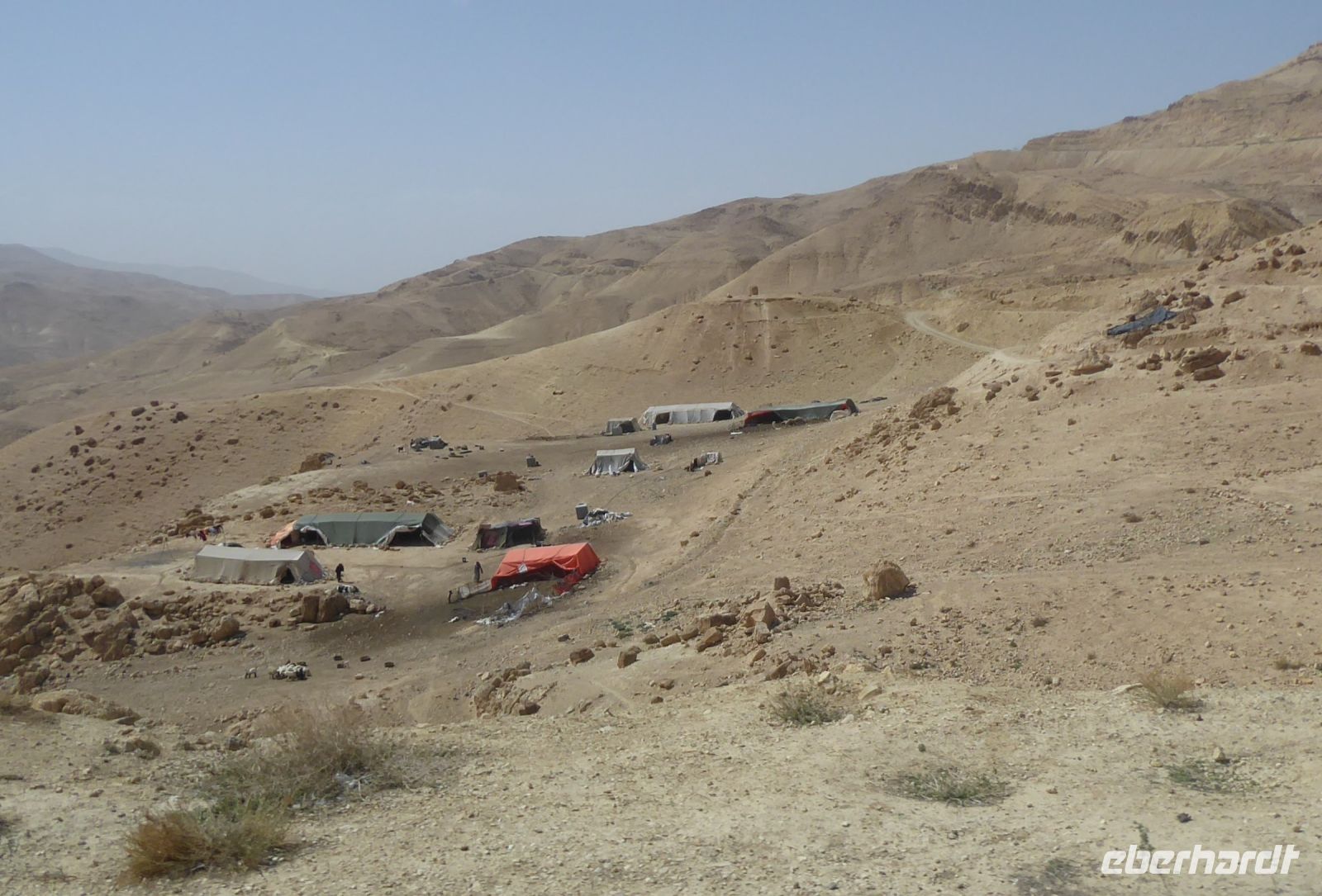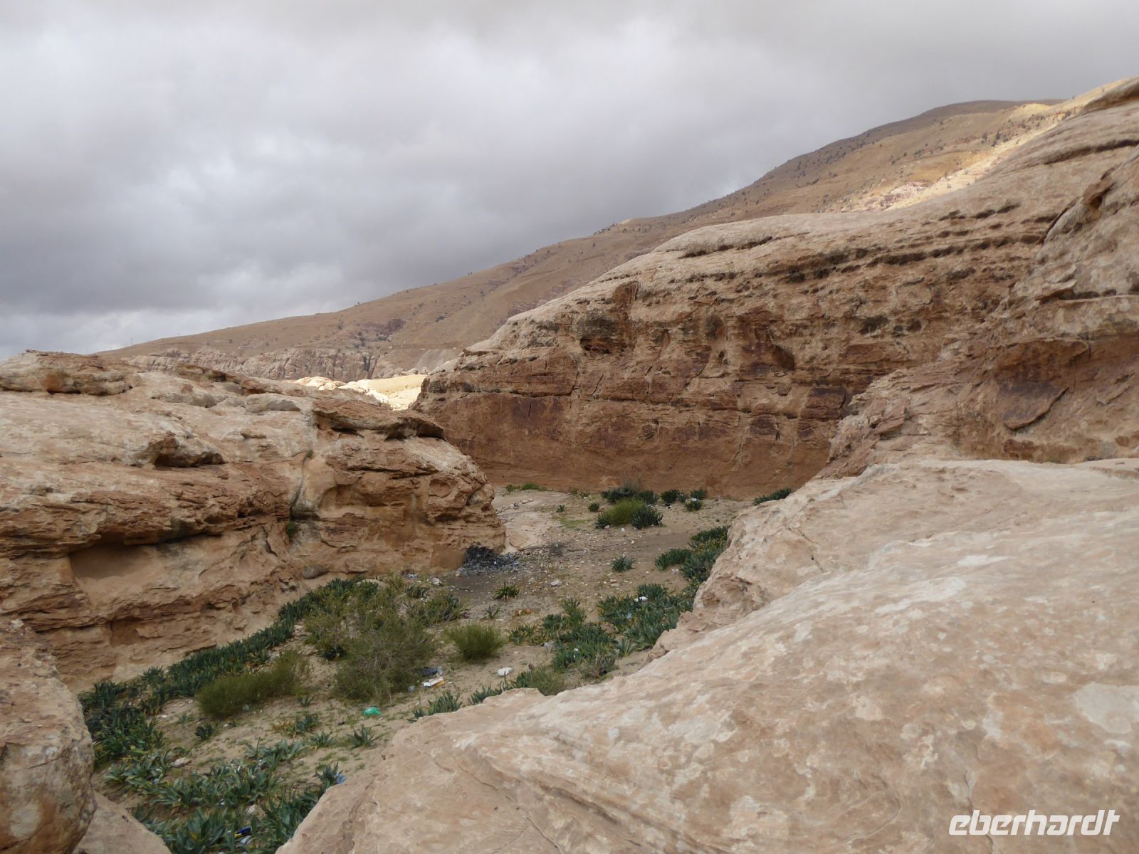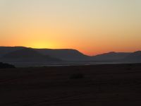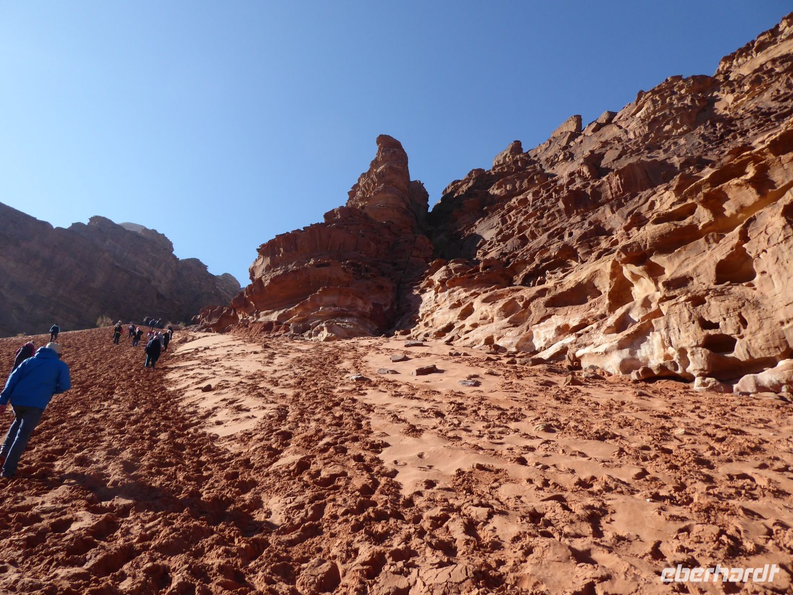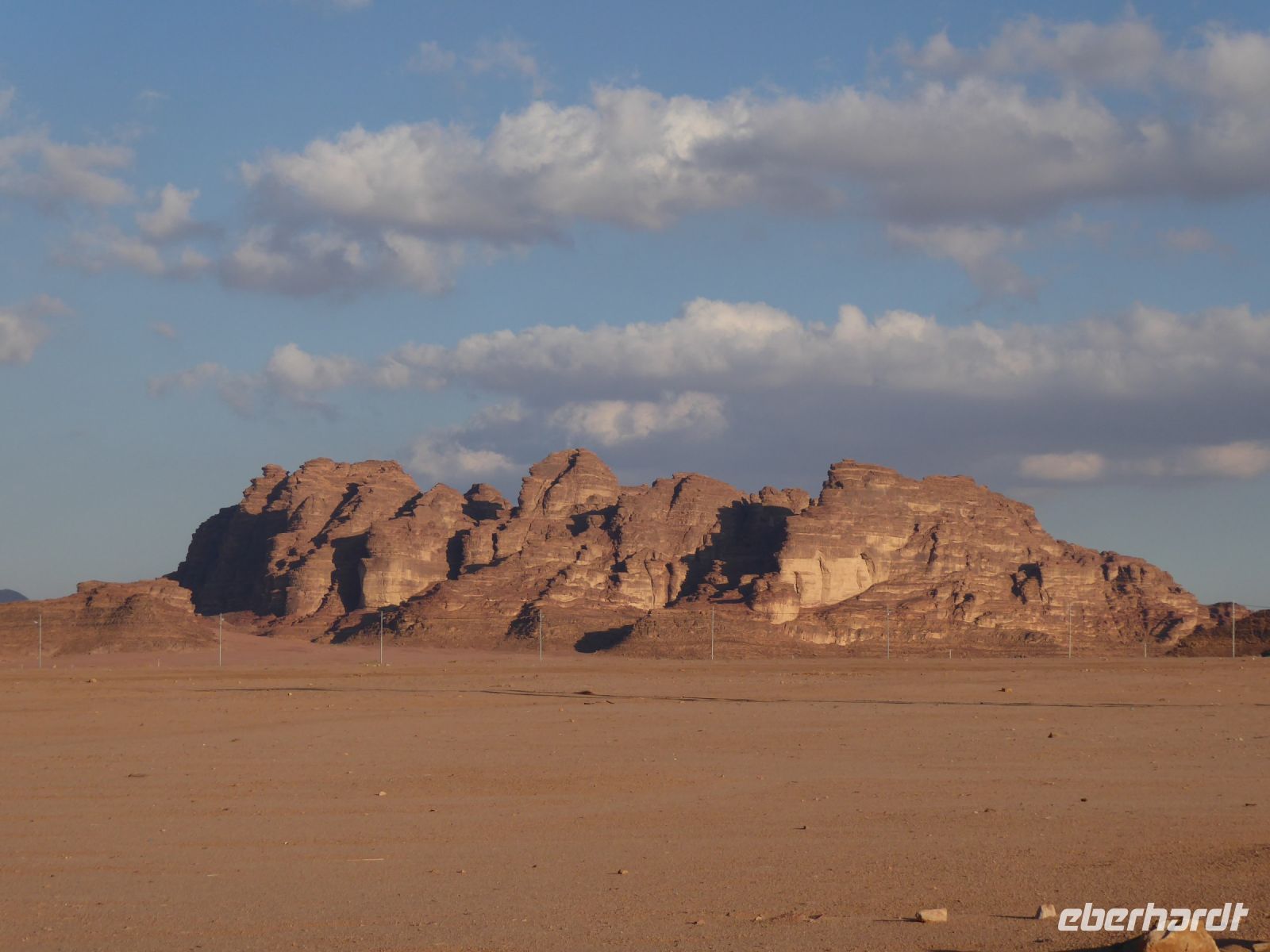Für den heutigen Tag war sogar Schnee angekündigt und so wollten wir die Besichtigung von Petra kürzer halten. Das Wetter hatte jedoch ein Einsehen, und so konnte, wer wollte, heute zusammen mit Ali noch einmal Petra ganz intensiv erleben. Der Weg führte bis zur byzantinischen Kirche und zum Kloster Ed-Deir. Das schlechte Wetter hatte durchaus auch seine guten Seiten, es waren weniger Besucher in der Felsenstadt. Mit weniger Rummel gewann Petra viel von seinem ursprünglichen Charakter zurück. Ein Teil der Gruppe, der heute nicht mehr in die Felsenstadt hinein wollte, schloss sich am späten Vormittag der Reisebegleitung zu einem Spaziergang über das Hochplateau an. Gestern sahen wir in Petra bizarre Muster im Sandstein, der durch Eisen- und Manganoxide intensiv rot und schwarz eingefärbt ist, und heute kletterten wir durch die oberen, durch Erosion tief zerklüfteten, hellen Sandsteinschichten. Der jordanische Architekt und Künstler Ammar Khammash schrieb dazu: „Petra ist ein wundervoller Ort, an dem Geologie und Archäologie auf schöne Weise koexistieren. Um die Monumente Petras besser zu begreifen sollte man der Geologie des Ortes mehr Aufmerksamkeit widmen und sich bemühen, die Eigenschaften der Steine zu verstehen […]“ Hier sahen wir Wohnhöhlen aus unbestimmten Zeiten und wie aus dem Nichts standen plötzlich ein paar junge Beduinen vor uns, die, so schnell wie sie erschienen waren, auch wieder verschwanden. Kein offizieller Weg führte durch diese bizarre Landschaft, und doch kamen wir erstaunlich schnell voran. Unser Ziel waren die Ruinen der Kreuzfahrerburg Al Wu´eira, die wir genau zur Mittagsstunde erreichten. Die Festung war ein Außenposten der 25 km nördlich gelegenen Kreuzfahrerfestung Montréal in Shobak. Von fern erschallte der Ruf des Muezzin, der die Gläubigen zum Mittagsgebet rief. Nur wenige Meter vom touristischen Zentrum Petras entfernt, war man ganz allein und fühlte sich in archaische Zeiten zurückversetzt. Zwischen den Steinblöcken entdeckten wir blühende Pflanzen - der Regen hatte sie sichtbar gemacht - die Wüste lebt! Und auch die unvermeidlichen Spuren der Zivilisation, Plastikmüll in allen Variationen, verlassene Feuerstellen und Glasscherben zeigen, dass sich hier in dieser unwirtlichen Gegend, zumindest temporär, Menschen aufhalten. Nach unserem Spaziergang blieb noch genügend Zeit, das sehr interessante archäologische Museum in Petra zu besuchen, einen kleinen Einkaufsbummel zu machen und sogar für einen kleinen Mittagsimbiss reichte die Zeit, bevor uns am frühen Nachmittag unser Bus am Hotel abholte. Die Koffer waren bereits verstaut und so fuhren wir direkt weiter zum nächsten Punkt unserer Reise: die heutige Nacht wollten wir in einem Wüstencamp im Wadi Rum verbringen. Bevor wir die Region verließen, machten wir noch einen kurzen Fotostopp und warfen von oben einen Blick auf die berühmte Stadt Petra und die umliegenden Berge. Kurz vor Sonnenuntergang erreichten wir dann das Wadi Rum. Es gehört zum sogenannten Rift Valley, das, wie auch der Jordangraben, der Golf von Aqaba und das Rote Meer vor ca. 30 Mio Jahren gebildet wurde. Der rote Sandstein, der über Jahrhunderte zu bizarren Formen geschliffen wurde liegt auf einem Sockel aus Granit. Wie Felszeichnungen belegen, wurde das Gebiet bereits in der Steinzeit besiedelt. Die höchste Erhebung ist der Djebel Umm ad-Dami mit einer Höhe von 1832 m. Von dort ist es nicht mehr weit bis an die Grenze nach Saudi-Arabien. Unser Camp, das Rahayes Desert Camp, liegt im Norden des Wadi Rum. Schnell bezogen wir unsere Zelte, die allen in der Wüste benötigten Komfort boten: Licht, eine Toilette mit Wasserspülung, eine Dusche, Steckdosen, WLAN, eine Klimaanlage, die den Raum wohlig erwärmt hat, erstaunlich bequeme Betten und eine Tür zum Abschließen! Zum gemeinsamen Abendessen, mit leckeren Salaten vom Buffet, gebratenen Hühnern und Lammfleisch direkt aus dem Ofen, trafen wir uns alle in einem riesigen Zelt mit bequemen Sofas. Über uns der Sternenhimmel und eine sonderbare Stille. Doch der Abend war kurz und schnell strebten wir zu unseren Betten, wollten wir doch bei einem Kamelritt am frühen Morgen den Sonnenaufgang genießen.