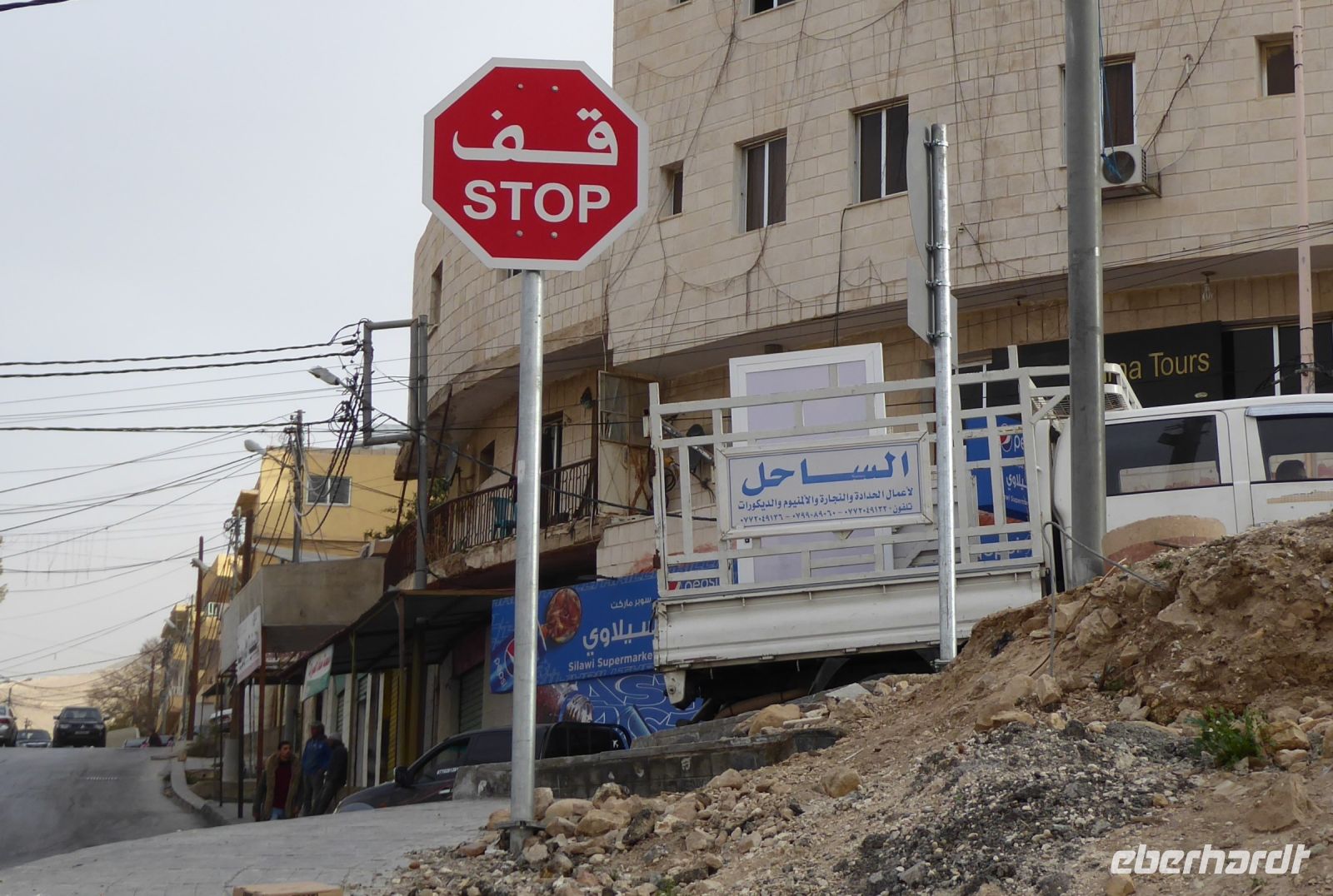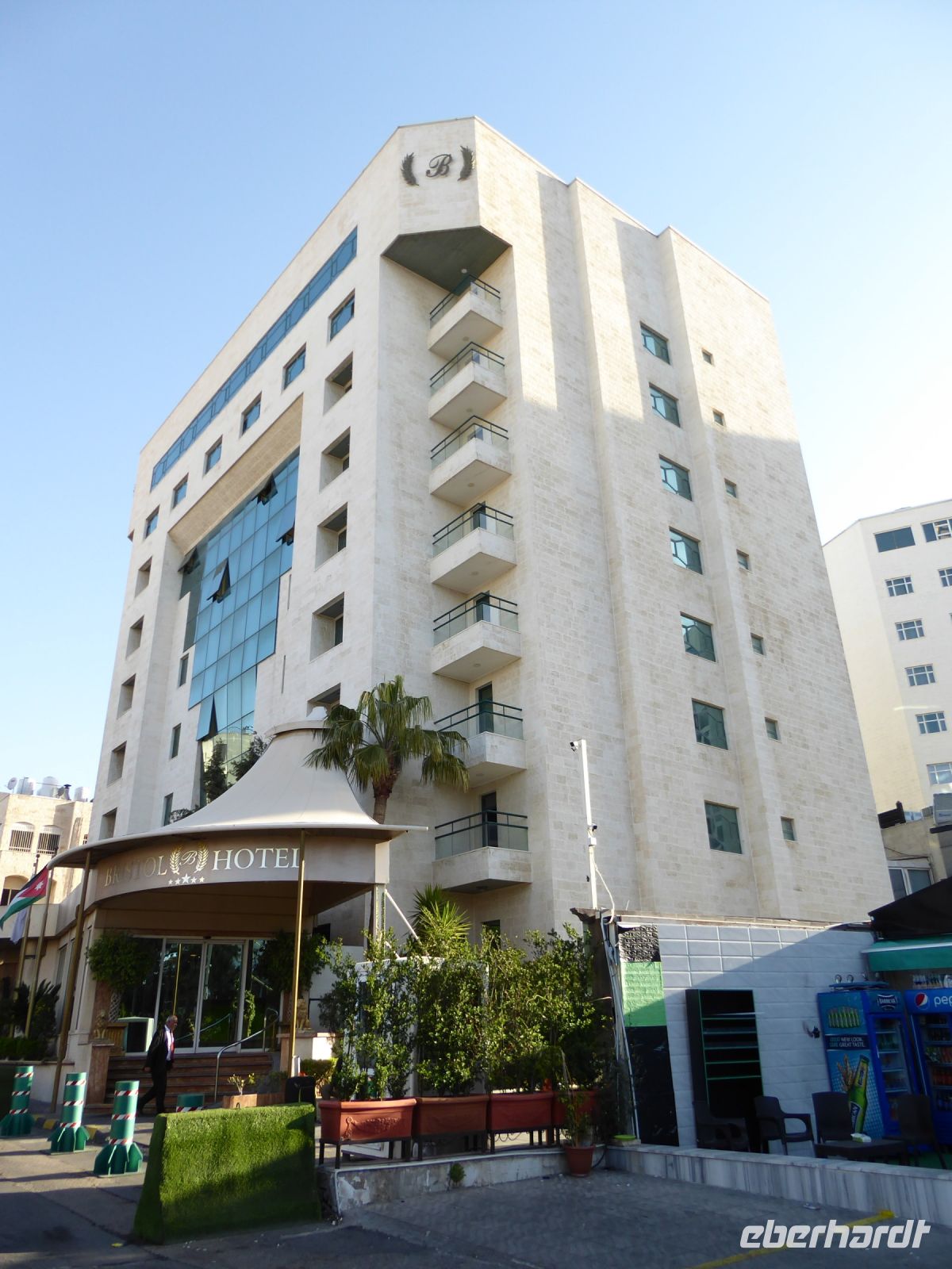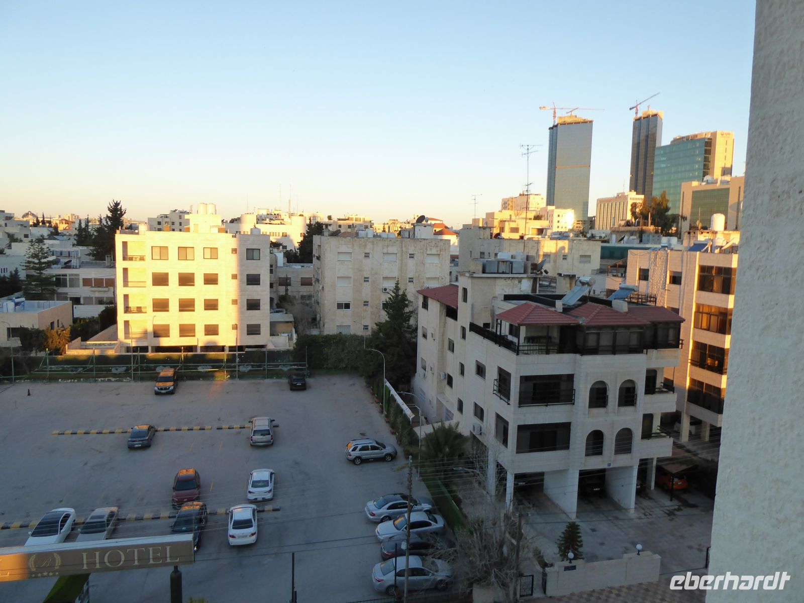 Mit den brav von der Reisebegleitung eingesammelten Reisepässen trabten wir zum vereinbarten Treffpunkt mit dem Flughafenassistenten, der für uns die Einreiseformalitäten erledigen sollte. Und genau an diesem Punkt begegnete uns zum ersten Mal die landestypisch hierarchische Arbeitsverteilung. Jeder Gast erhielt seinen Reisepass zurück, wir stellten uns in eine ordentliche Warteschlange, um dann dort einem der Herren selbigen wieder auszuhändigen. Bei der Kofferausgabe herrschte rege Betriebsamkeit. Das eine oder andere Gepäckstück von uns und anderen Reisenden ließ lange auf sich warten. Mehrere Koffer tauchten wieder auf, leider fehlte uns noch immer ein Gepäckstück. Ausgestattet mit einem Verlustprotokoll machten wir uns schließlich auf den Weg ins Hotel, das wir erst nach Mitternacht erreichten. Ali, unser Guide, der schon lange außerhalb des Flughafengebäudes auf uns gewartet hatte, arrangierte für uns eine Lunch Box, da die Küche im Hotel erwartungsgemäß bereits geschlossen war. Jedes einzelne Stückchen darin, selbst die Bananen und Äpfel, waren liebevoll in viel Plastikfolie einwickelt. Plastikverpackungen und Plastikmüll werden wir auf unserer Reise noch oft begegnen. Das Hotel Bristol liegt ruhig außerhalb des alten Stadtzentrums von Amman zwischen dem vierten und fünften Kreisverkehr und gehört in die gehobene vier Sterne Kategorie. Der erste Eindruck zählt und wir sanken erschöpft von der Anreise und den ersten Aufregungen am Flughafen in die bequemen Betten, bis am anderen Morgen um 5:18 Uhr der erste Ruf des Muezzins das baldige Aufgehen der Sonne ankündigte.