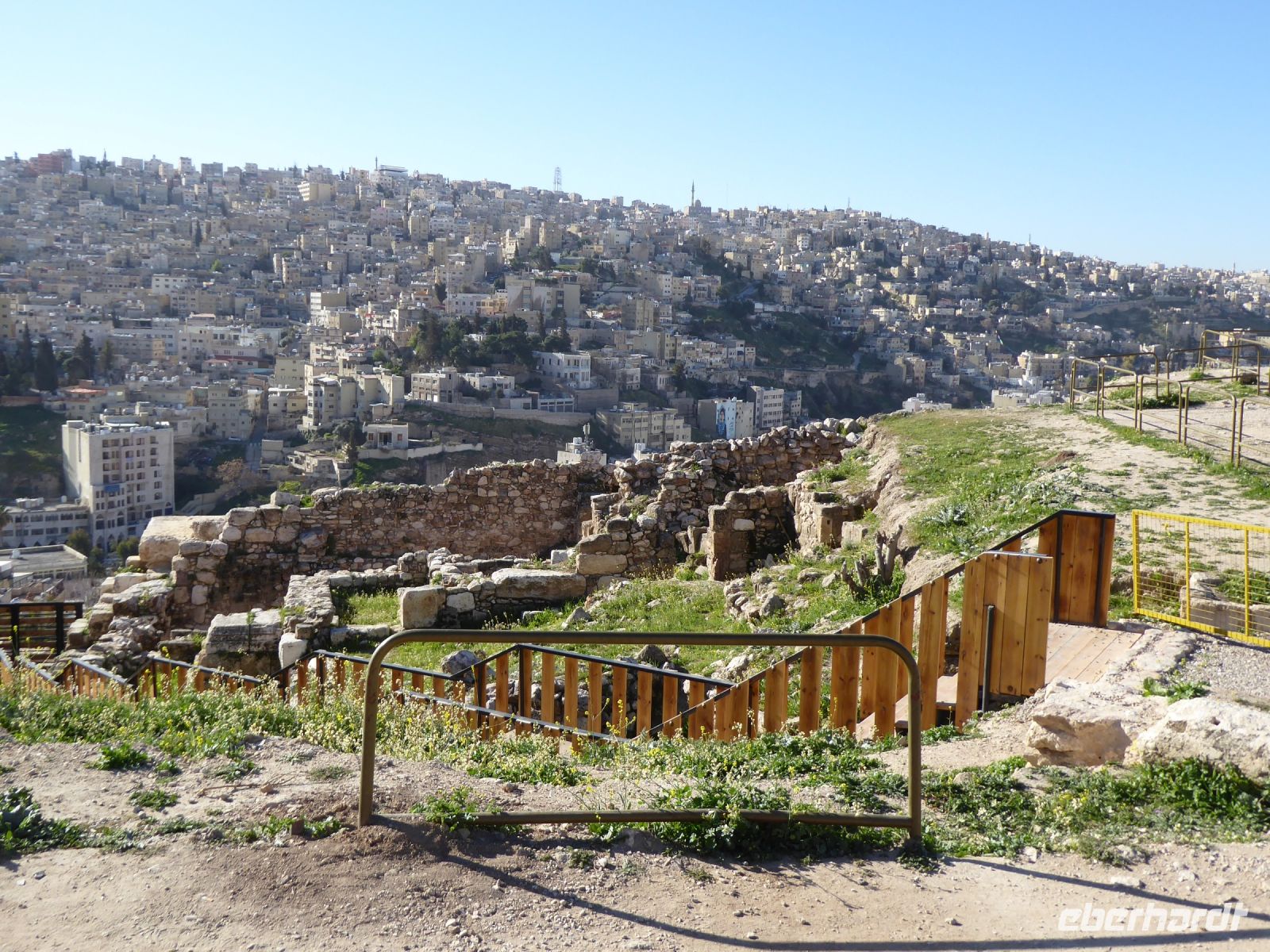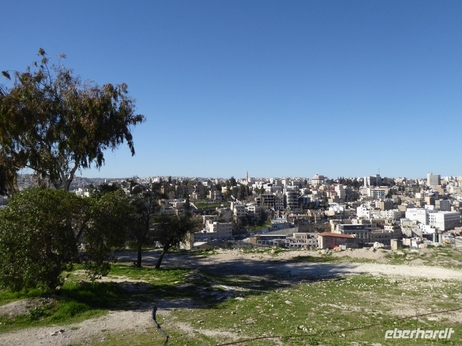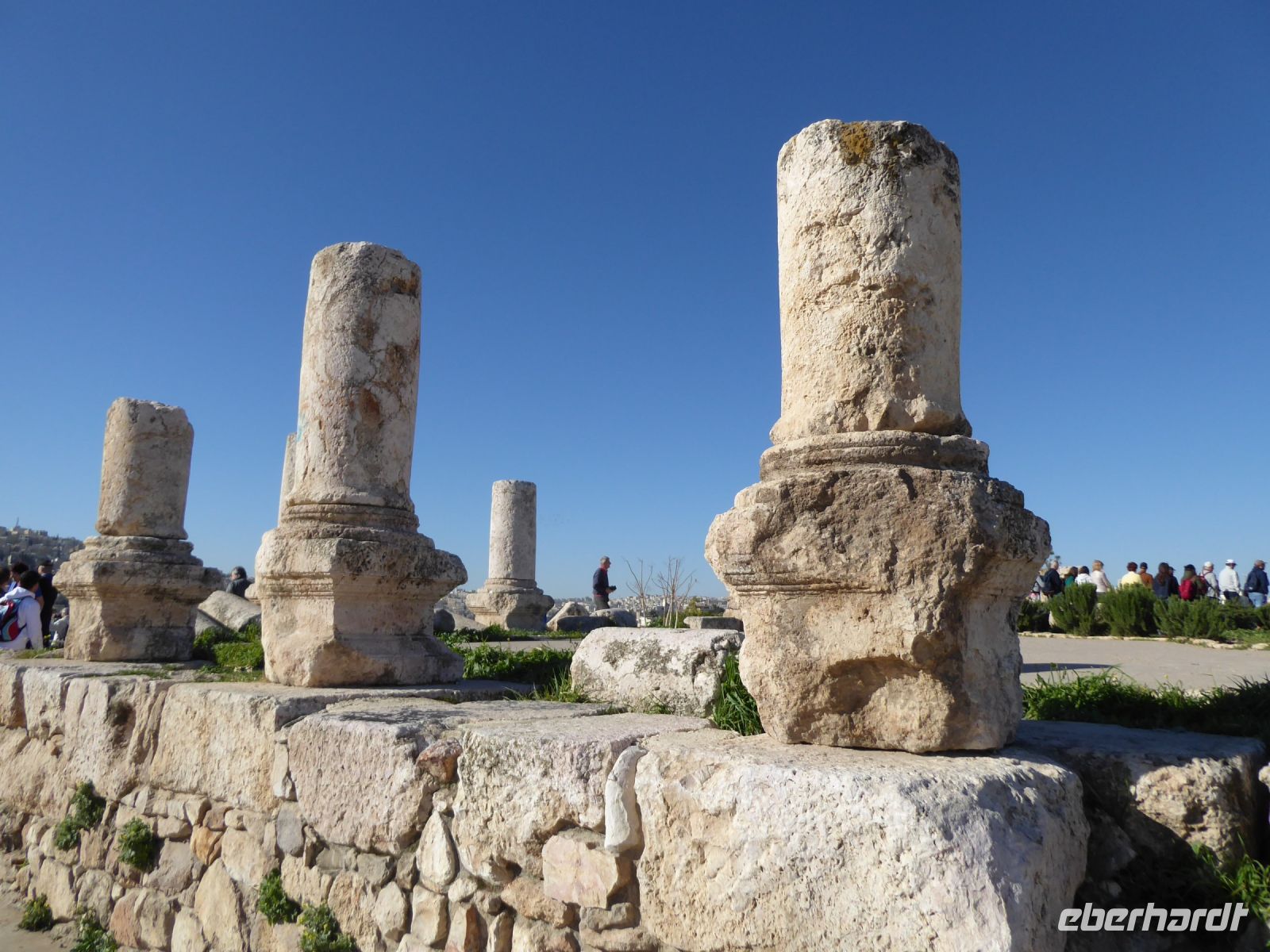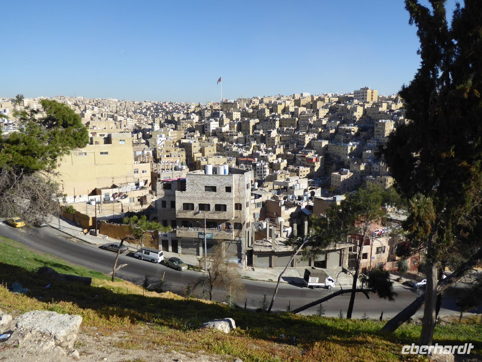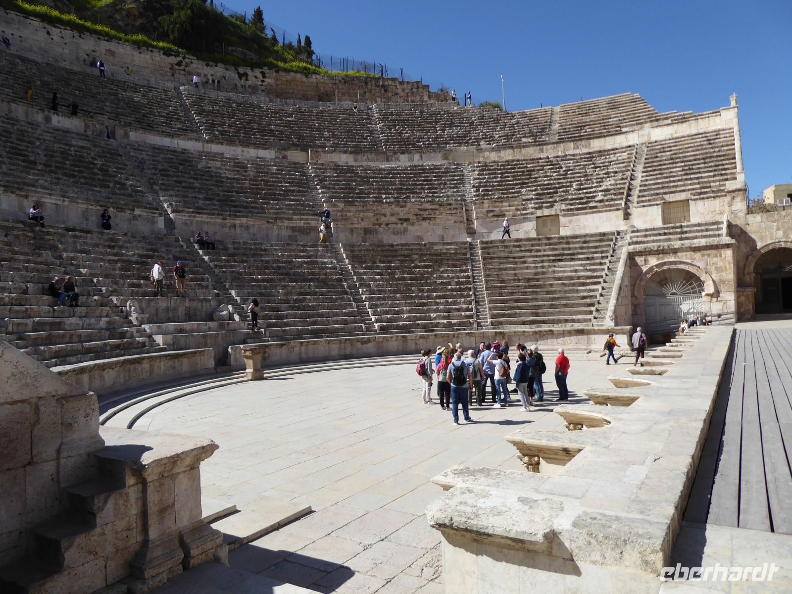 Wir sind im Morgenland und schon früh zeigt sich die Sonne am Himmel. Im großzügigen und lichtdurchflossenen Frühstücksraum herrschte schon reges Treiben und unser Guide Ali war schon früh zur Stelle, um uns seine Vorschläge für den heutigen Tag zu unterbreiten. Pünktlich um 8:00 Uhr, nach einem köstlichen Frühstück, das keine Wünsche offen ließ, starteten wir mit unserem Bus und unserem Fahrer Mohammad zu einer ersten Stadterkundung. Amman ist die Hauptstadt des Haschemitischen Königreichs und zählt mittlerweile über 4.000.000 Einwohner. Ähnlich wie Rom ist Amman auf sieben Hügeln gebaut und dehnt sich heute über fast 1700 km² aus. Die Gebäude stehen dicht an dicht und sind überwiegend aus weißem Kalkstein errichtet. Ein Charakteristikum jordanischer Bauweise ist, dass die Grundstücke komplett überbaut sind: um das Kerngebäude sammeln sich Anbauten, Alkoven, Terrassen und nach Bedarf weitere Wohnungen für Familienangehörige. Die Altstadt ist eng mit mehrstöckigen Gebäuden bebaut, die Straßen sind breit und die Fußgänger nutzen die schattigen Arkadengänge. Überall sind kleine Absätze und Stufen, auch mal große Löcher in den Wegen. Händler halten ihre Waren feil und in den Seitengassen findet man alles, was man zum Leben braucht. Bei aller Betriebsamkeit ist es doch erstaunlich ruhig in den Straßen. Zuerst besichtigten wir das gewaltige Areal der Zitadelle, die auf einem der höchsten Hügel der Stadt, Jabal Al Qal´a thront. Zu den archäologischen Sehenswürdigkeiten gehören eine Höhle aus der Bronzezeit, der Ammonitische Palast, ein römischer Tempel, eine byzantinische Basilika, eine Moschee und eine Zisterne aus Umayyadischer Zeit. Von dort oben hat man eine grandiose Aussicht über die Stadt :Auf der einen Seite das große Rund des antiken Theaters, auf der anderen Seite die Silhouette moderner Hochhausbauten. Ali verstand es vorzüglich uns für die spannende Geschichte Jordaniens zu begeistern. Ein kurzer Besuch im archäologischen Museum rundete unseren Besuch in dieser interessanten Anlage ab. Weiter ging es, wieder hinunter in die Altstadt, zum römischen Theater am Rande des riesigen 2014 neu angelegten Haschemite Platzes, der von blühenden Mandel- und Aprikosenbäumen gesäumt wird. Das Theater stammt aus dem zweiten nachchristlichen Jahrhundert, als Amman, damals unter dem Namen Philadelphia, Teil des römischen zehn Städtebundes war. Es verfügte in der Antike über 6000 Sitzplätze und wird noch heute für Veranstaltungen genutzt. Auf einer einfachen Rebec erzeugte ein Musikant schräge Töne. Und für manche reichte es noch einen kurzen Blick in das Museum für Volkstraditionen.
