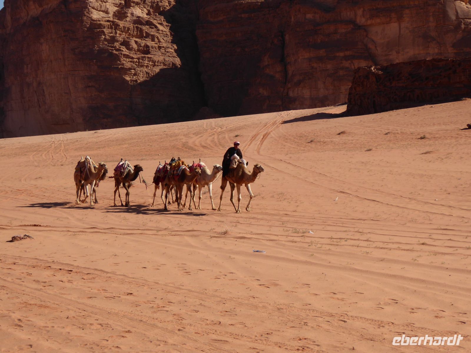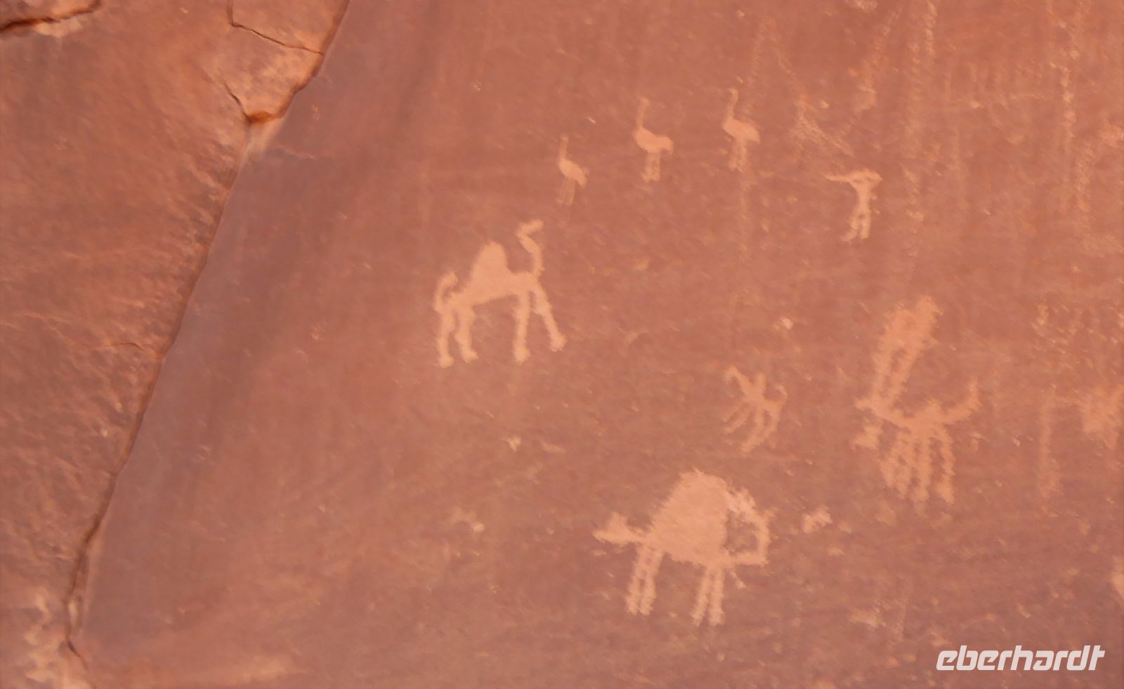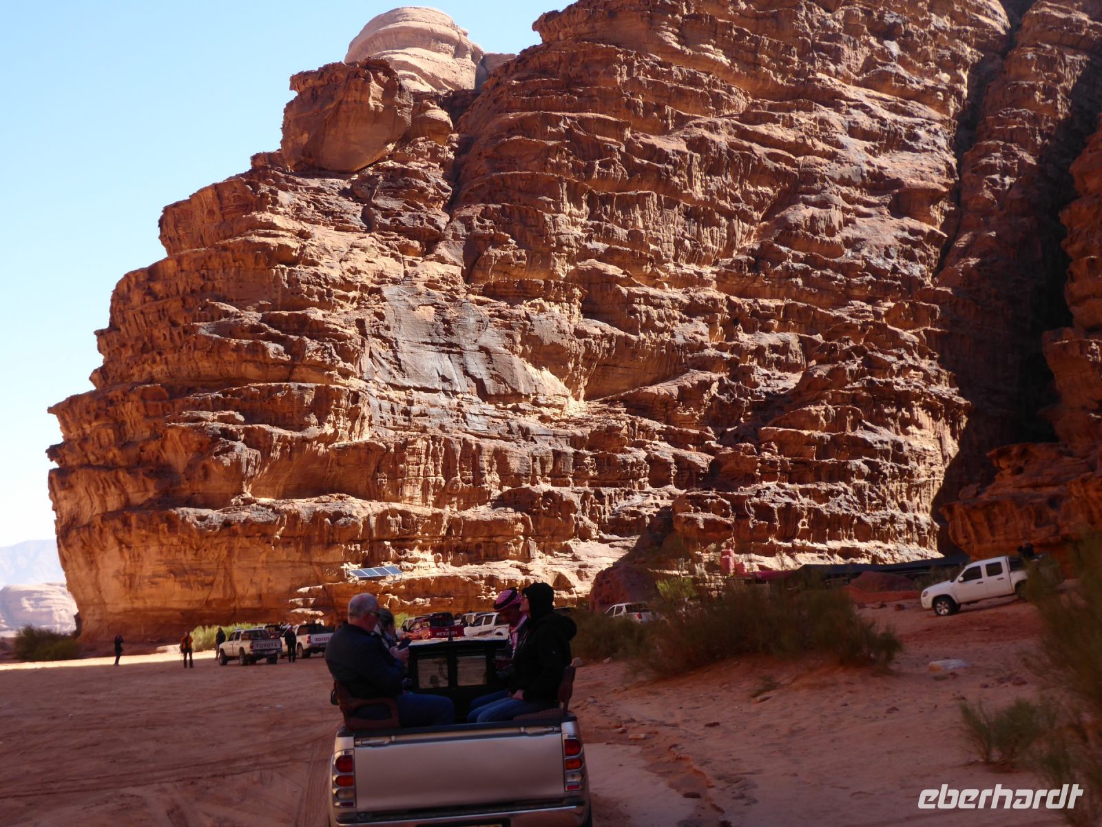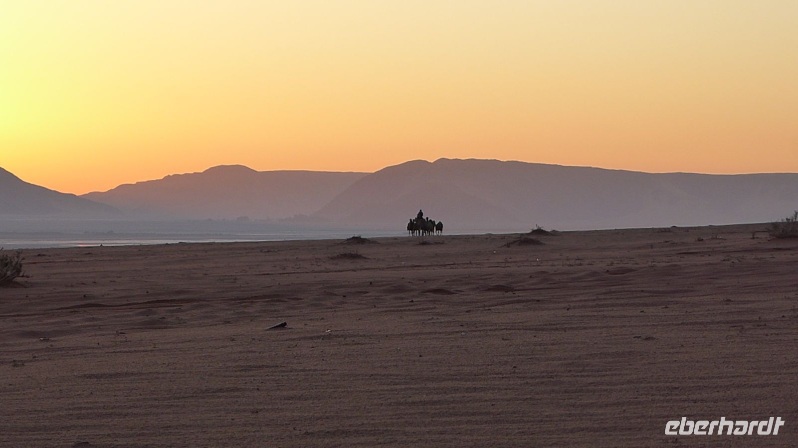 Schlaftrunken stolperten wir morgens um sechs über die Holzplanken der Anlage dem Eingang entgegen, wo wir hofften unsere Reittiere für den Ritt in den Sonnenaufgang zu finden. Weit und breit kein Dromedar in Sicht. Doch halt, in einiger Entfernung sahen wir schemenhaft einige Tiere liegen, die uns durchaus gelangweilt entgegen blickten. Aus dem Dunkel der Nacht schälten sich aus den Schatten der Tiere menschliche Gestalten: die Kamelführer, die so früh noch nicht mit uns gerechnet hatten. Doch schnell wurden uns die Tiere zugeordnet, und so konnte das Abenteuer beginnen. Eine kurze Einweisung, wie man sich an den Sätteln zu halten hatte und - schwuppdich - ehe man sich´s versah, schnellten die Tiere nach oben. Unsere kleine Herde bestand nur aus Stuten und einem Jungbullen. Wir genossen die Ruhe des frühen Morgens und ritten der Sonne entgegen. Der Himmel war klar und transparent und die Mondsichel stand über einem Felsmassiv, als sich die Sonne schließlich zeigte. Wenig später gesellte sich ein weiterer Zug zu uns, mit zwei Bullen, die ihrer Liebe zu unseren Kameldamen mit blubbernden Geräuschen aus ihrem Kehlsack Ausdruck verliehen. Gemütlich zog unsere Karawane zurück ins Camp. Dort erwartete uns ein köstliches, kräftiges Frühstück, das wir wieder im großen Gemeinschaftszelt zu uns nahmen. Danach war noch genügend Zeit, auf die komfortabel mit einer Treppe ausgestattete Sanddüne hinauf zu marschieren. Und schon stand ein Jeep bereit, um unsere Koffer zurück zum Bus zu bringen und weitere Jeeps erwarteten uns, um mit uns eine spannende Tour durch das Wadi Rum zu machen. Zuerst ging es zur berühmten Lawrence-Quelle, wo Lawrence von Arabien gebadet hat, bevor er den Aufstand der Araber gegen die Osmanen anführte. In seinem Roman „Die sieben Säulen der Weisheit“ hat er der Gegend ein Denkmal gesetzt. An diesen von ihm beschriebenen Originalschauplätzen wurde 1962 sein Leben verfilmt und so ist die Gegend vielen Menschen seltsam vertraut - doch weitläufig, einsam und gottähnlich, wie er sie erlebt hat, ist die Wüste definitiv nicht mehr. An der Al Khazali Schlucht sind auf einem Felsen zahlreiche prähistorische Felsbilder mit Jagdszenen zu sehen, die zeigen, dass die Wüste nicht immer so trocken war wie heute. Unser nächster Halt war an einer gewaltigen Sanddüne. Wir ließen es uns nicht nehmen und kletterten durch den losen Sand nach oben. Danach kam eine Teepause im Beduinenzelt gerade recht. Über dem offenen Feuer wurde das Wasser erhitzt und der Tee bereitet. Das einladend prasselnde Herdfeuer symbolisiert die in Wüstengebieten überlebenswichtige Gastfreundschaft der Beduinen. Das Gastrecht war und ist unantastbar und bis heute in der arabischen Kultur fest verankert. Und schon war es Zeit, zu unseren Bus zurückzukehren. Ja, man könnte noch so viel mehr entdecken, in dieser interessanten Steinwüste. Doch wir wollten heute noch weiter nach Aqaba am Roten Meer, dem südlichsten Punkt unserer Reise. Am frühen Nachmittag erreichten wir unser Hotel Mövenpick Ressort in Aqaba. Wer wollte ging mit Ali noch vor dem Check-in zu einem kleinen Mittagsimbiss in die Stadt oder nutzte die Gelegenheit, die wunderschöne Anlage zu erkunden und am Privatstrand des Hotels ein Bad im Roten Meer zu nehmen. Zum Abendessen trafen wir wieder zusammen und spazierten zum Restaurant Suzanna, wo wir wieder mit leckeren arabischen Speisen verwöhnt wurden. Hier scheint man es mit dem Alkoholverbot nicht so genau zu nehmen, wie in der Touristenhochburg Petra und so tranken wir die fruchtigen lokalen Rot- und Weißweine aus dem Jordantal und saßen in gemütlicher Runde noch lange zusammen. Nachtschwärmer gingen noch zum nahe gelegenen Souk um letzte Mitbringsel und orientalische Gewürze für Zuhause zu erwerben. In unseren großzügigen Suiten genossen wir eine ruhige Nacht unter Palmen.