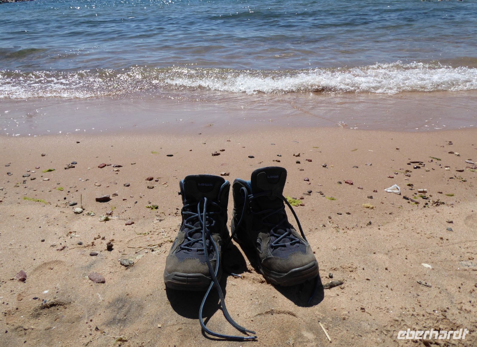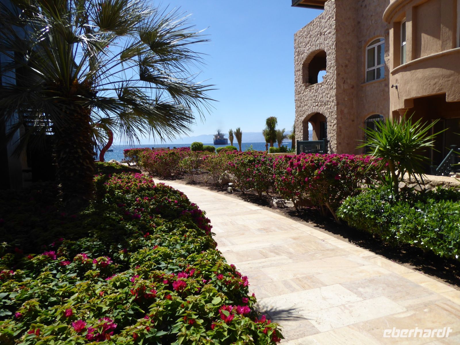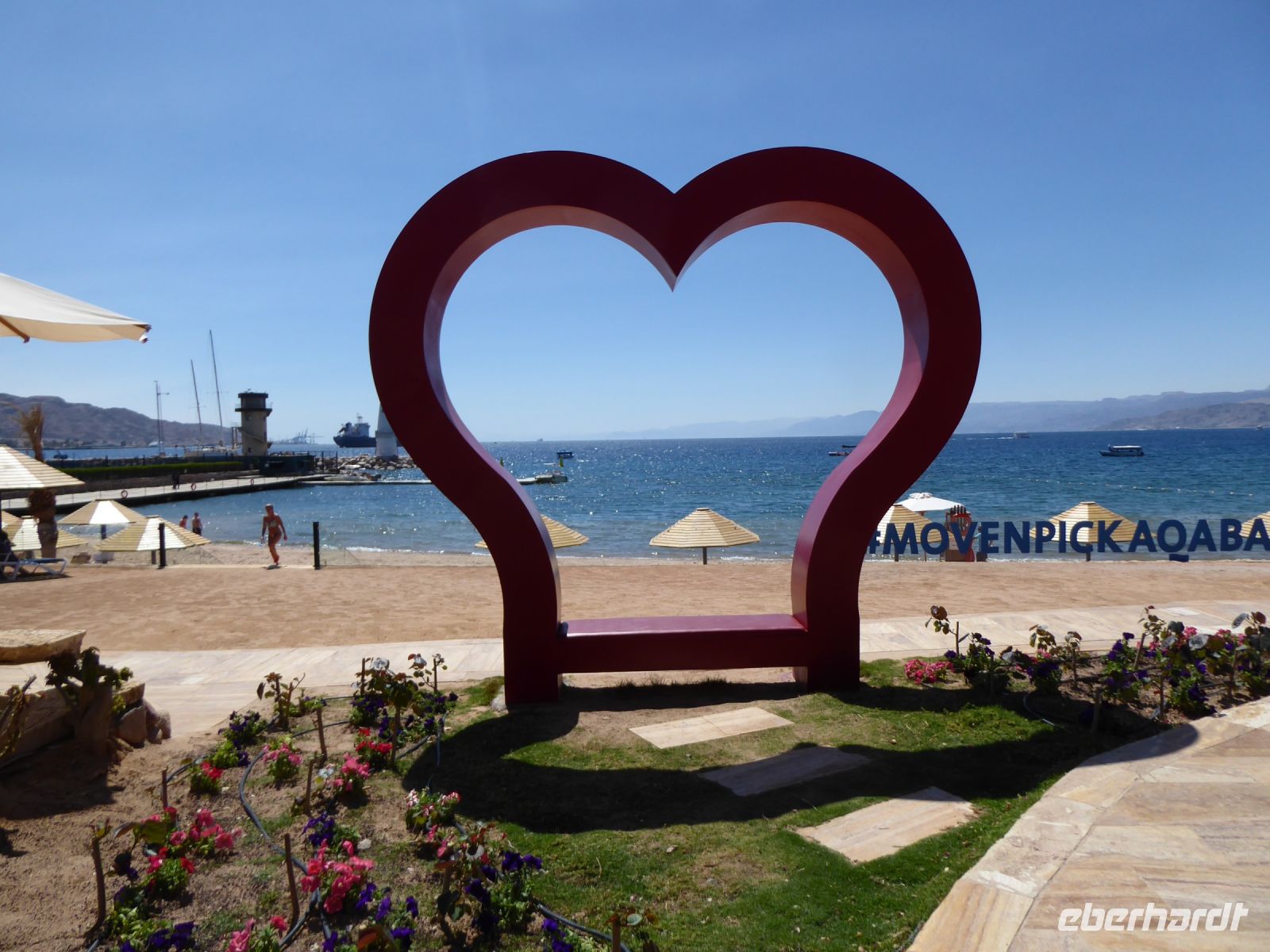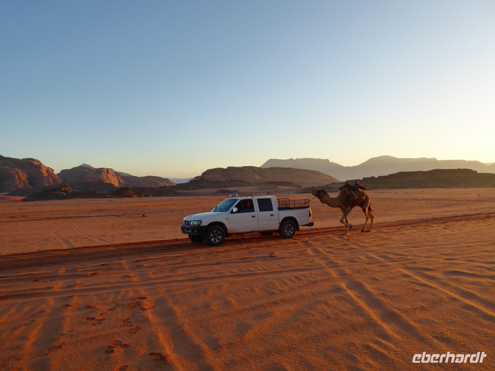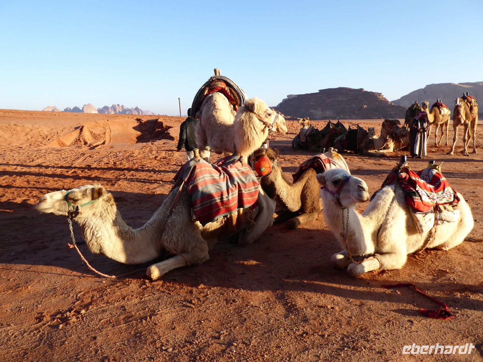 Schlaftrunken stolperten wir morgens um sechs über die Holzplanken der Anlage dem Eingang entgegen, wo wir hofften unsere Reittiere für den Ritt in den Sonnenaufgang zu finden. Weit und breit kein Dromedar in Sicht. Doch halt, in einiger Entfernung sahen wir schemenhaft einige Tiere liegen, die uns durchaus gelangweilt entgegen blickten. Aus dem Dunkel der Nacht schälten sich aus den Schatten der Tiere menschliche Gestalten: die Kamelführer, die so früh noch nicht mit uns gerechnet hatten. Doch schnell wurden uns die Tiere zugeordnet, und so konnte das Abenteuer beginnen. Eine kurze Einweisung, wie man sich an den Sätteln zu halten hatte und - schwuppdich - ehe man sich´s versah, schnellten die Tiere nach oben. Unsere kleine Herde bestand nur aus Stuten und einem Jungbullen. Wir genossen die Ruhe des frühen Morgens und ritten der Sonne entgegen. Der Himmel war klar und transparent und die Mondsichel stand über einem Felsmassiv, als sich die Sonne schließlich zeigte. Wenig später gesellte sich ein weiterer Zug zu uns, mit zwei Bullen, die ihrer Liebe zu unseren Kameldamen mit blubbernden Geräuschen aus ihrem Kehlsack Ausdruck verliehen. Gemütlich zog unsere Karawane zurück ins Camp. Dort erwartete uns ein köstliches, kräftiges Frühstück, das wir wieder im großen Gemeinschaftszelt zu uns nahmen. Danach war noch genügend Zeit, auf die komfortabel mit einer Treppe ausgestattete Sanddüne hinauf zu marschieren. Und schon stand ein Jeep bereit, um unsere Koffer zurück zum Bus zu bringen und weitere Jeeps erwarteten uns, um mit uns eine spannende Tour durch das Wadi Rum zu machen. Zuerst ging es zur berühmten Lawrence-Quelle, wo Lawrence von Arabien gebadet hat, bevor er den Aufstand der Araber gegen die Osmanen anführte. In seinem Roman „Die sieben Säulen der Weisheit“ hat er der Gegend ein Denkmal gesetzt. An diesen von ihm beschriebenen Originalschauplätzen wurde 1962 sein Leben verfilmt und so ist die Gegend vielen Menschen seltsam vertraut - doch weitläufig, einsam und gottähnlich, wie er sie erlebt hat, ist die Wüste definitiv nicht mehr. An der Al Khazali Schlucht sind auf einem Felsen zahlreiche prähistorische Felsbilder mit Jagdszenen zu sehen, die zeigen, dass die Wüste nicht immer so trocken war wie heute. Unser nächster Halt war an einer gewaltigen Sanddüne. Wir ließen es uns nicht nehmen und kletterten durch den losen Sand nach oben. Danach kam eine Teepause im Beduinenzelt gerade recht. Über dem offenen Feuer wurde das Wasser erhitzt und der Tee bereitet. Das einladend prasselnde Herdfeuer symbolisiert die in Wüstengebieten überlebenswichtige Gastfreundschaft der Beduinen. Das Gastrecht war und ist unantastbar und bis heute in der arabischen Kultur fest verankert. Und schon war es Zeit, zu unseren Bus zurückzukehren. Ja, man könnte noch so viel mehr entdecken, in dieser interessanten Steinwüste. Doch wir wollten heute noch weiter nach Aqaba am Roten Meer, dem südlichsten Punkt unserer Reise. Am frühen Nachmittag erreichten wir unser Hotel Mövenpick Ressort in Aqaba. Wer wollte ging mit Ali noch vor dem Check-in zu einem kleinen Mittagsimbiss in die Stadt oder nutzte die Gelegenheit, die wunderschöne Anlage zu erkunden und am Privatstrand des Hotels ein Bad im Roten Meer zu nehmen. Zum Abendessen trafen wir wieder zusammen und spazierten zum Restaurant Suzanna, wo wir wieder mit leckeren arabischen Speisen verwöhnt wurden. Hier scheint man es mit dem Alkoholverbot nicht so genau zu nehmen, wie in der Touristenhochburg Petra und so tranken wir die fruchtigen lokalen Rot- und Weißweine aus dem Jordantal und saßen in gemütlicher Runde noch lange zusammen. Nachtschwärmer gingen noch zum nahe gelegenen Souk um letzte Mitbringsel und orientalische Gewürze für Zuhause zu erwerben. In unseren großzügigen Suiten genossen wir eine ruhige Nacht unter Palmen.