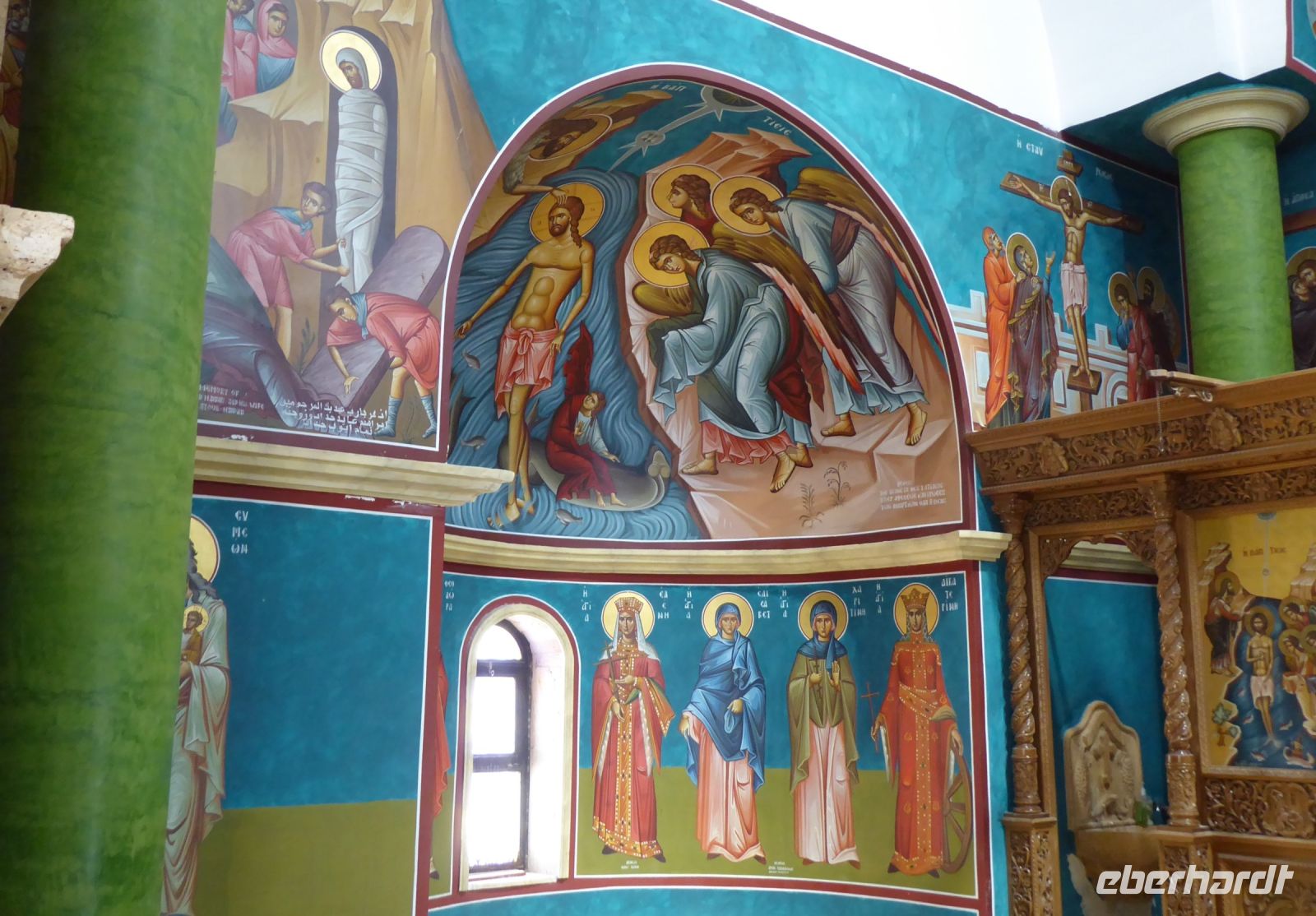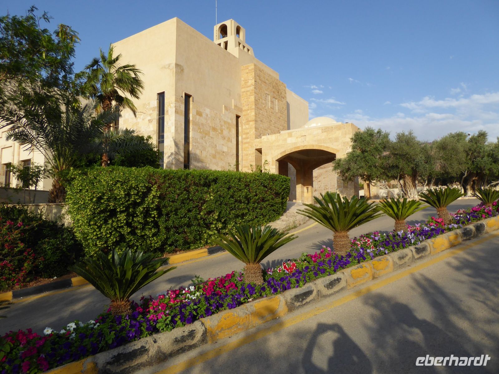 Am frühen Morgen verließen wir die wunderschöne Hotelanlage nach einem köstlichen fünf Sternefrühstück in Richtung Norden. Die Straße läuft parallel zur israelischen Grenze vorbei am Flughafen von Aqaba und seinem Pendant auf der anderen Seite der Grenze in Israel. Selbst dreißig Jahre nach dem Friedensabkommen der beiden Länder ist noch eine hohe Militärpräsenz zu spüren. Fast 10 % des jordanischen Staatshaushalts fließt in den Militärhaushalt. Wir folgen der Arava Senke, die sich vom Golf von Aqaba bis zum Toten Meer zieht. Vereinzelt stehen Beduinenzelte am Rand der Straße, die von Akazien, Mimosen und Jacarandabäumen, Palmen und Bananenstauden gesäumt wird. Bunte Marktstände locken mit ihren Angeboten von frischem Fenchel, Zwiebeln, Kichererbsen, Kürbissen, Orangen, Bananen, Tomaten, und Karotten die Käufer an. Alles wird hier in großen Plantagen und Gewächshäusern angebaut. Und dann sehen wir das Tote Meer. Es liegt mittlerweile 426 m unter dem Meeresspiegel und wird vom Wasser des Jordans gespeist. Jedes Jahr sinkt der Wasserspiegel des Toten Meeres um fast 1 m, da für die Bewässerung der Felder dem Jordan zu viel Wasser entnommen wird. Dadurch steigt auch der Salzgehalt des Toten Meeres, der derzeit bei 33 % liegt. Bei einem Fotostopp sehen wir die bizarren dicken Salzablagerungen am Ufer. Hinter uns steht auf einer Klippe ein einzelner Monolith. Hat sich die Barbarine hierher verirrt? Nein, es ist Frau Lot, die hier am Toten Meer zur Salzsäule erstarrte, weil sie Gottes Wort nicht befolgte. Wenige Kilometer weiter ist eine große Fabrikanlage, in der Kali und Pottasche für Waschmittel und medizinische Produkte hergestellt wird. Kurz danach erreichen wir den Grand Canyon Jordaniens, die Mündung der Felsschlucht des Wadi Mujib, durch das der biblische Fluss Arnon fließt. An unserem vierten Reisetag sind wir über die Königsstraße durch den oberen Teil dieser Senke gefahren und haben den 2003 fertig gestellten großen Staudamm der Mujib Talsperre überquert. Durch die Nähe zu Israel spielten uns unsere Handys einen Streich und zeigten die israelische Zeit an, die 1 Stunde nach geht. Daher entschieden wir uns, noch vor dem Mittagessen Bethanien und die Taufstelle Jesu zu besuchen. Seit dem Papstbesuch Johannes Paul II im Jahre 2000 führt ein schön angelegter Weg im Schatten von Tamarisken direkt zum Jordan. Neben einer kleinen Kirche fanden Archäologen eine Treppe hinunter zum Wasser an einer Stelle, die der wahrscheinlichste Ort für die Originaltaufstelle Jesu ist. Sie liegt heute einige Meter vom Jordan entfernt. Doch unbestritten gilt bei allen Pilgern der Jordan als der Fluss in dem Johannes der Täufer Christus getauft hat. Auf der jordanischen Seite geht es ruhig zu. Am anderen Ufer in Israel herrscht reges Treiben und Hunderte Pilger steigen in weißen Gewändern in das Wasser und vollziehen eine Art kollektiver Taufe. Die Stelle in Israel ist gut ausgebaut und über den Häuptern weht die Flagge Israels mit dem Davidstern. Bis zur Unterzeichnung des israelisch-jordanischen Friedensvertrags 1994 war das Gebiet gesperrt und vermint. Erst danach konnte der symbolträchtige Ort in Jordanien, Al- Maghtas, archäologisch untersucht und touristisch erschlossen werden. In der Folge entstanden mehrere Kirchen unterschiedlicher Konfessionen, ein russisches Pilgerhospiz und ein Konferenzzentrum. 2015 wurde die Stätte zum UNESCO Weltkulturerbe erklärt. Gleich in der Nähe befindet sich ein libanesisches Restaurant in dem wir zu einem etwas verspätetes Mittagessen einkehrten. Auch hier wurden wir wieder freundlich empfangen und bewirtet. Danach fuhren wir direkt in unser Hotel, das Hilton Hotel in Swameh. Alle waren wir schon aufgeregt, wie sich wohl ein Bad im salzigen Wasser des Toten Meeres anfühlt - hatten wir doch schon im Einführungsvortrag zu unserer Jordanien Reise von Herrn Fritzsche von Eberhardt Travel einiges über die zu beachtenden Besonderheiten des Wassers erfahren. Gleich nach dem Check-in verabredeten wir uns in kleinen Grüppchen am hoteleigenen Strand, um das Badeerlebnis im Toten Meer gemeinsam zu genießen. Zum Ausklang des Tages trafen wir uns alle wieder im Hotel Restaurant und ließen uns die Köstlichkeiten des Büfetts schmecken.