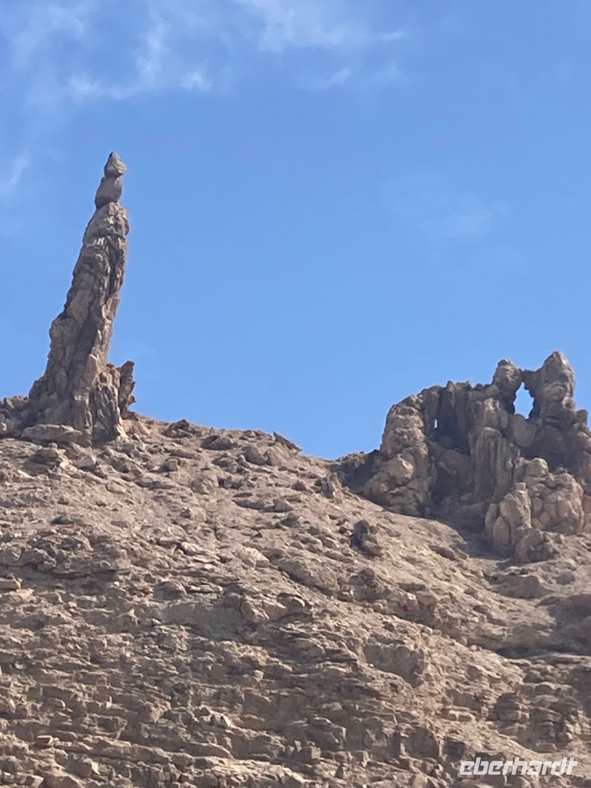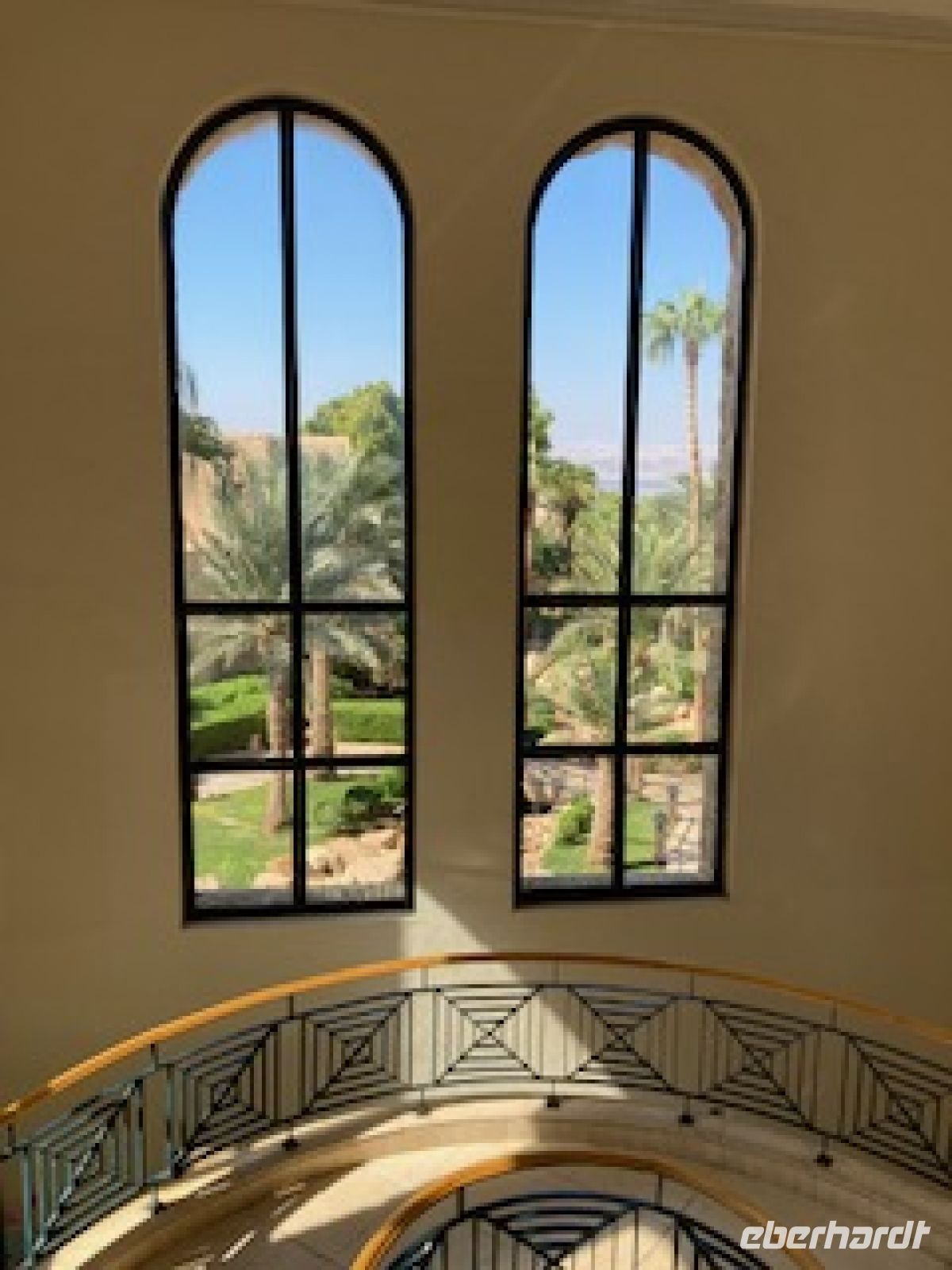 Zwar müssen wir heute unsere Suiten wieder verlassen, ab er die Aussicht, in den nächsten zwei Tagen in einem Hotel gleichen Namens unterzukommen, lässt uns die Fahrt frohgemut angehen. Nach einer langen Passage durch die Wüste erreichen wir das legendäre Tote Meer, das mit seinen 420 m unter dem Meeresspiegel als der tiefste Punkt auf der Welt angesehen wird. An einem Aussichtspunkt halten wir an, um uns diese riesige Salzlake anzuschauen und auch die zur Salzsäule erstarrte Frau des Propheten Lot zu bewundern, die es nicht schaffte, sich nicht umzudrehen.