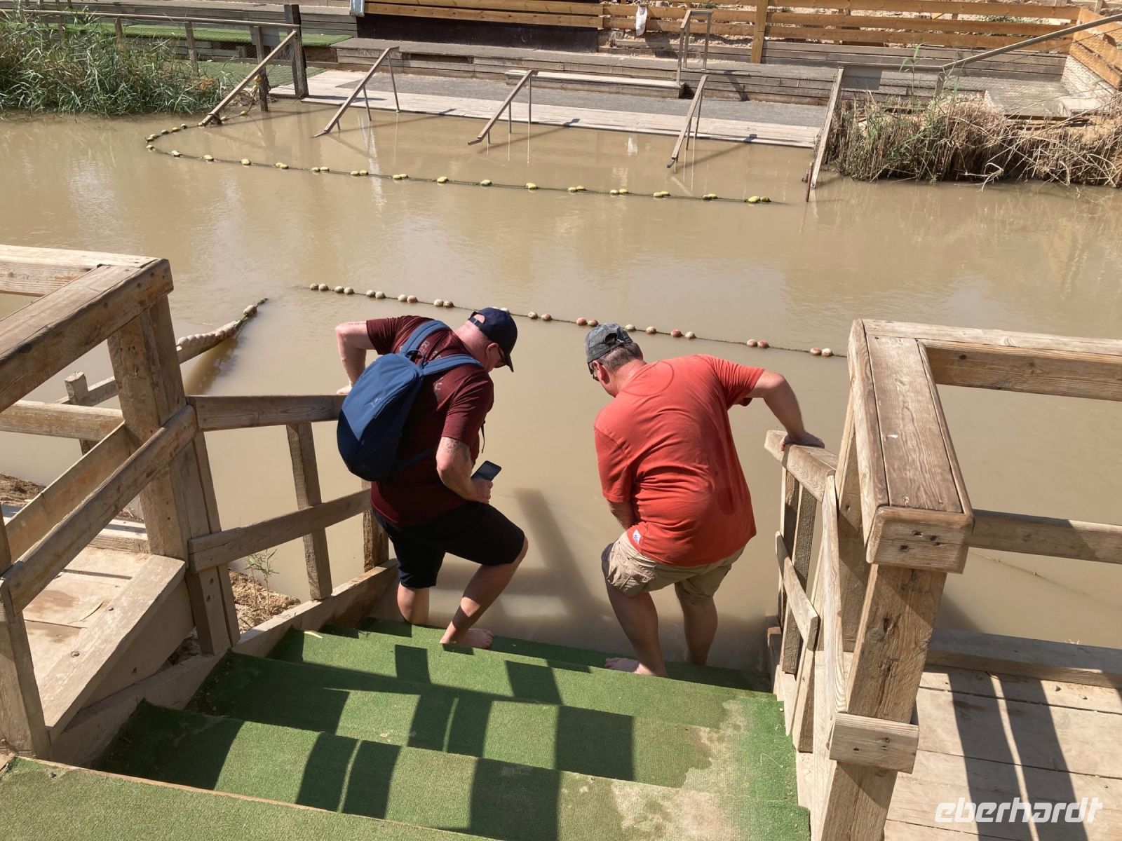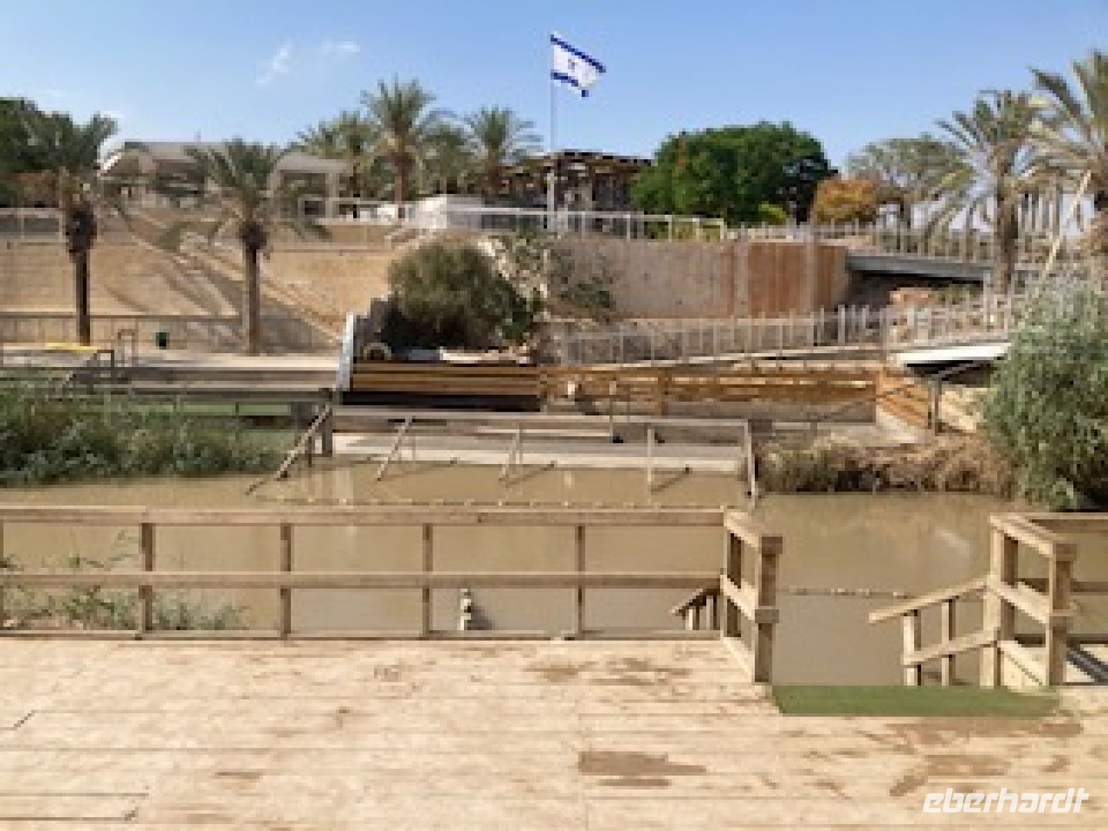 Dann fahren wir erstmal an unserem künftigen Hotel vorbei, um uns an einen wirklich heiligen Ort zu begeben, der Stelle, an der Jesus von Johannes dem Täufer getauft worden ist. Bethanien gilt zwar als wissenschaftlich gesichert, doch beide Seiten des Jordans streiten sich, auf welcher Seite der Täufer wirkte. Nachdem wir einige, meist orthodoxe Kirchen passiert haben, gelangen wir an die antike Taufstelle, die einige Meter vom heutigen Jordan entfernt liegt. Und dann stehen wir endlich an der heutigen Taufstelle, die sich die beiden Nachbarstaaten Israel und Jordanien teilen. Während der Reiseleiter beim letzten Besuch auf der israelischen Seite eine große Meng von weißgekleideten Täuflingen beobachten konnte, ist die Seite diesmal vollkommen verwaist. Nur die israelische Flagge flattert 10 m von uns entfernt träge im Winde.Dafür wollen sich ein paar Mitglieder aus unserer Gruppe einen Bonus im Himmel verdienen und steigen todesmutig in die trüben Fluten.